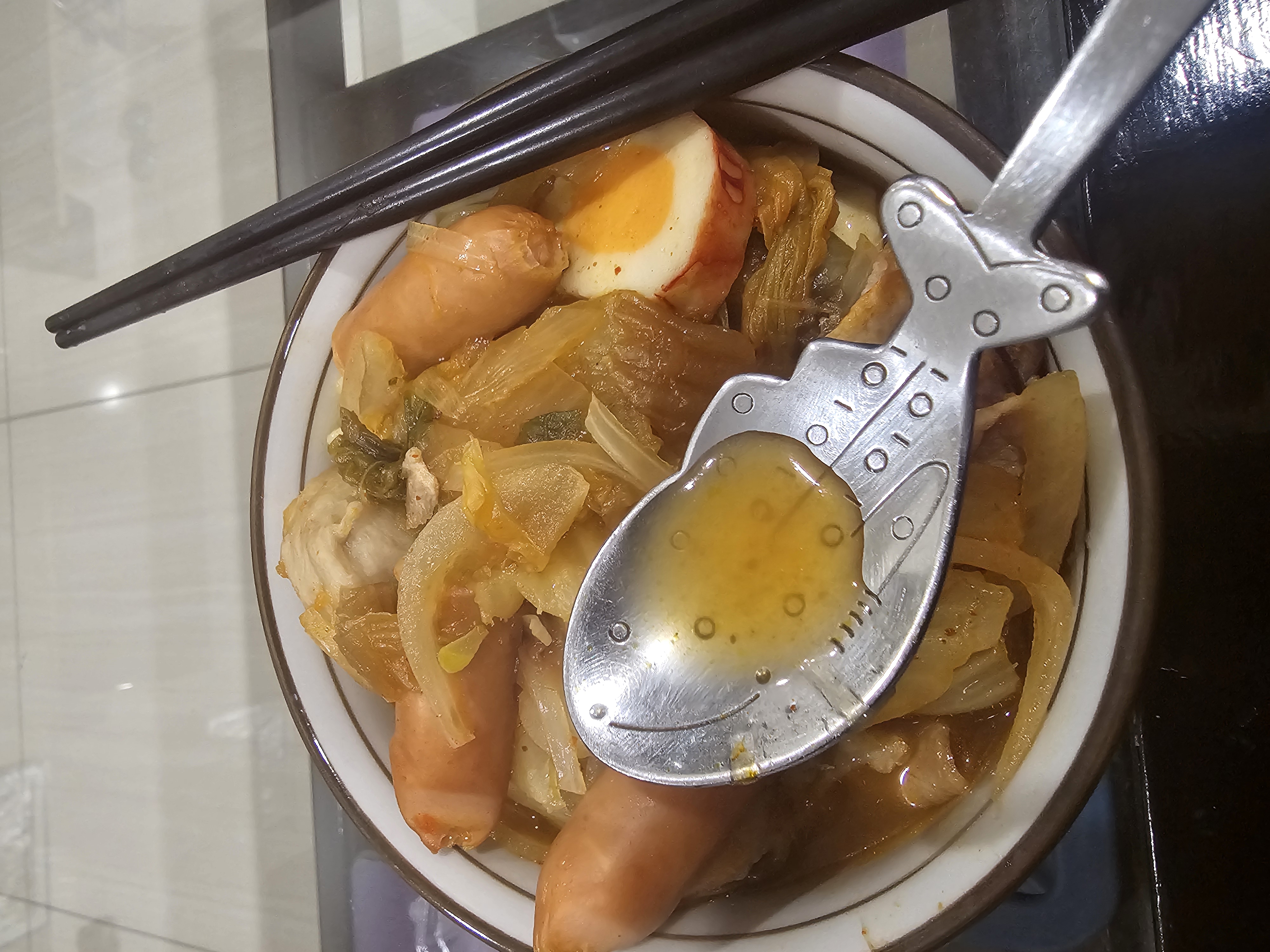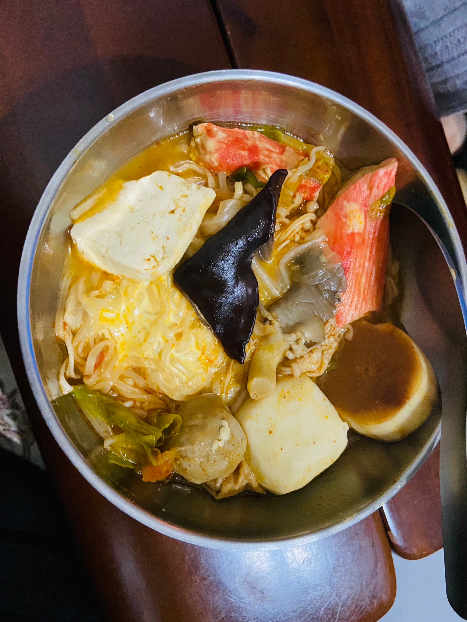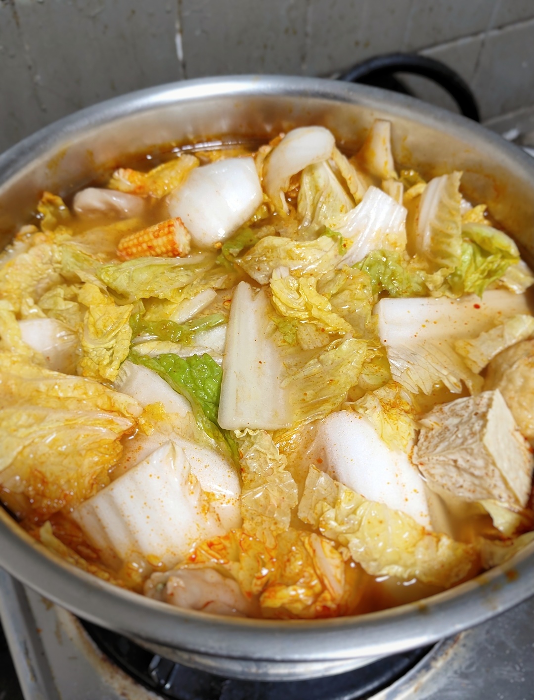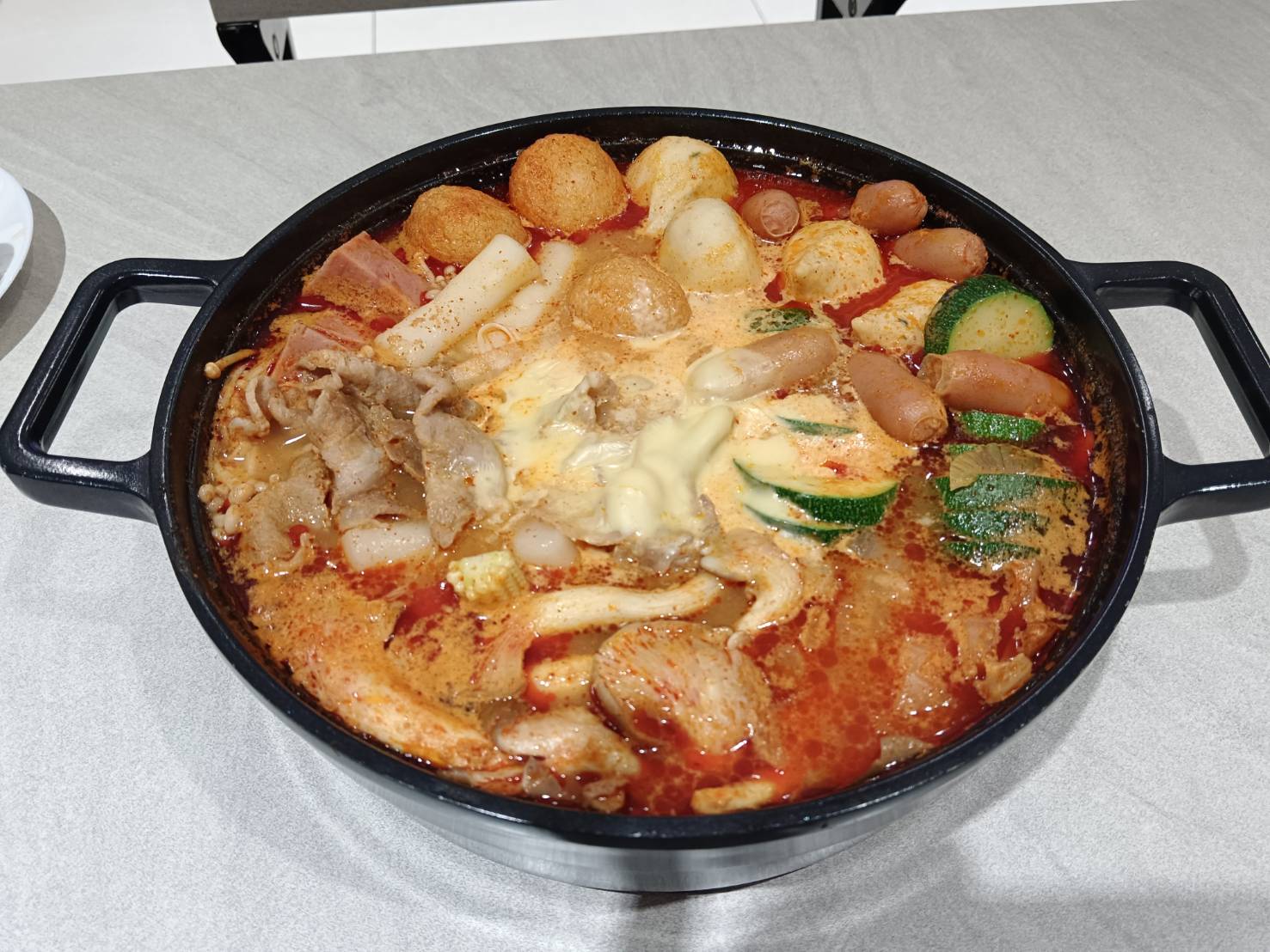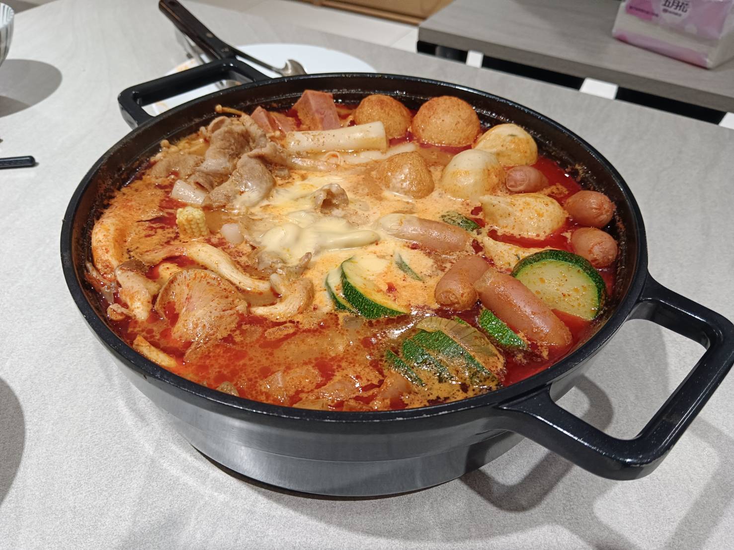 水、牛骨萃取物(牛骨萃取液(牛骨-澳洲產)、精鹽)、炒辣椒醬(辣椒粉、大豆油)、辣椒醬{小麥粉、辣椒醬(辣椒粉、海鹽、蒜、洋蔥、米細粉、大豆、玉米糖膠(粘稠劑))、起司高湯(水、切達起司(牛奶、鹽、凝乳酵素)、乳清粉、大豆油、鹽、牛奶、玉米糖膠)、精鹽、海鮮高湯(水、鯷魚萃取物、淡菜萃取物、蝦萃取物、蛤蜊萃取物、調味(5’-次黃嘌呤核苷磷酸二鈉、5’-鳥嘌呤核苷磷酸二鈉))、大醬(大豆、小麥粉、鹽、酒精)、醬油(水、鹽、大豆、小麥、酒精)、辛味牛油(牛油、洋蔥、蒜)、高湯(水、L-麩酸鈉、麥芽糊精、鹽、洋蔥粉)、糖、培根風味粉(鹽、麥芽糊精、葡萄糖、培根香料)、黑胡椒粉、牛肉風味粉(鹽、糖、牛肉萃取物(紐西蘭產))、調味劑(5’-次黃嘌呤核苷磷酸二鈉、5’-鳥嘌呤核苷磷酸二鈉)
