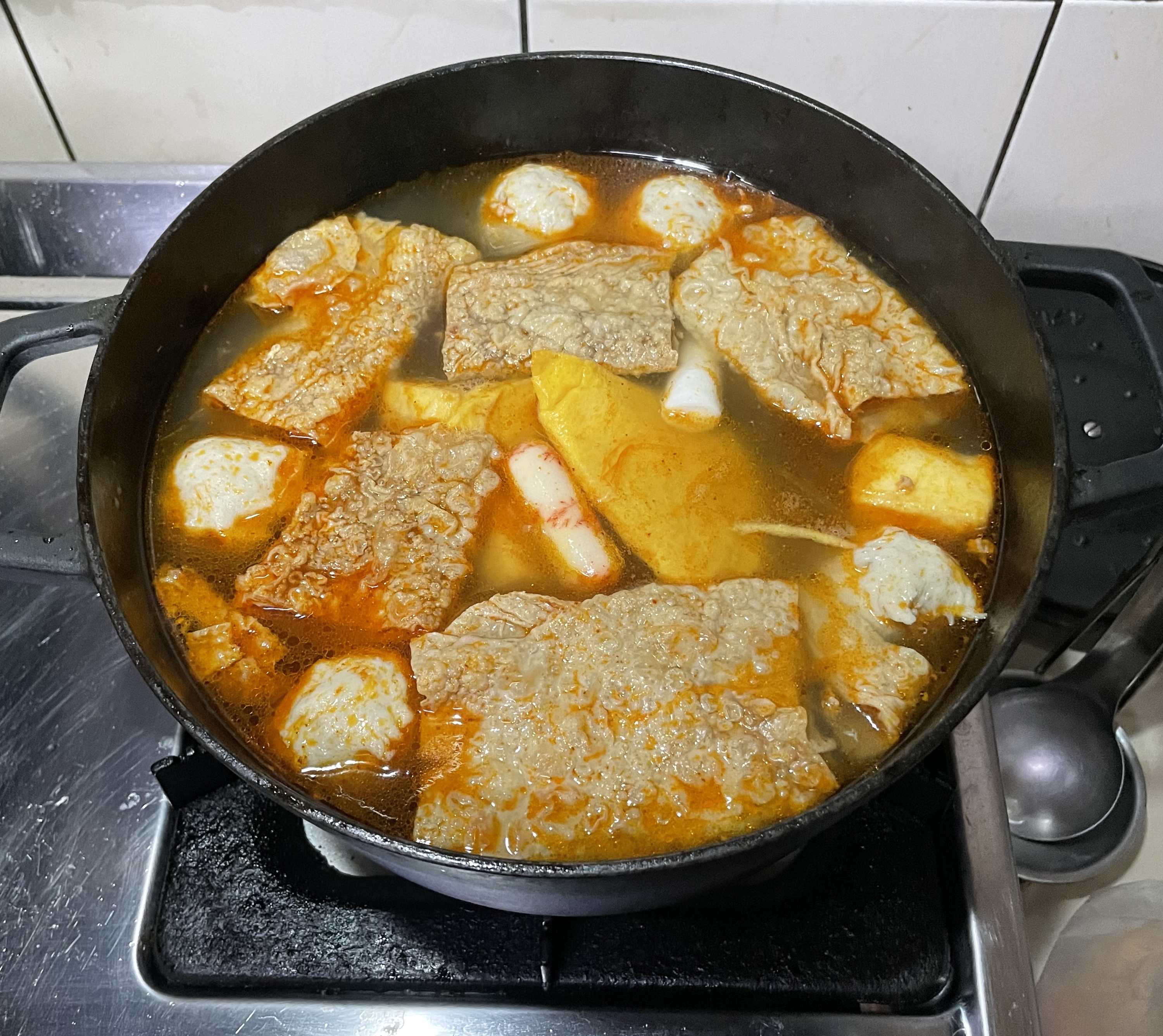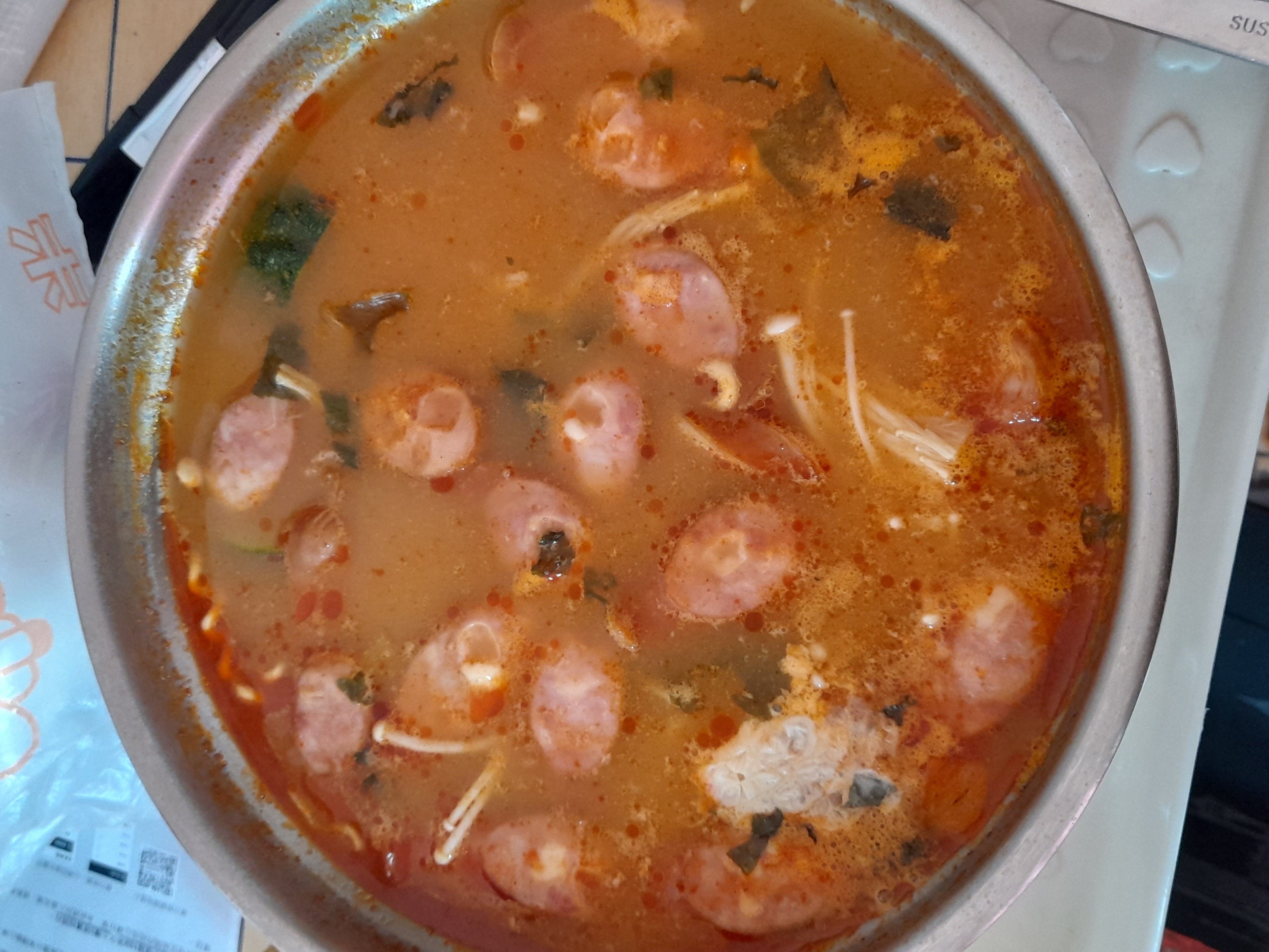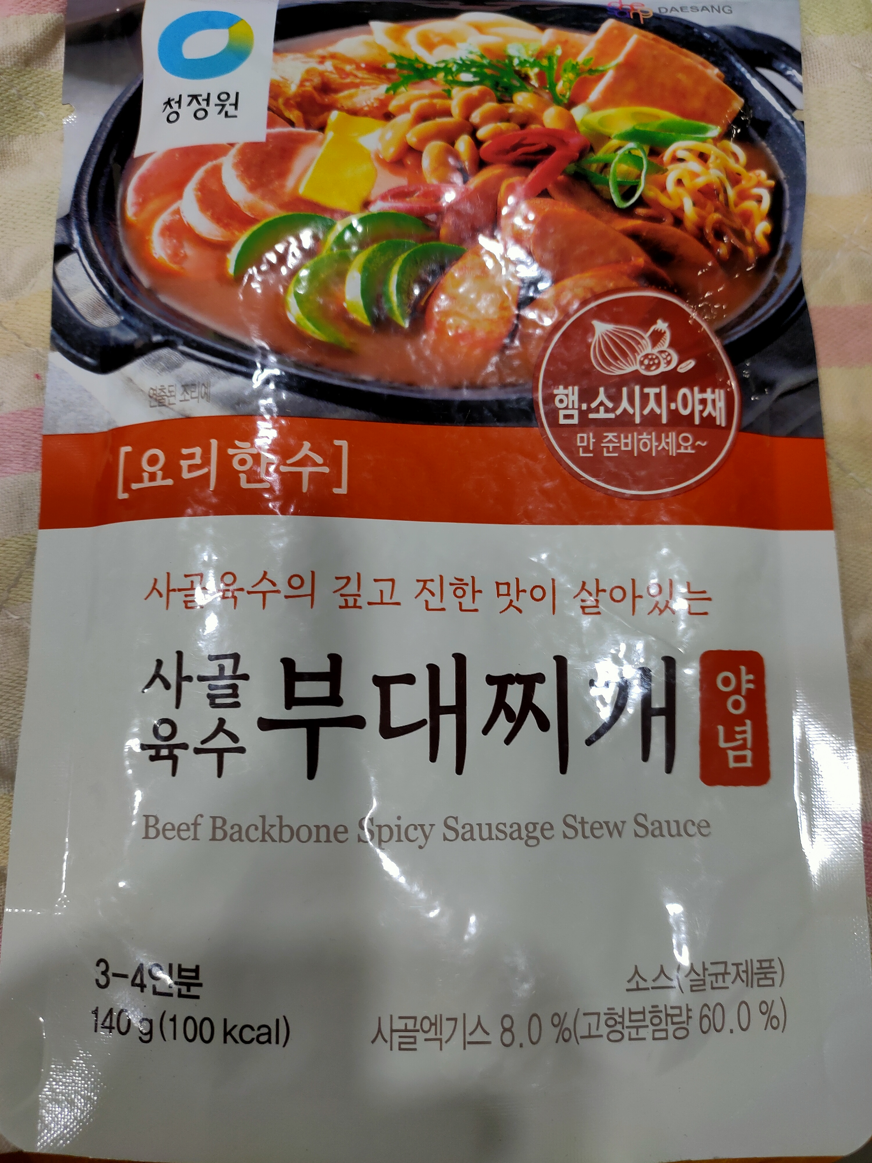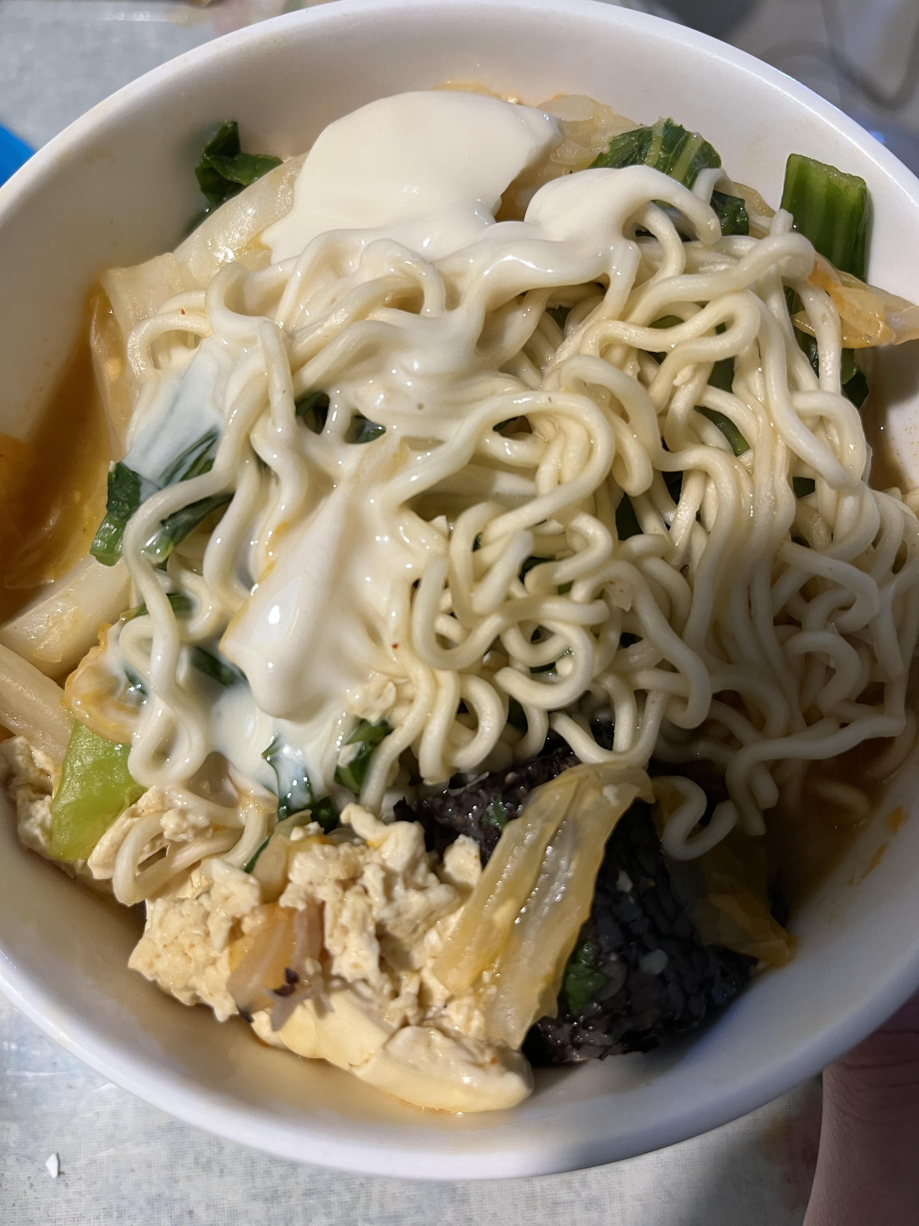 水、牛骨萃取物(牛骨萃取液(牛骨-澳洲產)、精鹽)、炒辣椒醬(辣椒粉、大豆油)、辣椒醬{小麥粉、辣椒醬(辣椒粉、海鹽、蒜、洋蔥、米細粉、大豆、玉米糖膠(粘稠劑))、起司高湯(水、切達起司(牛奶、鹽、凝乳酵素)、乳清粉、大豆油、鹽、牛奶、玉米糖膠)、精鹽、海鮮高湯(水、鯷魚萃取物、淡菜萃取物、蝦萃取物、蛤蜊萃取物、調味(5’-次黃嘌呤核苷磷酸二鈉、5’-鳥嘌呤核苷磷酸二鈉))、大醬(大豆、小麥粉、鹽、酒精)、醬油(水、鹽、大豆、小麥、酒精)、辛味牛油(牛油、洋蔥、蒜)、高湯(水、L-麩酸鈉、麥芽糊精、鹽、洋蔥粉)、糖、培根風味粉(鹽、麥芽糊精、葡萄糖、培根香料)、黑胡椒粉、牛肉風味粉(鹽、糖、牛肉萃取物(紐西蘭產))、調味劑(5’-次黃嘌呤核苷磷酸二鈉、5’-鳥嘌呤核苷磷酸二鈉)