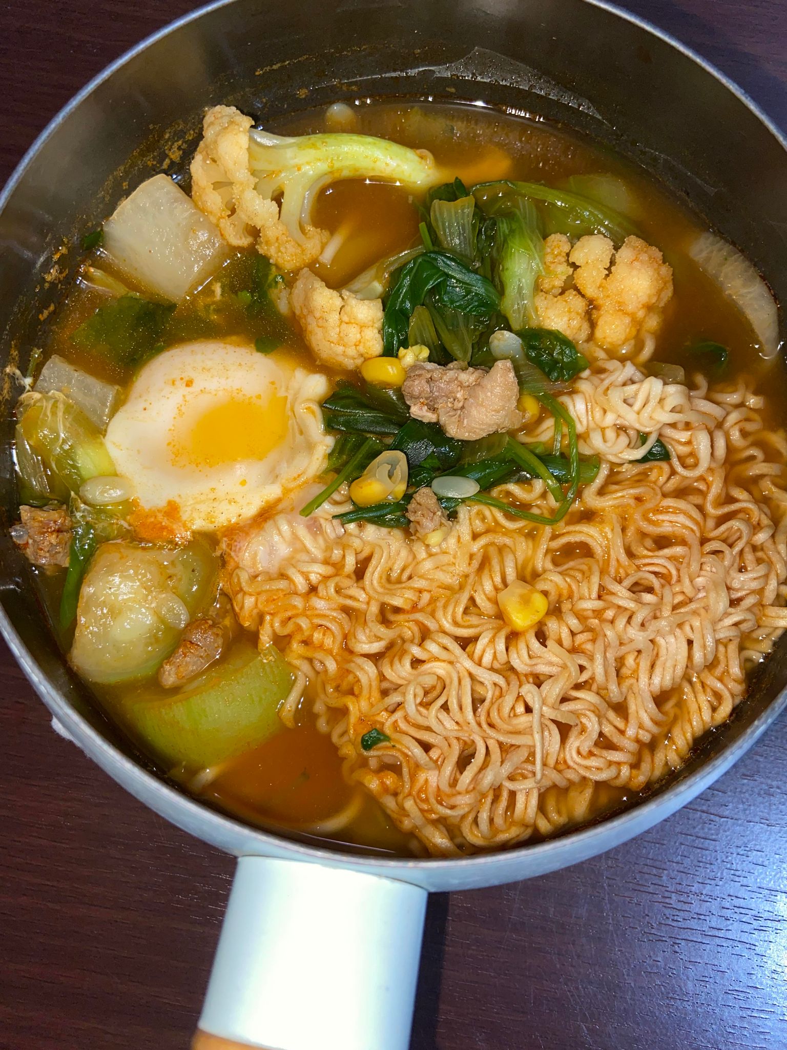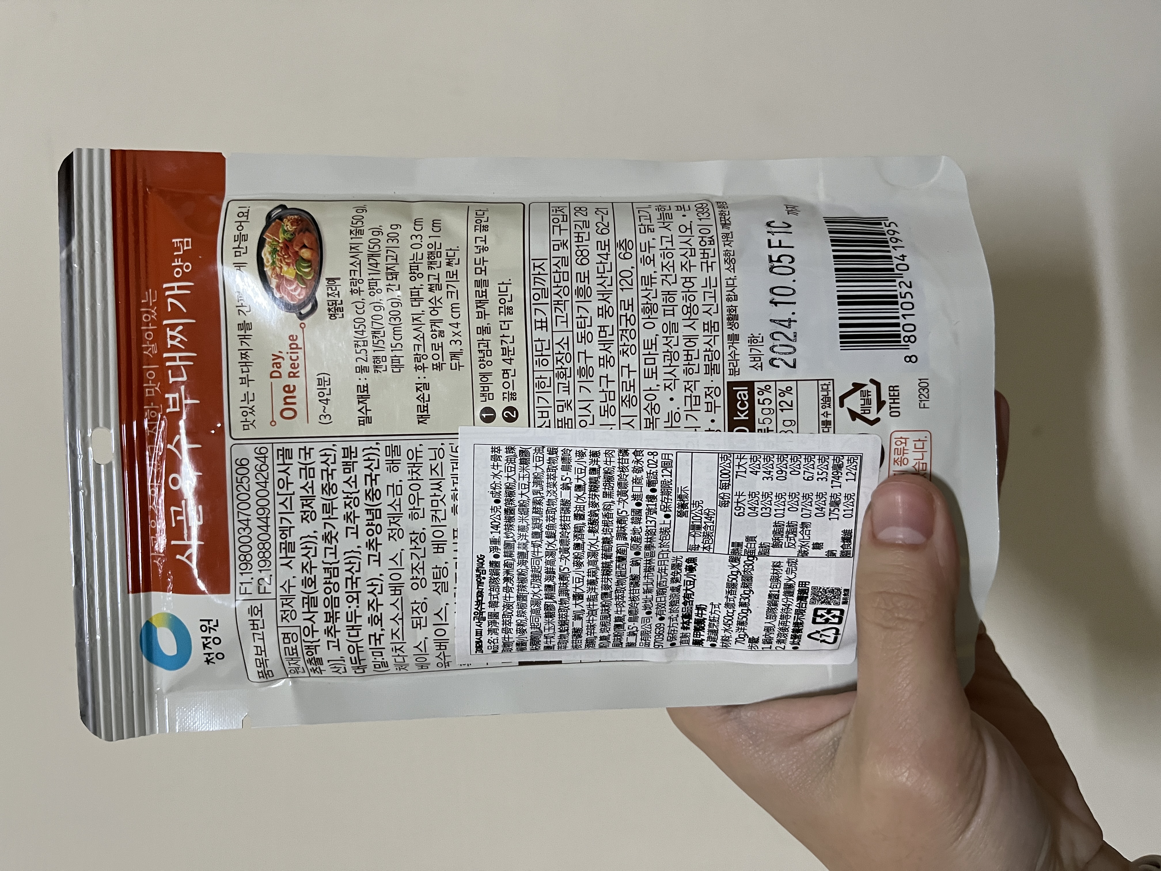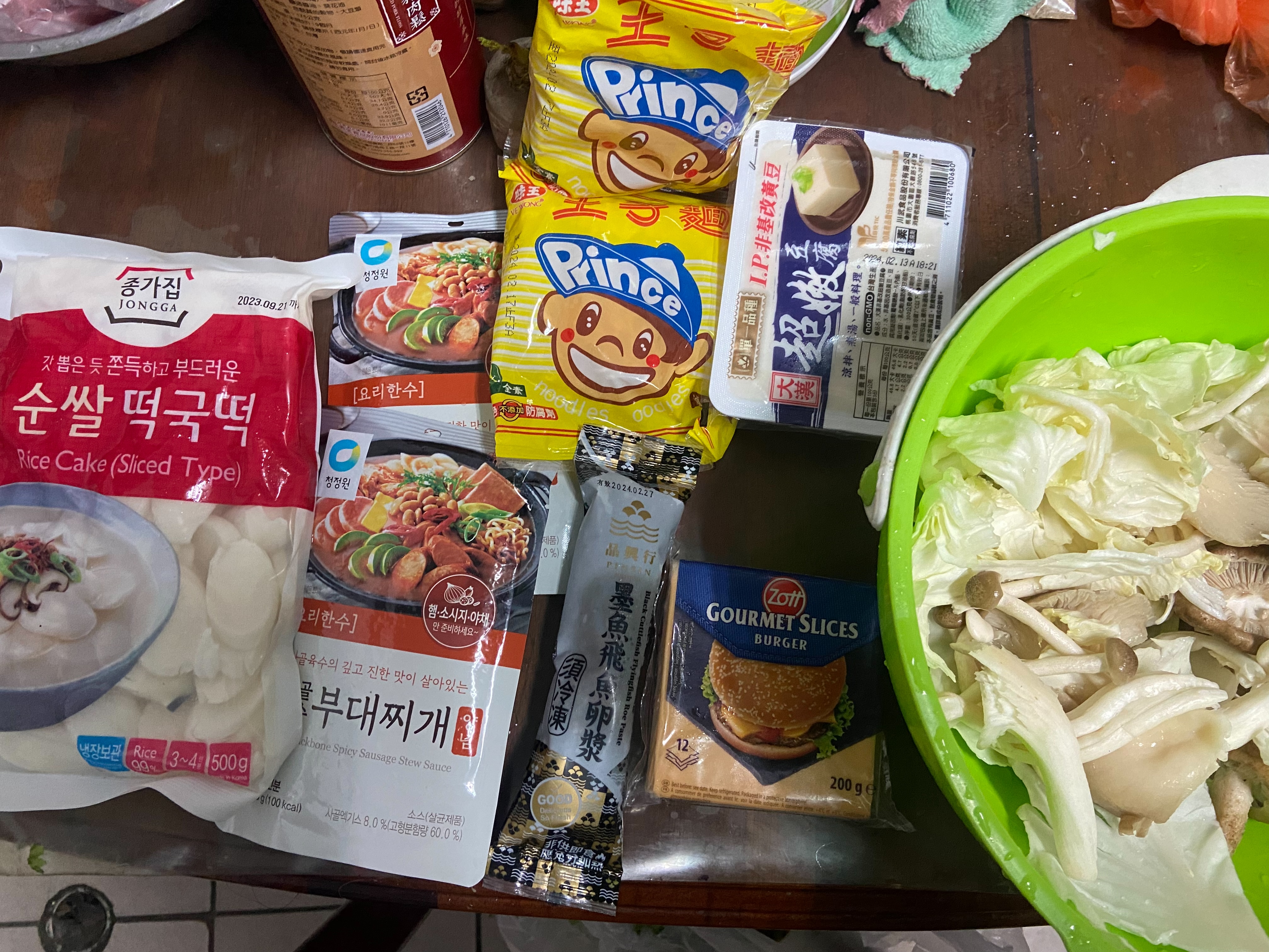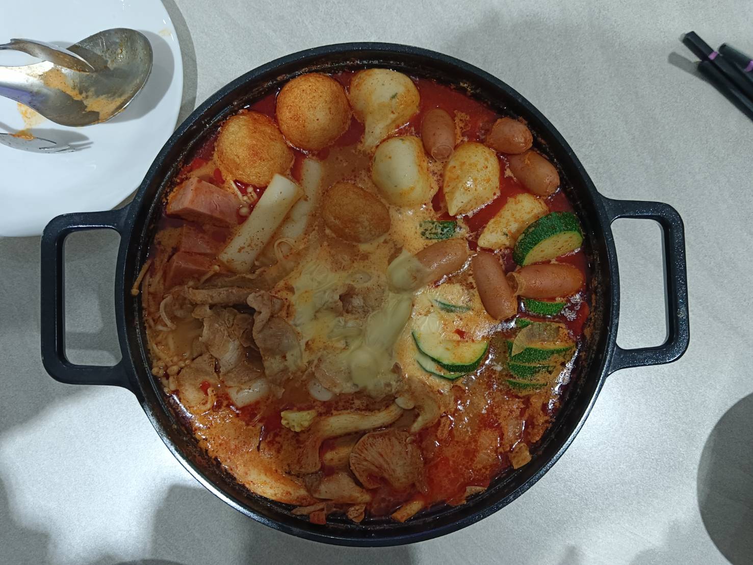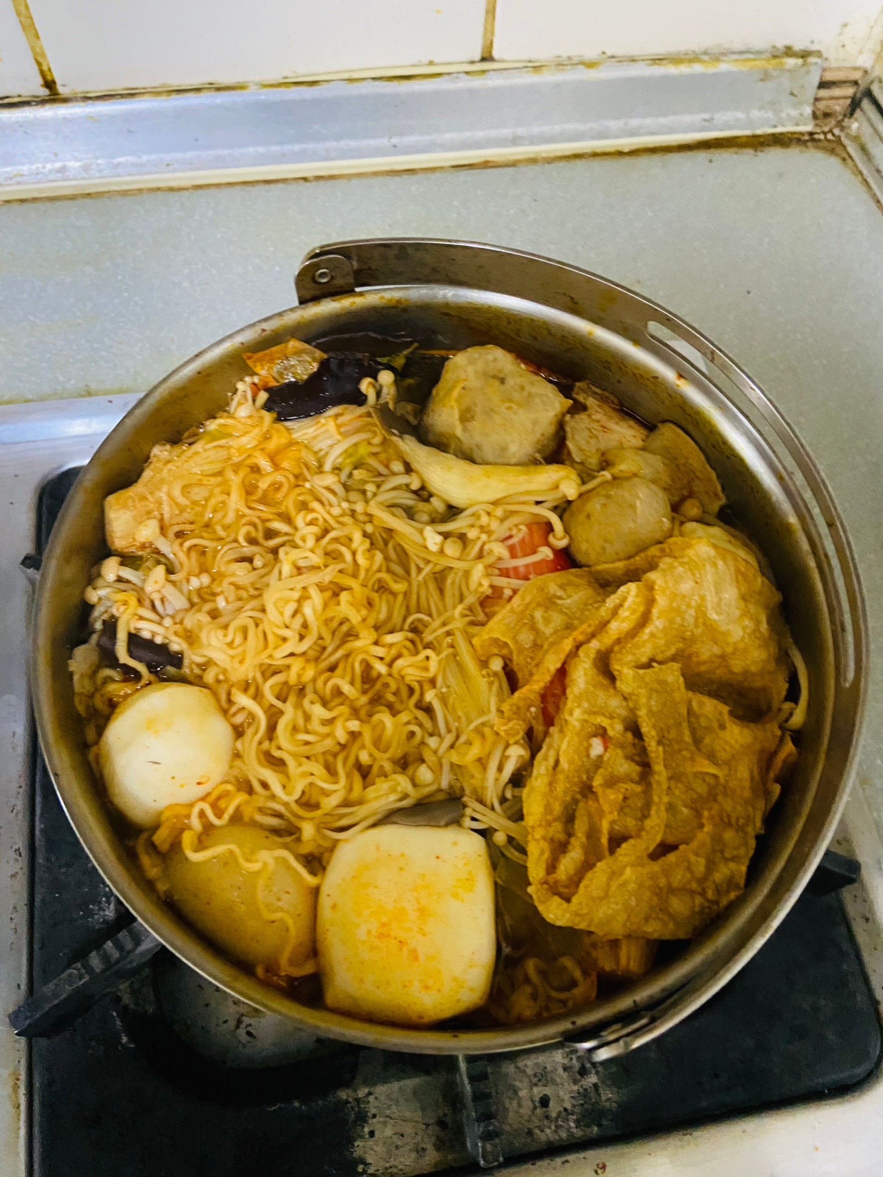 水、牛骨萃取物(牛骨萃取液(牛骨-澳洲產)、精鹽)、炒辣椒醬(辣椒粉、大豆油)、辣椒醬{小麥粉、辣椒醬(辣椒粉、海鹽、蒜、洋蔥、米細粉、大豆、玉米糖膠(粘稠劑))、起司高湯(水、切達起司(牛奶、鹽、凝乳酵素)、乳清粉、大豆油、鹽、牛奶、玉米糖膠)、精鹽、海鮮高湯(水、鯷魚萃取物、淡菜萃取物、蝦萃取物、蛤蜊萃取物、調味(5’-次黃嘌呤核苷磷酸二鈉、5’-鳥嘌呤核苷磷酸二鈉))、大醬(大豆、小麥粉、鹽、酒精)、醬油(水、鹽、大豆、小麥、酒精)、辛味牛油(牛油、洋蔥、蒜)、高湯(水、L-麩酸鈉、麥芽糊精、鹽、洋蔥粉)、糖、培根風味粉(鹽、麥芽糊精、葡萄糖、培根香料)、黑胡椒粉、牛肉風味粉(鹽、糖、牛肉萃取物(紐西蘭產))、調味劑(5’-次黃嘌呤核苷磷酸二鈉、5’-鳥嘌呤核苷磷酸二鈉)