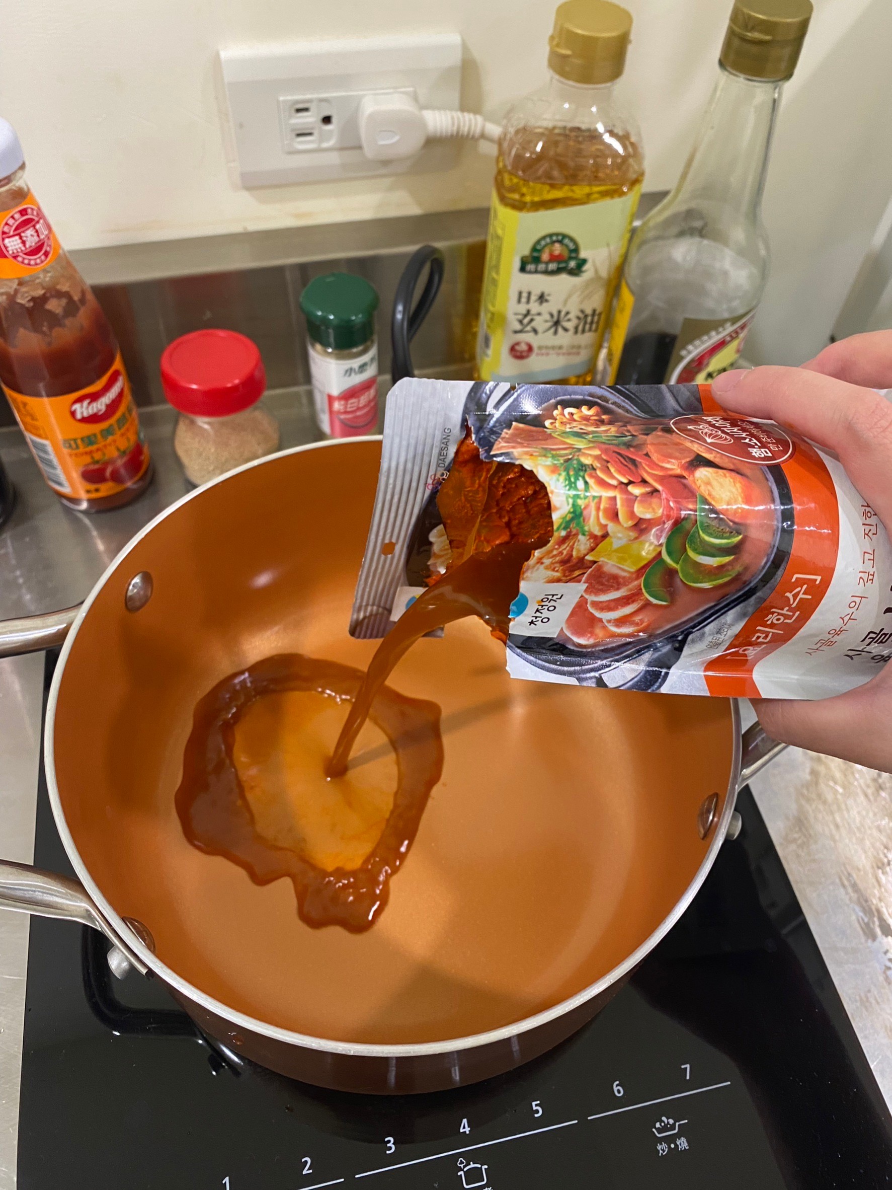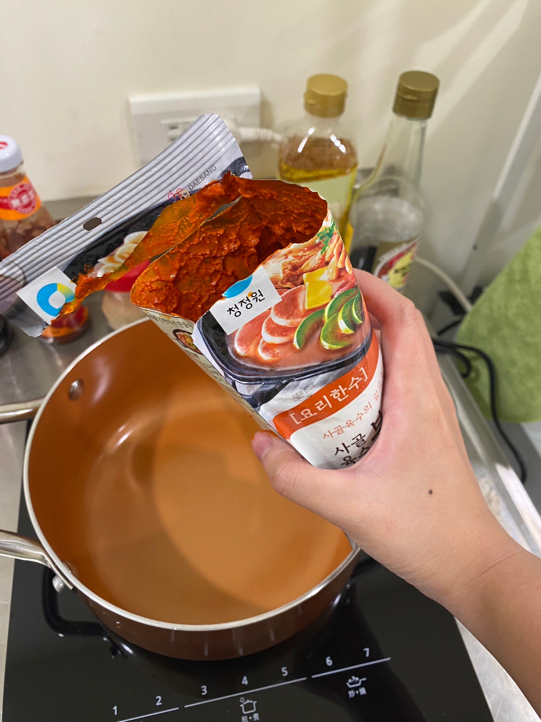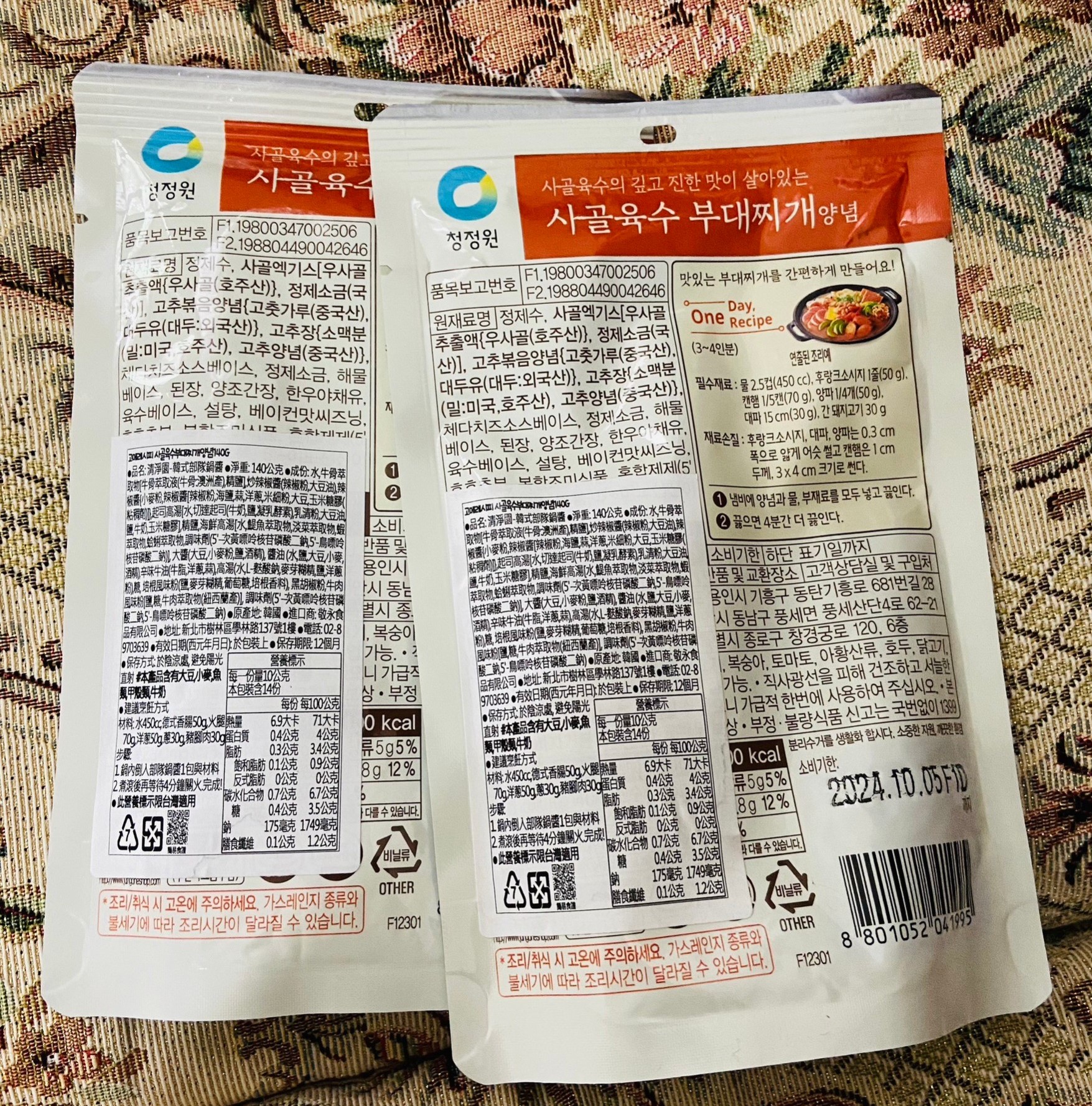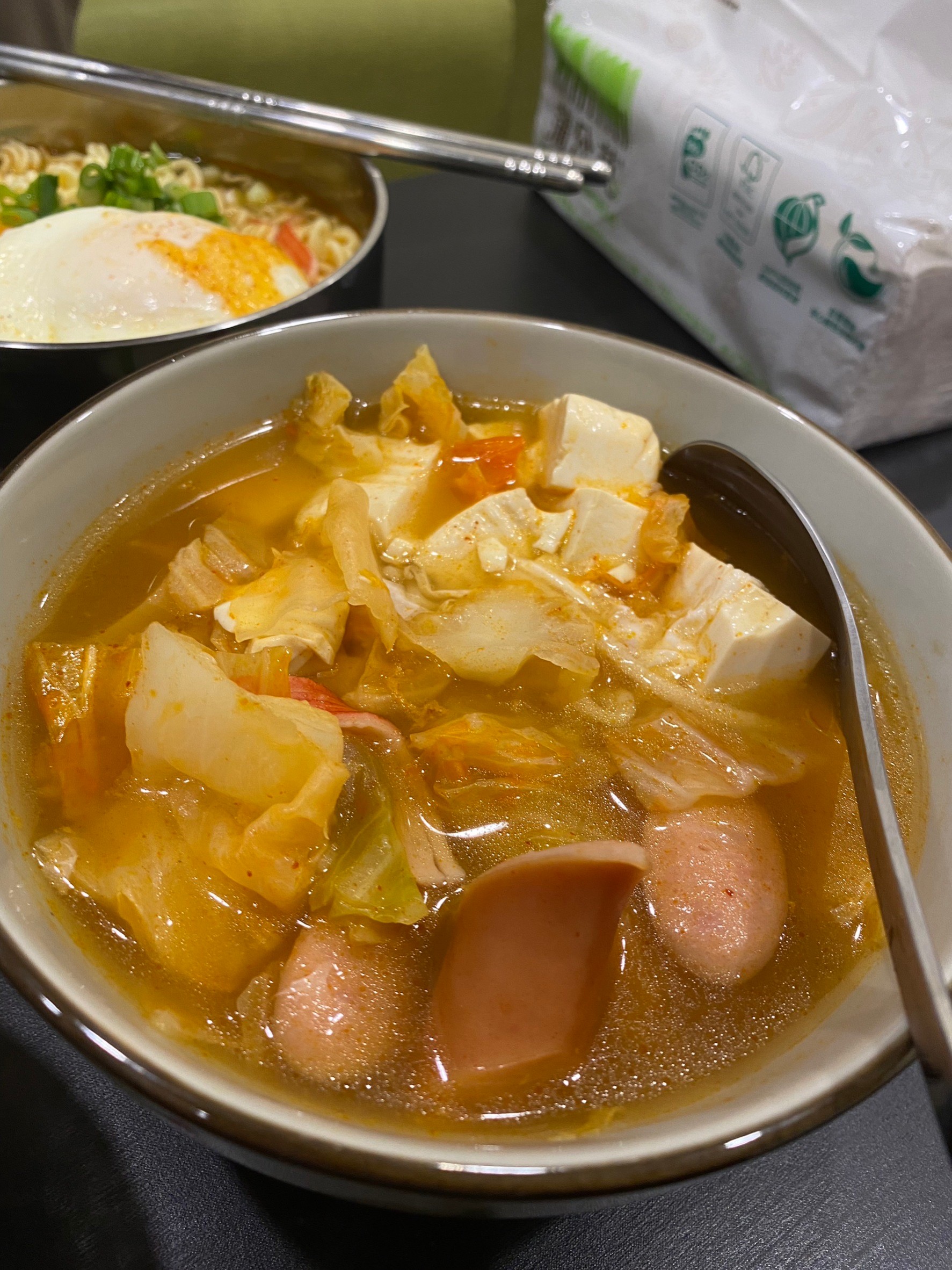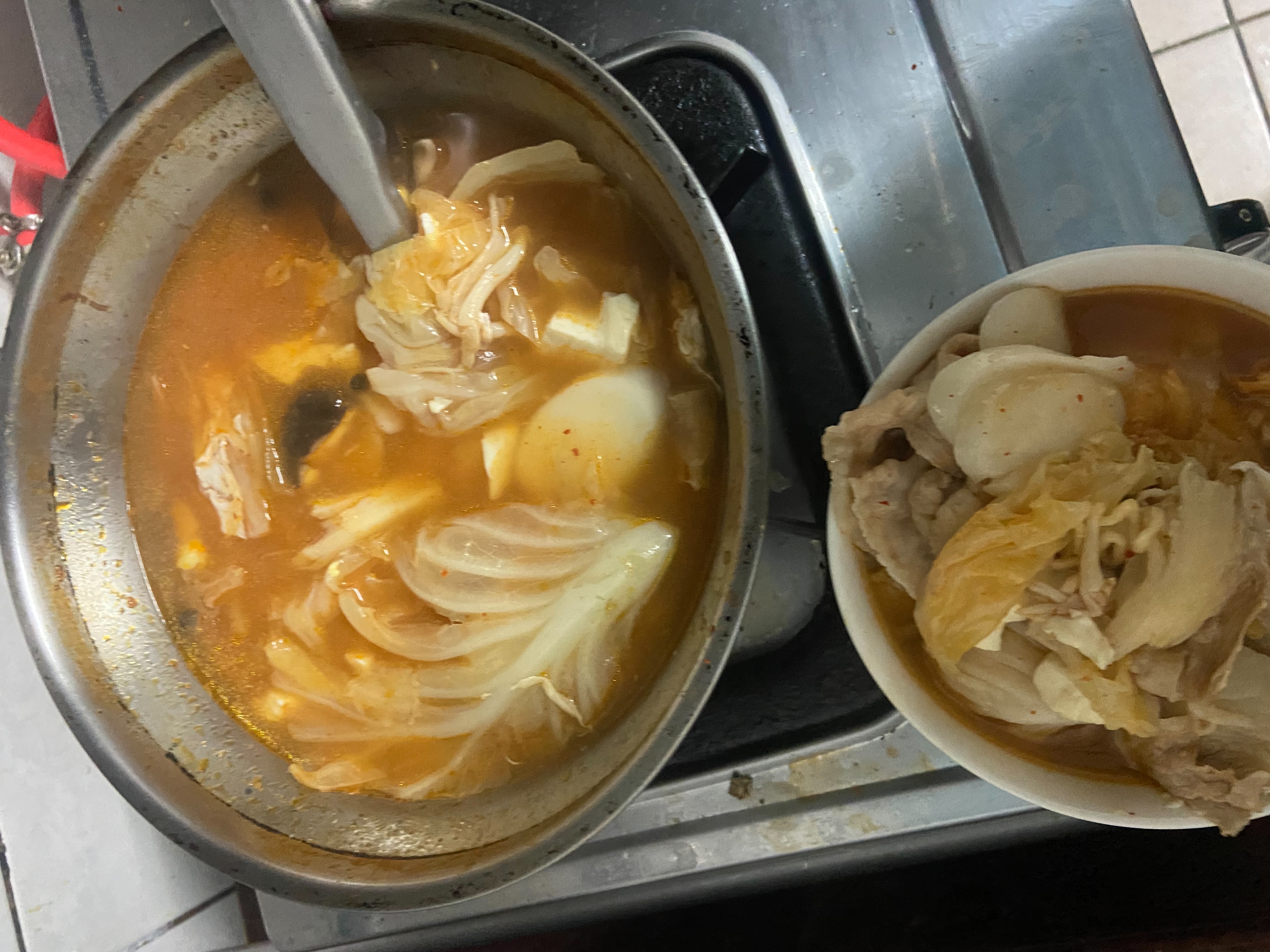 水、牛骨萃取物(牛骨萃取液(牛骨-澳洲產)、精鹽)、炒辣椒醬(辣椒粉、大豆油)、辣椒醬{小麥粉、辣椒醬(辣椒粉、海鹽、蒜、洋蔥、米細粉、大豆、玉米糖膠(粘稠劑))、起司高湯(水、切達起司(牛奶、鹽、凝乳酵素)、乳清粉、大豆油、鹽、牛奶、玉米糖膠)、精鹽、海鮮高湯(水、鯷魚萃取物、淡菜萃取物、蝦萃取物、蛤蜊萃取物、調味(5’-次黃嘌呤核苷磷酸二鈉、5’-鳥嘌呤核苷磷酸二鈉))、大醬(大豆、小麥粉、鹽、酒精)、醬油(水、鹽、大豆、小麥、酒精)、辛味牛油(牛油、洋蔥、蒜)、高湯(水、L-麩酸鈉、麥芽糊精、鹽、洋蔥粉)、糖、培根風味粉(鹽、麥芽糊精、葡萄糖、培根香料)、黑胡椒粉、牛肉風味粉(鹽、糖、牛肉萃取物(紐西蘭產))、調味劑(5’-次黃嘌呤核苷磷酸二鈉、5’-鳥嘌呤核苷磷酸二鈉)