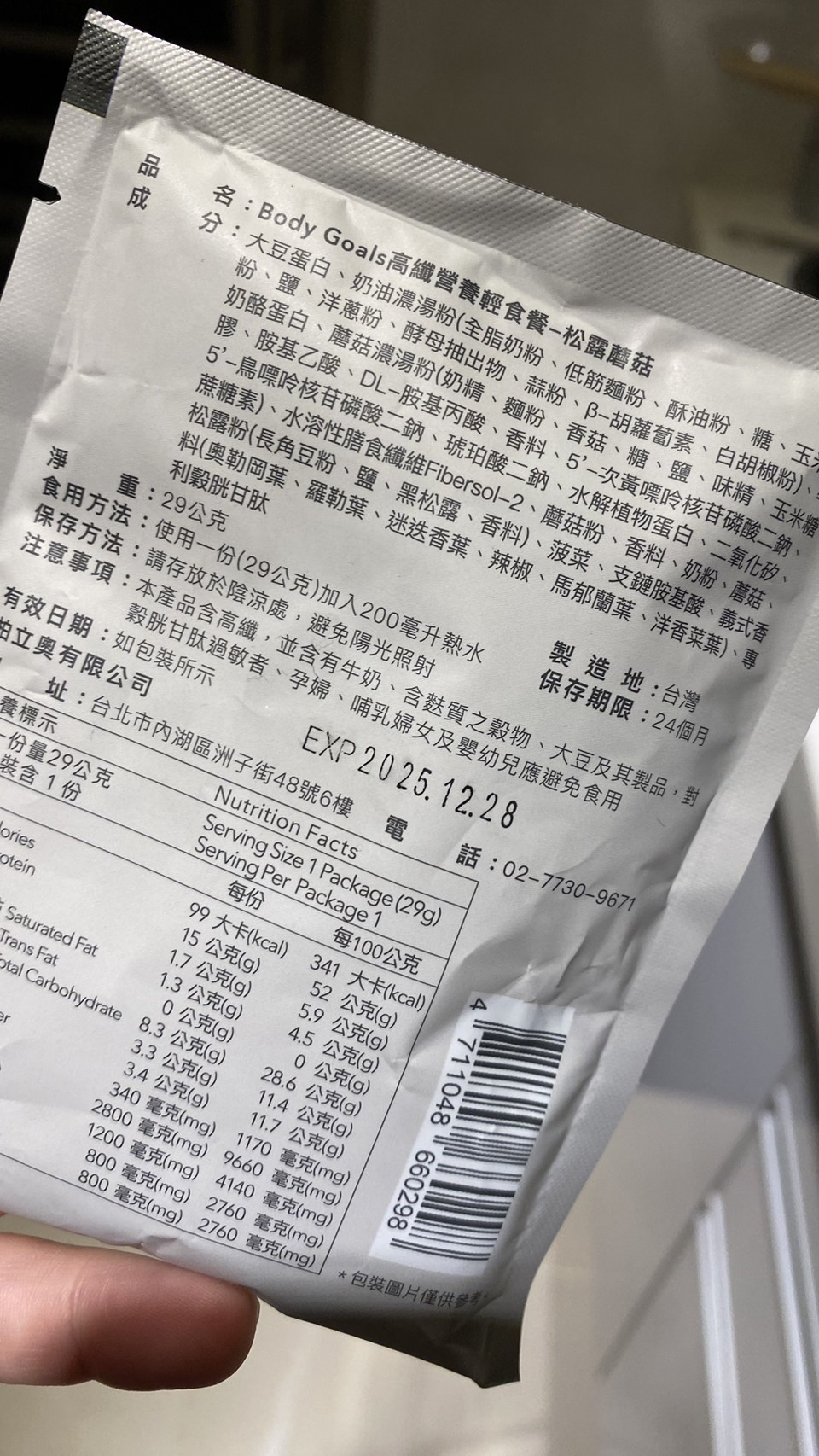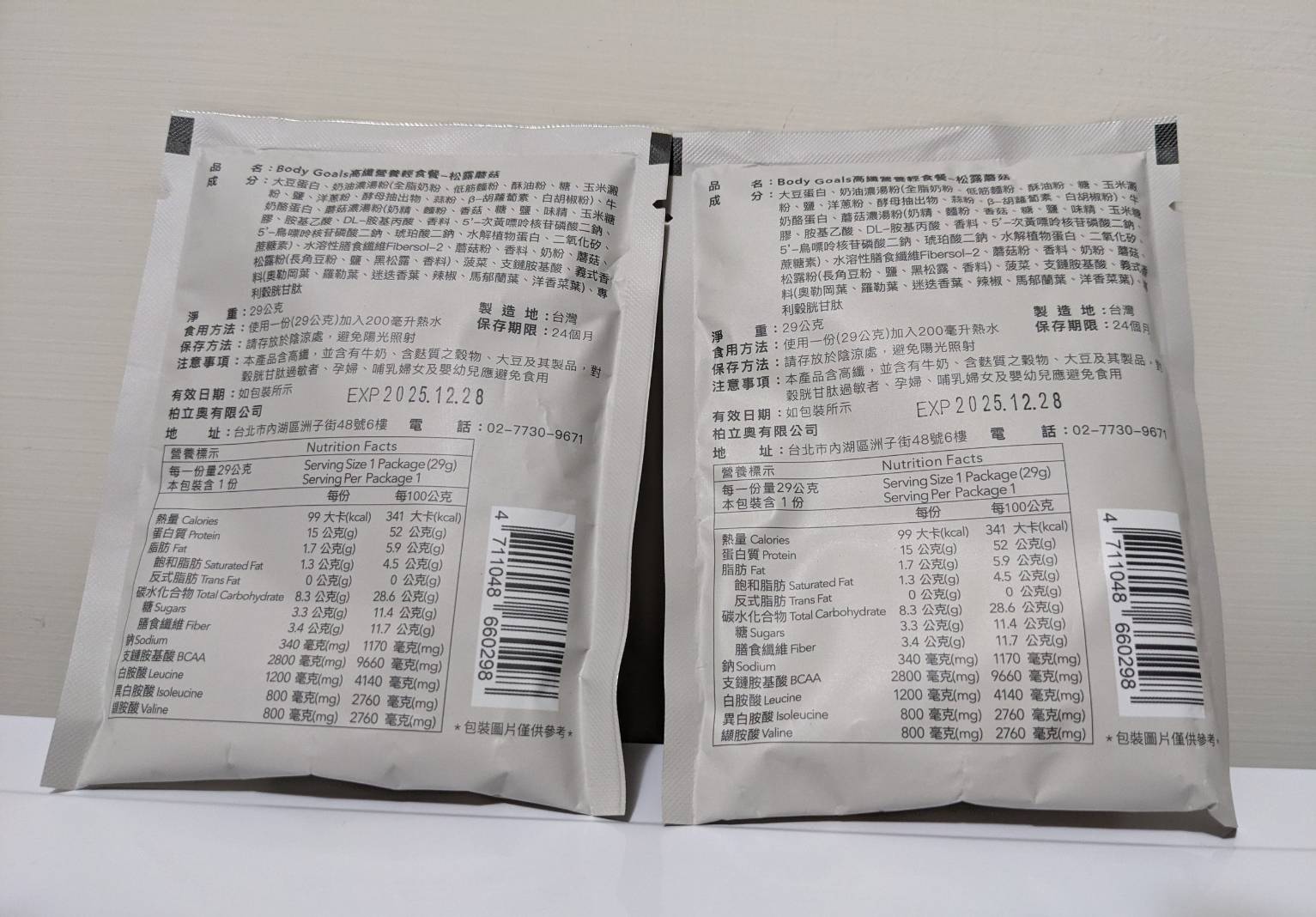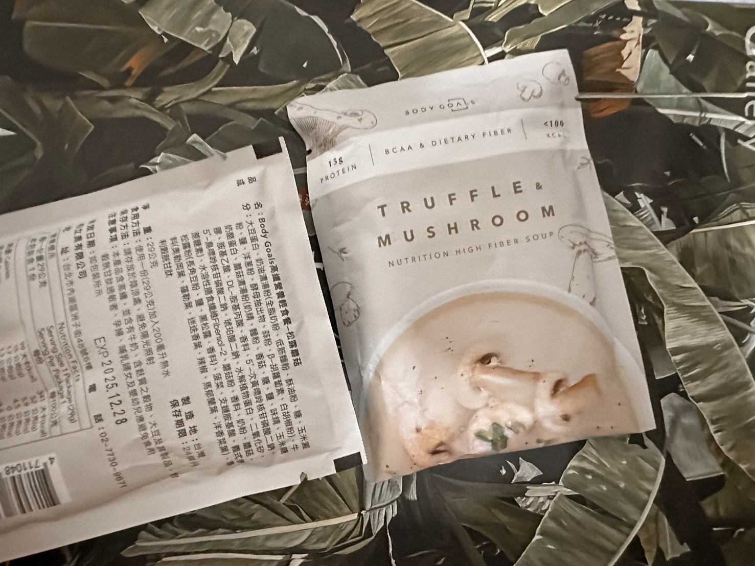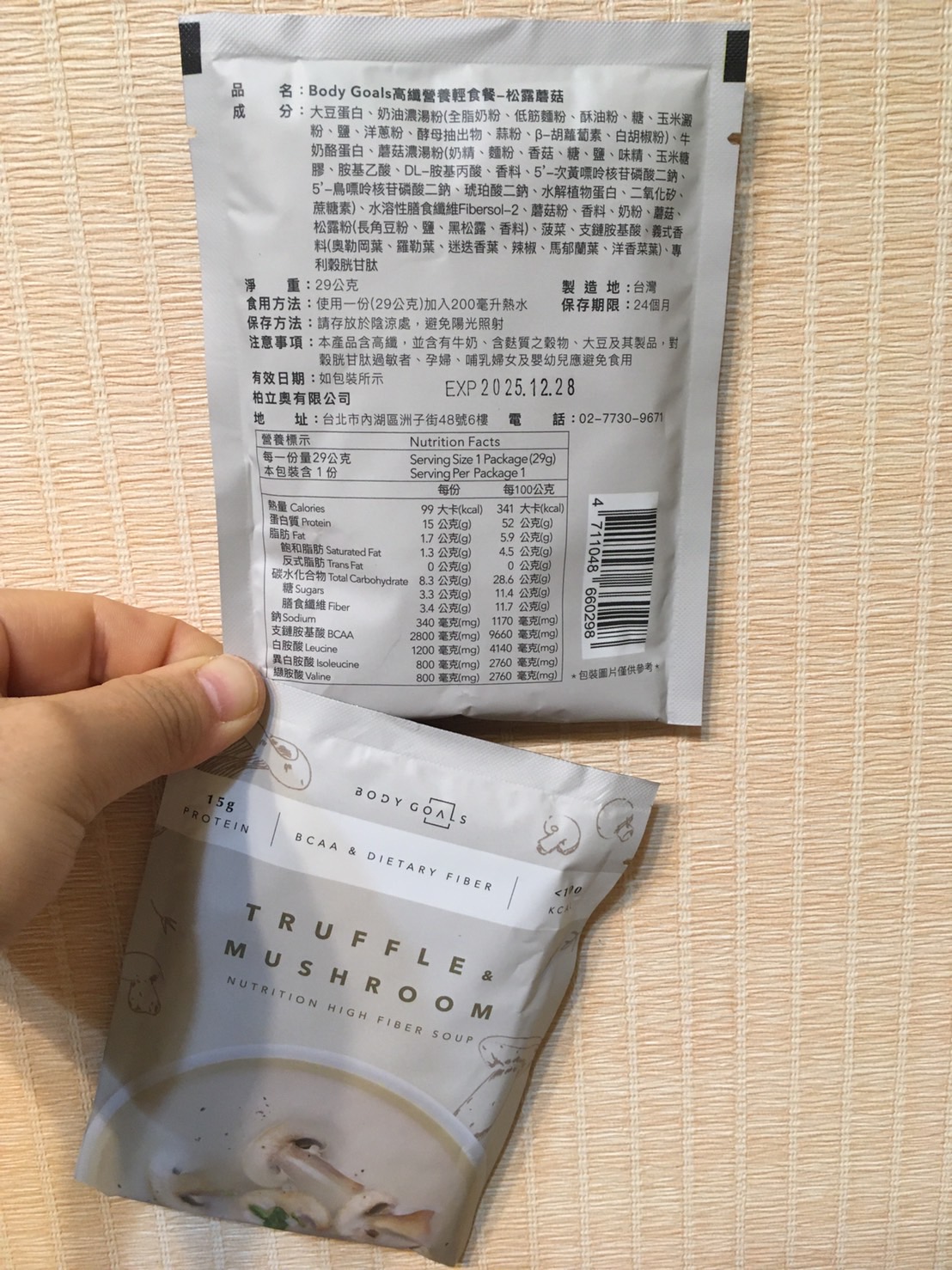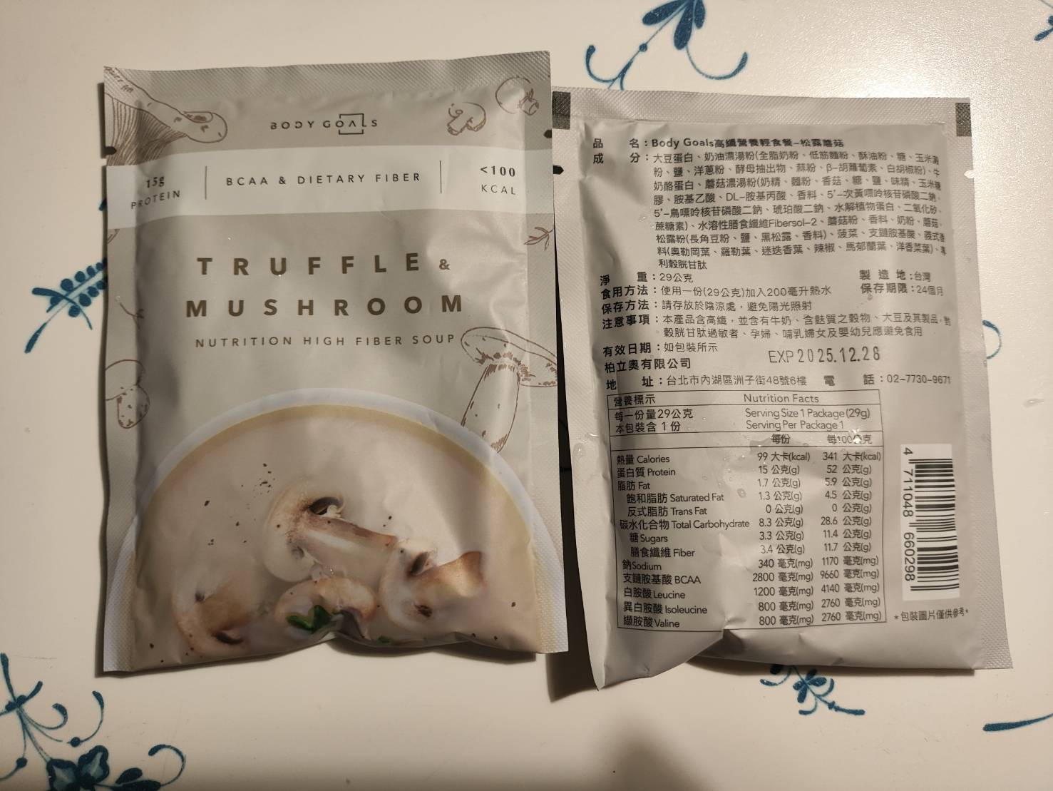 大豆蛋白、奶油濃湯粉(全脂奶粉、低筋麵粉、酥油粉、糖、玉米澱粉、鹽、洋蔥粉、酵母抽取物、蒜粉、β-胡蘿蔔素、白胡椒粉)、牛奶酪蛋白、蘑菇濃湯粉(奶精、麵粉、香菇、糖、鹽、味精、玉米糖膠、胺基乙酸、DL-胺基丙酸、香料、5' –鳥嘌呤核苷磷酸二鈉、琥珀酸二鈉、水解蛋白、二氧化矽、蔗糖素)、水溶性膳食纖維Fibersol-2、蘑菇粉、香料、奶粉、蘑菇、松露粉(長角豆粉、鹽、黑松露、香料)、菠菜、支鏈胺基酸、義式香料(奧勒岡葉、羅勒葉、迷迭香葉、辣椒、馬郁蘭葉、洋香菜葉)、專利穀胱甘肽