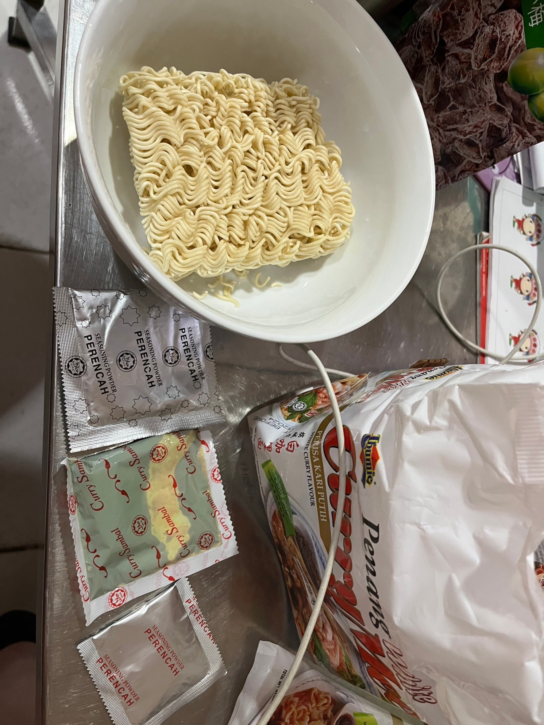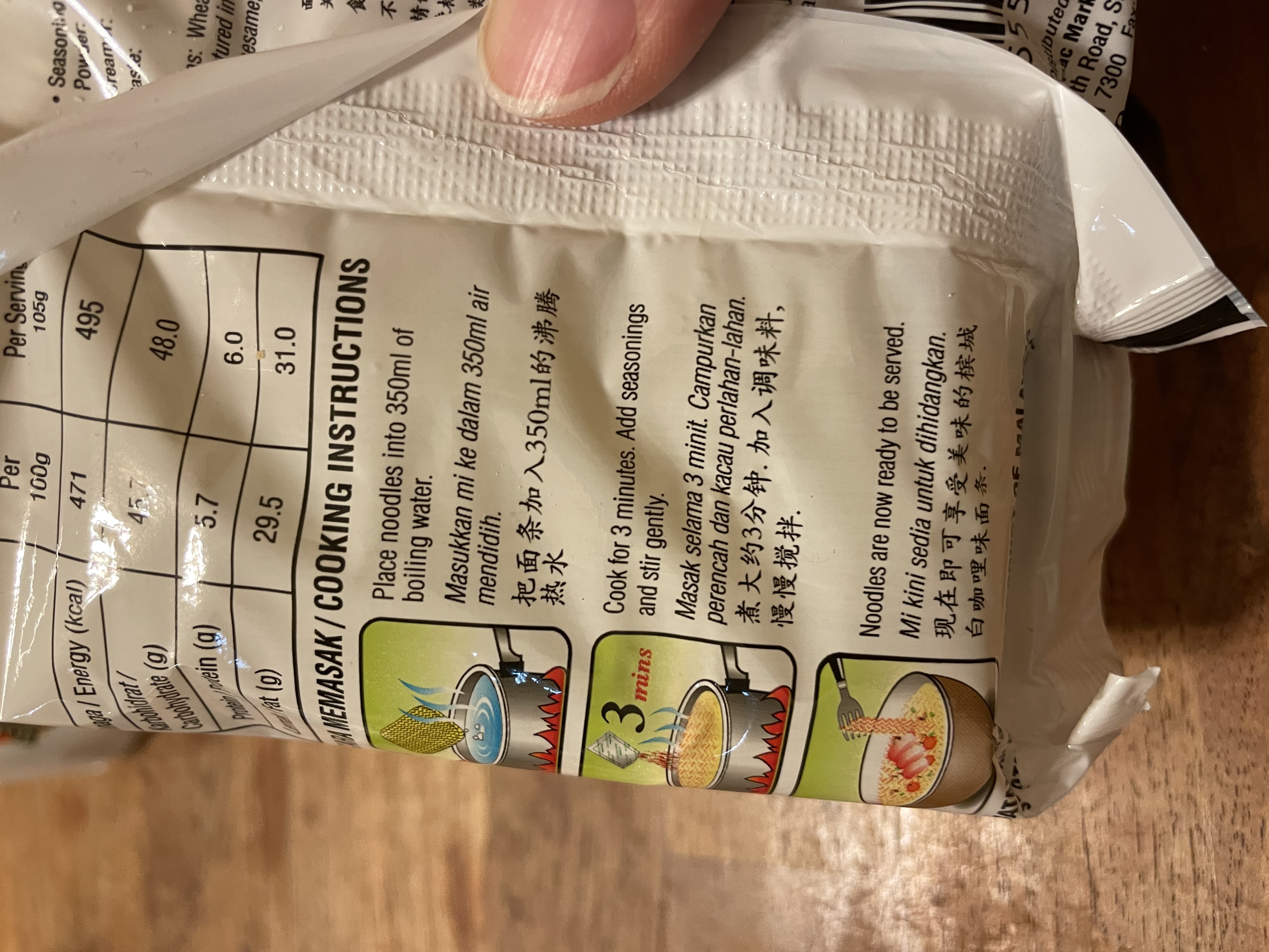 麵體:麵粉、棕櫚油、鹽、澎脹劑(碳酸鉀、碳酸鈉)、黏稠劑(羧甲基纖維素鈉)。