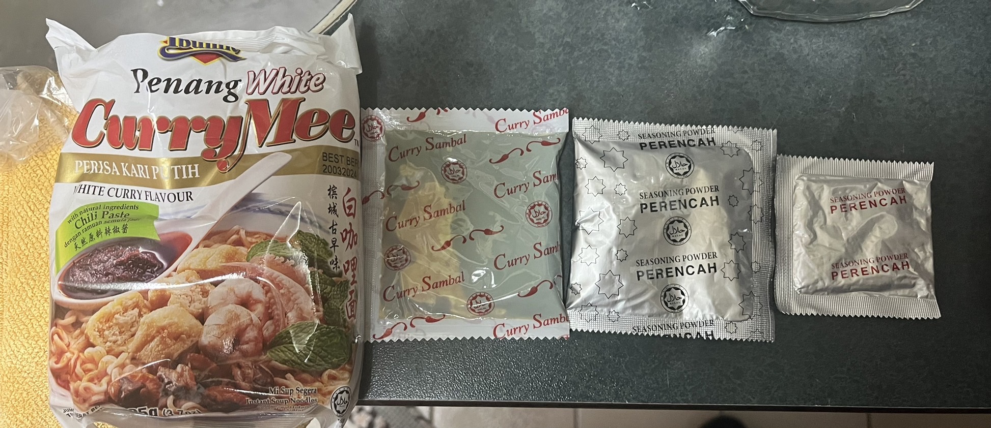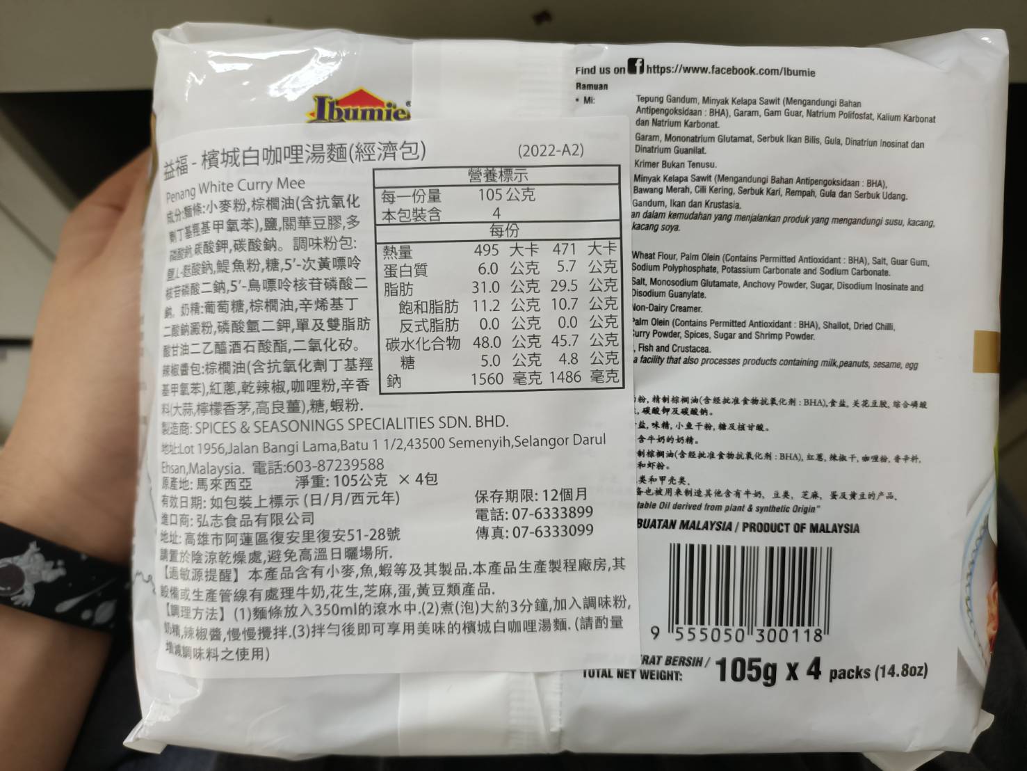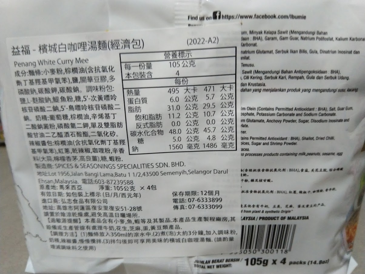 咖哩辣醬:辣椒、蒜頭、芫荽、南薑、鹽、糖、蝦糕、咖哩粉、香茅、薑黃、雞精粉、防腐劑(己二烯酸鉀)。