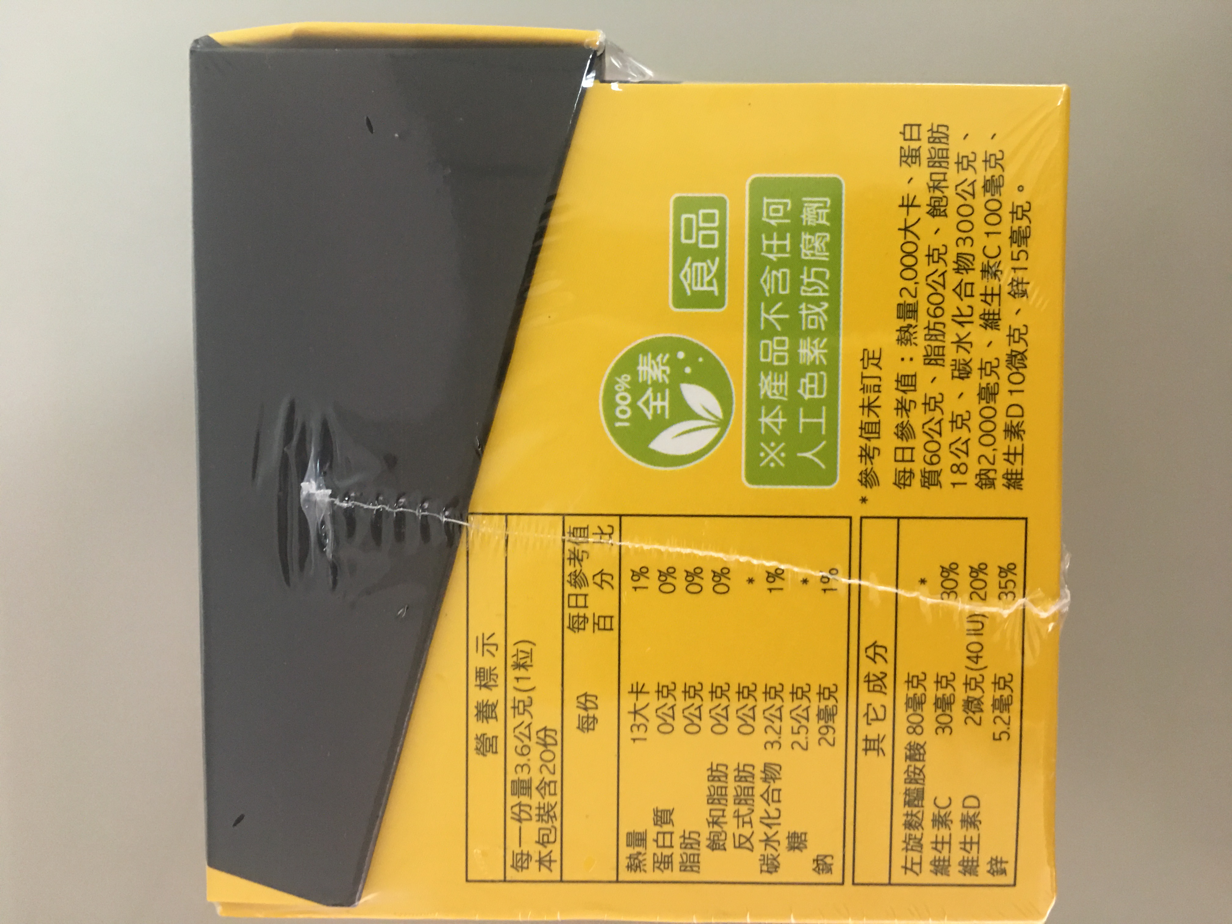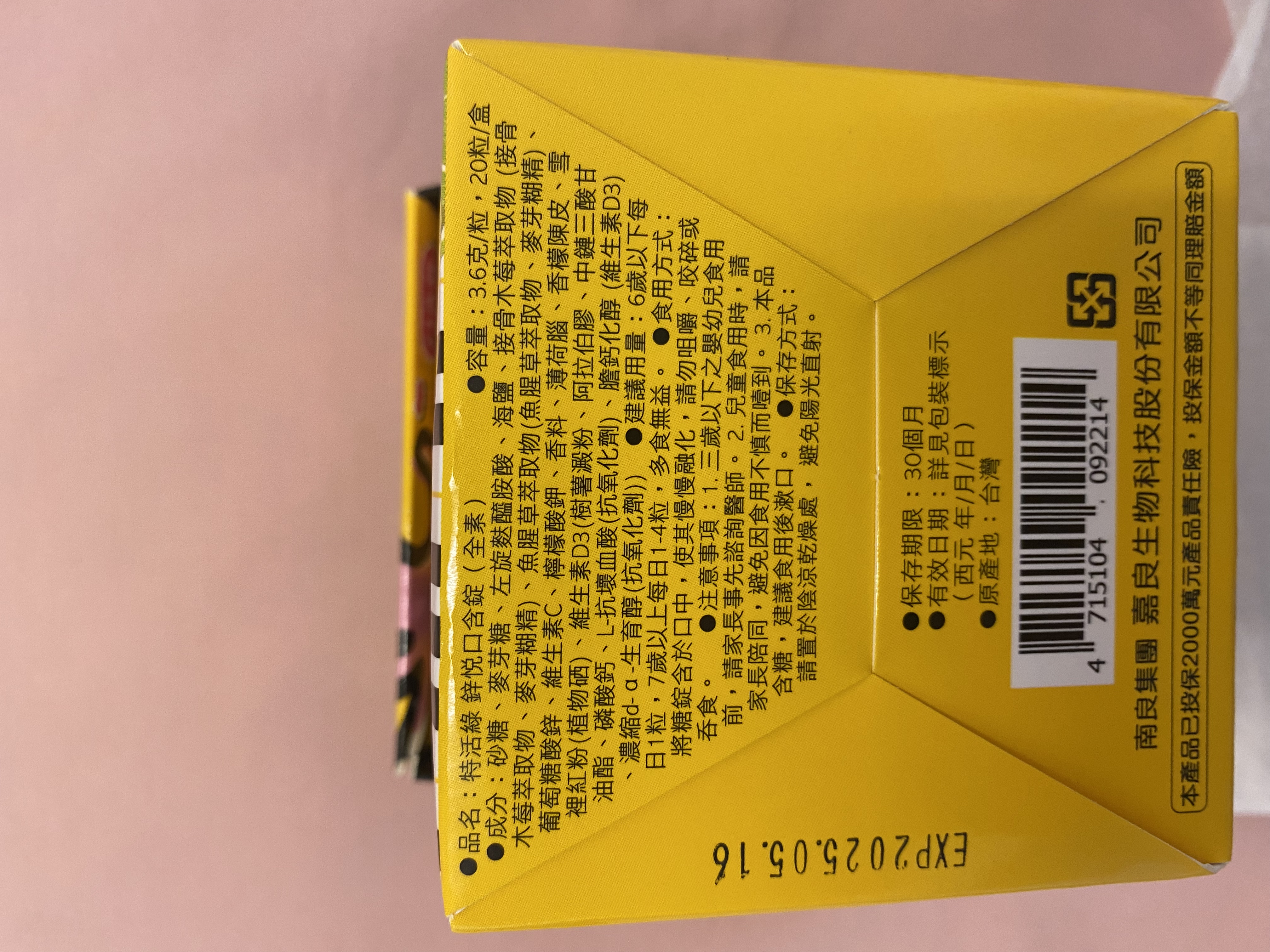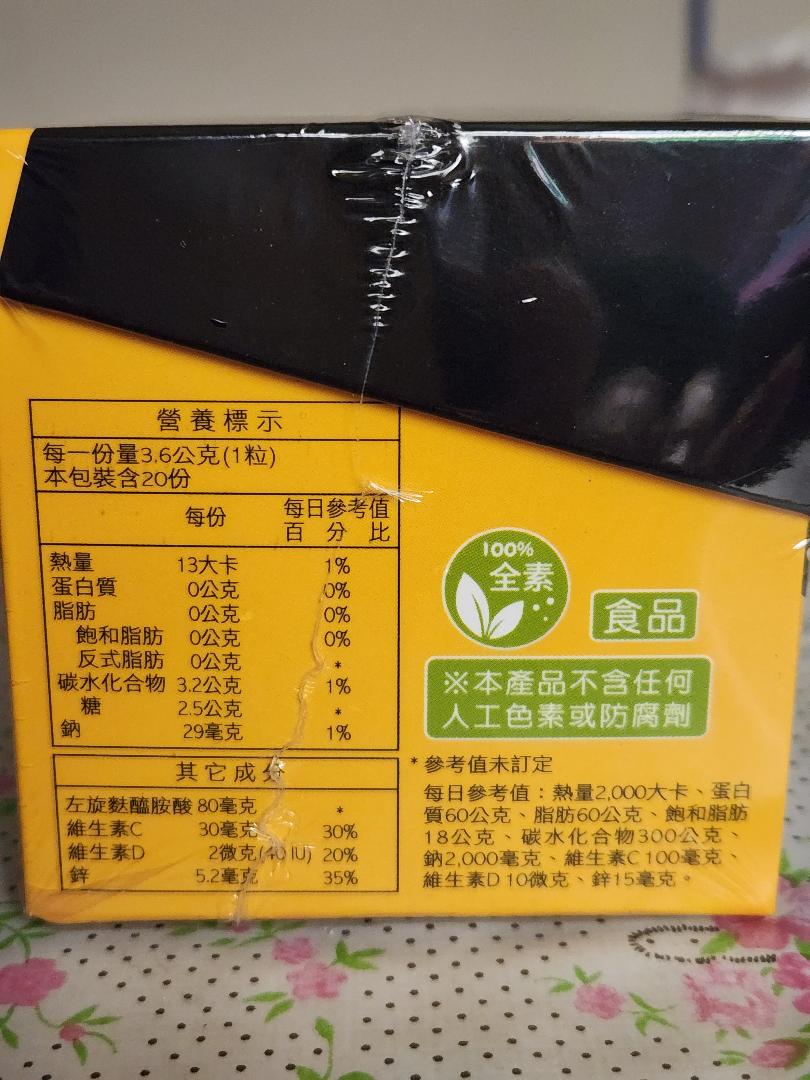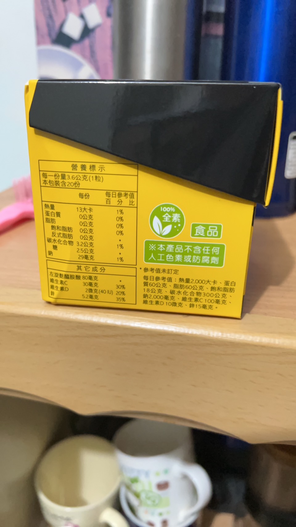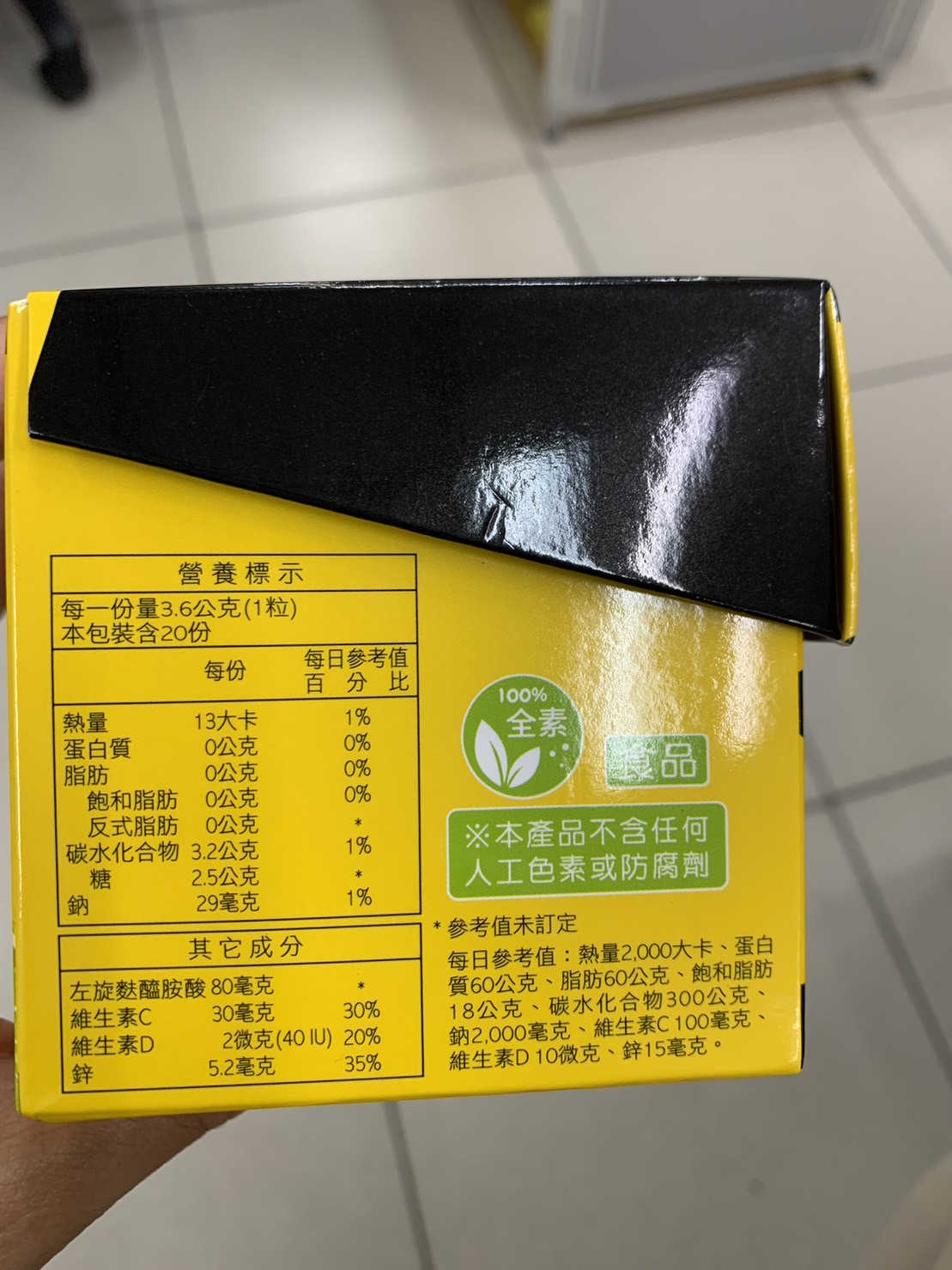 砂糖、麥芽糖、左旋麩醯胺酸、海鹽、接骨木莓萃取物 (接骨木莓萃取物、麥芽糊精)、魚腥草萃取物(魚腥草萃取物、麥芽糊精)、葡萄糖酸鋅、維生素C、檸檬酸鉀、香料、薄荷腦、香檬陳皮、雪裡紅粉(植物硒)、維生素D3(樹薯澱粉、阿拉伯膠、中鏈三酸甘油酯、磷酸鈣、L-抗壞血酸(抗氧化劑)、膽鈣化醇 (維生素D3)、濃縮d-α-生育醇(抗氧化劑))