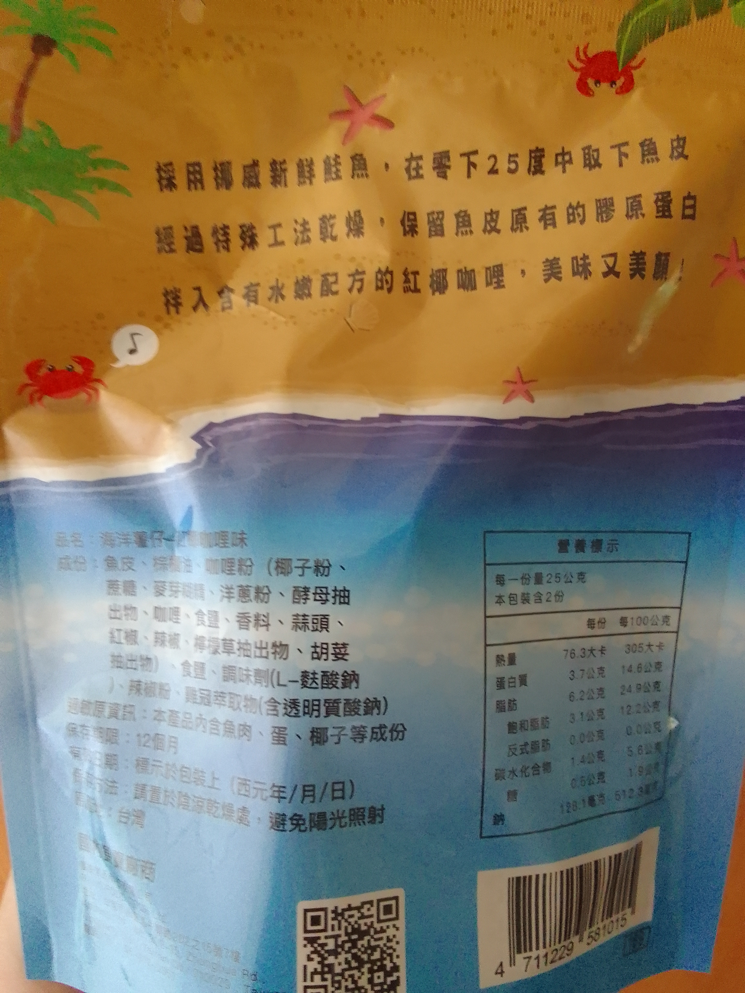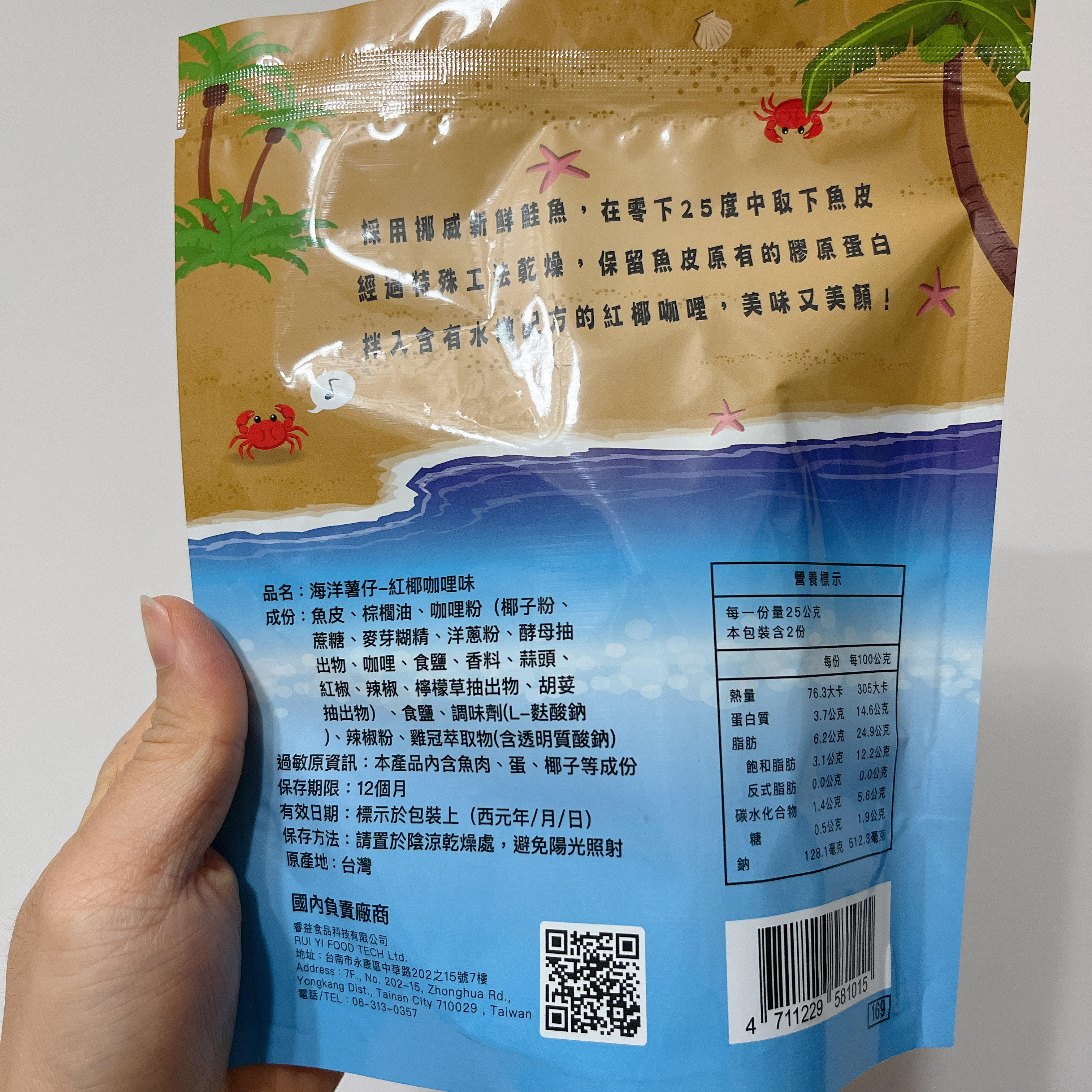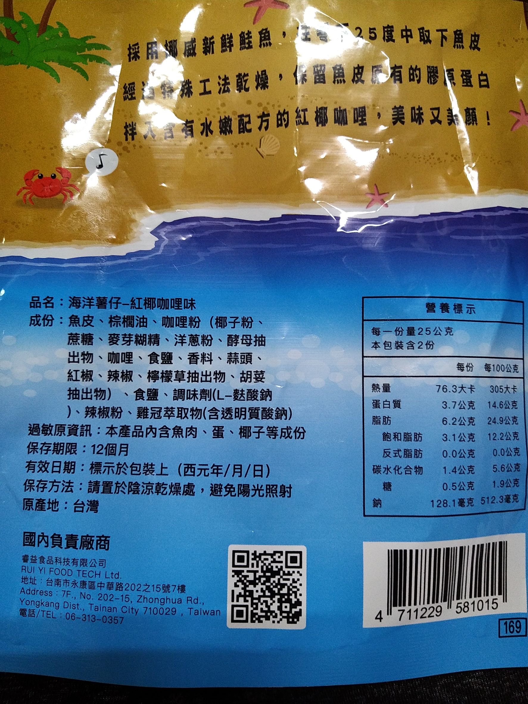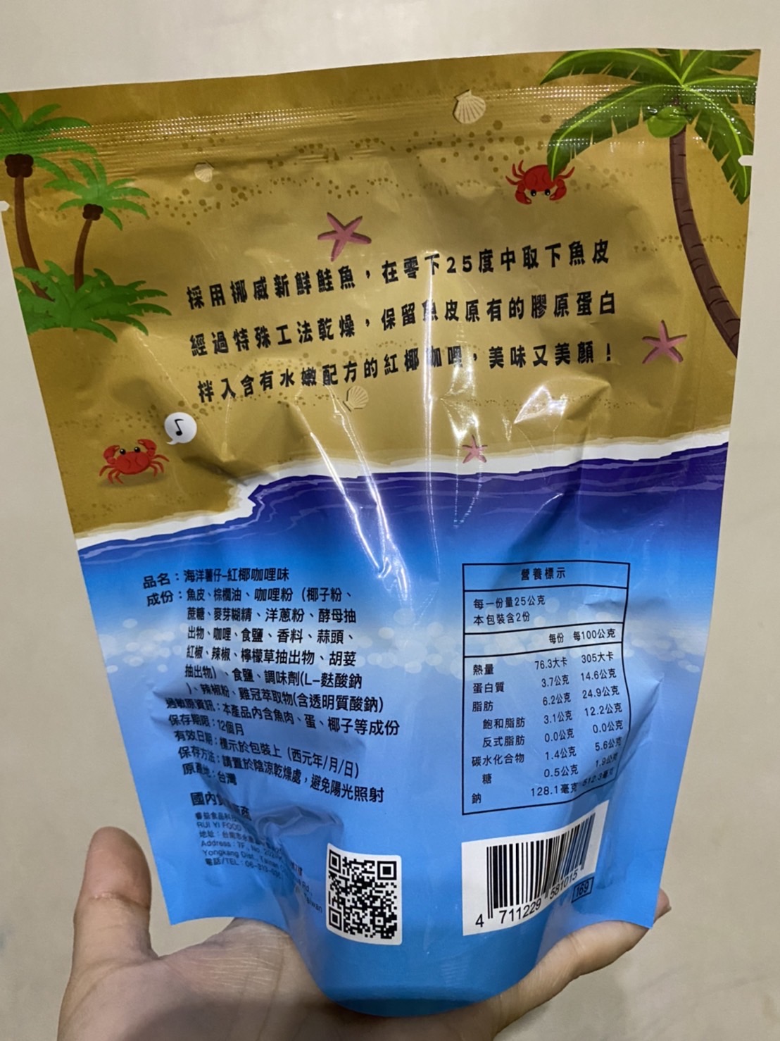 回列表 COUCH POTATO 沙發薯仔 酥脆魚皮 紅椰咖哩辣中帶甜 鹹香不膩 養顏解饞即開即享 市價149元 所需等級 一般會員以上 所需學分 60 體驗份數 15 關注人數 1112 申請人數 296 申請截止 品牌業者:COUCH POTATO 沙發薯仔 負責廠商 睿益食品科技有限公司 廠商地址 台南市永康區中華路202之15號7樓 產地 台灣 試用產品規格 50公克/包 食品業者登錄字號 D-185042163-00000-0 投保產品責任險字號 已投保 心得分享 商品介紹 商品成分 使用方法 注意事項 體驗名單 7.9 COUCH POTATO 沙發薯仔 酥脆魚皮 包裝美學 7.5 風味香氣 8.2 酥脆口感 8.5 涮嘴程度 7.9 建議推薦 8.0 心得分享 15則 Peggy 鑽石達人 31歲 彰化縣 2022/10/24 對COUCH POTATO 沙發薯仔 酥脆魚皮留下評價 7 收到包裹就迫不及待的打開,即使只有一包零食,保護的措施也做的相當完整。藍色的包裝讓人聯想到充滿海味的深海,一打開包裝撲鼻而來的則是濃濃香味,一口咬下超級酥脆“咔滋咔滋”的聲響不絕於耳,一開始清爽的檸檬味竄上舌尖,再來就是濃厚又帶點辣味的咖哩味,每一片都均勻的裹上咖哩粉,脆口的程度不亞於餅乾,不論是當清粥小菜還是下酒菜,或是露營時和三五好友一同談天說地的最佳良伴都很適合! 彭韻如 金食達人 55歲 新北市 2022/10/25 對COUCH POTATO 沙發薯仔 酥脆魚皮留下評價 8 海洋薯仔-紅椰咖哩味,一開始看到名稱,會以為是薯片。對於魚皮一直都很喜愛,在東南亞旅遊時,餐廳也能點到炸魚皮這道菜。海洋薯仔的包裝一打開,就聞到香濃的椰子味跟咖哩味,也有魚的味道,如果害怕魚腥味的人,一開始可能會有點抗拒,吃起來有紅咖喱的微辣口感,真的會一口接一口。除了直接吃,喜歡小酌的人,也可以搭配白酒。因為吃完了整包的魚皮,剩下的細屑單吃不太過癮,所以就留著當作咖哩魚鬆配白飯吃,還蠻可口的。廠商是否考慮研發咖哩魚鬆的產品😆。一包產品的份量感覺有點少,裏面的乾燥劑就挺有重量的。建議更改包裝袋,因為我沿著開口撕開兩邊後,都沒有撕到開口,另外用剪刀剪開。魚皮有少數兩三片片較不酥脆。除了以上的幾個小建議以外,這個產品含有膠原蛋白又有添加食用玻尿酸,熱量也不高,吃起來不會油膩也不會太鹹,我個人很喜歡這款零食。 吃貨仔均 金食達人 29歲 桃園市 2022/10/20 對COUCH POTATO 沙發薯仔 酥脆魚皮留下評價 8 咖哩味道非常濃郁,但咖哩的辛香料味道不會很刺激,是南洋風味的咖哩味,除了咖哩的香氣,還有一股很明顯的奶香味。魚皮很酥,但沒有新加坡版本的那麼酥脆,感覺還保有一些食材的水分。低溫烘烤的方式所以用手拿來吃也不會弄到手油油的,非油炸吃起來也比較不燥熱。包裝內的防潮做的很好,有一大包防潮包(仙貝或是海苔裡面會放的那種)跟一小包保鮮劑,不過標示的食物重量不確定是不是含防潮劑,如果包含的話,感覺有點被騙XD。 劉妤孜 銀食達人 25歲 新竹縣 2022/10/20 對COUCH POTATO 沙發薯仔 酥脆魚皮留下評價 8 外觀包裝採活潑可愛的配色,非常吸睛。酥脆的口感搭配上南洋風味的調味料,讓人瞬間置身東南亞的錯覺,微辣與咖喱的風味,非常適合小酌時搭配食用,裡面有附大大的脫氧包,以維持魚皮的脆度,希望廠商能做夾鏈式的開口,以利於保存。 張雅雁 金食達人 37歲 新北市 2022/10/21 對COUCH POTATO 沙發薯仔 酥脆魚皮留下評價 10 『 天然 、微健康、零食新選擇 』基本上零食就是零食,我們只能尋求相對健康或天然的加工食品。口感酥脆綿密,且帶有香濃的馬鈴薯和椰紅咖哩香氣...採用挪威新鮮鮭魚..保留了膠原蛋白...裡面有魚皮、棕梠油、咖哩粉(椰子粉、蔗糖、麥芽糊精、洋蔥粉、酵母抽出物、咖哩、食鹽、香料、蒜頭、紅椒、辣椒、檸檬草抽出物、胡荽抽出物)、食鹽、調味劑(L-麩酸鈉)、辣椒粉、雞冠萃取物(含透明質酸鈉) Maggie LIN 金食達人 35歲 新竹市 2022/10/21 對COUCH POTATO 沙發薯仔 酥脆魚皮留下評價 7 有點意外取得試用資格,打開看到封面包裝是一個大大的馬鈴薯頭,滿可愛的,結果沒想到原來是酥脆魚皮。一撕開包裝,就有南洋風味的調料撲鼻而來,忍不住想吃吃看是什麼口味及口感。覺得很不錯的是,裡頭的魚皮都幾乎是完整的大片塊狀,而不是散碎的,很方便食用,也不會掉滿地。算是稍微重口味的零食,但吃起來卻沒有油耗味。還不錯,但對於小朋友來說可能有點微辣。是個下酒的好夥伴。 林欣慧 金食達人 29歲 臺南市 2022/10/23 對COUCH POTATO 沙發薯仔 酥脆魚皮留下評價 9 COUCH POTATO 沙發薯仔 酥脆魚皮 紅椰咖哩,很有特色的零食,竟然是用真的新鮮魚皮做成的!而且處理的也很好,完全沒有擾人的魚腥味!紅椰咖哩口味也很特別,一打開就可以聞到濃厚的香氣,口感非常酥脆,帶點微微辣度,鹹甜鹹甜的,每片魚皮也都均勻的佈滿紅椰咖哩,吃起來不油膩,但口味可能稍微偏重,蠻適合當下酒菜的! 李欣任 鑽石達人 45歲 桃園市 2022/10/23 對COUCH POTATO 沙發薯仔 酥脆魚皮留下評價 9 1.魚皮所使用的原料需要清楚的標示於成份裡,畢竟不是每個人都了解魚的種類.2.魚皮和咖哩的組成,讓人感到驚艷.只是辣椒有點小辣,所以魚皮適合配飯配粥食用,較為合適許多.3.魚皮的分量,在視覺上稍微不足ㄧ些,如果能在噌加些會更棒.4.總結:此產品適合大人小孩一起食用,可以當做下酒菜喔! 黃佩貞 金食達人 42歲 彰化縣 2022/10/25 對COUCH POTATO 沙發薯仔 酥脆魚皮留下評價 10 非常迅速收到試吃品,