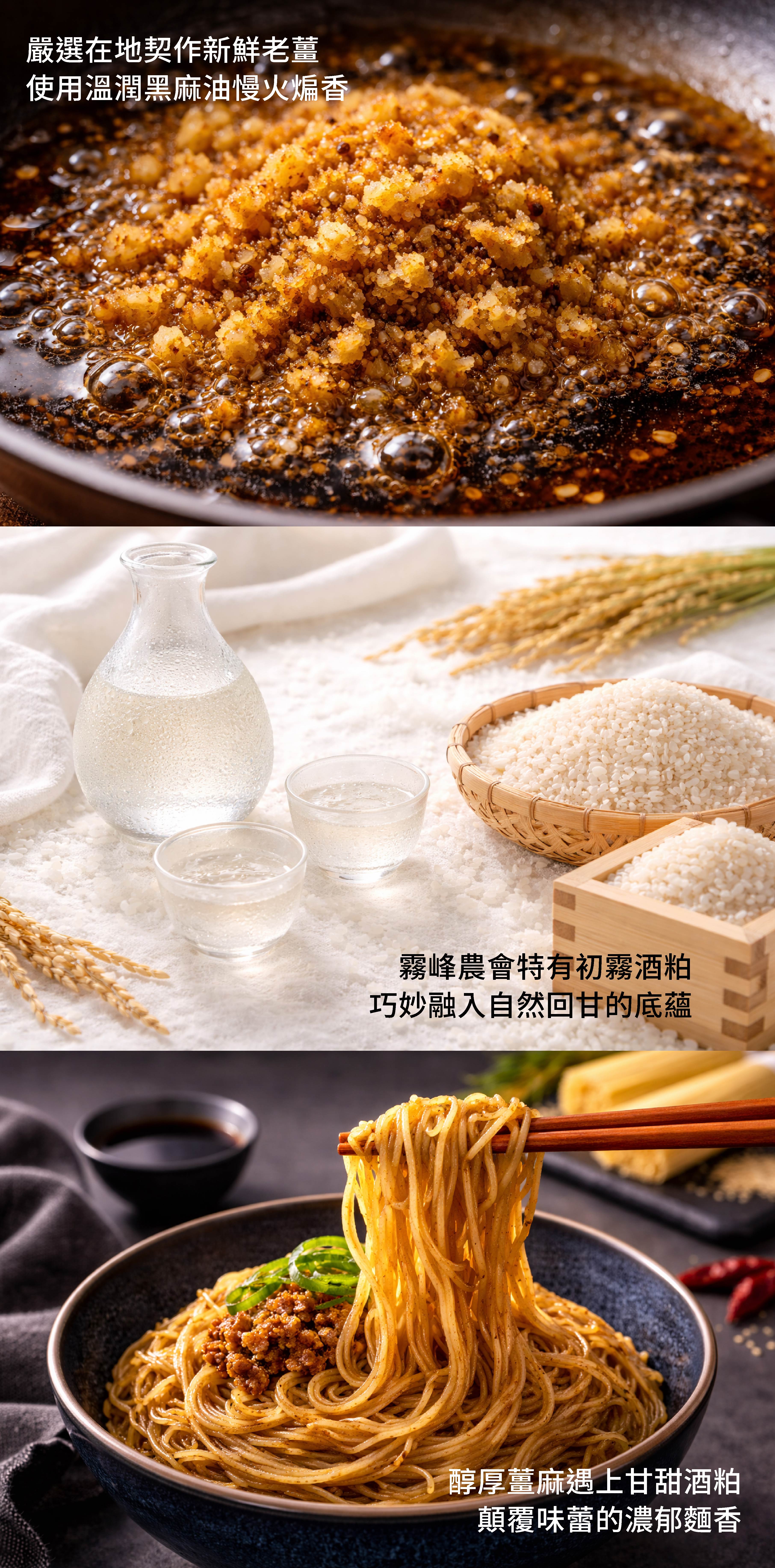 植物油(棕櫚油、芝麻油、黃豆油)、蔥酥(紅蔥、棕櫚油、玉米澱粉)、水、鹽、蒜頭、釀造醬汁(水、非基因改造黃豆、小麥、鹽)、烏醋、L-酸鈉、糖、辣椒醬(辣椒、鹽)、大豆結構蛋白(非基因改造)、芝麻粉、黑胡椒粉、酵母抽出物、5'-次黃呤核昔磷酸二鈉、5'-鳥哈核磷酸二鈉