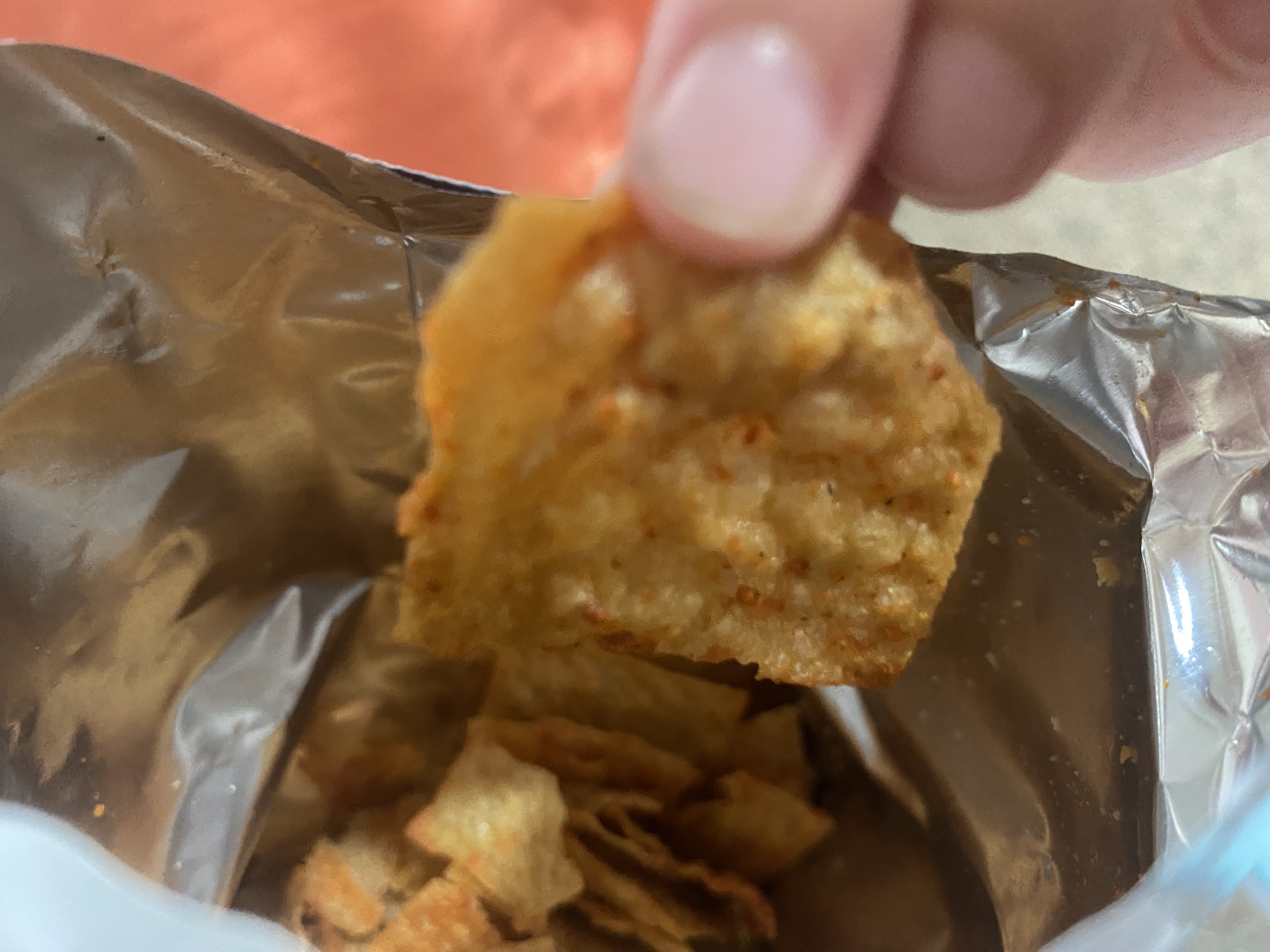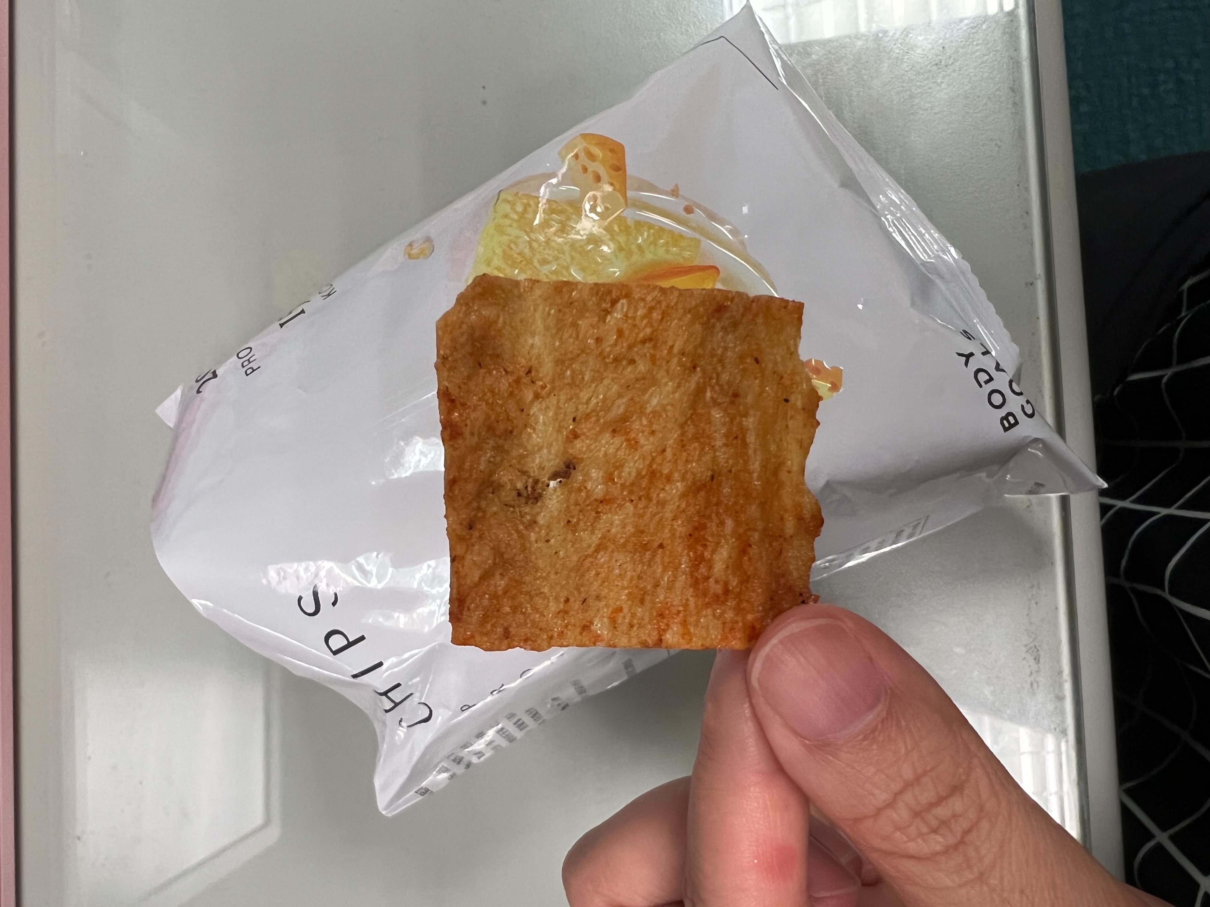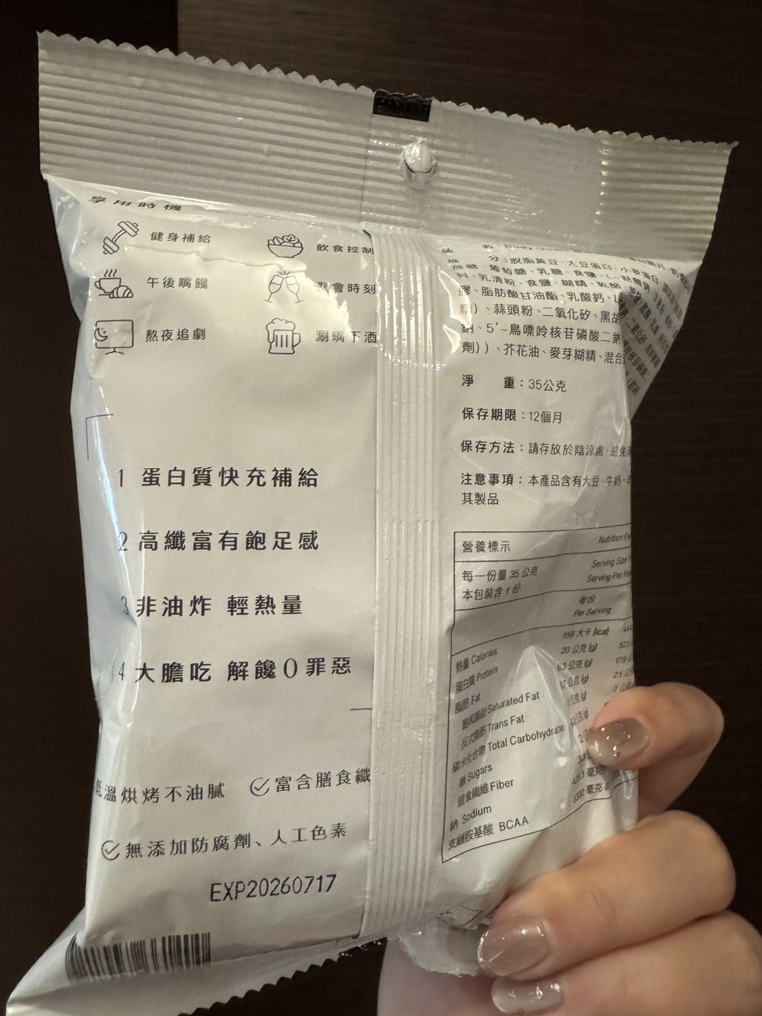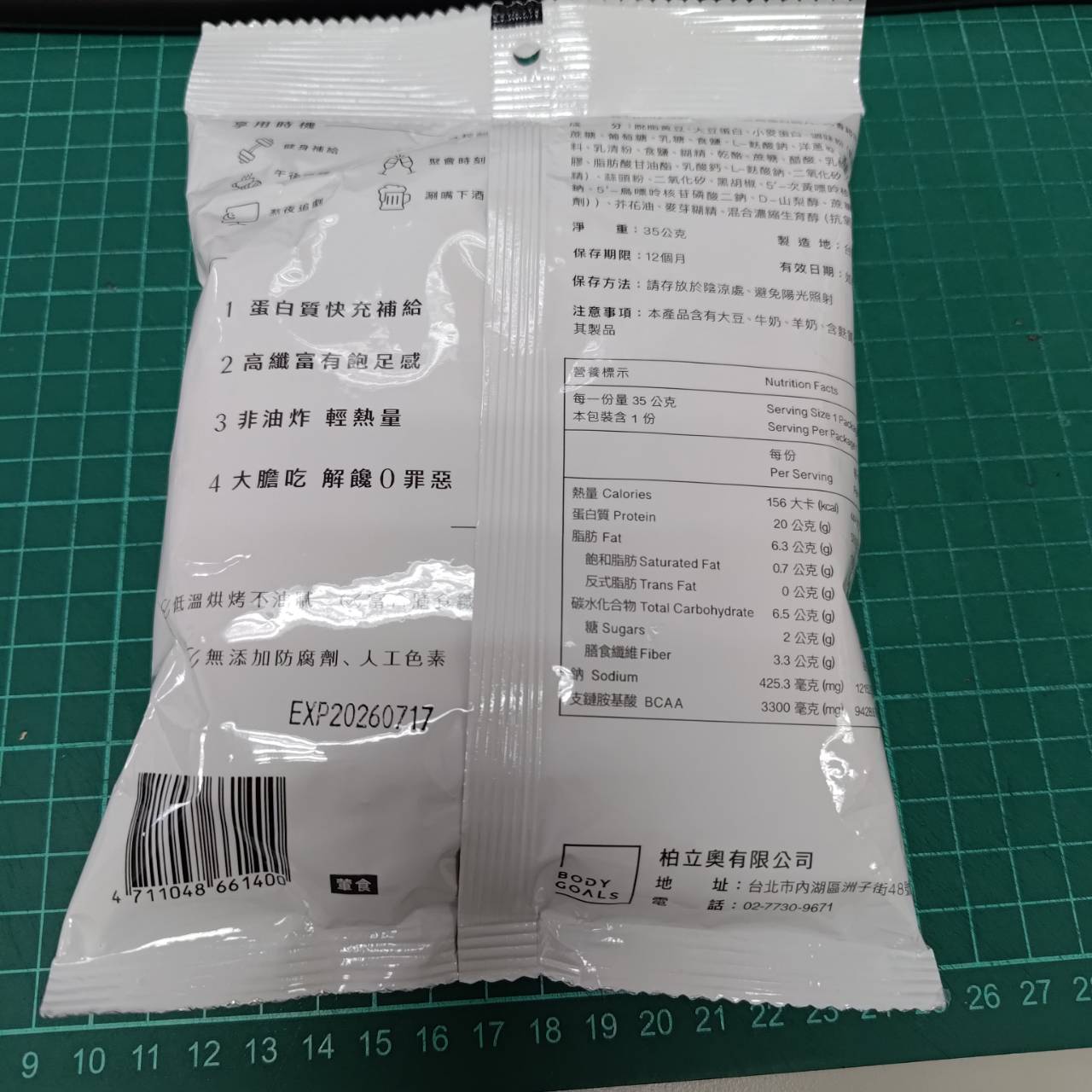 脫脂黃豆、大豆蛋白、小麥蛋白、調味粉(乾酪、蔗糖、葡萄糖、乳糖、食鹽、L-麩酸鈉、洋蔥粉、香料(香料、乳清粉、食鹽、糊精、乾酪、蔗糖、醋酸、乳酸、阿拉伯膠、脂肪酸甘油酯、乳酸鈣、L-麩酸鈉、二氧化矽、馬鈴薯糊精)、蒜頭粉、二氧化矽、黑胡椒、5’-次黃嘌呤核苷磷酸二鈉、5’-鳥嘌呤核苷磷酸二鈉、D-山梨醇、蔗糖素(甜味劑))、芥花油、麥芽糊精、混合濃縮生育醇(抗氧化劑)