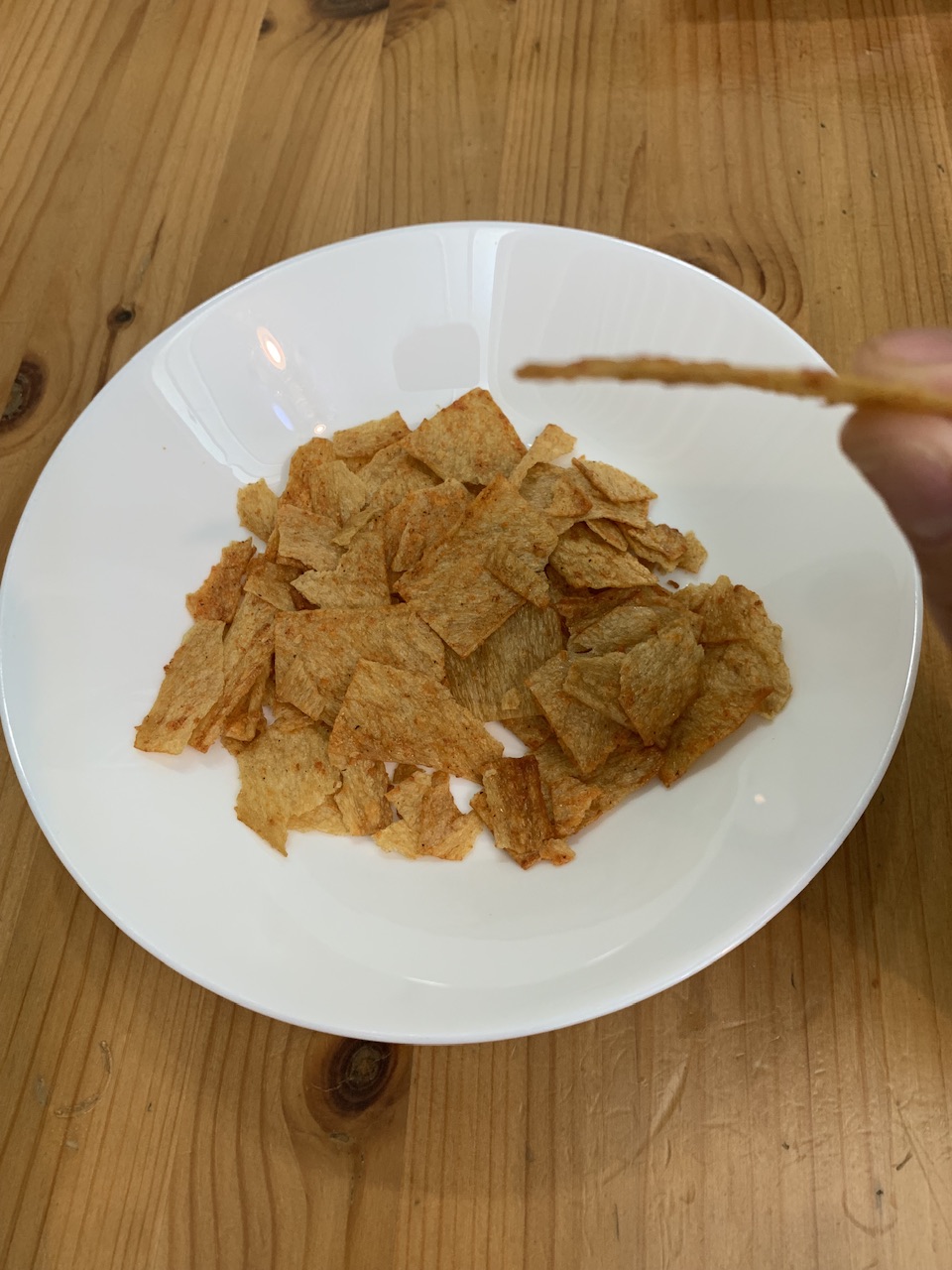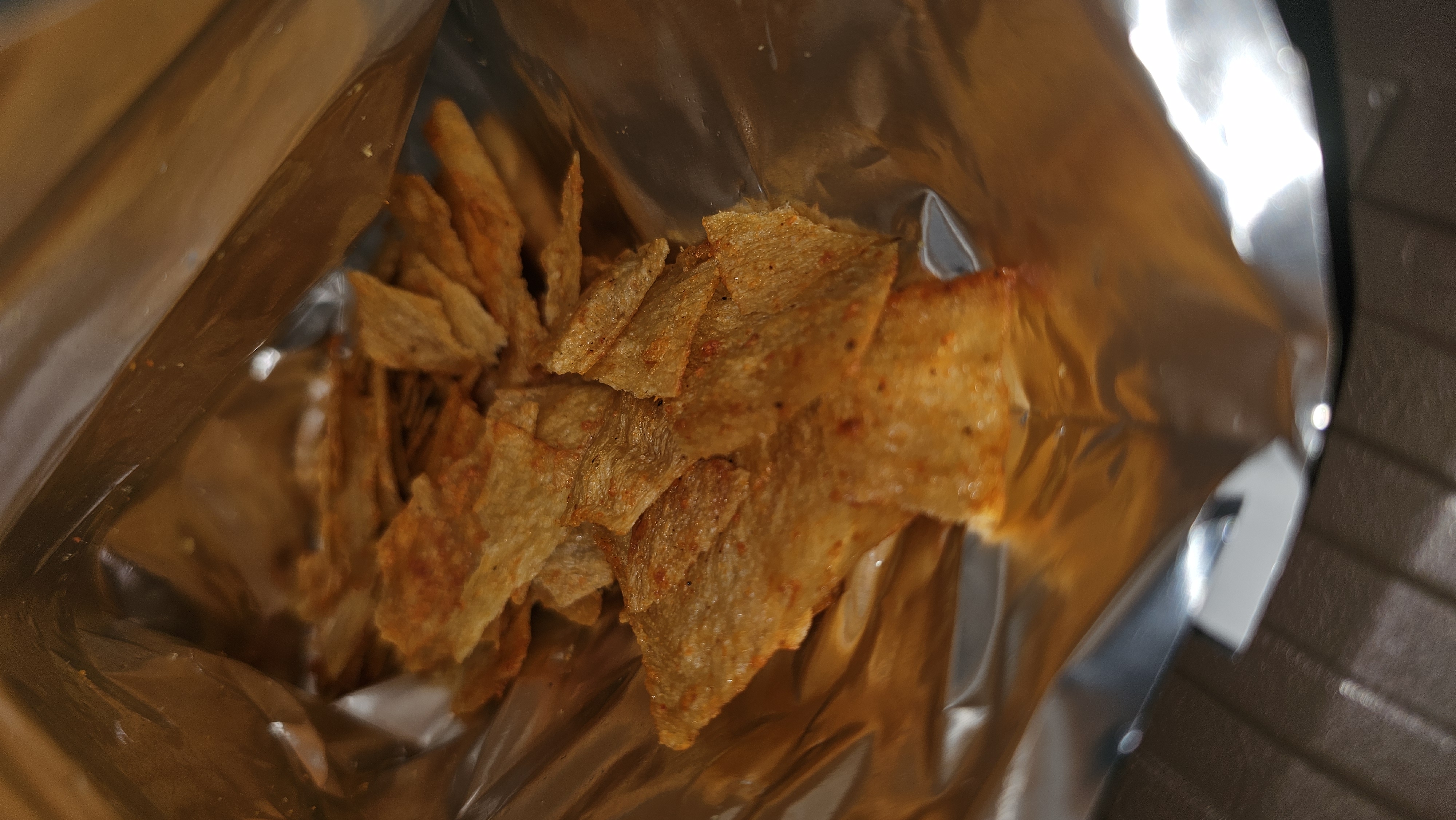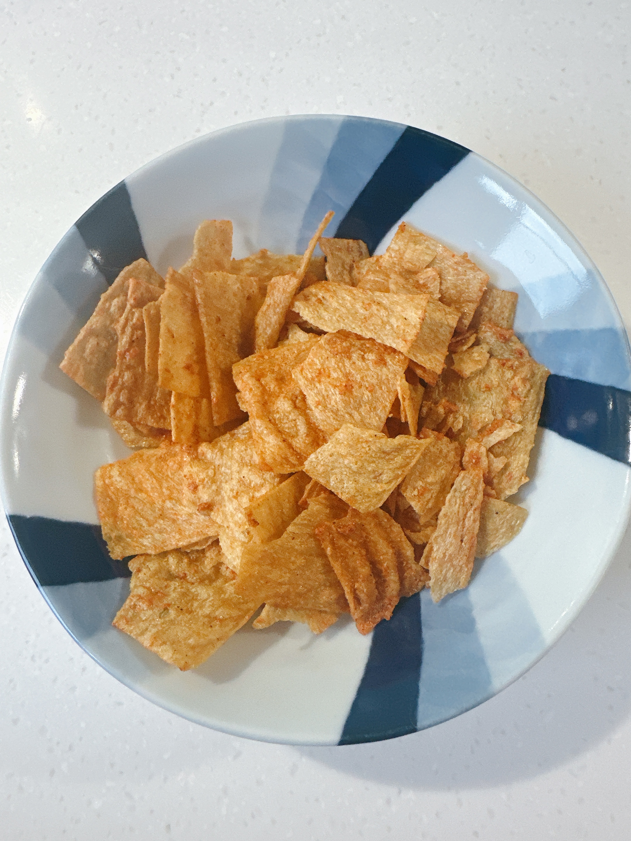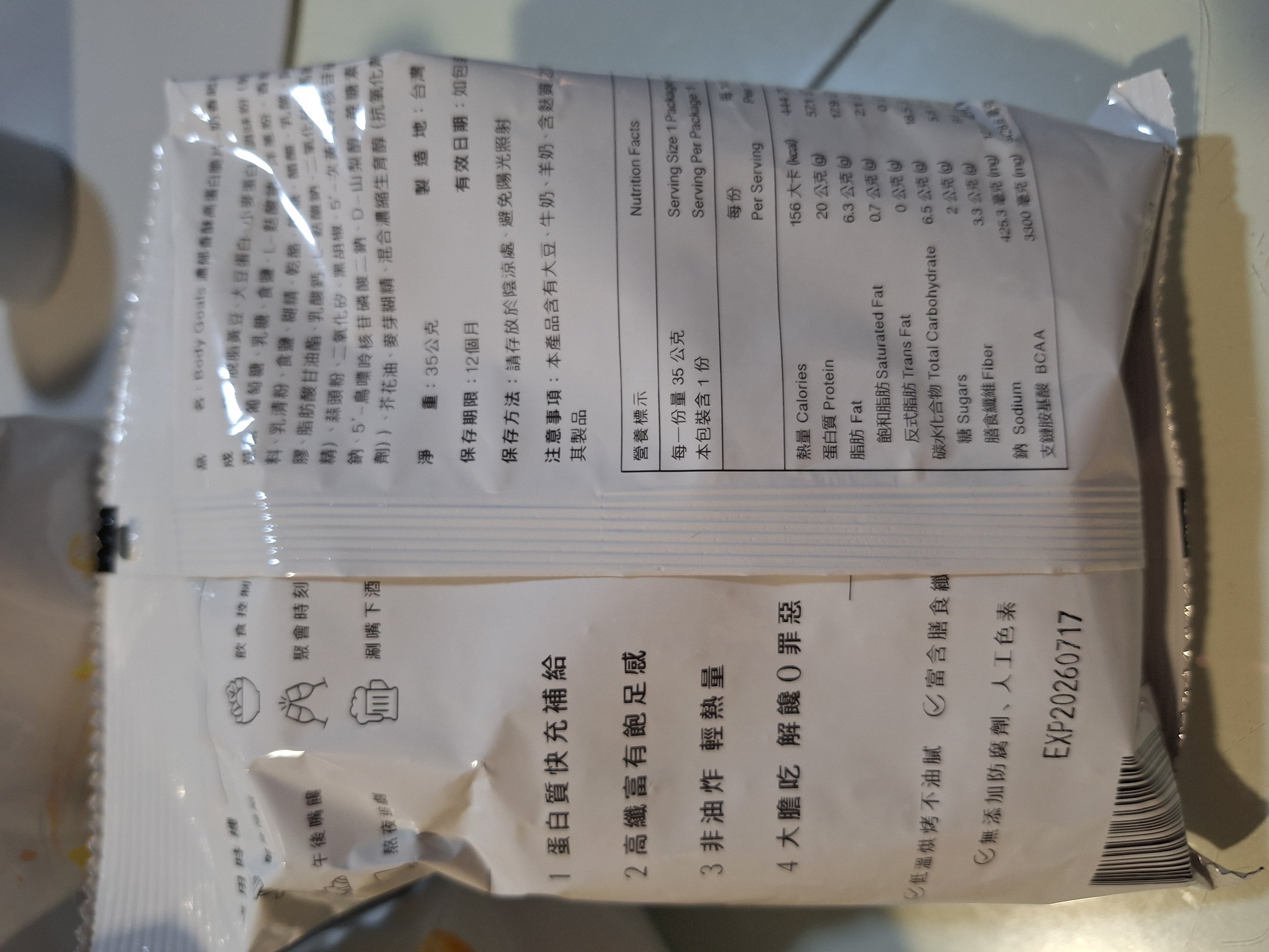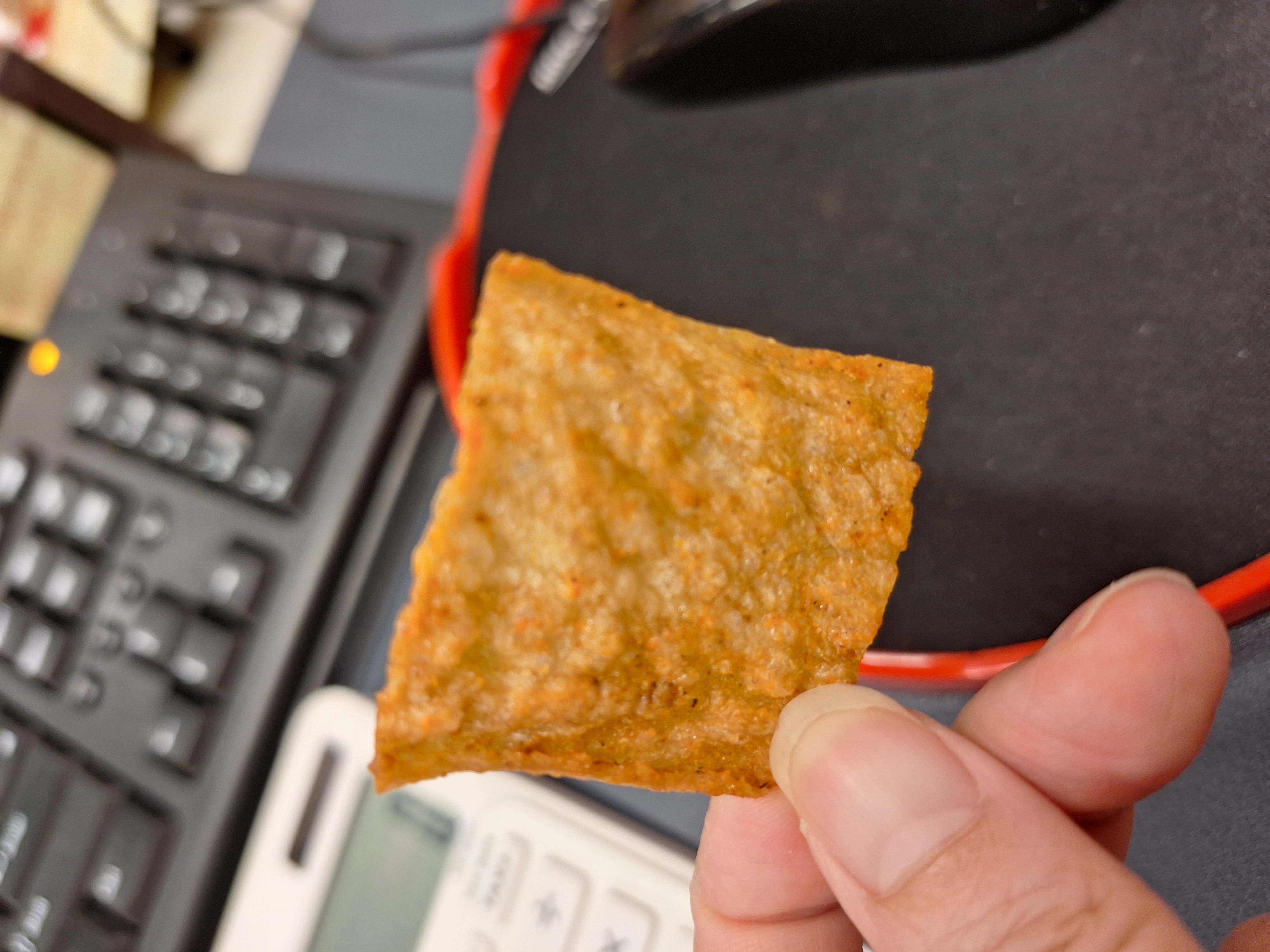 脫脂黃豆、大豆蛋白、小麥蛋白、調味粉(乾酪、蔗糖、葡萄糖、乳糖、食鹽、L-麩酸鈉、洋蔥粉、香料(香料、乳清粉、食鹽、糊精、乾酪、蔗糖、醋酸、乳酸、阿拉伯膠、脂肪酸甘油酯、乳酸鈣、L-麩酸鈉、二氧化矽、馬鈴薯糊精)、蒜頭粉、二氧化矽、黑胡椒、5’-次黃嘌呤核苷磷酸二鈉、5’-鳥嘌呤核苷磷酸二鈉、D-山梨醇、蔗糖素(甜味劑))、芥花油、麥芽糊精、混合濃縮生育醇(抗氧化劑)