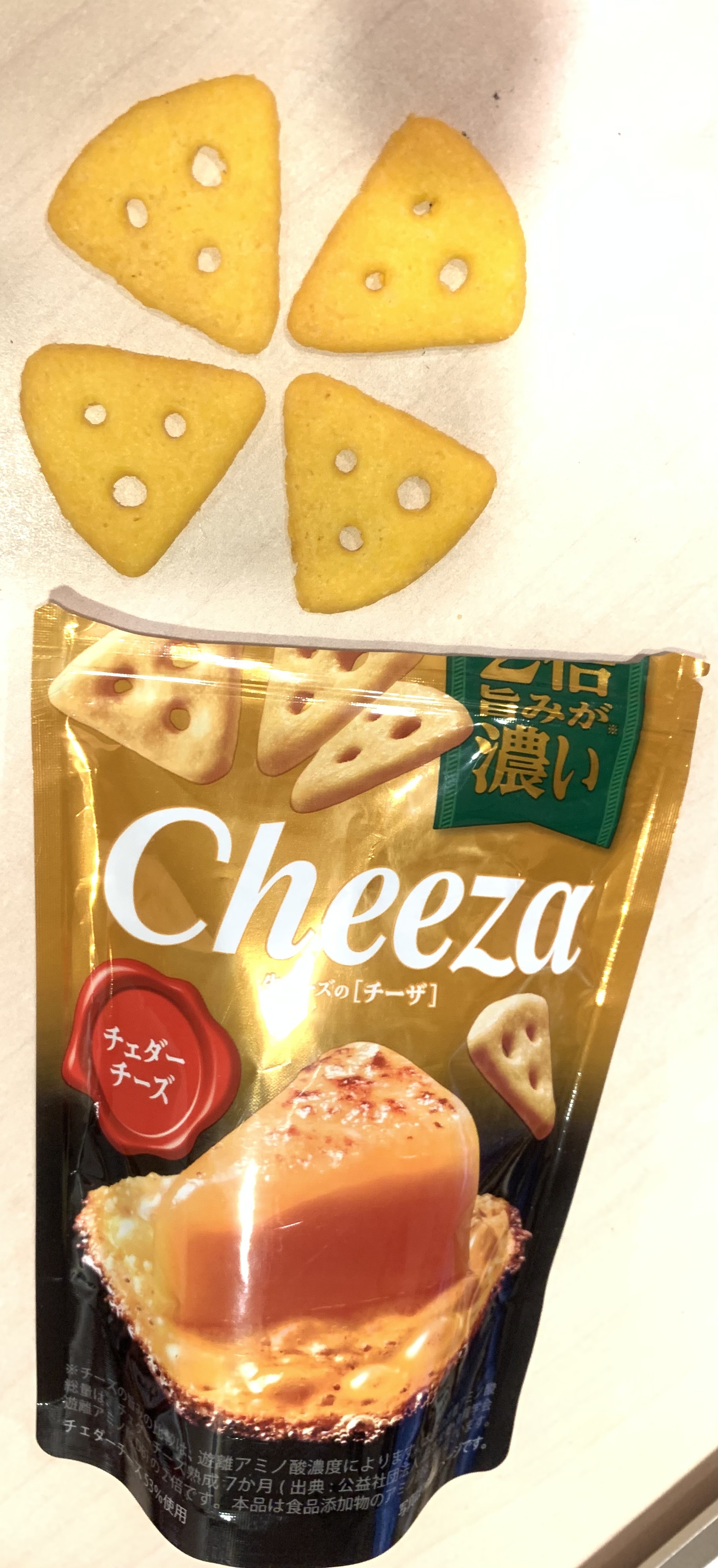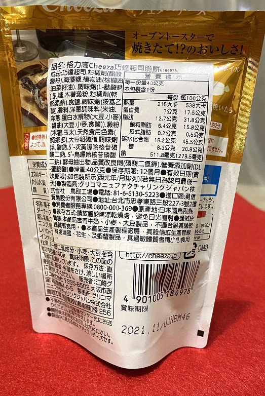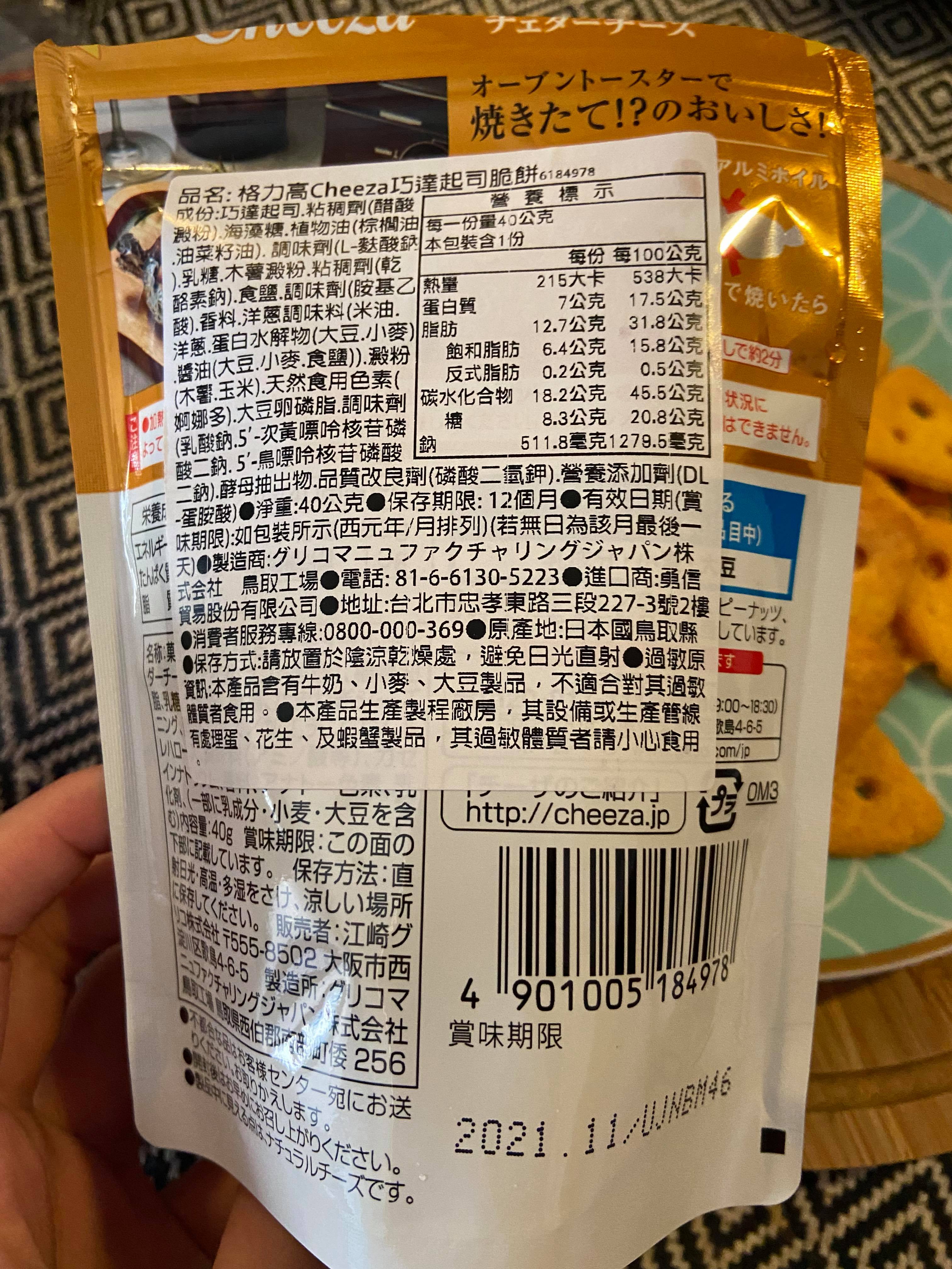 巧達起司、植物油、乳糖、澱粉、食鹽、洋蔥調味料、酵母抽出物、粘稠劑、海藻糖、調味劑、品質改良劑、營養添加劑、香料、天然食用色素、大豆卵磷脂