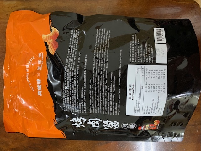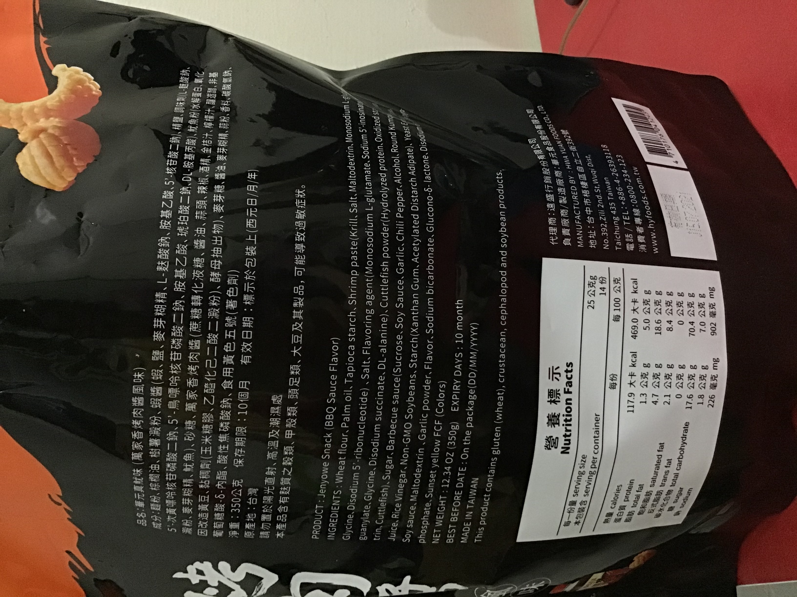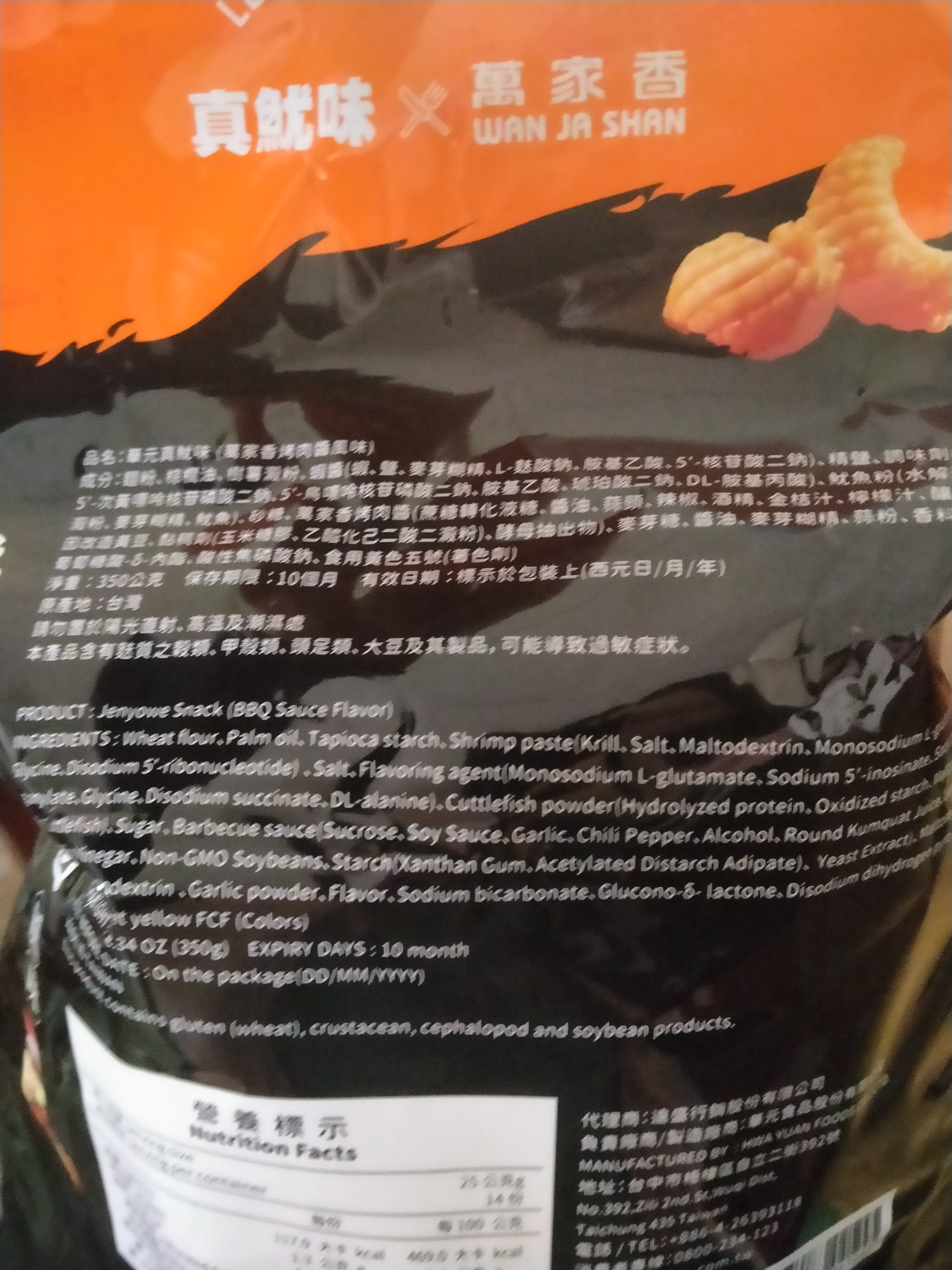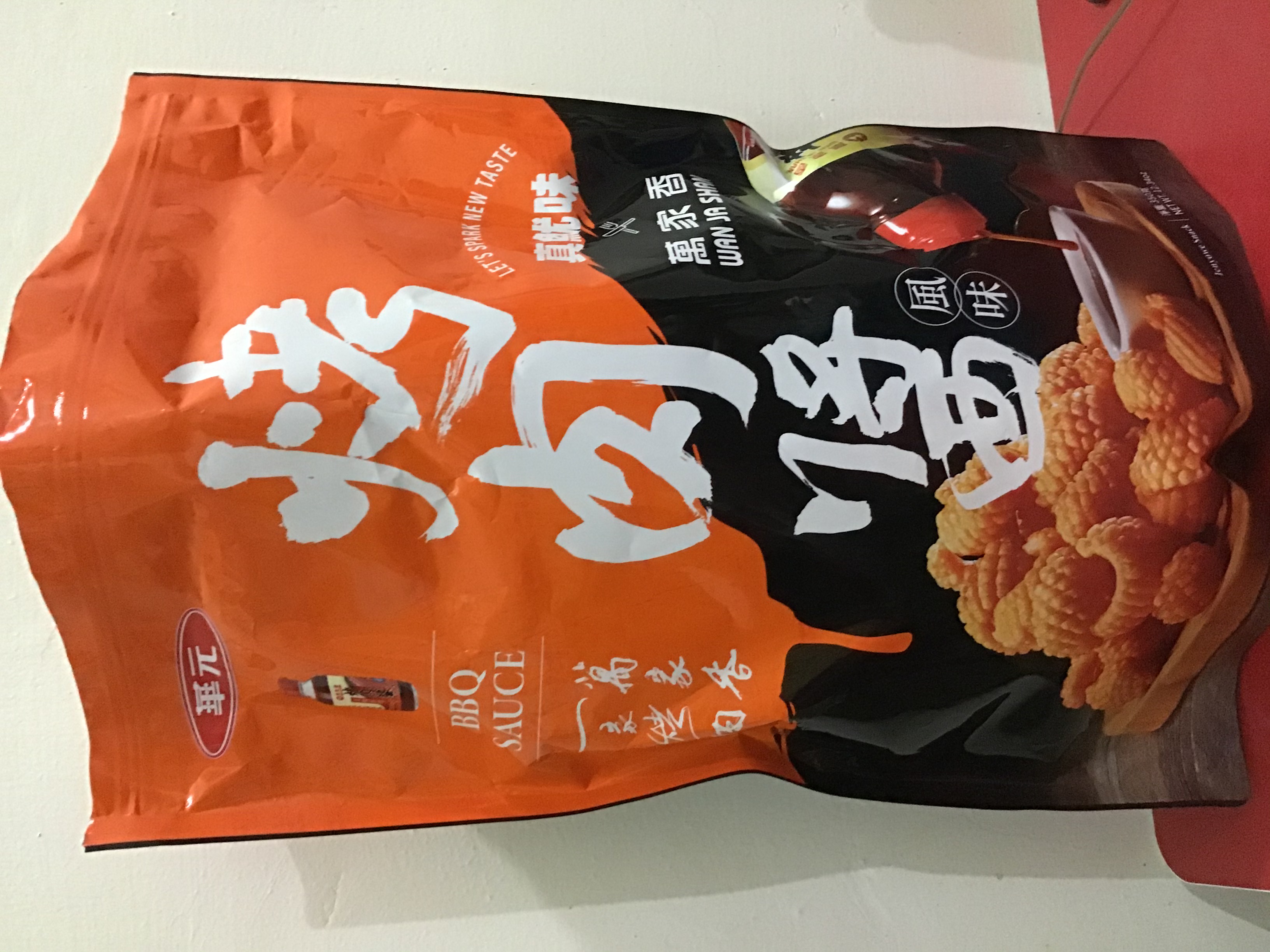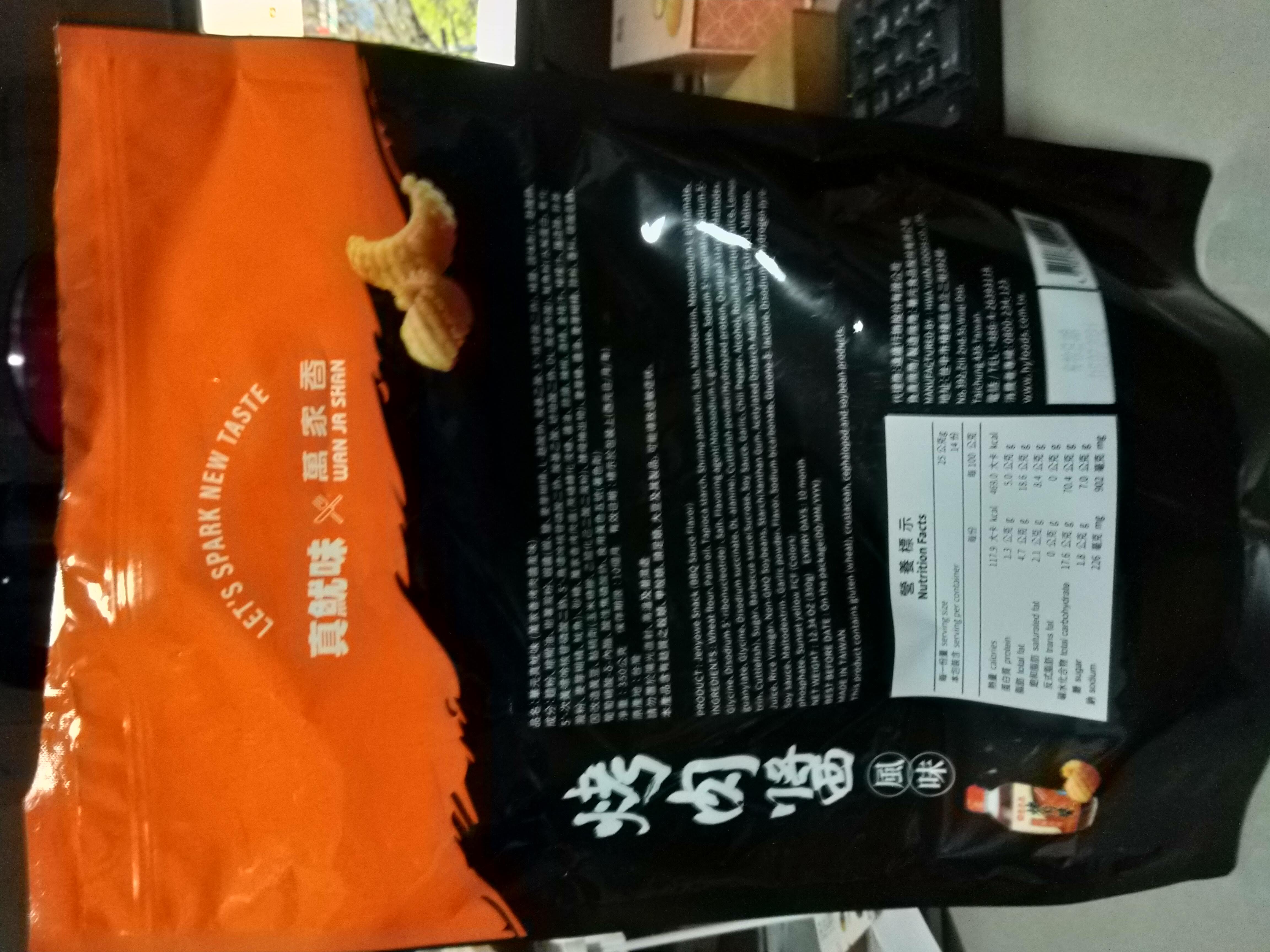 產品成份:麵粉 、棕櫚油、樹薯澱粉、 蝦醬(蝦、鹽、麥芽糊精、L-麩酸鈉、胺基乙酸、5’-核?隞臚G鈉) 精鹽、調味劑(L-麩酸鈉、5’-次黃嘌呤核?靾C酸二鈉、5’-鳥嘌呤核?靾C酸二鈉、胺基乙酸、琥珀酸二鈉、DL-胺基丙酸) 魷魚粉(水解蛋白、氧化澱粉、麥芽糊精、魷魚) 砂糖 萬家香烤肉醬(蔗糖轉化液糖、醬油、蒜頭、辣椒、酒精、金桔汁、檸檬汁、釀造醋、非基因改造黃豆、黏稠劑(玉米糖膠、乙醯化己二酸二澱粉)、酵母抽出物) 麥芽糖、醬油、麥芽糊精、蒜粉、香料、 碳酸氫鈉、 葡萄糖酸-δ-內酯、 酸性焦磷酸鈉 、食用黃色五號(著色劑)