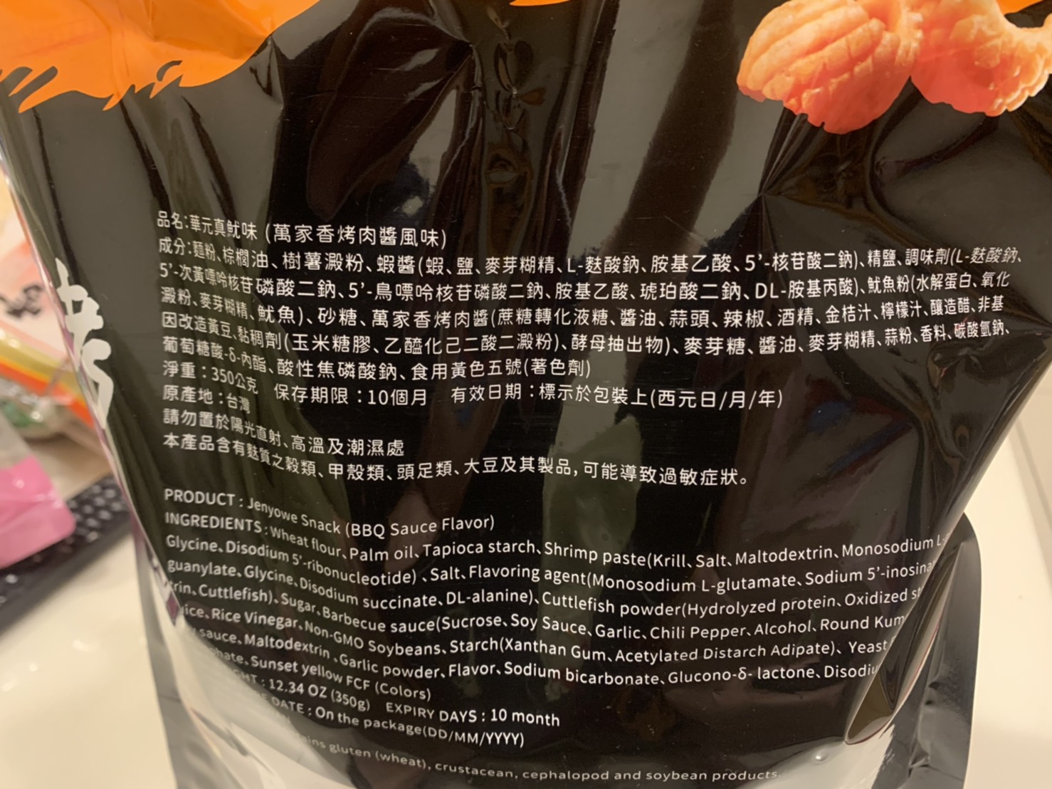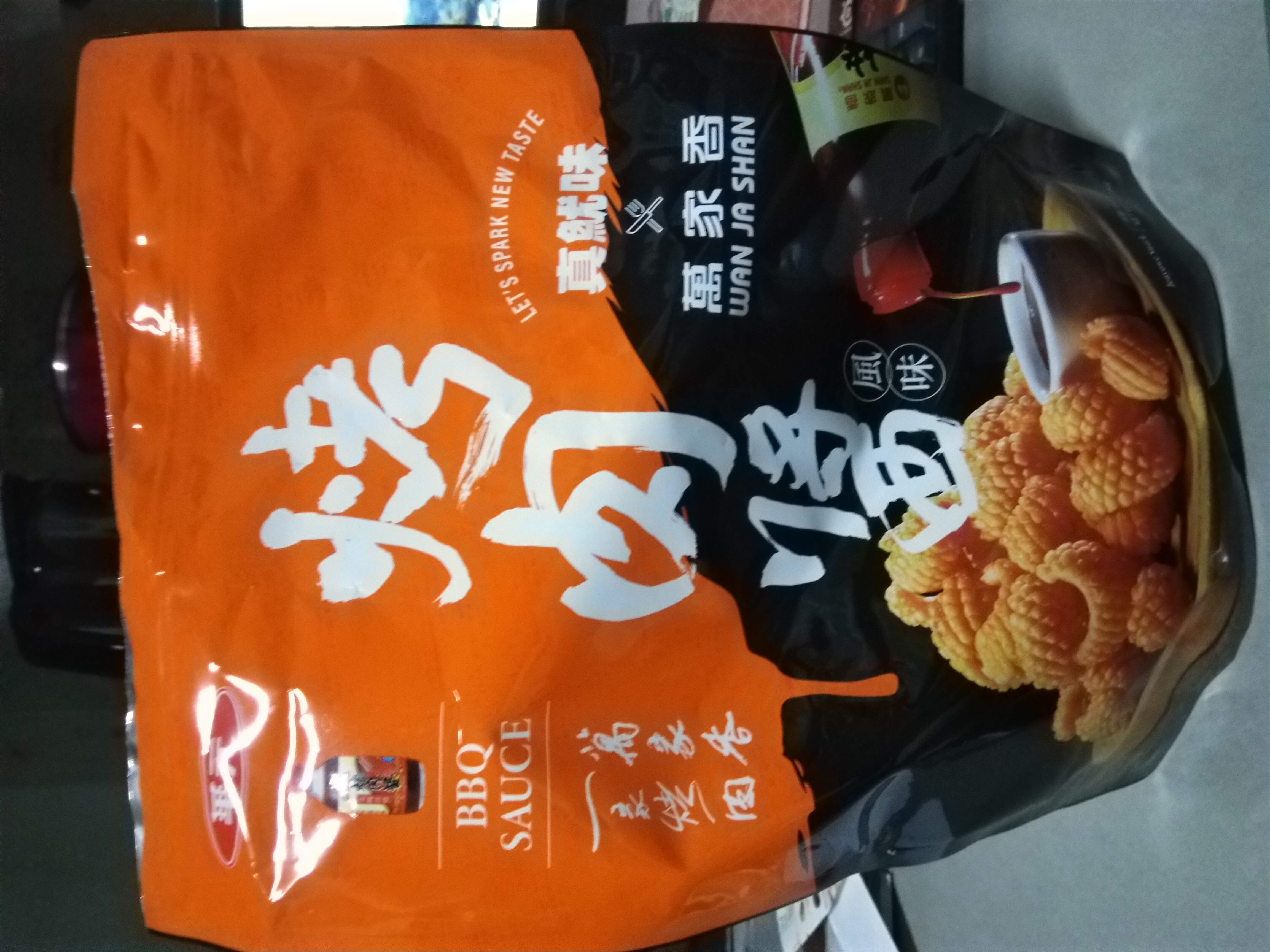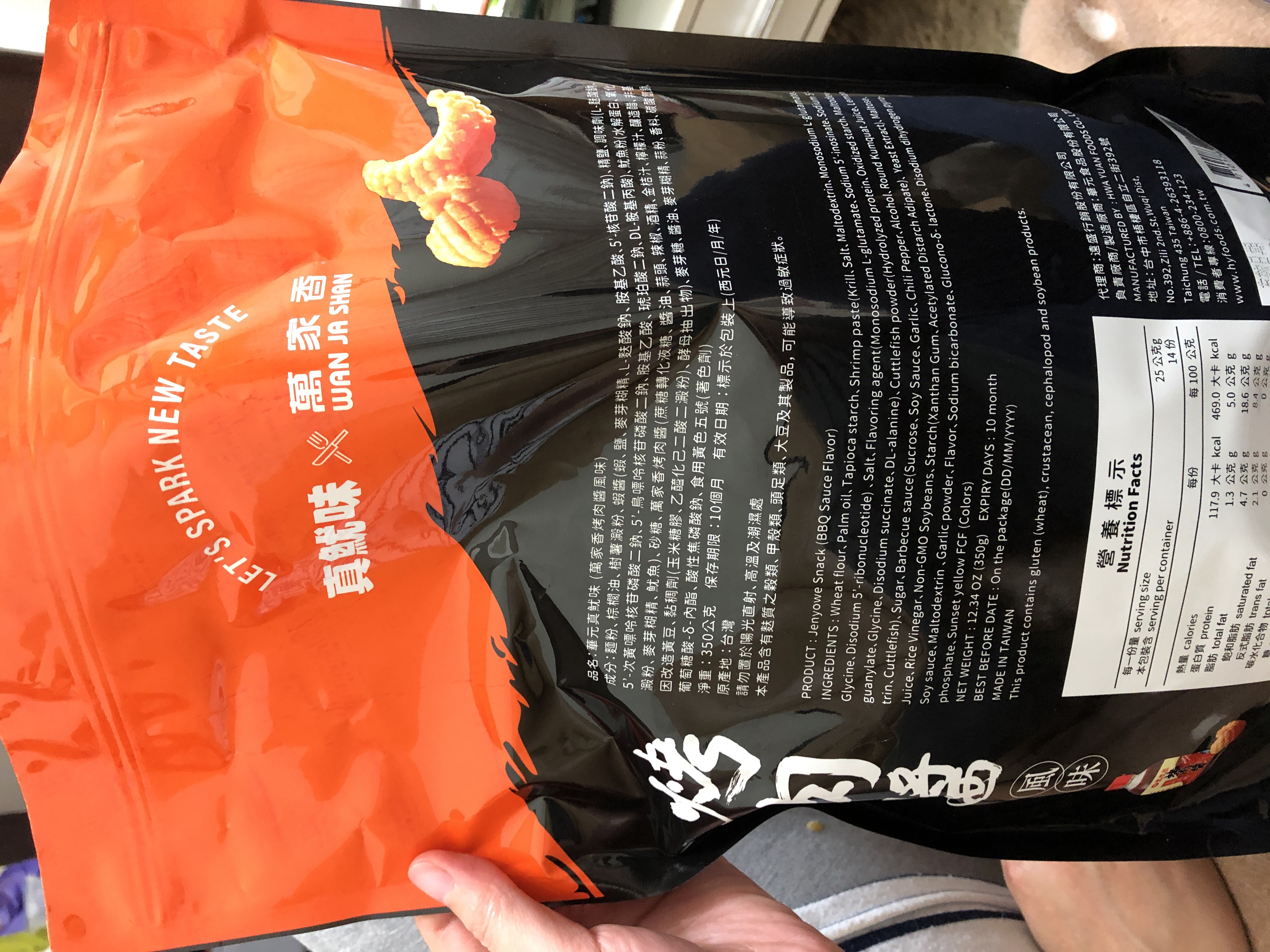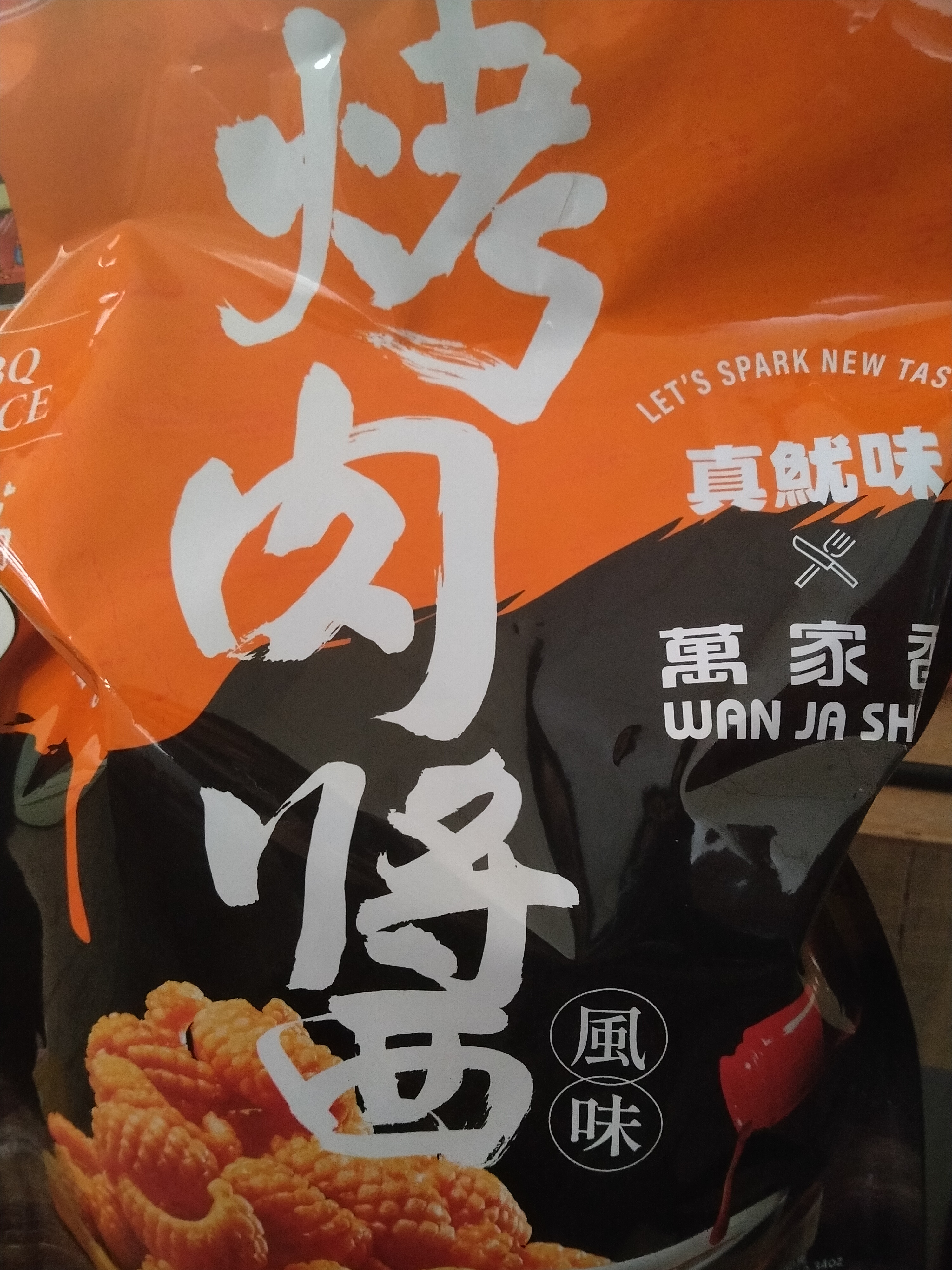 產品成份:麵粉 、棕櫚油、樹薯澱粉、 蝦醬(蝦、鹽、麥芽糊精、L-麩酸鈉、胺基乙酸、5’-核?隞臚G鈉) 精鹽、調味劑(L-麩酸鈉、5’-次黃嘌呤核?靾C酸二鈉、5’-鳥嘌呤核?靾C酸二鈉、胺基乙酸、琥珀酸二鈉、DL-胺基丙酸) 魷魚粉(水解蛋白、氧化澱粉、麥芽糊精、魷魚) 砂糖 萬家香烤肉醬(蔗糖轉化液糖、醬油、蒜頭、辣椒、酒精、金桔汁、檸檬汁、釀造醋、非基因改造黃豆、黏稠劑(玉米糖膠、乙醯化己二酸二澱粉)、酵母抽出物) 麥芽糖、醬油、麥芽糊精、蒜粉、香料、 碳酸氫鈉、 葡萄糖酸-δ-內酯、 酸性焦磷酸鈉 、食用黃色五號(著色劑)