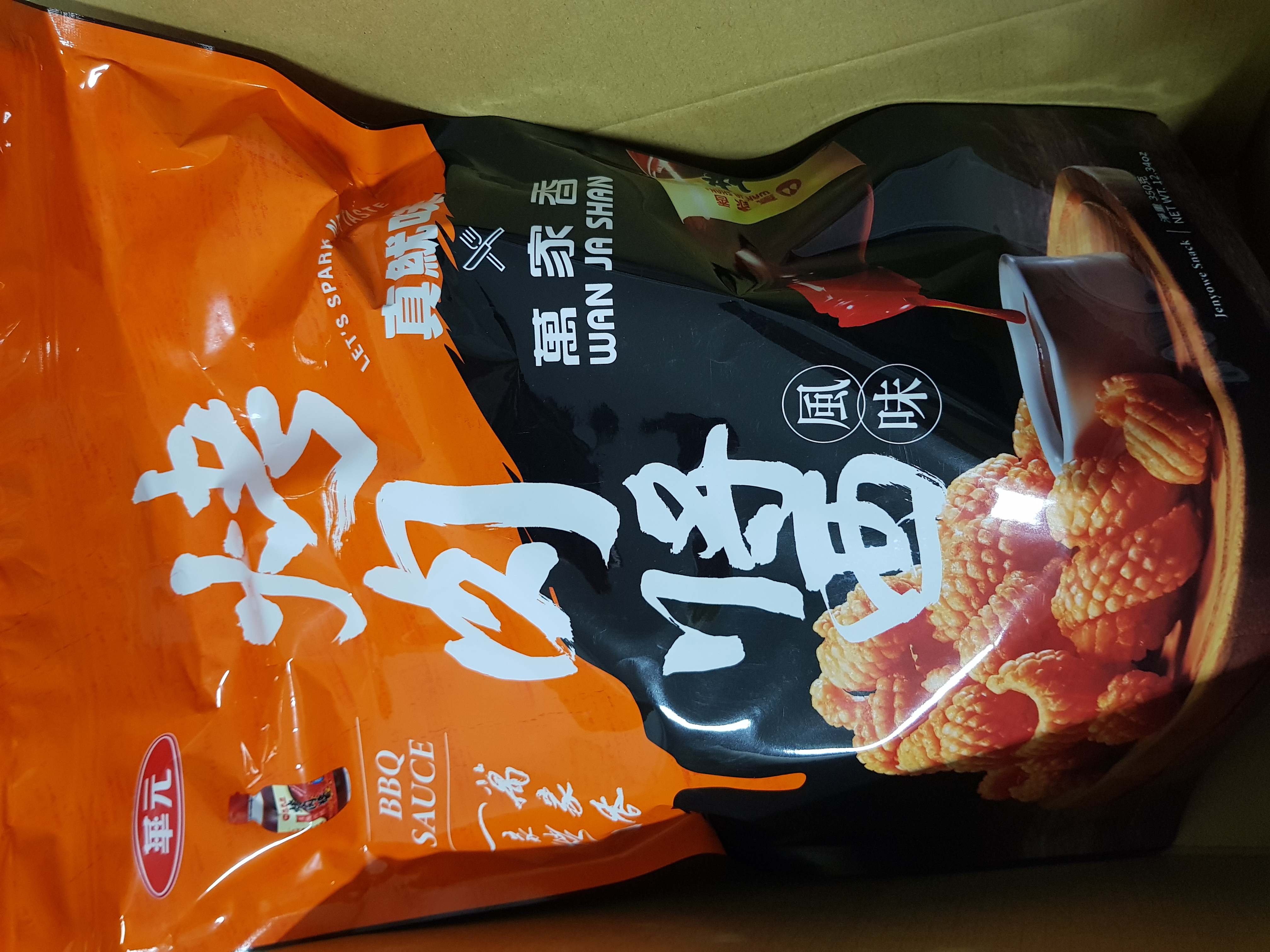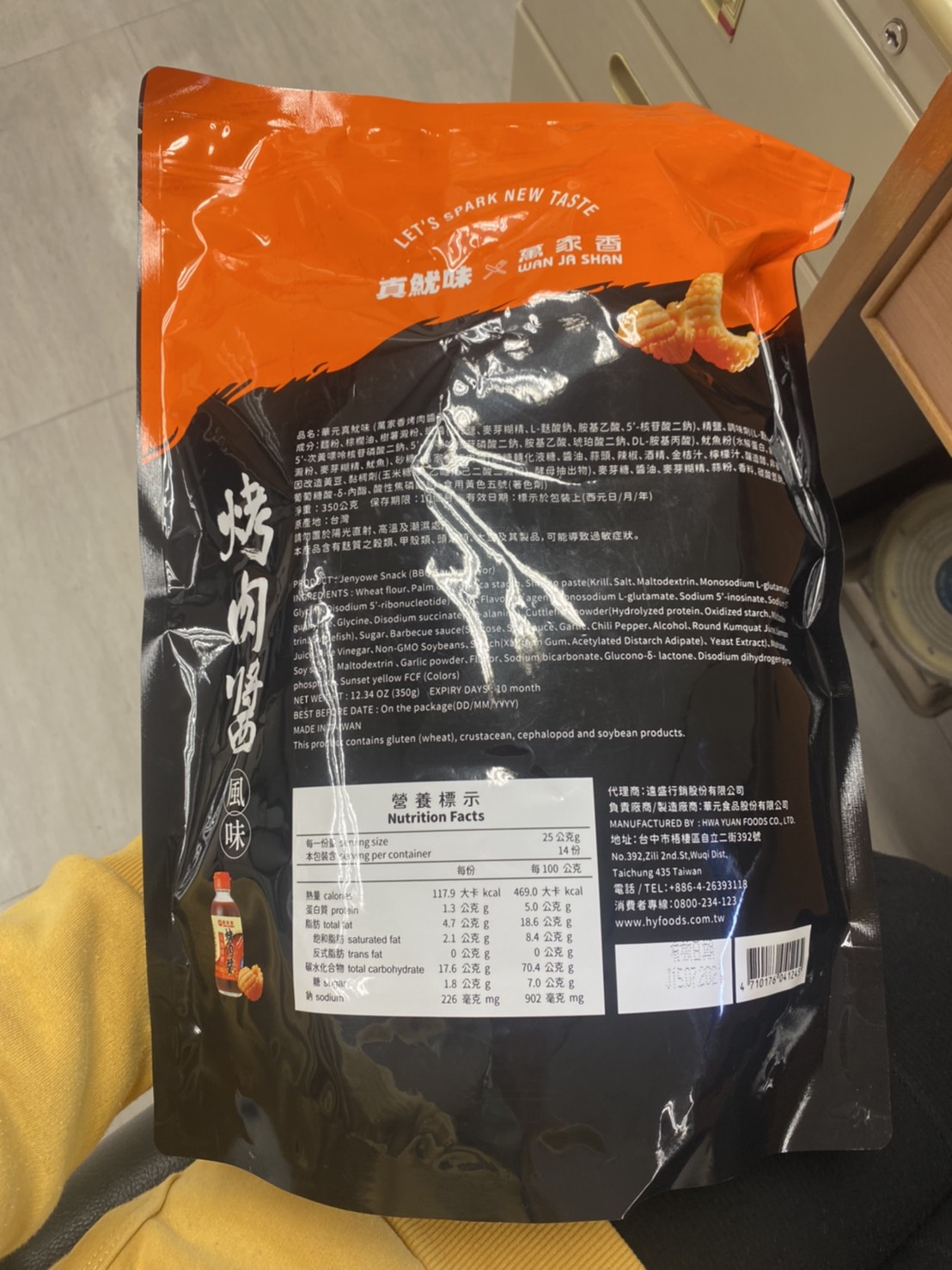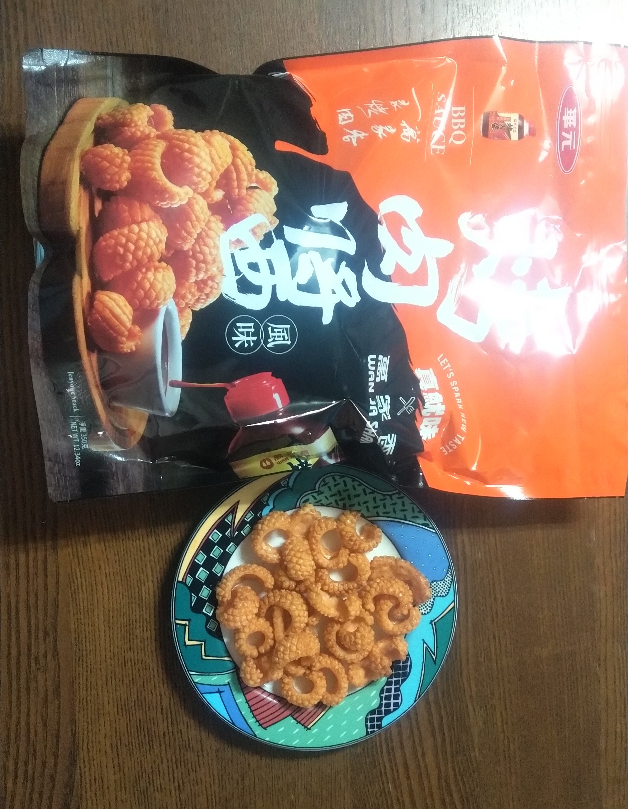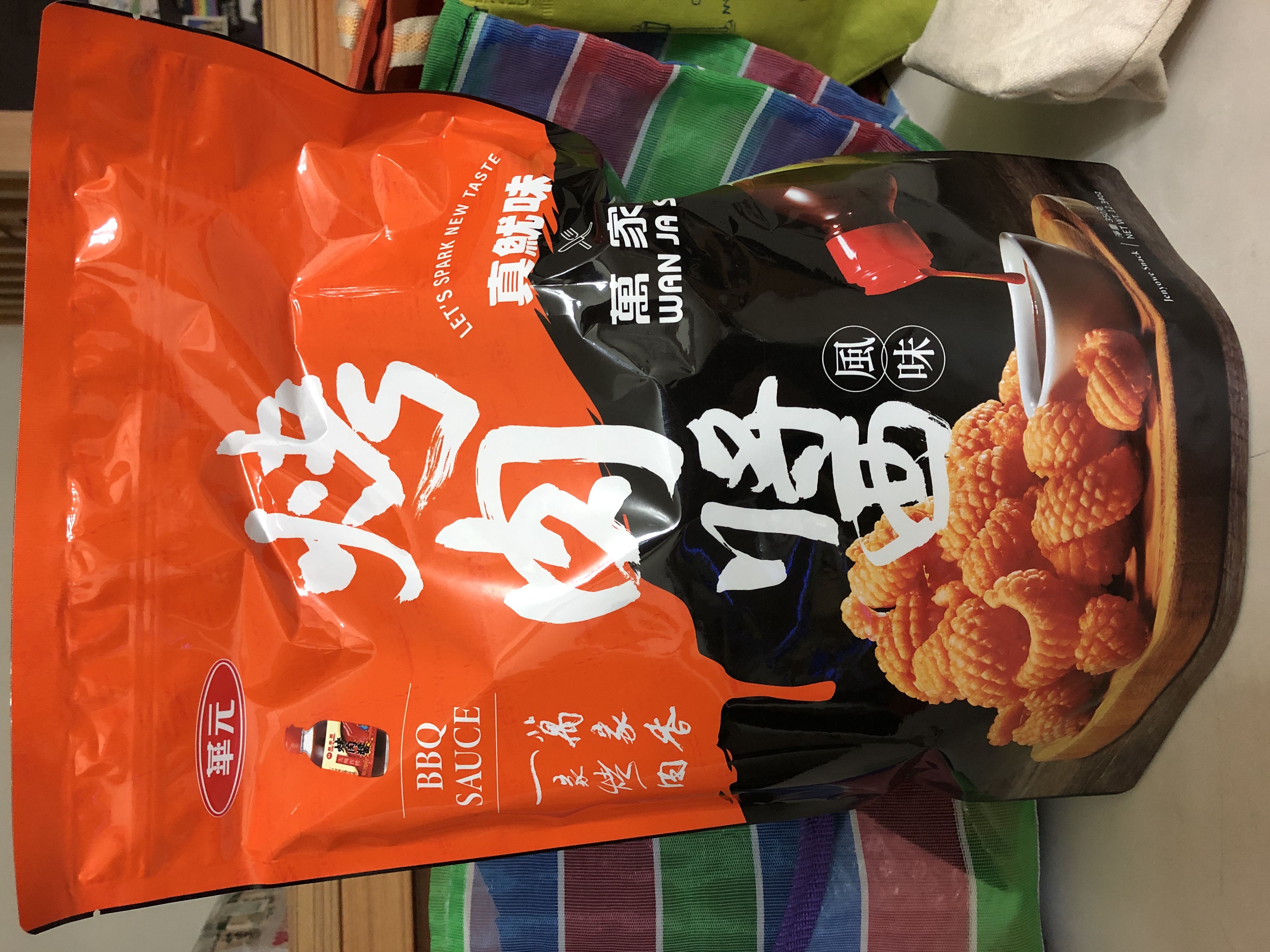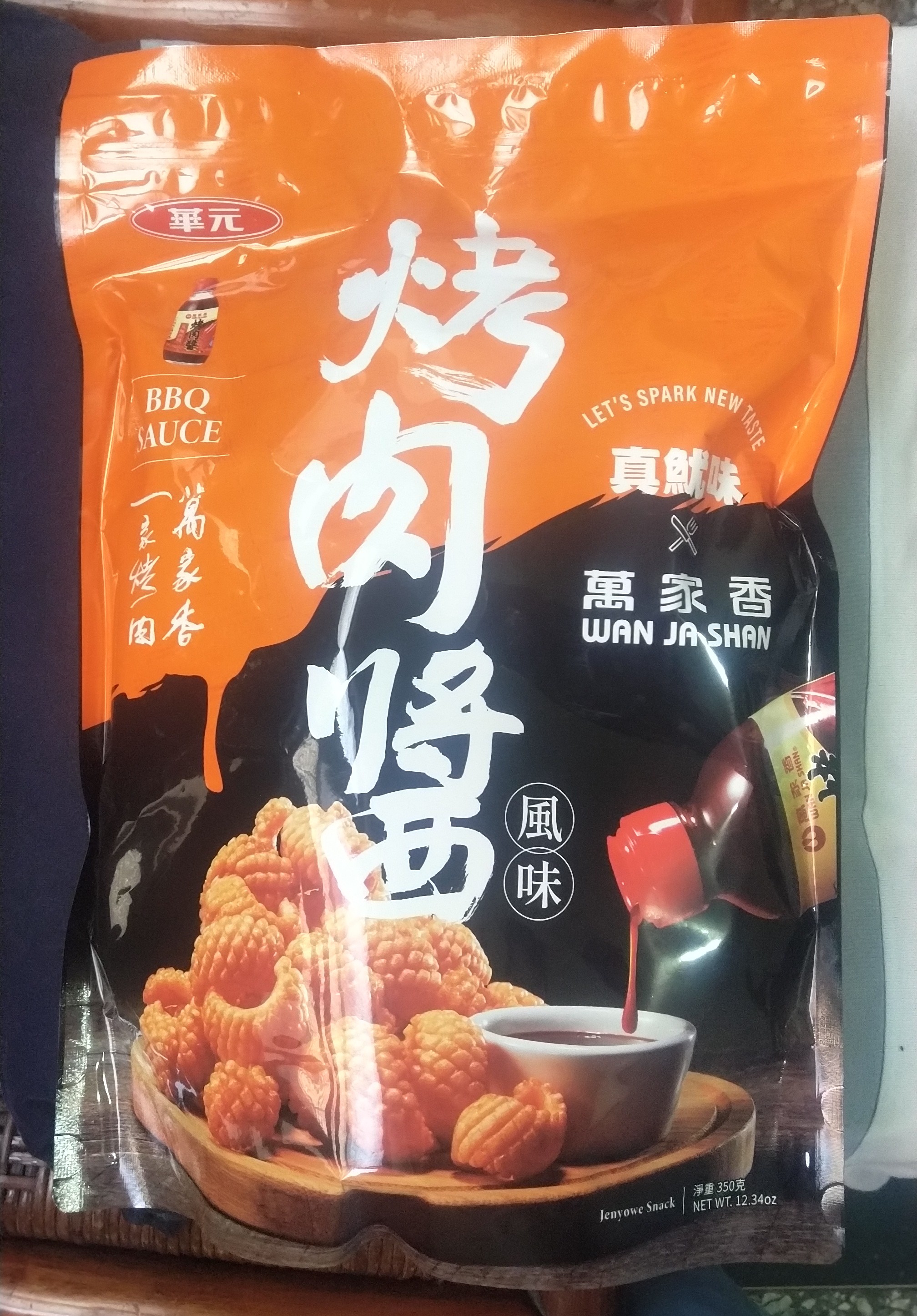 產品成份:麵粉 、棕櫚油、樹薯澱粉、 蝦醬(蝦、鹽、麥芽糊精、L-麩酸鈉、胺基乙酸、5’-核?隞臚G鈉) 精鹽、調味劑(L-麩酸鈉、5’-次黃嘌呤核?靾C酸二鈉、5’-鳥嘌呤核?靾C酸二鈉、胺基乙酸、琥珀酸二鈉、DL-胺基丙酸) 魷魚粉(水解蛋白、氧化澱粉、麥芽糊精、魷魚) 砂糖 萬家香烤肉醬(蔗糖轉化液糖、醬油、蒜頭、辣椒、酒精、金桔汁、檸檬汁、釀造醋、非基因改造黃豆、黏稠劑(玉米糖膠、乙醯化己二酸二澱粉)、酵母抽出物) 麥芽糖、醬油、麥芽糊精、蒜粉、香料、 碳酸氫鈉、 葡萄糖酸-δ-內酯、 酸性焦磷酸鈉 、食用黃色五號(著色劑)