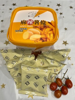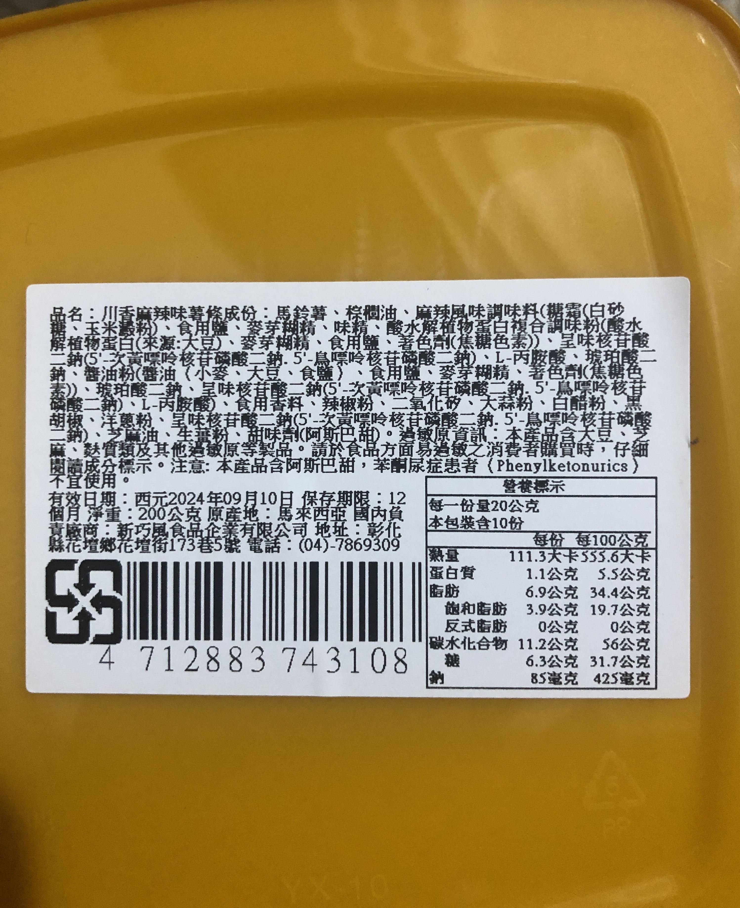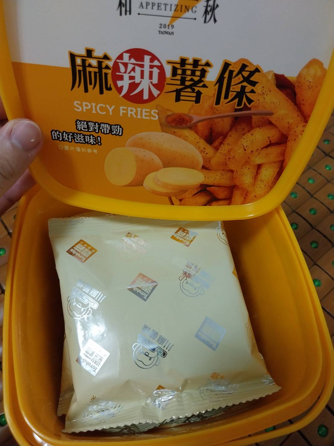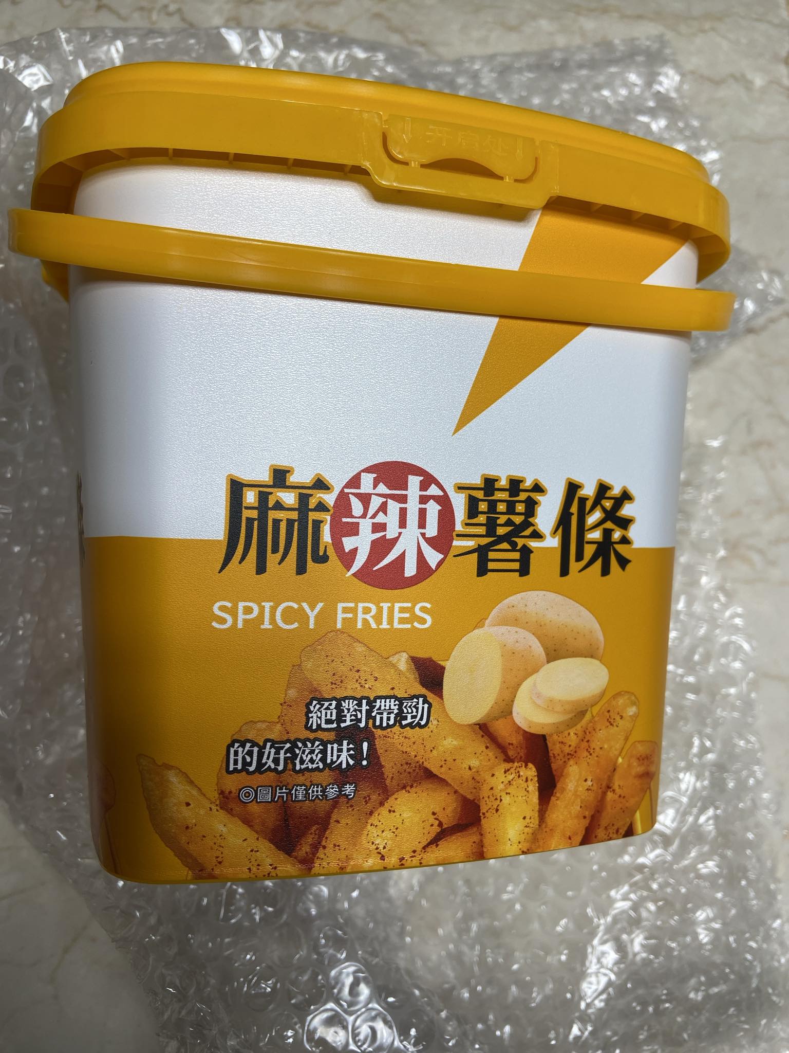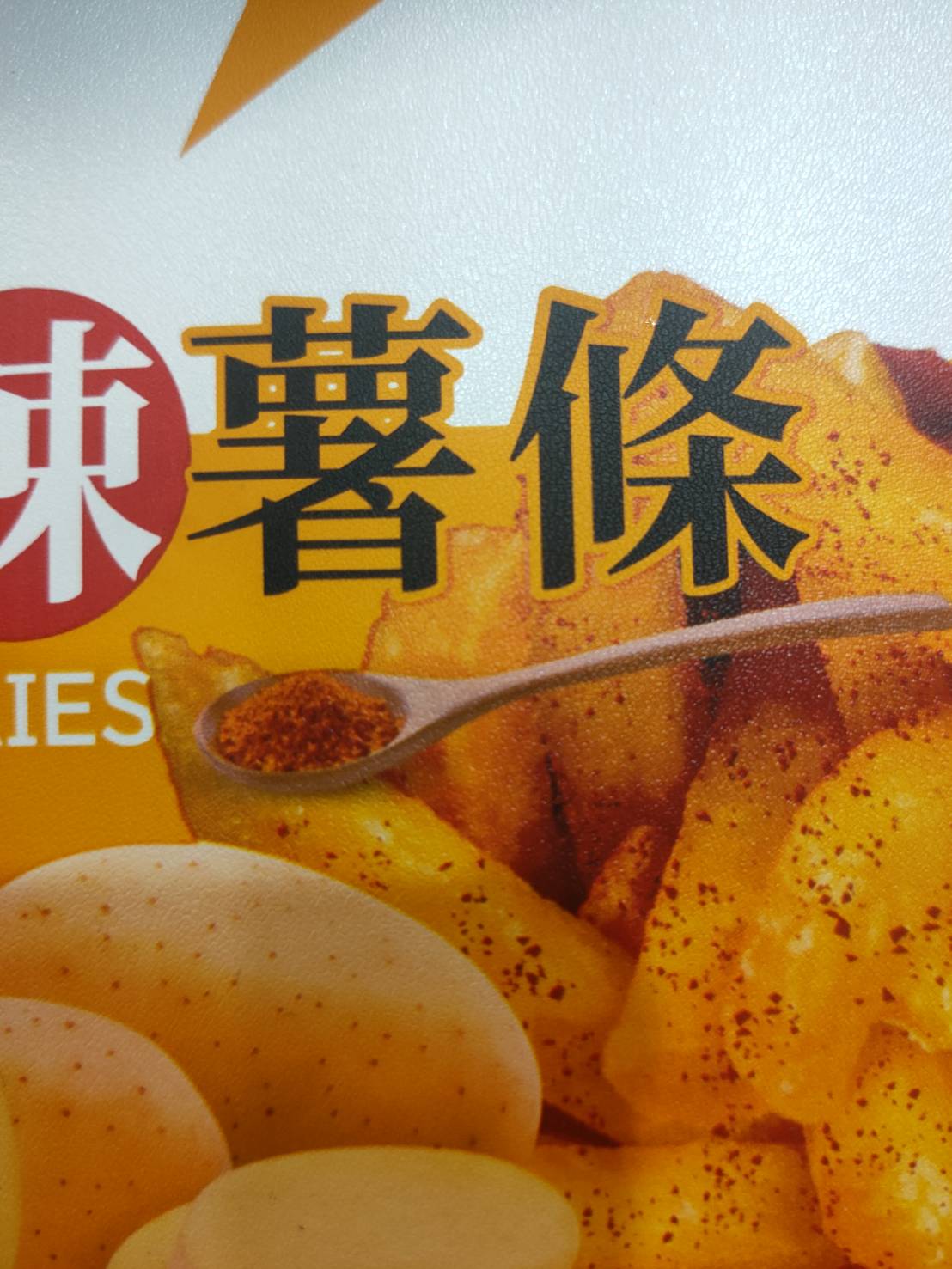 馬鈴薯、棕櫚油麻辣風味調味料(糖霜(白砂糖、玉米澱粉))、食用鹽、麥芽糊精、味精、酸水解植物蛋白複合調味粉(酸水解植物蛋白(來源:大豆)、麥芽糊精、食用鹽、著色劑(焦糖色素)、呈味核昔酸二鈉(5'-次黃哈核苷磷酸二鈉.5'-鳥嘌呤核昔磷酸二鈉)、L-丙胺酸、琥珀酸二鈉、 醬油粉(醬油(小麥、大豆、食鹽)、食用鹽、麥芽糊精、著色劑(焦糖色素)、琥珀酸二鈉、呈味核酸二鈉(5'-次黃哈核昔磷酸二鈉、5'-鳥嘌哈核昔磷酸二鈉)、L-丙胺酸、食用香料、辣椒粉、二氧化矽、大蒜粉、白醋粉、黑胡椒、洋蔥粉、星味核酸二鈉(5-次黃嘌呤核昔磷酸二鈉、5-鳥嘌哈核昔磷酸二鈉)、芝麻油、生粉、甜味劑(阿斯巴甜)