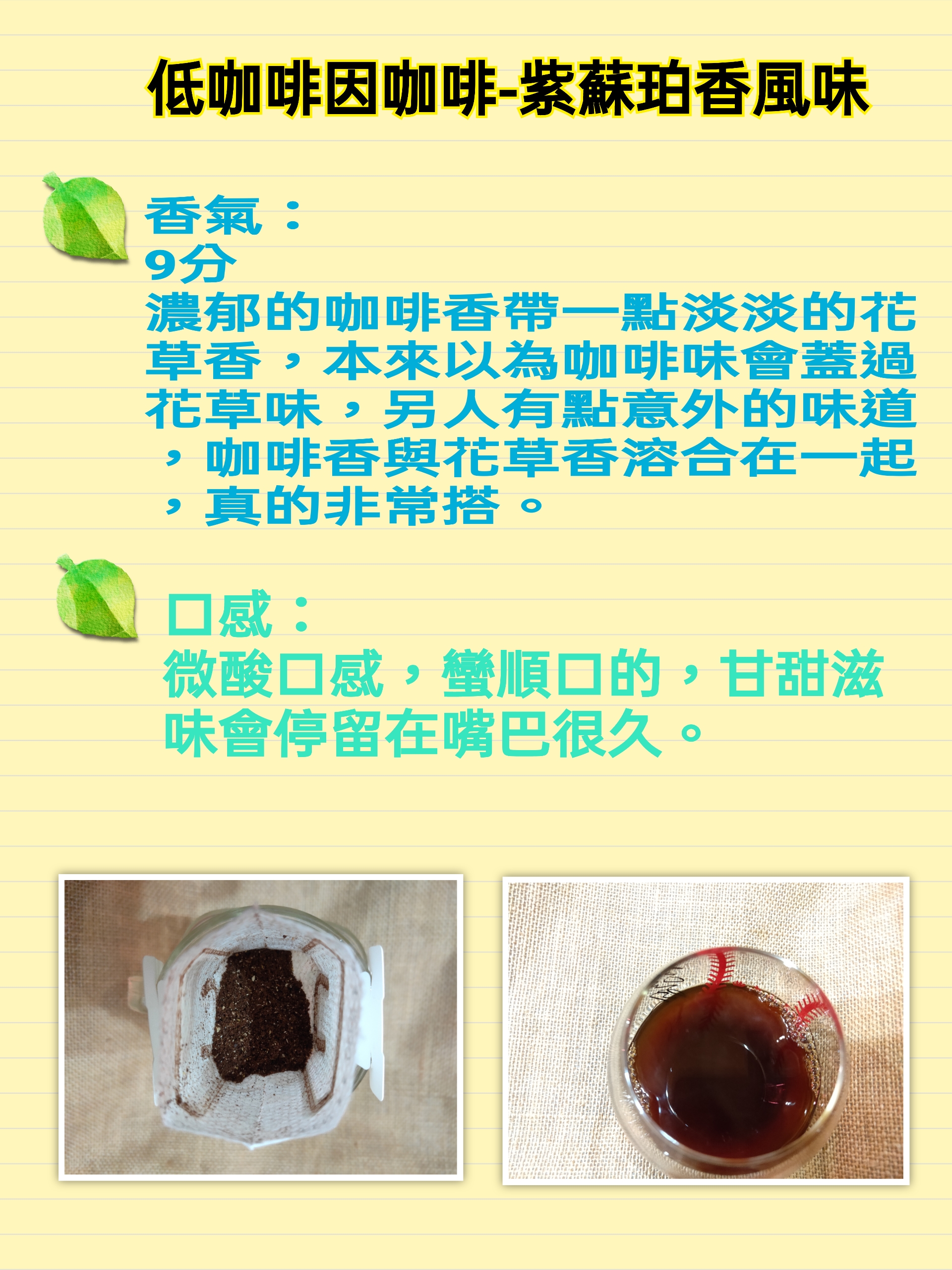 - 紫蘇珀香 低咖啡因花茶咖啡:紫蘇天生特有的草本氣息,使得這款低因茶咖啡成為最特別的存在。帶有森林氛圍的清香和紫蘇葉獨特口感,在飲用體驗中主導全程,卻又不會搶過咖啡原有的風采和風味。