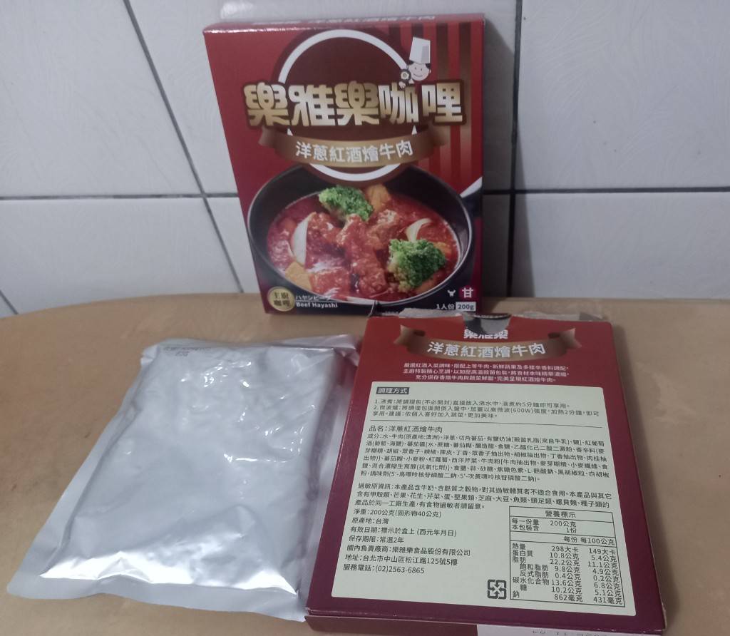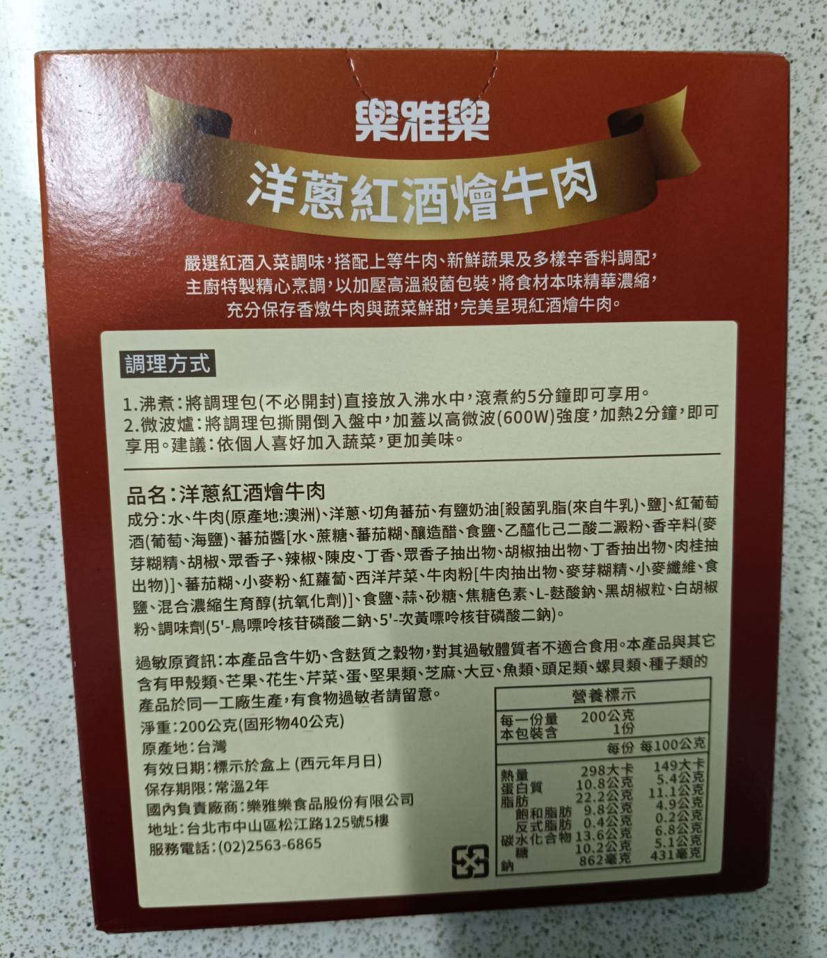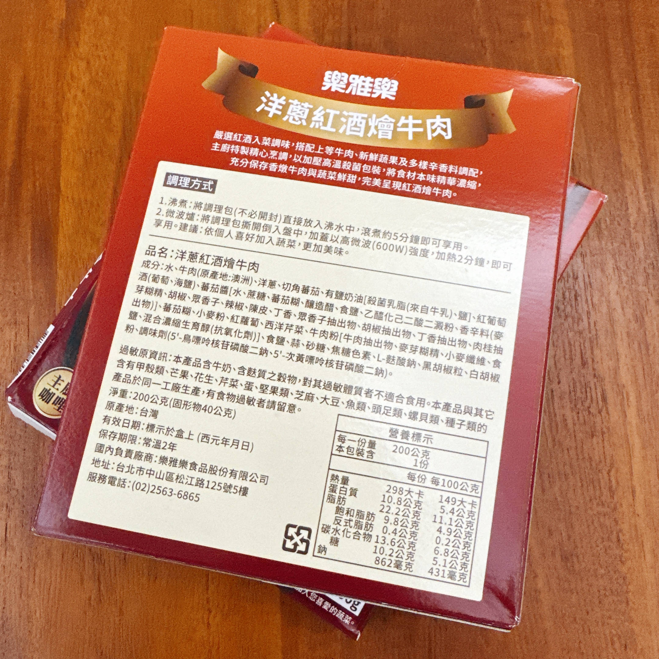 水、牛肉(原產地:澳洲)、洋蔥、切角蕃茄、有鹽奶油[殺菌乳脂(來自牛乳)]、鹽]、紅葡萄酒(葡萄、海鹽)、蕃茄醬[水、蔗糖、蕃茄糊、釀造醋、食鹽、乙醯化己二酸二澱粉、香辛料(麥芽糊精、胡椒、眾香子、辣椒、陳皮、丁香、眾香子抽出物、胡椒抽出物、丁香抽出物、肉桂抽出物)]、蕃茄糊、小麥粉、紅蘿蔔、西洋芹菜、牛肉粉[牛肉抽出物、麥芽糊精、小麥纖維、食鹽、混合濃縮生育醇(抗氧化劑)]、食鹽、蒜、砂糖、焦糖色素、L-麩酸鈉、黑胡椒粒、白胡椒粉、調味劑(5’-鳥嘌呤核苷磷酸二鈉)、5’-次黃嘌呤核苷磷酸二鈉)