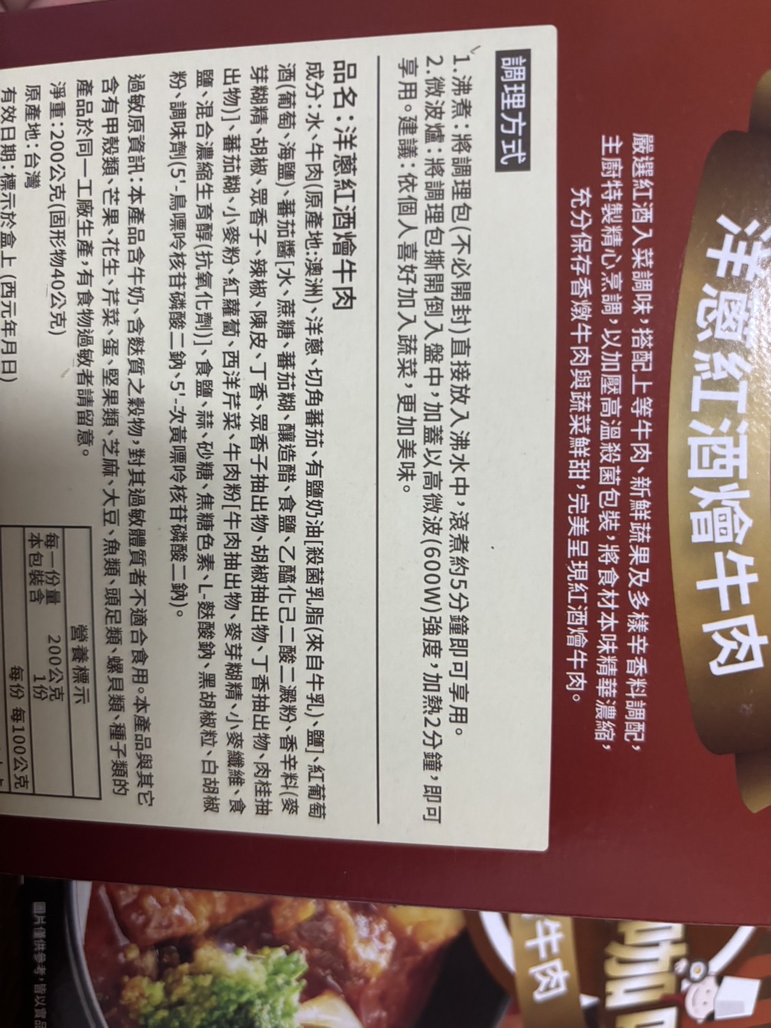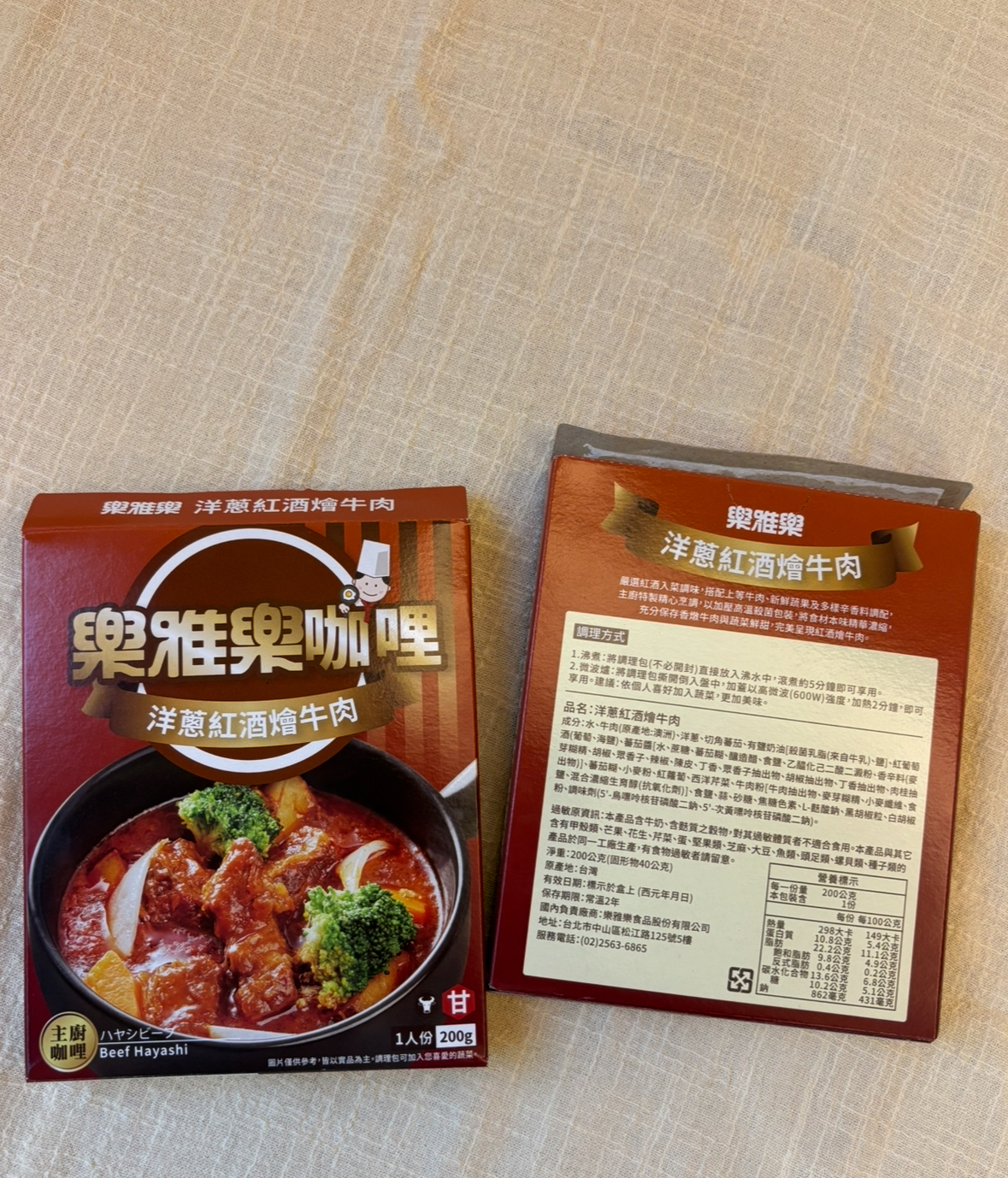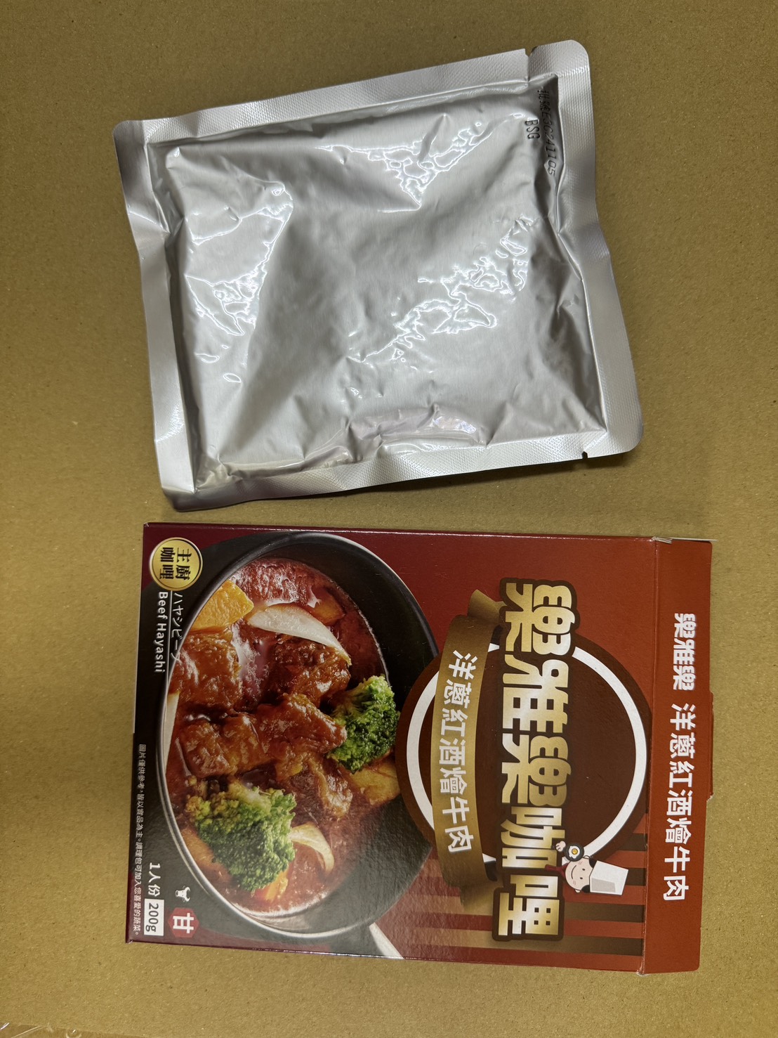 水、牛肉(原產地:澳洲)、洋蔥、切角蕃茄、有鹽奶油[殺菌乳脂(來自牛乳)]、鹽]、紅葡萄酒(葡萄、海鹽)、蕃茄醬[水、蔗糖、蕃茄糊、釀造醋、食鹽、乙醯化己二酸二澱粉、香辛料(麥芽糊精、胡椒、眾香子、辣椒、陳皮、丁香、眾香子抽出物、胡椒抽出物、丁香抽出物、肉桂抽出物)]、蕃茄糊、小麥粉、紅蘿蔔、西洋芹菜、牛肉粉[牛肉抽出物、麥芽糊精、小麥纖維、食鹽、混合濃縮生育醇(抗氧化劑)]、食鹽、蒜、砂糖、焦糖色素、L-麩酸鈉、黑胡椒粒、白胡椒粉、調味劑(5’-鳥嘌呤核苷磷酸二鈉)、5’-次黃嘌呤核苷磷酸二鈉)