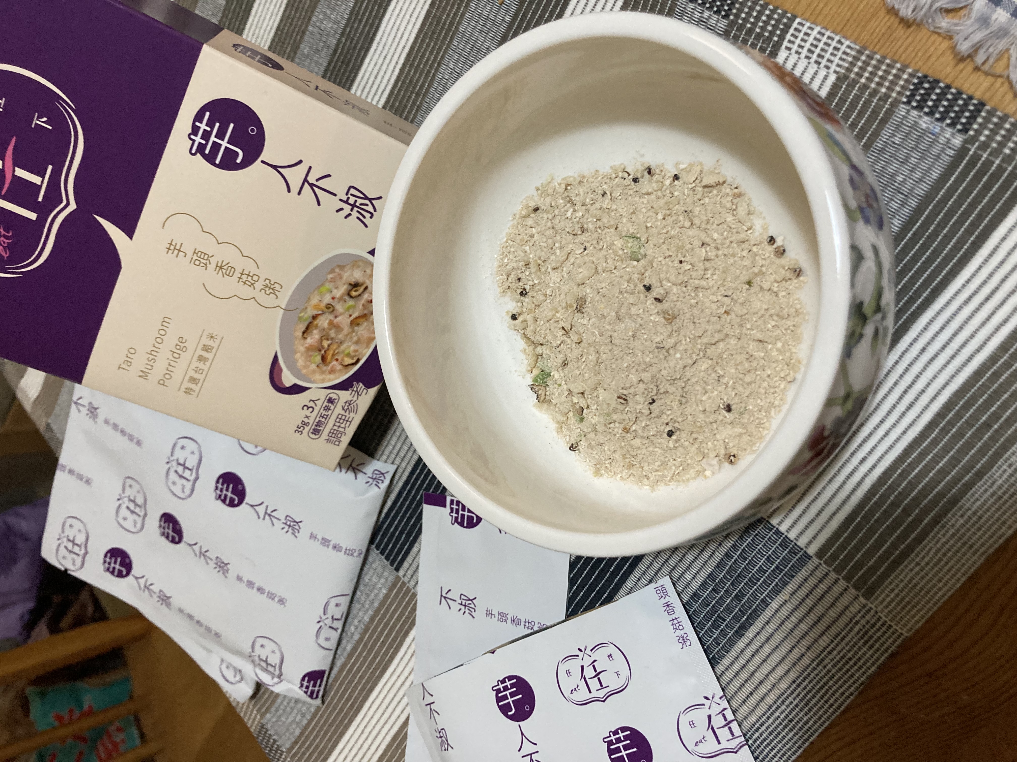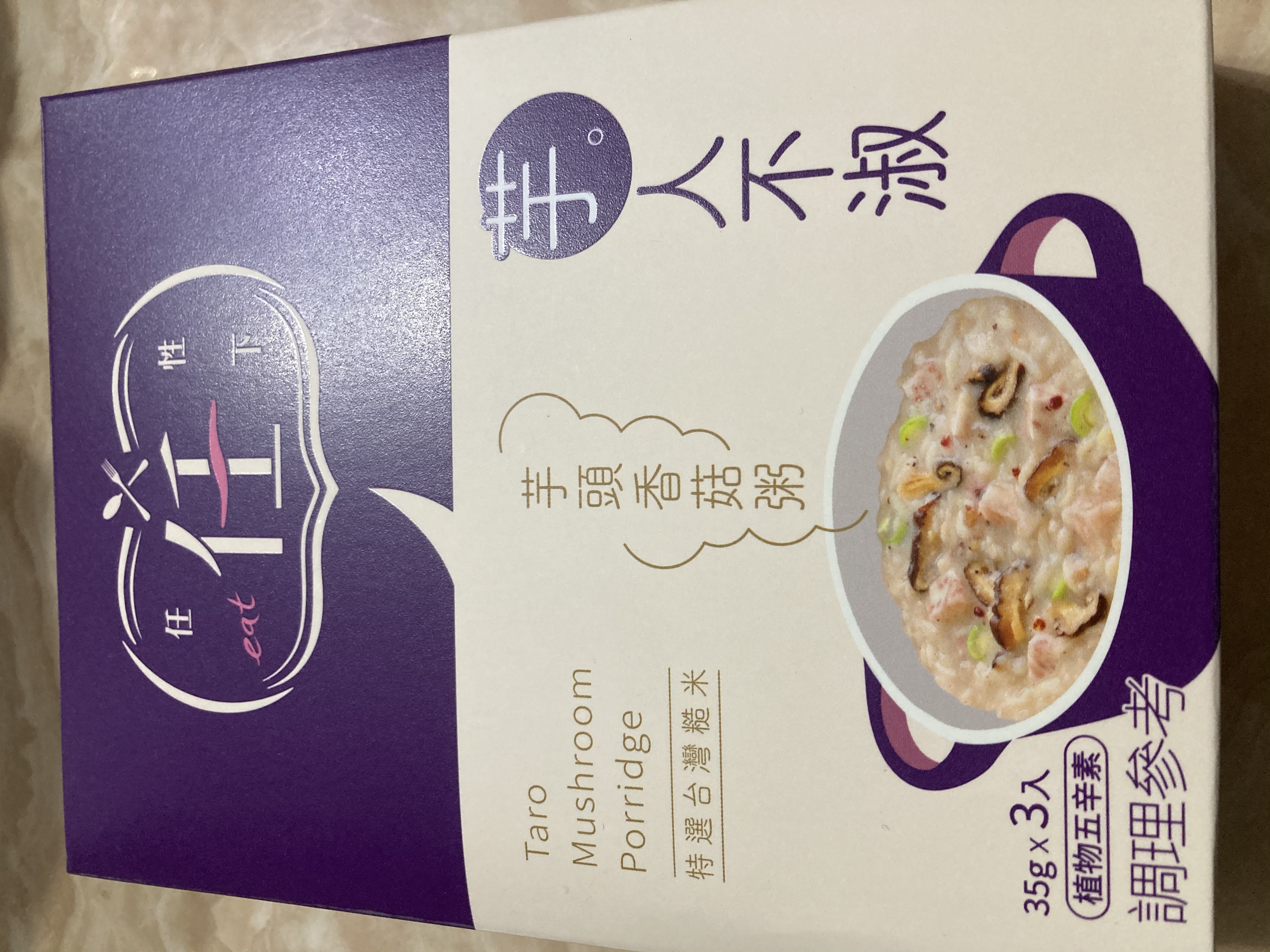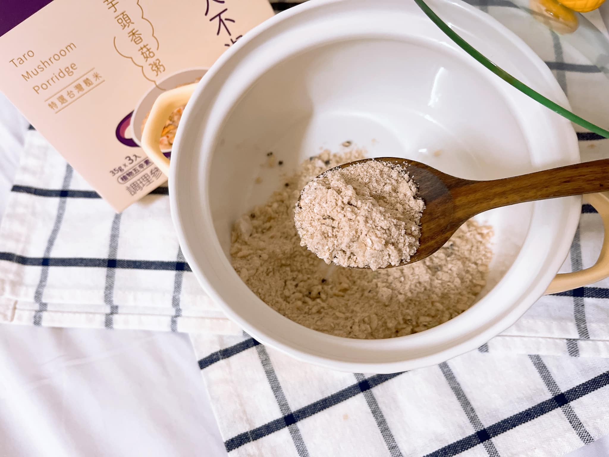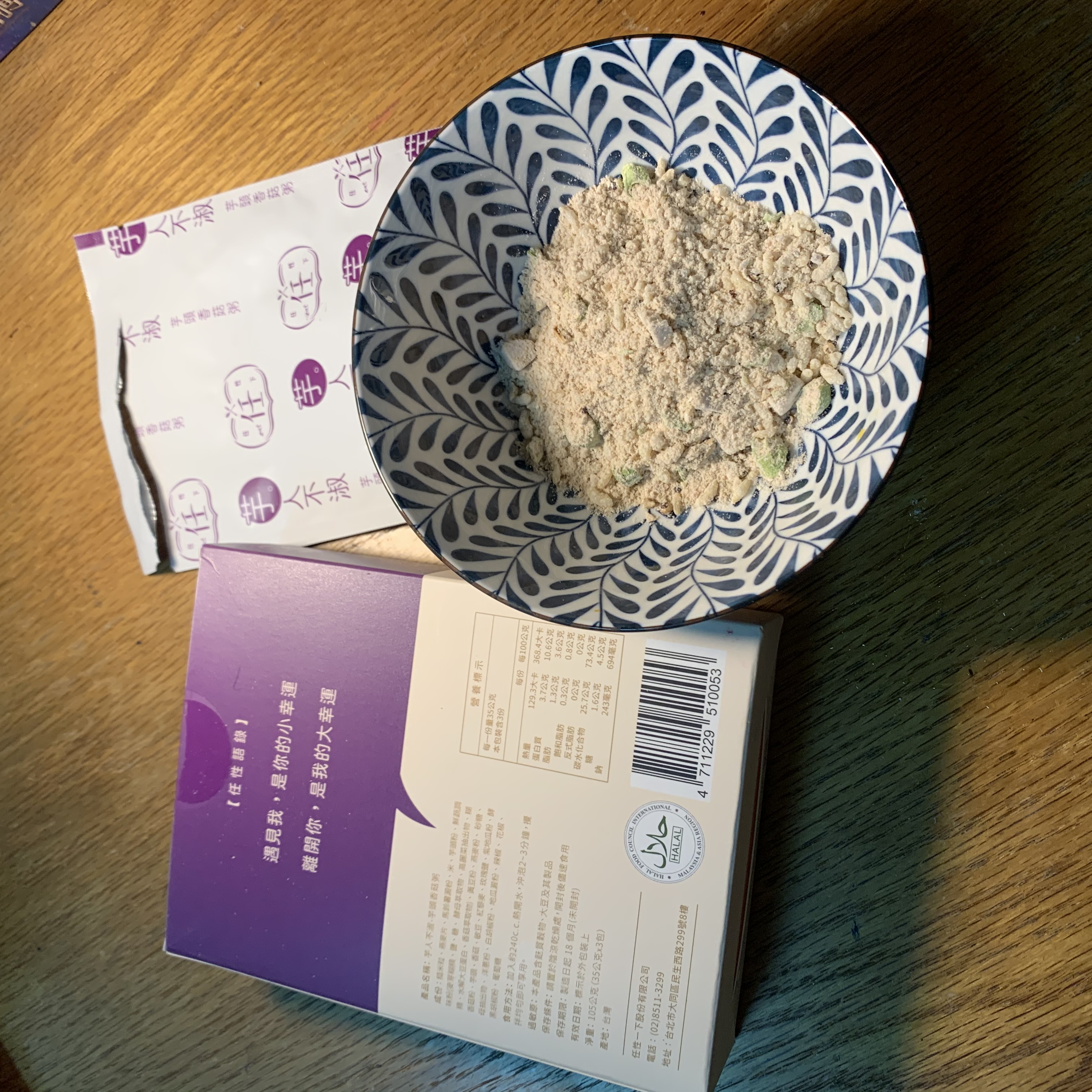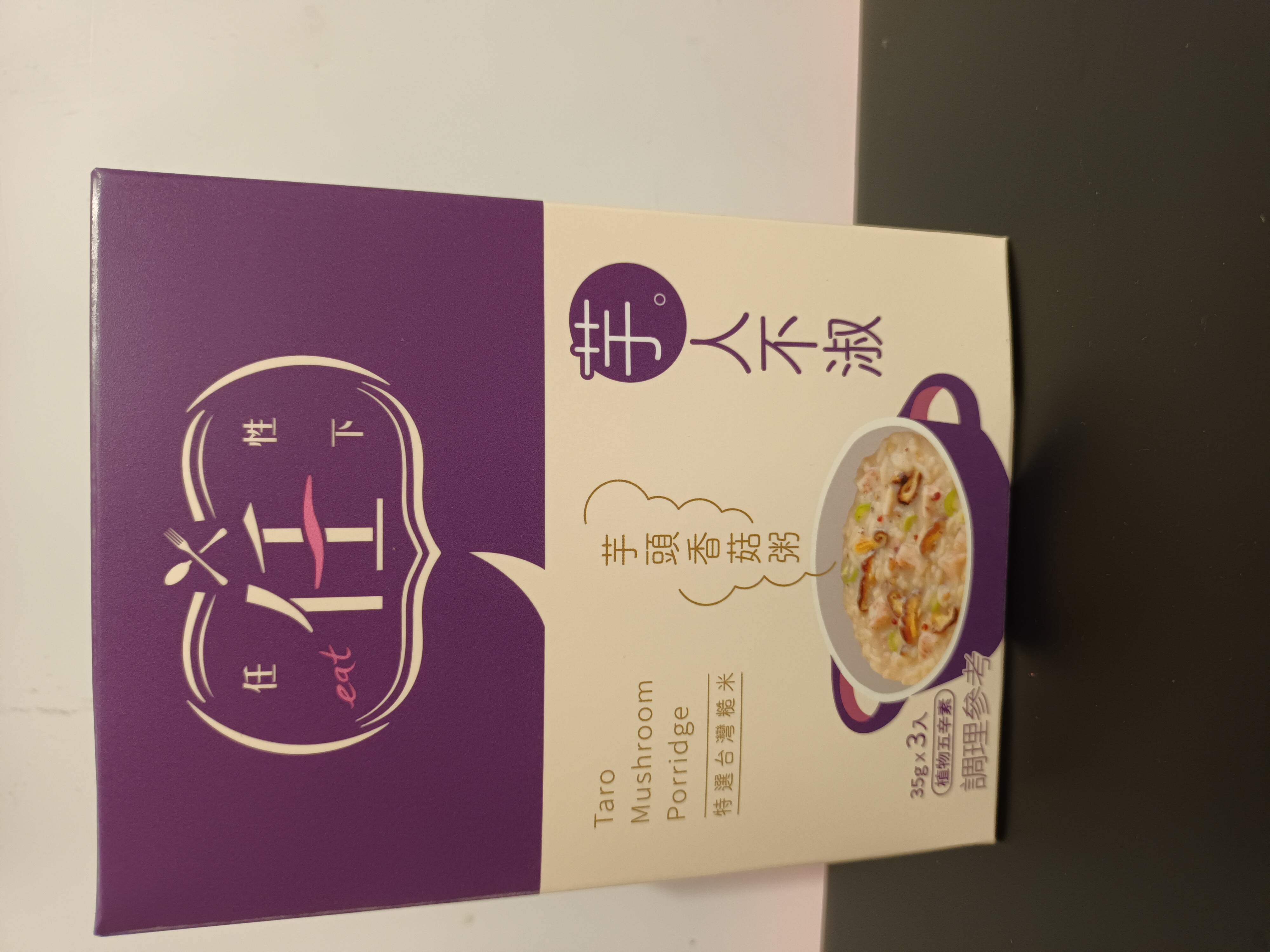 糙米粒、燕麥片、馬鈴薯澱粉、米、芋頭粉、鮮蔬調味粉、黃豆粉、燕麥粉、 砂糖、香菇粉、芋頭、香菇、敏豆、紅藜麥、玫瑰鹽、紫地瓜粉、酵母抽出物、 洋蔥粉、白胡椒粉、地瓜澱粉、辣椒、 花椒、黑胡椒粉、葡萄糖