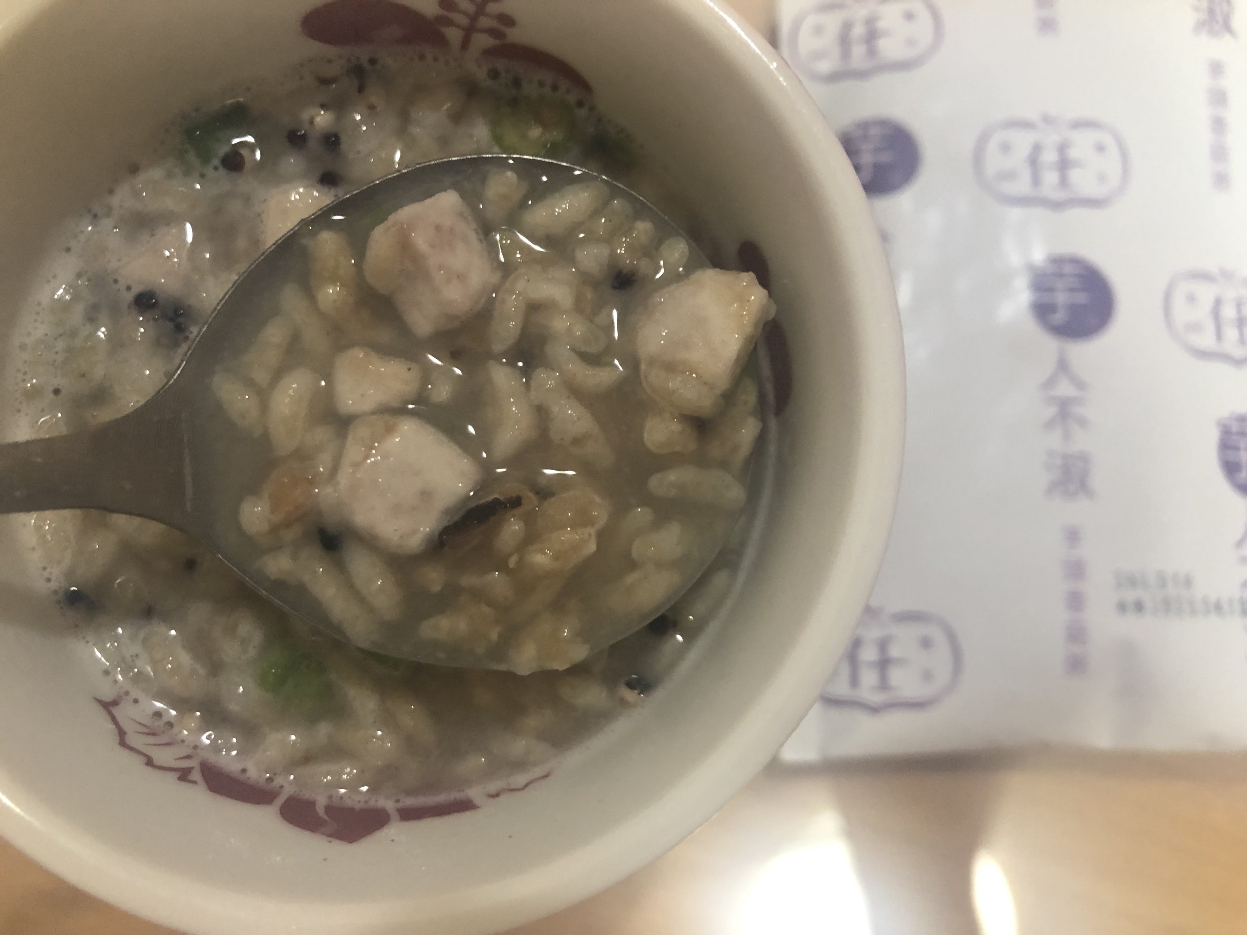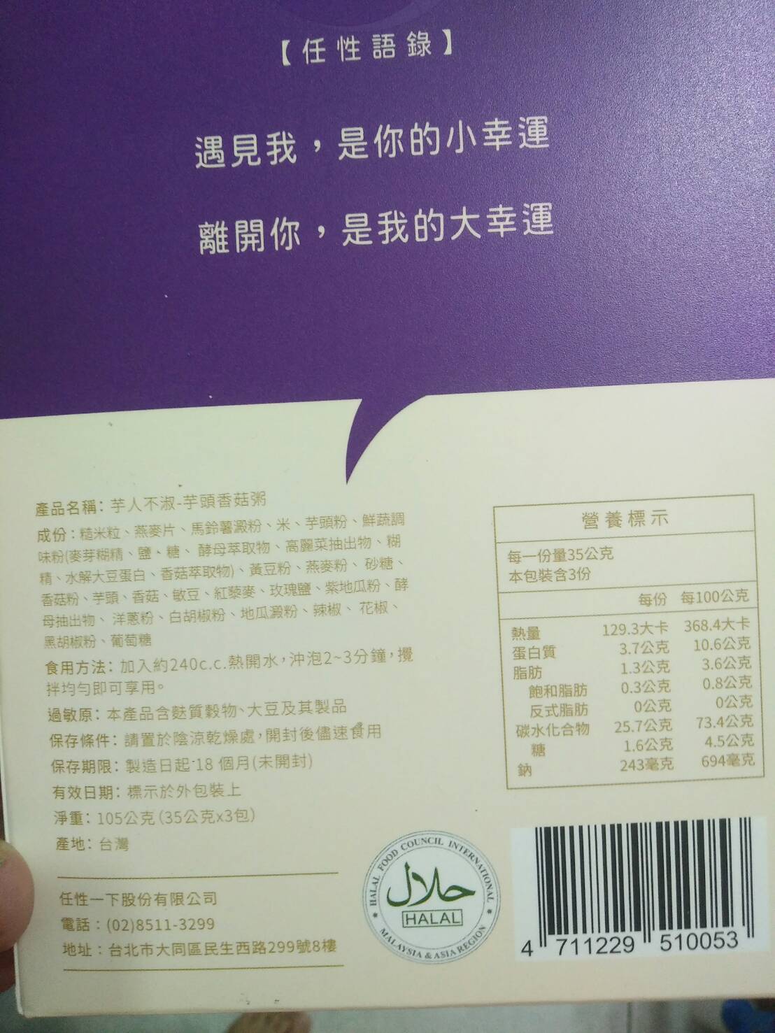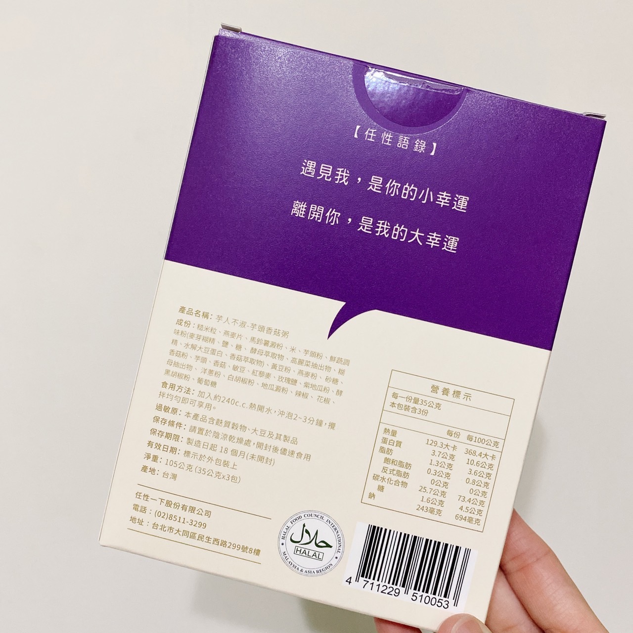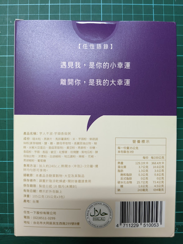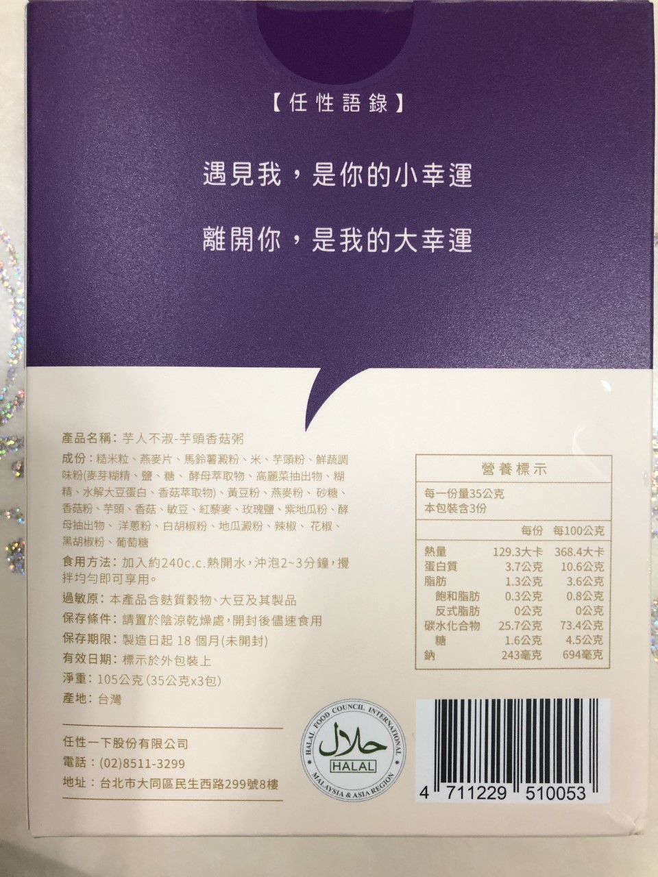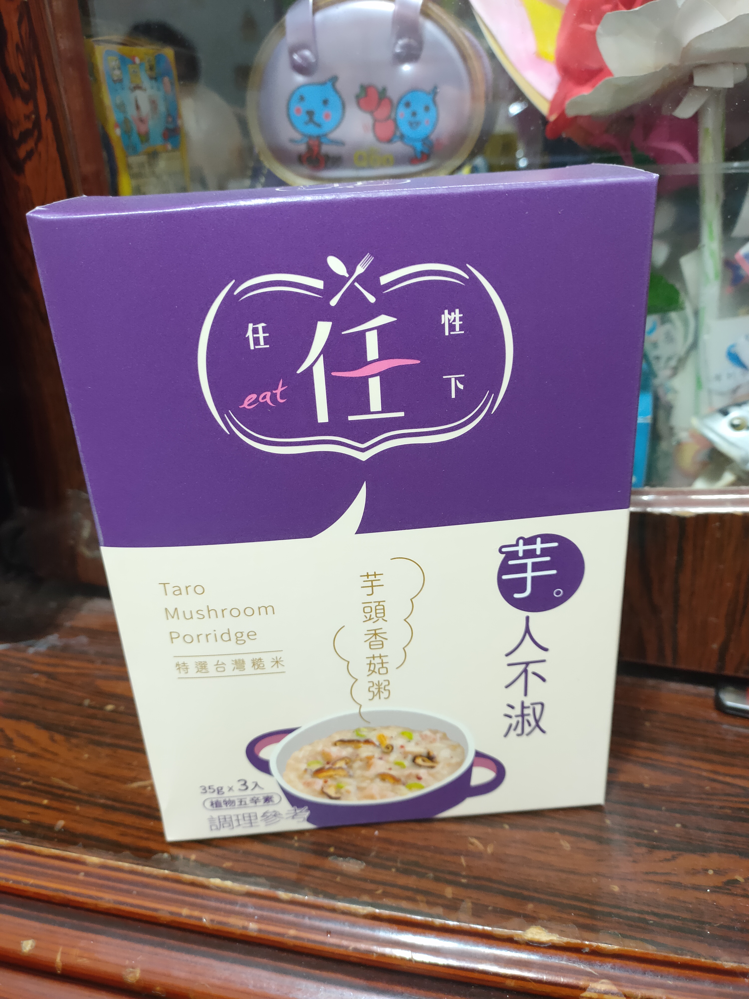 糙米粒、燕麥片、馬鈴薯澱粉、米、芋頭粉、鮮蔬調味粉、黃豆粉、燕麥粉、 砂糖、香菇粉、芋頭、香菇、敏豆、紅藜麥、玫瑰鹽、紫地瓜粉、酵母抽出物、 洋蔥粉、白胡椒粉、地瓜澱粉、辣椒、 花椒、黑胡椒粉、葡萄糖