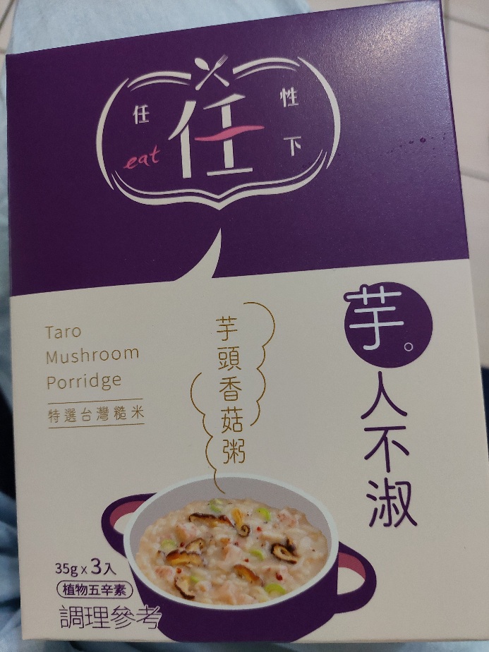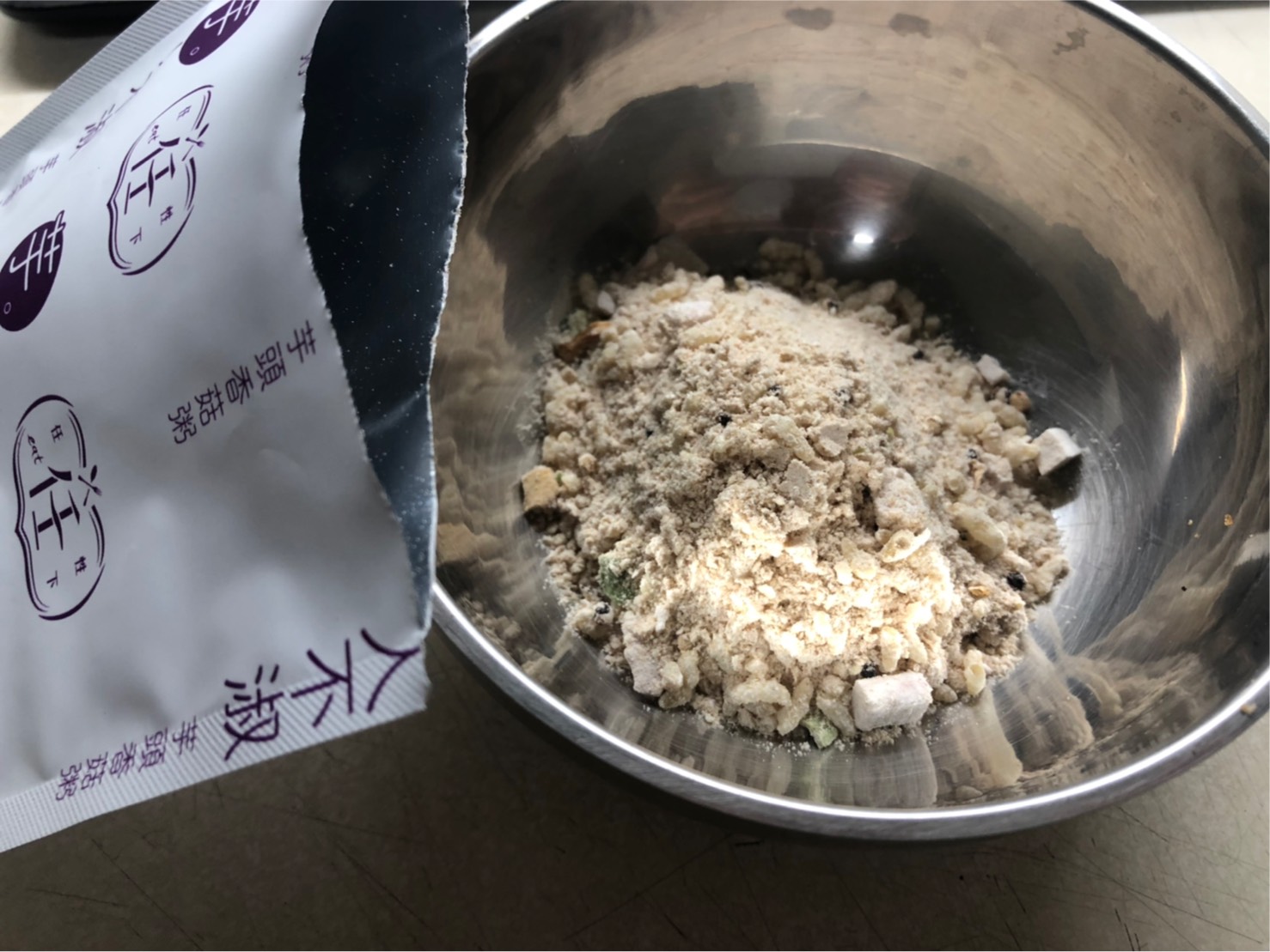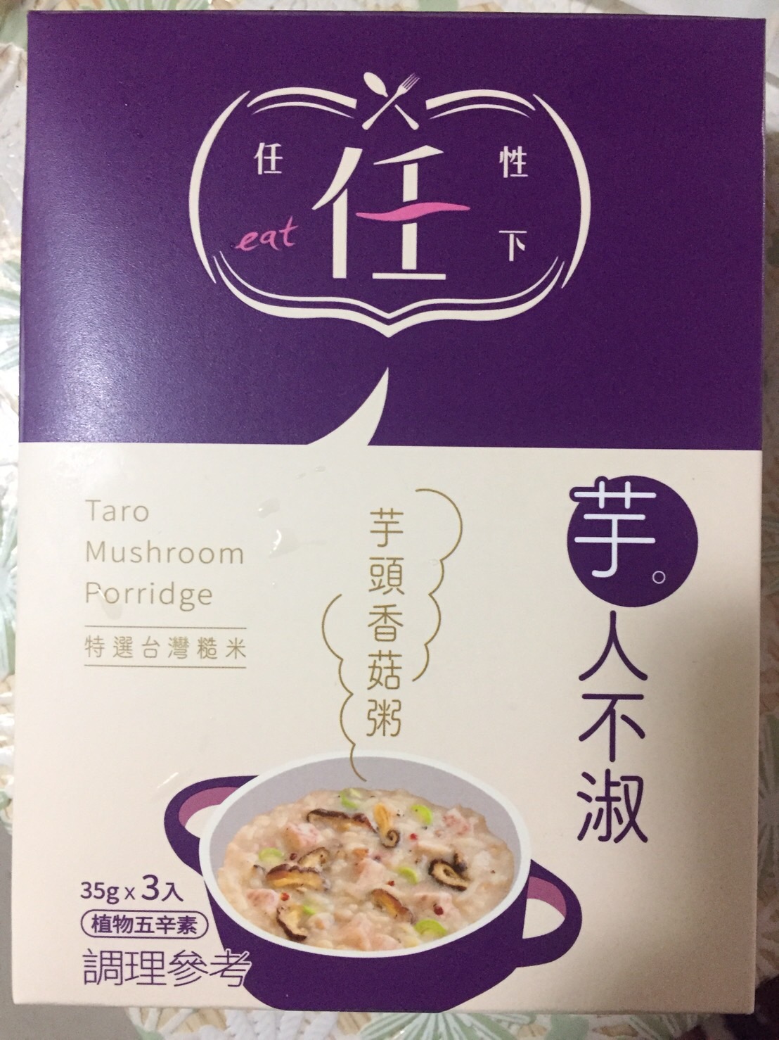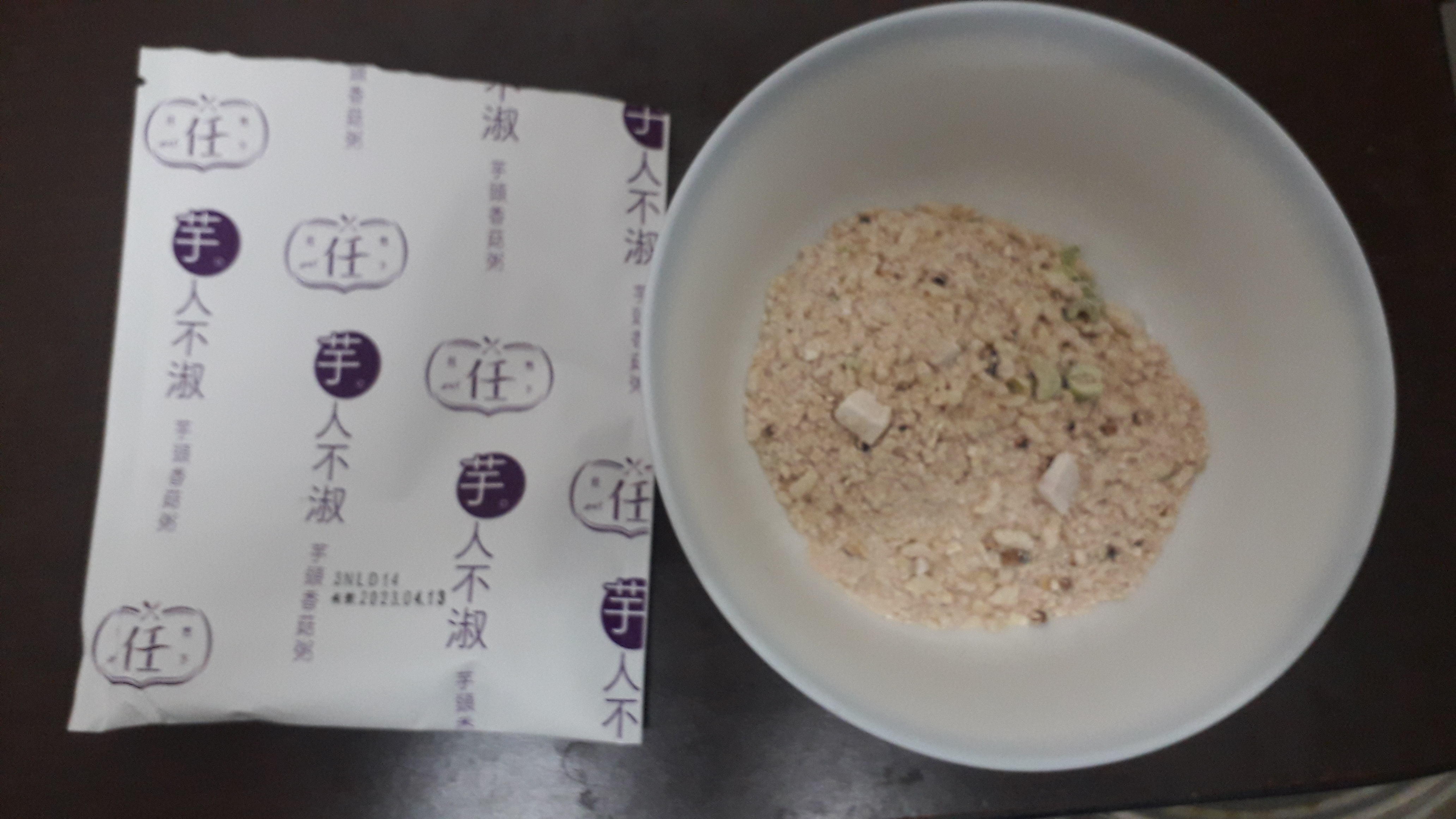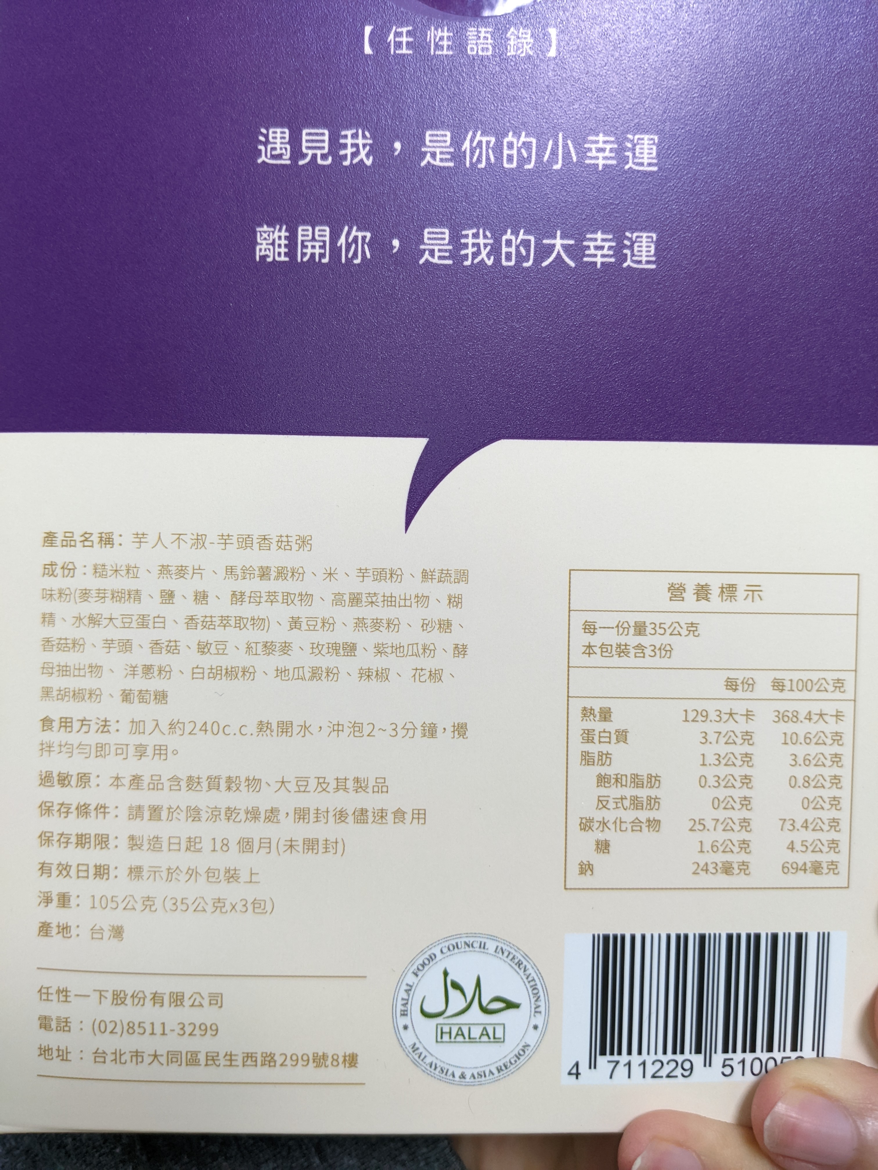 糙米粒、燕麥片、馬鈴薯澱粉、米、芋頭粉、鮮蔬調味粉、黃豆粉、燕麥粉、 砂糖、香菇粉、芋頭、香菇、敏豆、紅藜麥、玫瑰鹽、紫地瓜粉、酵母抽出物、 洋蔥粉、白胡椒粉、地瓜澱粉、辣椒、 花椒、黑胡椒粉、葡萄糖
