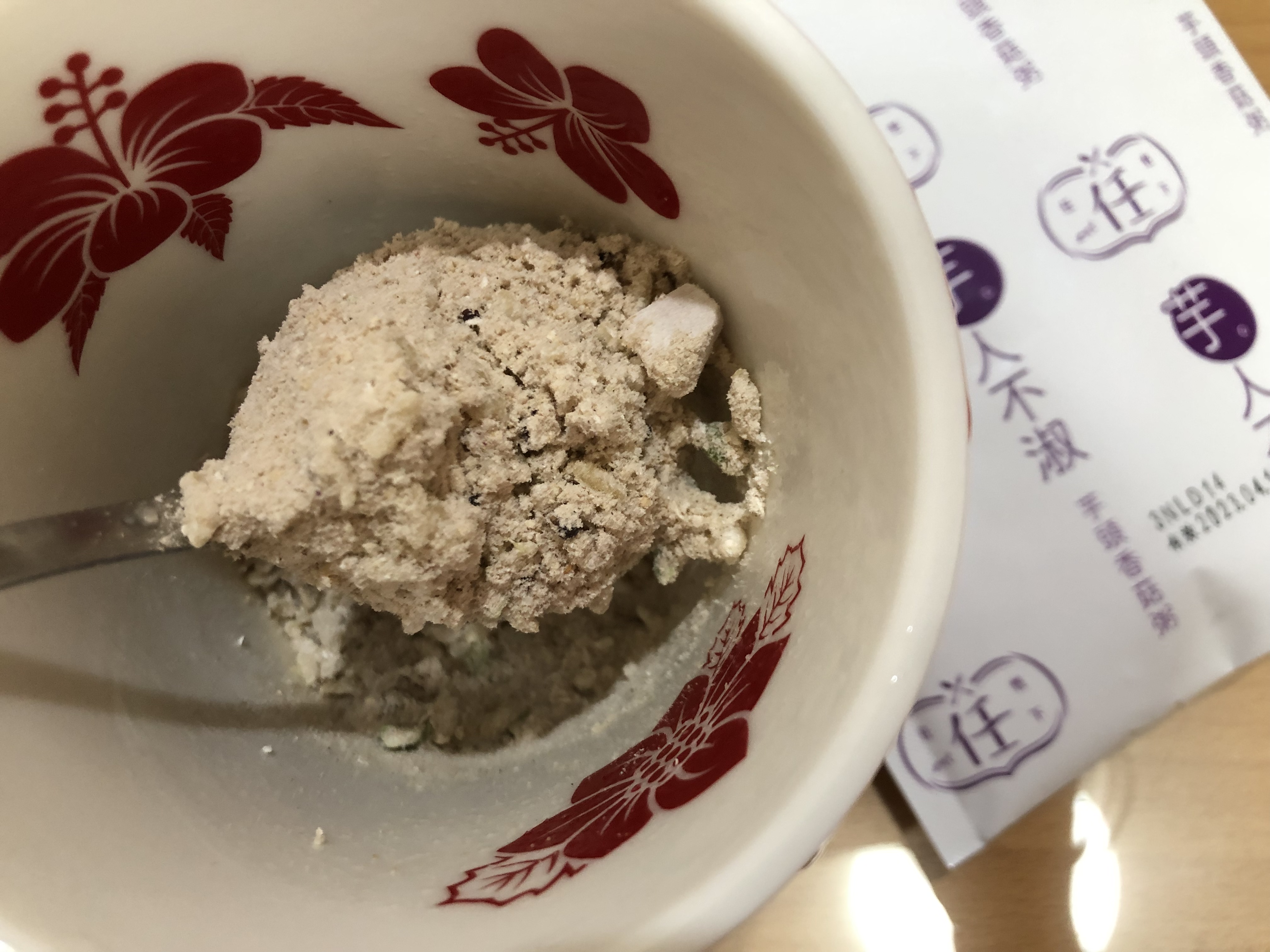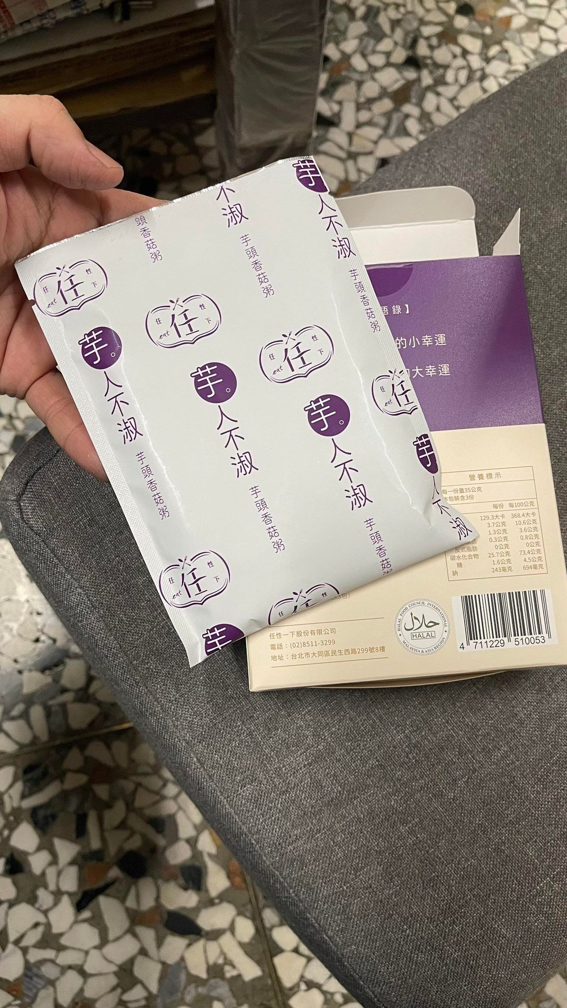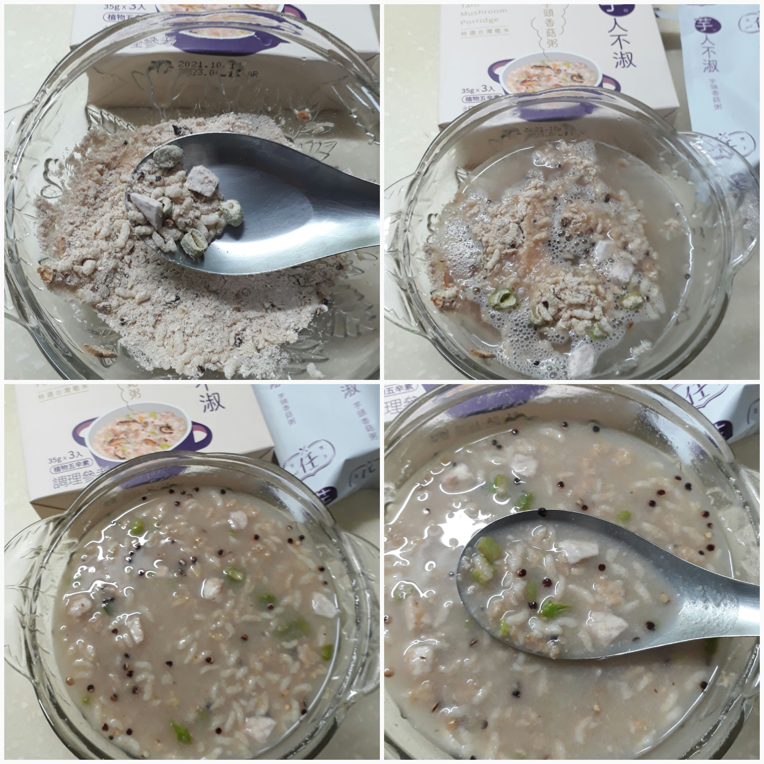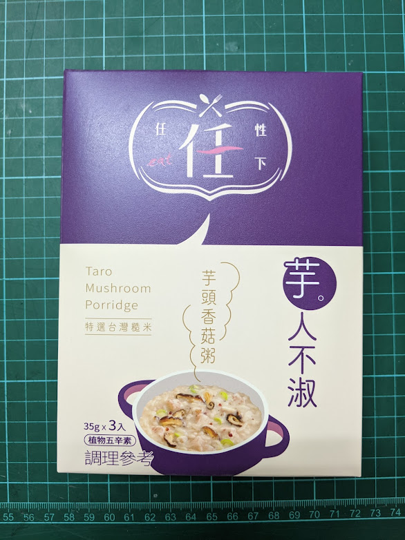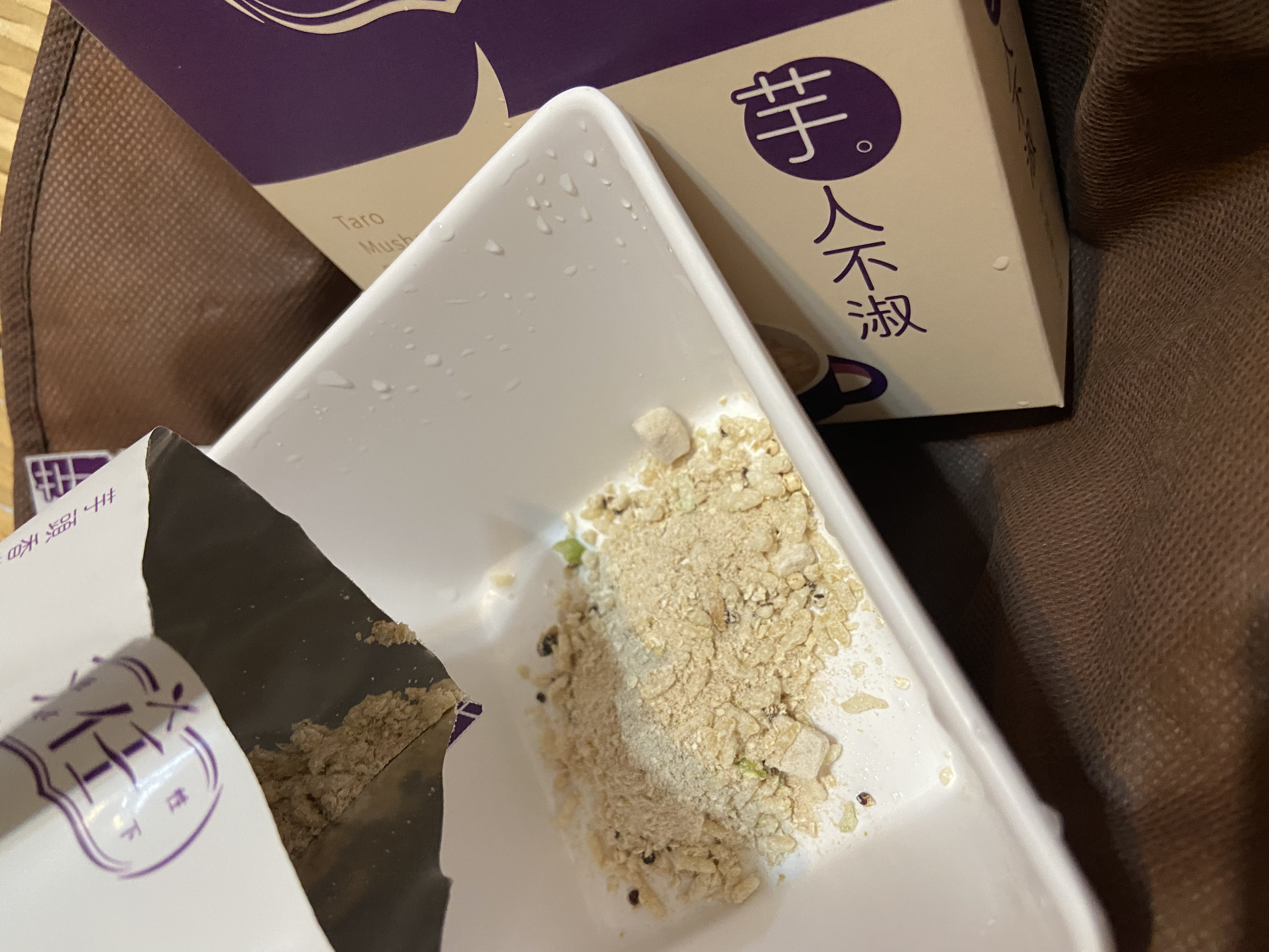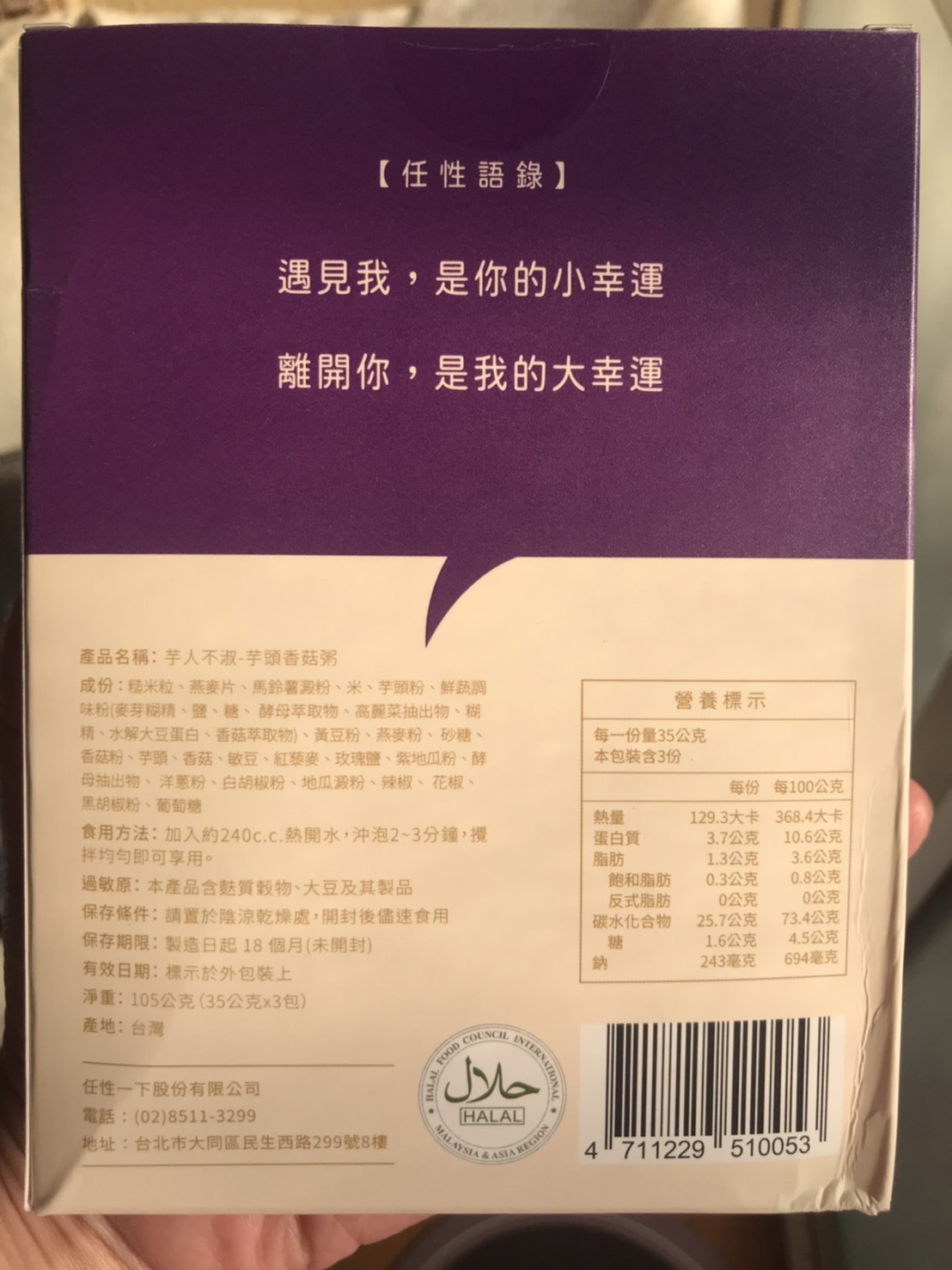 糙米粒、燕麥片、馬鈴薯澱粉、米、芋頭粉、鮮蔬調味粉、黃豆粉、燕麥粉、 砂糖、香菇粉、芋頭、香菇、敏豆、紅藜麥、玫瑰鹽、紫地瓜粉、酵母抽出物、 洋蔥粉、白胡椒粉、地瓜澱粉、辣椒、 花椒、黑胡椒粉、葡萄糖