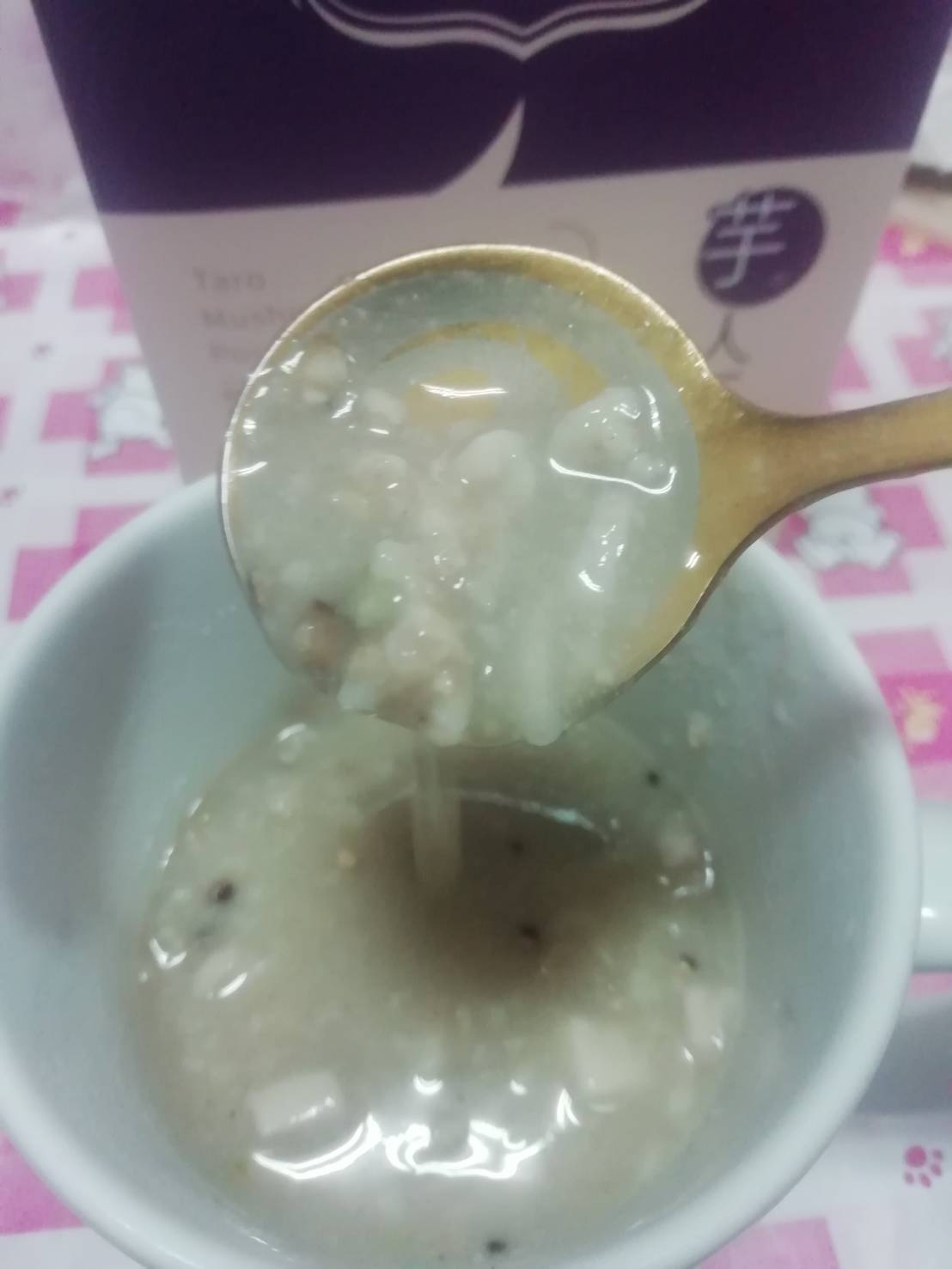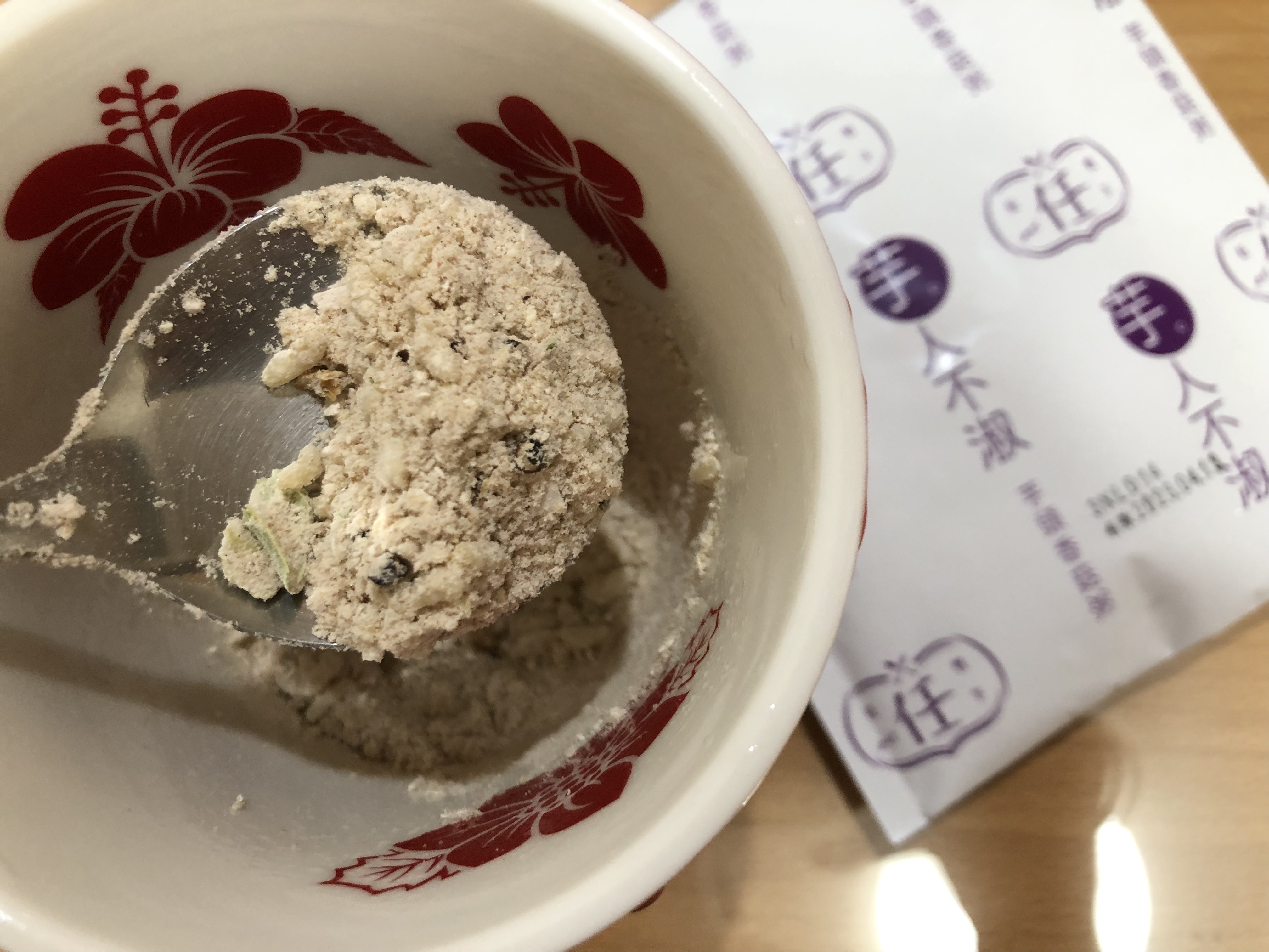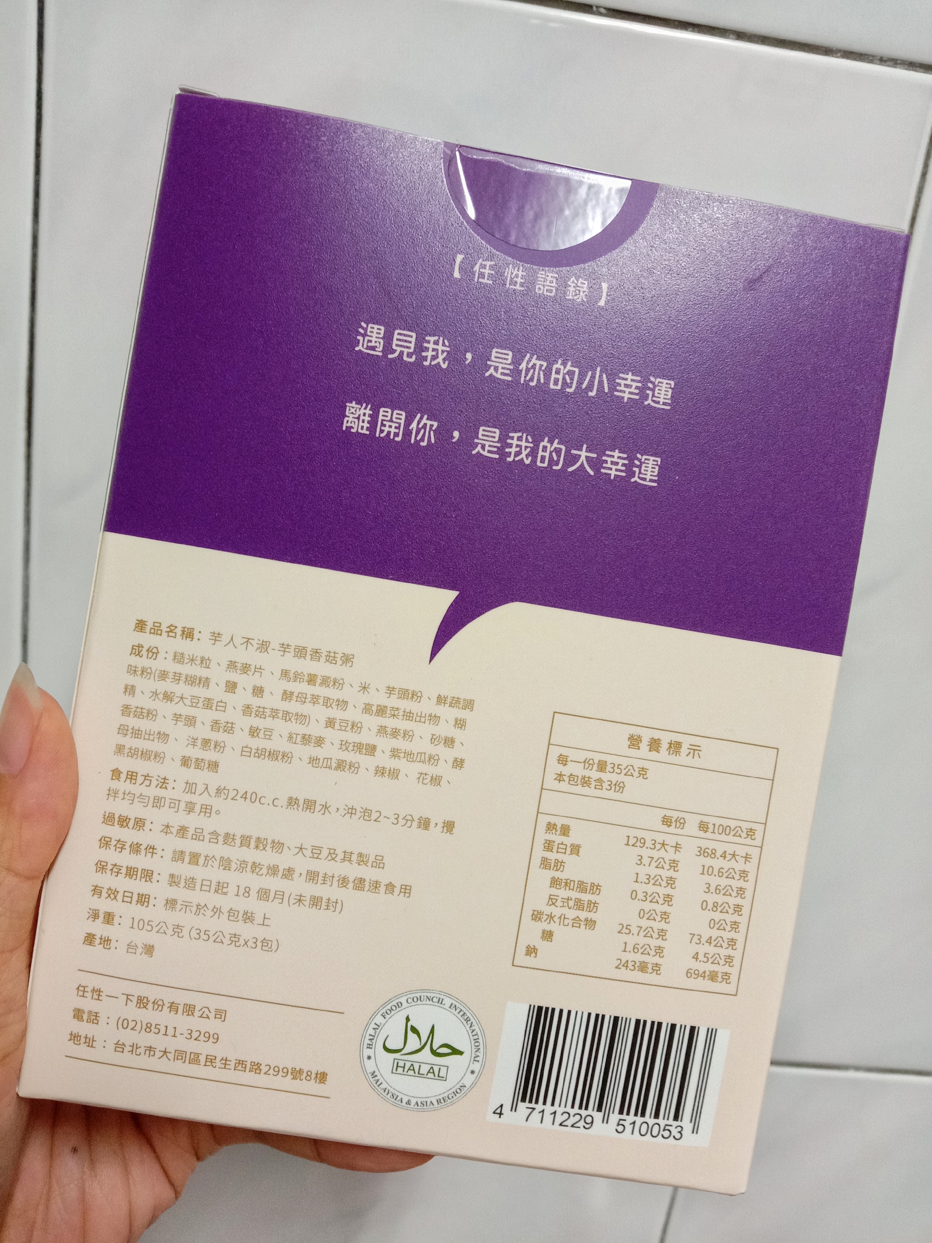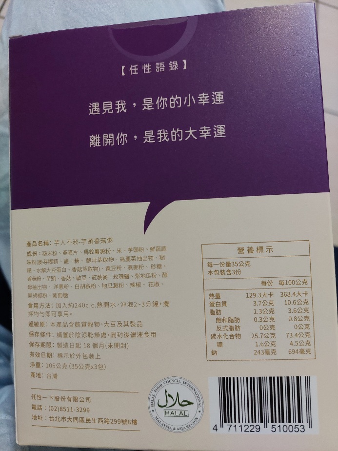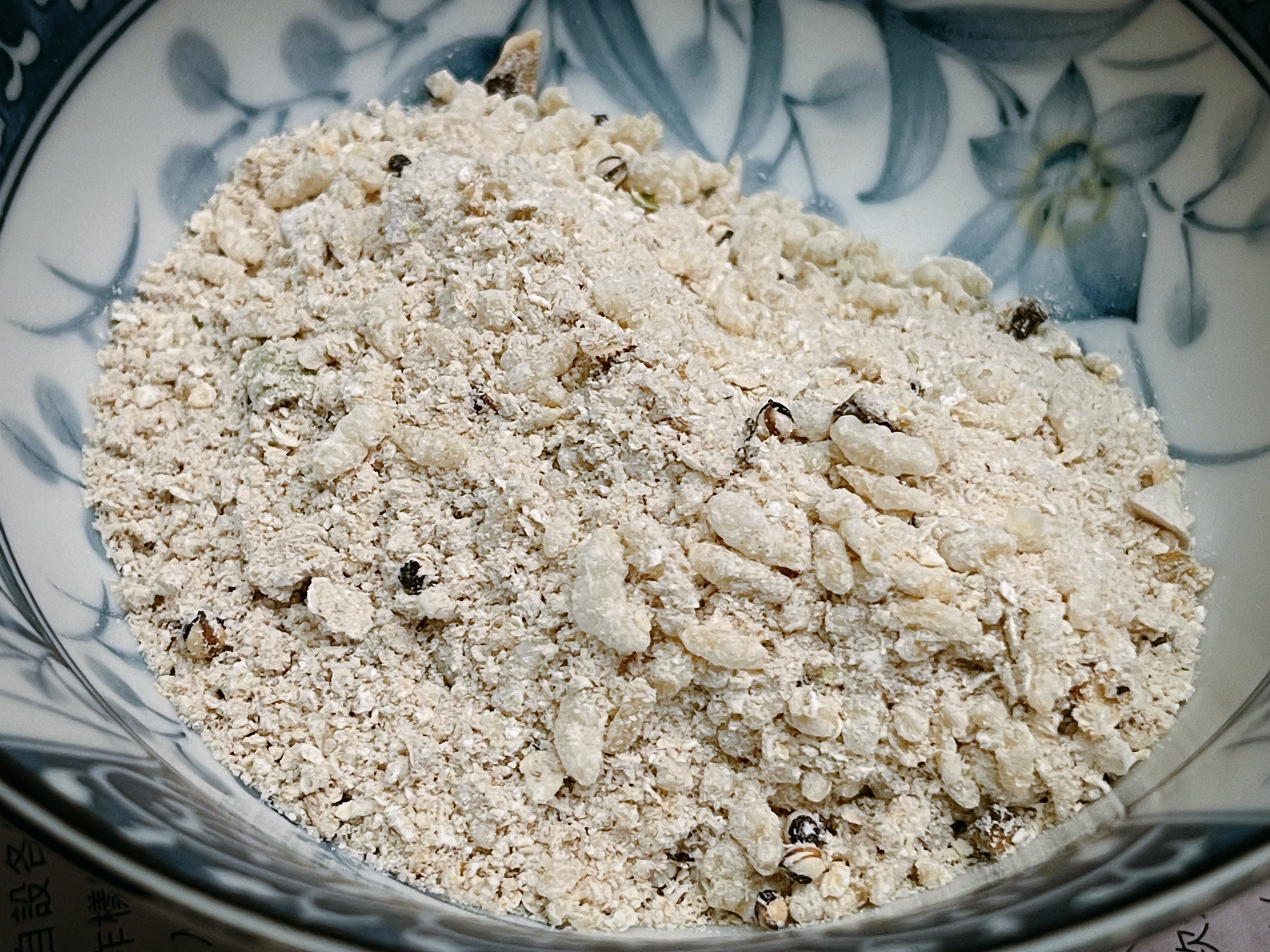 糙米粒、燕麥片、馬鈴薯澱粉、米、芋頭粉、鮮蔬調味粉、黃豆粉、燕麥粉、 砂糖、香菇粉、芋頭、香菇、敏豆、紅藜麥、玫瑰鹽、紫地瓜粉、酵母抽出物、 洋蔥粉、白胡椒粉、地瓜澱粉、辣椒、 花椒、黑胡椒粉、葡萄糖