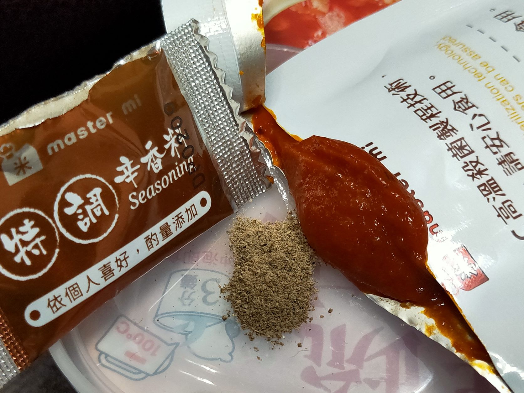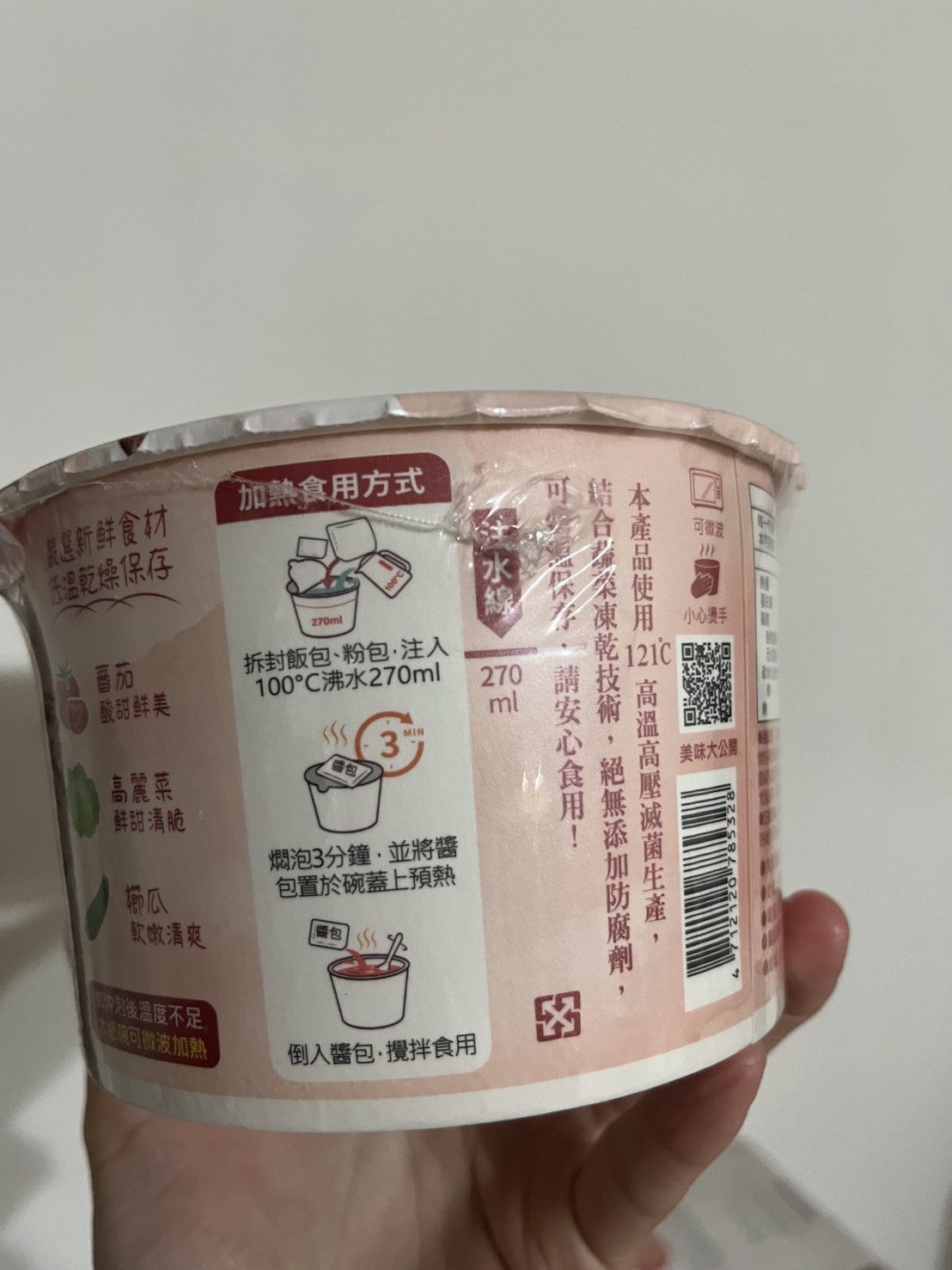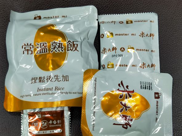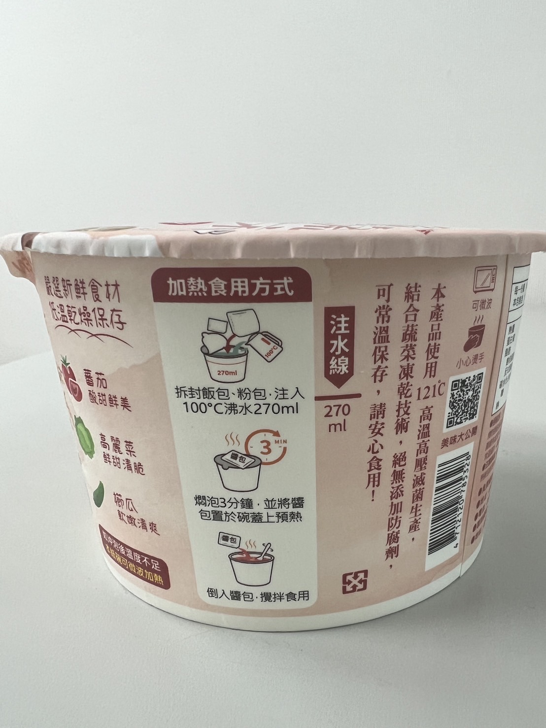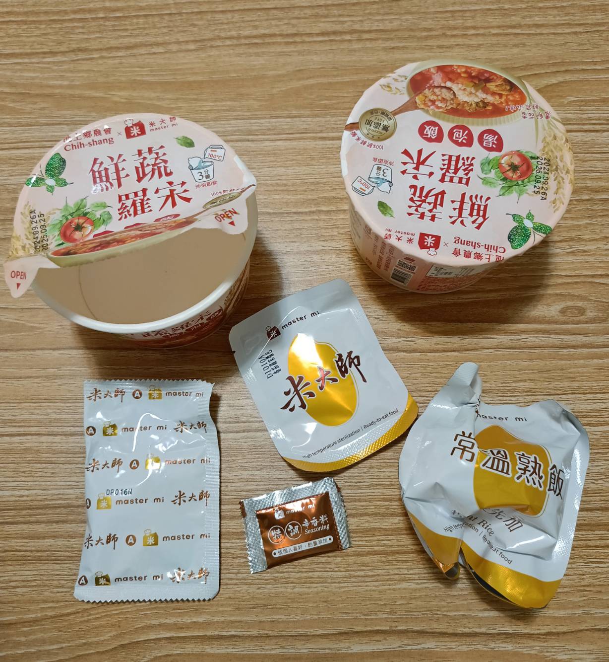 【飯包】水、白米、玄米油、米醋 ( 糯米、水 ) 【醬包】番茄醬 [ 水、番茄糊、蔗糖、釀造醋、食鹽、辛香料( 白胡椒、肉桂、紅辣椒、薑、丁香、肉豆蔻、月桂葉、眾香子 )、切角番茄 ( 番茄、番茄汁、檸檬酸 )、番茄糊、蔗糖、洋蔥、香料 { 牛肉萃取物 [ 牛肉 ( 產地:巴拉圭 )、水、乳糖、麥芽糊精 ]、碘鹽、牛肉熱反應香料 ( 牛油、葡萄糖、脂肪酸蔗糖酯、蒜粉、洋蔥粉、香料、陳皮末、DL-胺基丙酸、八角粉、花椒末、荳蔻末、小茴末、油桂末、丁香末、檸檬酸鈉 )、水解植物蛋白、酵母抽出物、胺基乙酸、關華豆膠、呈味核甘酸二鈉 ( 5'–鳥嘌呤核苷磷酸二鈉、5'–次黃嘌呤核苷磷酸二鈉 )、琥珀酸二鈉 ]、香料 ( 棕櫚油、大豆油、蔥萃取物 )、香料 ( 葵花油、紅椒萃取物 )、辛香料 ( 奧勒岡葉、羅勒葉、迷迭香葉、蒜粒、辣椒、馬郁蘭葉、洋香菜葉 ) 【蔬菜調味粉包】脫水高麗菜 ( 高麗菜、葡萄糖 )、複方調味粉 [ 鹽、L-麩酸鈉、糖、牛肉 ( 原產地:紐西蘭)、麥芽糊精、辛香料 ( 蔥、薑、桂皮 )、胺基乙酸、DL-胺基丙酸、5'–次黃嘌呤核苷磷酸二鈉、5'–鳥嘌呤核苷磷酸二鈉、香料、二氧化矽、牛油、檸檬酸 ]、乾燥牛肉 [ 牛肉 ( 原產地:澳洲、紐西蘭 )、玉米澱粉、鹽、味精、特磷素、混合濃生育醇 ]、複方調味粉 ( 麥芽糊精、鹽、L-麩酸鈉、糖、雞肉抽出物、5'–次黃嘌呤核苷磷酸二鈉、5'–鳥嘌呤核苷磷酸二鈉、玉米澱粉、軟質棕油、二氧化矽、檸檬酸、胺基乙酸、DL-胺基丙酸、洋蔥粉、香料 )、乾燥青花菜、調味劑 ( L-麩酸鈉、胺基乙酸、琥珀酸二鈉、碘鹽、DL-胺基丙酸、5'–鳥嘌呤核苷磷酸二鈉、5'–次黃嘌呤核苷磷酸二鈉、二氧化矽 )、食鹽、乾燥甜玉米粒、脫水紅蘿蔔、香料 ( 乳糖、葵花油、大蒜香料、芥花油、二氧化矽 )、乾燥櫛瓜、脫水青蔥、非活性酵母、香芹粉、二氧化矽 【胡椒粉包】黑胡椒