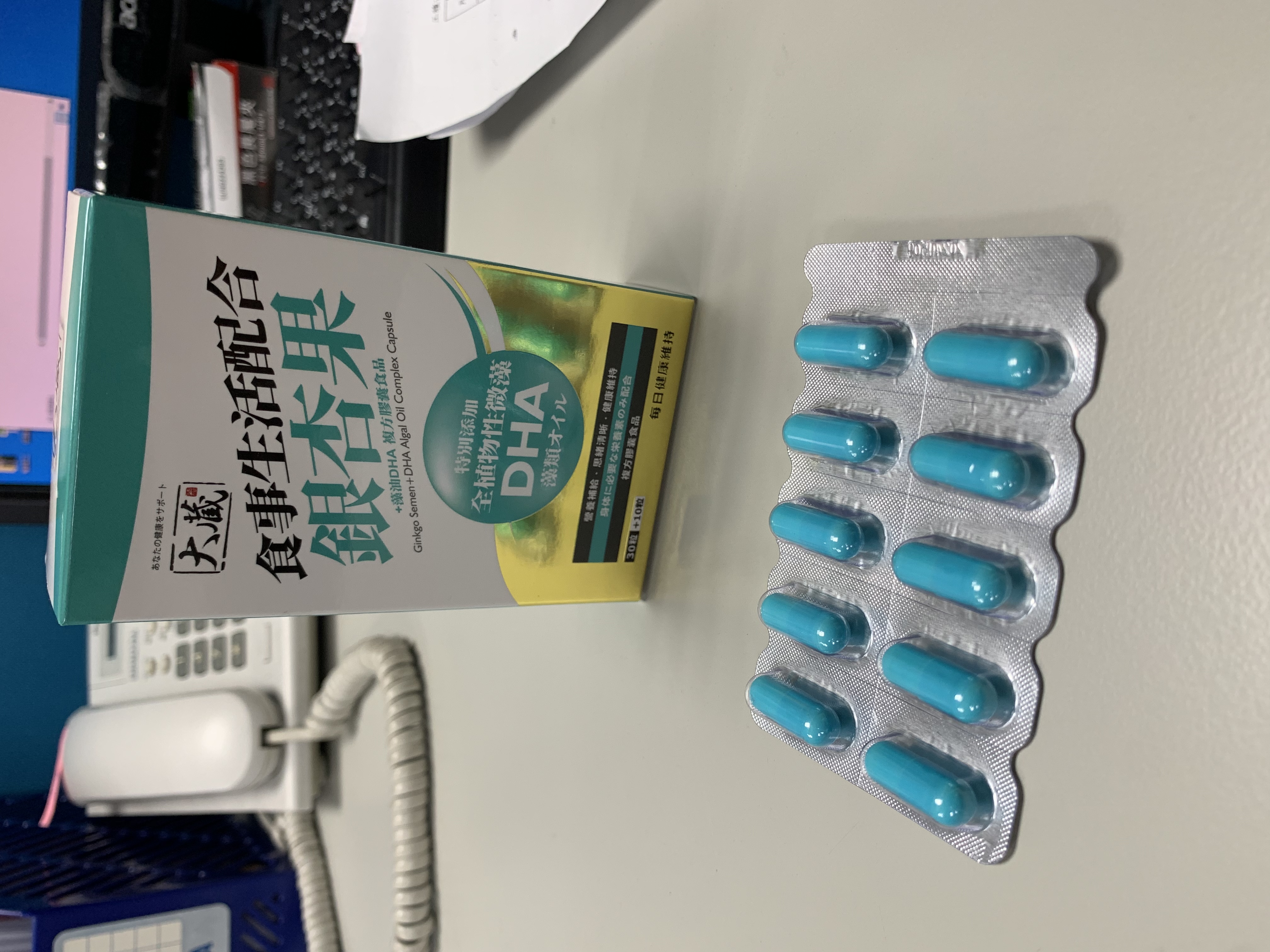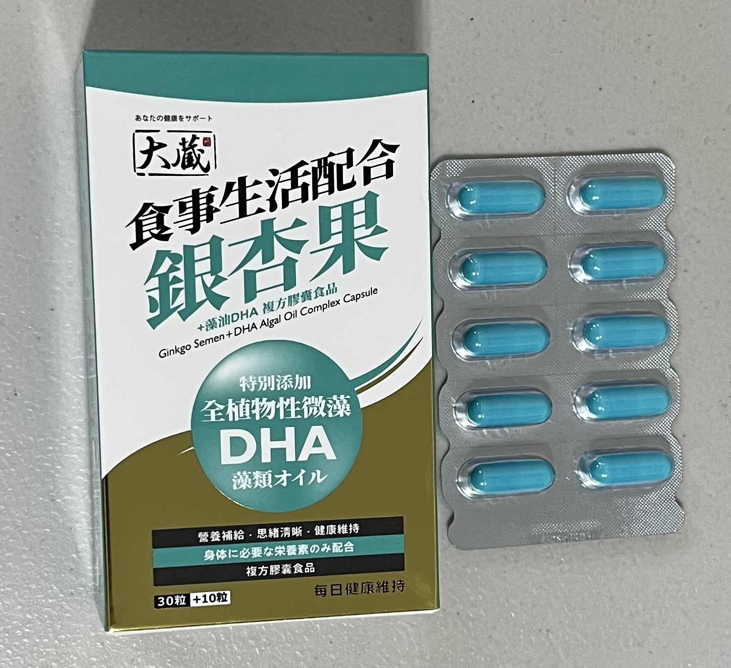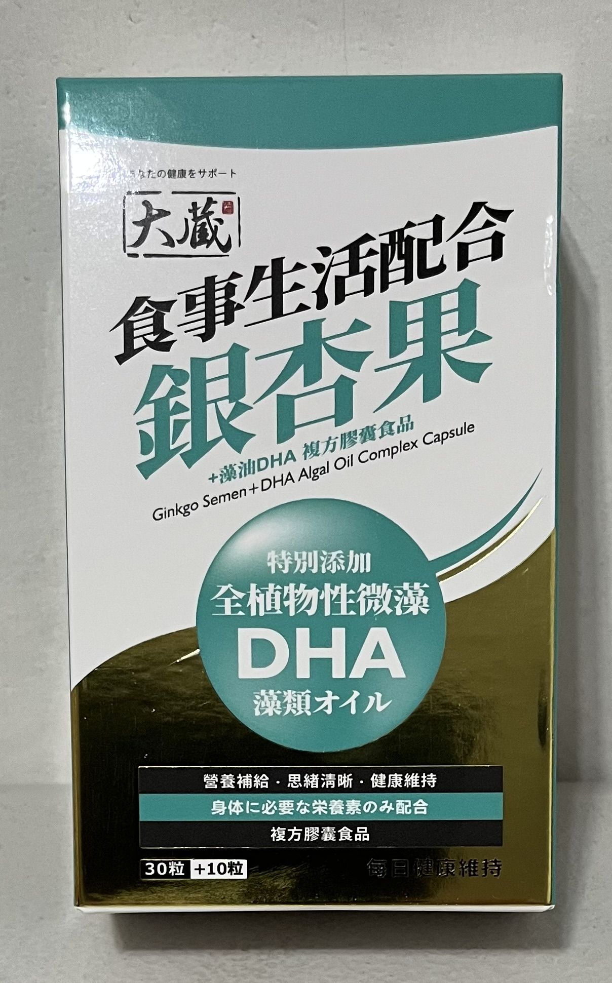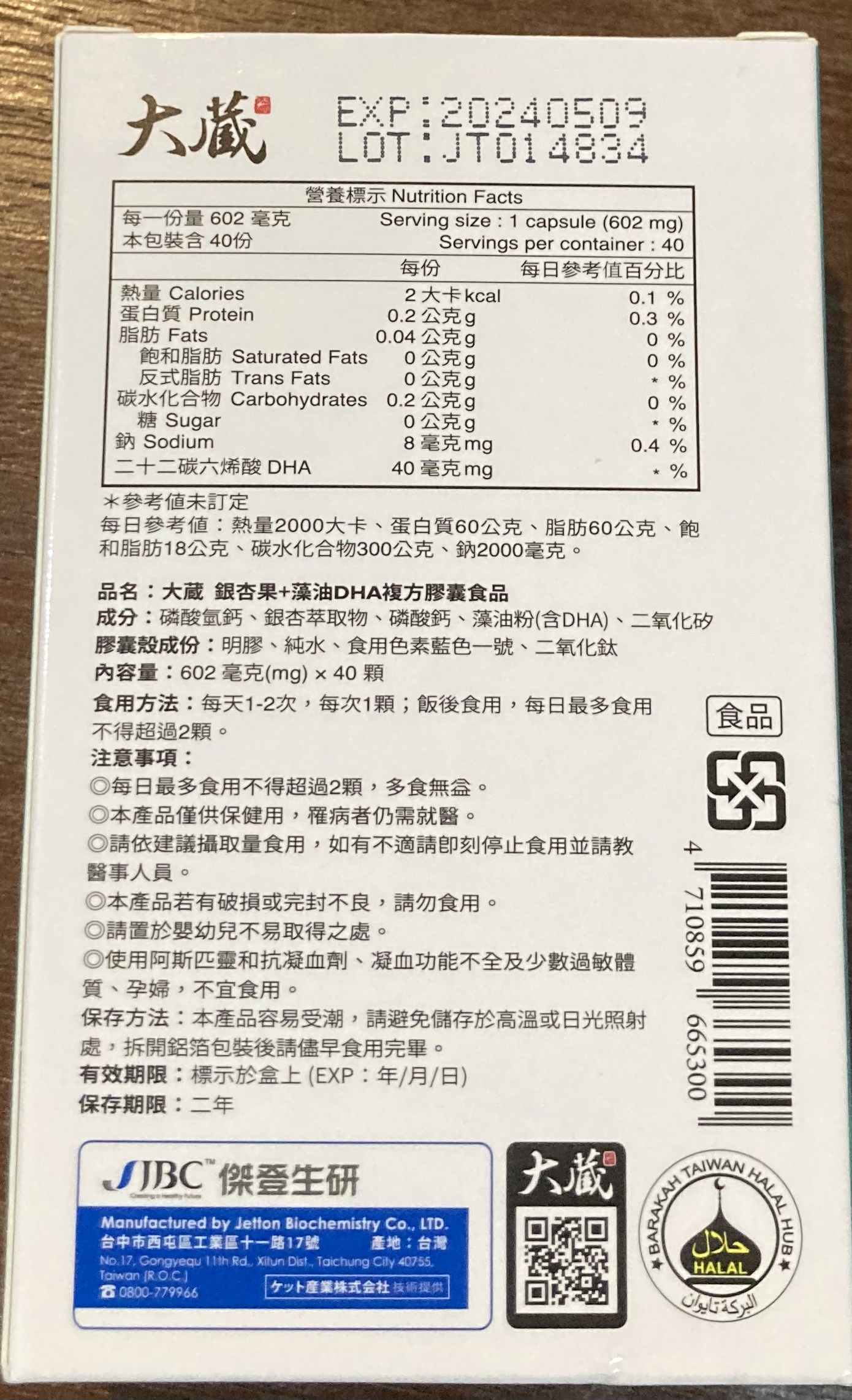 磷酸二鈣、銀杏萃取物、磷酸三鈣、藻油粉 (含40% DHA)、二氧化矽。