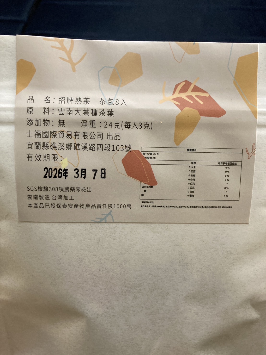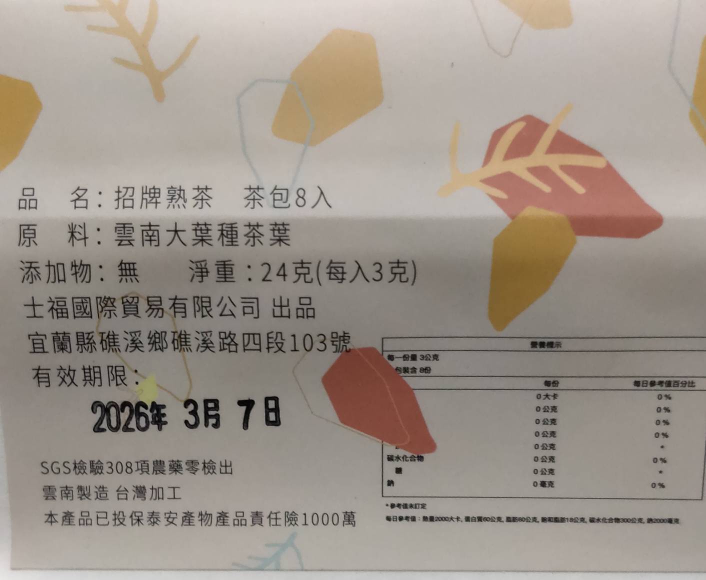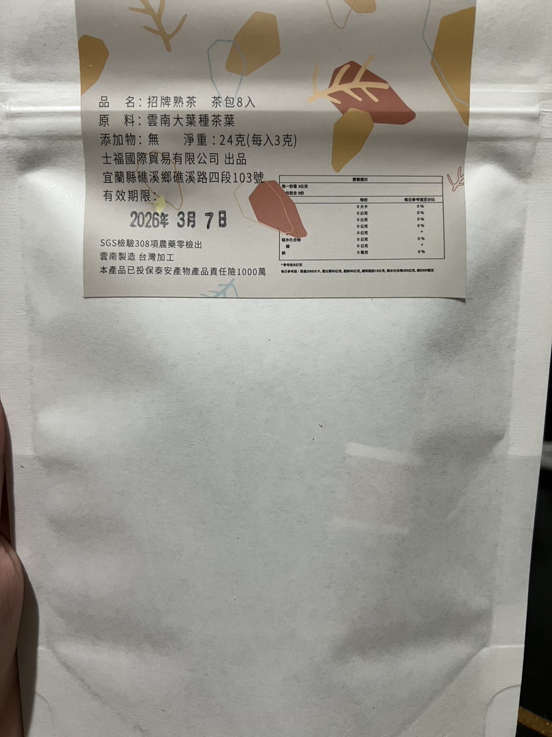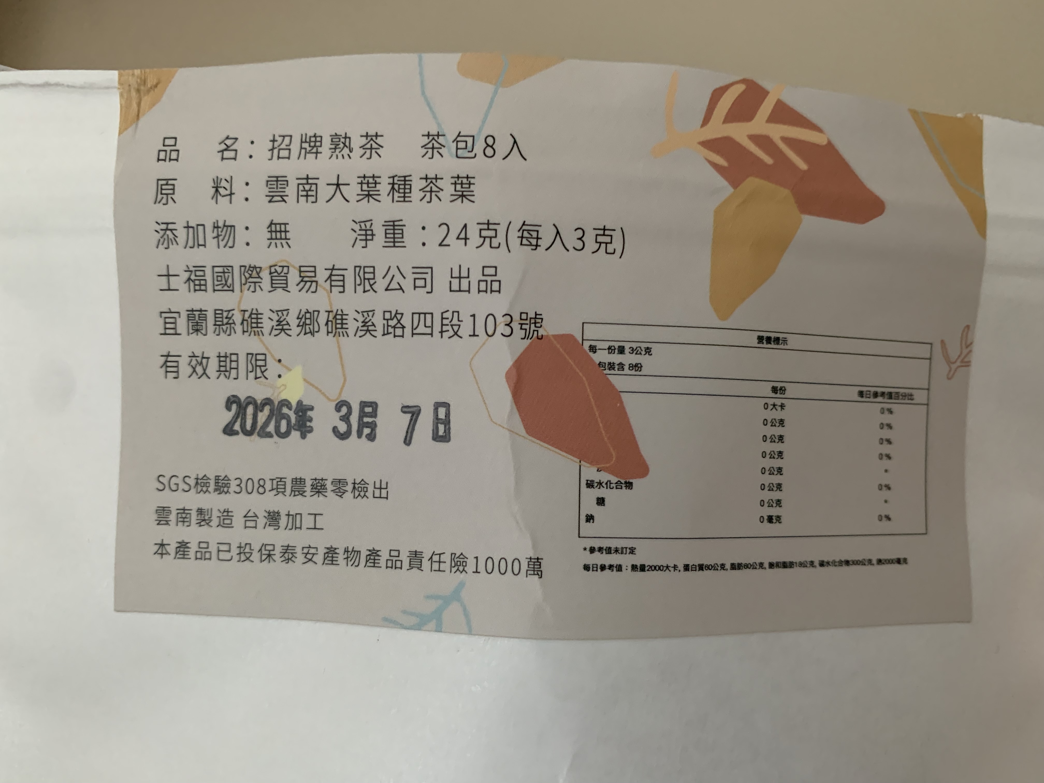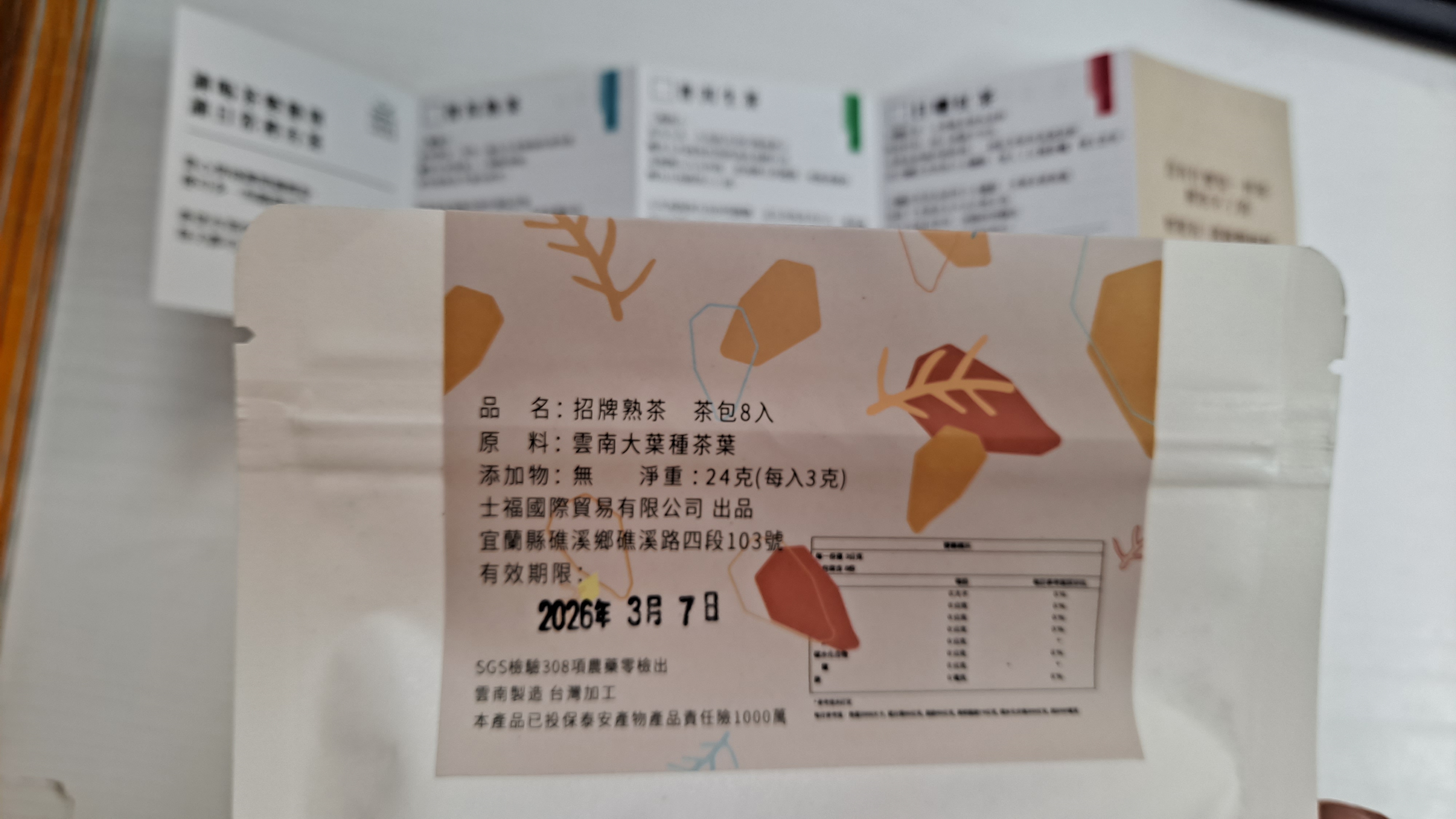 回列表 士福 招牌熟茶 茶包8入 來體驗真正普洱茶該有的溫潤陳香和回甘韻味 市價$200元(免費申請) 所需等級 一般會員以上 所需學分 30 體驗份數 60 關注人數 1050 申請人數 302 申請截止 品牌業者:水屋厚茶 負責廠商 士福國際貿易有限公司 廠商地址 宜蘭縣礁溪鄉礁溪路四段103號 產地 臺灣 試用產品規格 3g*8/包 食品業者登錄字號 G-124642659-00000-2 投保產品責任險字號 07 062212C10222 心得分享 商品介紹 商品成分 使用方法 注意事項 體驗名單 8.7 士福 招牌熟茶 茶包8入 來體驗真正普洱茶該有的溫潤陳香和回 回甘不苦澀 8.9 體感舒適度 8.7 沒有霉味 9.1 茶包的耐泡度高 8.9 建議推薦 8.7 心得分享 59則 闕素純 金食達人 58歲 新北市 2024/06/27 對士福 招牌熟茶 茶包8入 來體驗真正普洱茶該有的溫潤陳香和回留下評價 10 根據研究顯示,普洱消脂素能夠增強腸道蠕動,促進消化,有助於改善腸道健康和防治肥胖症。 此外,普洱消脂素還具有抗氧化、抗炎、降血壓、預防心血管疾病等作用。 總之,喝普洱茶可以提神醒腦、幫助減肥、好處多多,但是一般普洱茶餅,要喝的時候,都會聞到一股霉味,這次收到的士福招牌熟茶-普洱茶包,沖泡很簡單,只要有馬克杯或保溫杯,裝好熱開水,放入一個茶包,就能輕鬆享用一杯好茶,還能依照各人喜好濃度回沖,完全沒有難聞的霉味,茶湯芳醇甜潤,帶有怡人荷香,推薦給喜愛喝茶的大家,一定要試試看喔~ 洪鼎軒 金食達人 31歲 臺中市 2024/06/27 對士福 招牌熟茶 茶包8入 來體驗真正普洱茶該有的溫潤陳香和回留下評價 10 今天喜獲由食力公司寄送:品名:招牌熟茶提供廠商:士褔國際貿易有限公司試喝心得: 來自雲南大葉種普洱茶葉,用宜興壺溫泡,泡出純厚的參香氣,喝入口中回甘,甜潤厚實,溫胃。普洱茶中天然的酵素和微生物,可以幫助促進腸道的健康,並且減少脂肪的吸收,並減輕胃部不適和腹脹等問題。茶多酚有助於降低膽固醇水平,進而減少動脈硬化的風險。茶多酚一樣可以幫助降低心臟病的風險,並有助於保護心臟健康。 茶多酚和咖啡因有助於促進新陳代謝,幫助身體燃燒脂肪。說不出的滿足與幸福!#士褔普洱熟茶 Isa 金食達人 45歲 臺南市 2024/06/27 對士福 招牌熟茶 茶包8入 來體驗真正普洱茶該有的溫潤陳香和回留下評價 10 士福普洱/招牌熟茶,第一次看見普洱茶的茶包,普洱茶的茶包,感覺很方便,畢竟普洱的茶葉本就比一般茶葉細,做成立體茶包,就茶具的清潔上真的省事許多…(至少對比較懶惰的我而言,真的方便得很阿)茶味清純,沒有什麼霉味,茶湯的茶色很純、偏紅,味道不苦澀,還蠻順口的,耐泡度還可以。包裝還不錯,簡單的外包裝,乾乾淨淨的感覺,8入小包裝,很快就可以喝完,不容易受潮,也算是方便保存,很適合沒喝過、想試試普洱茶風味的人,也很方便攜帶,有SGS檢驗無農藥,感覺安全有保障。 朱育瑩 鑽石達人 39歲 彰化縣 2024/06/28 對士福 招牌熟茶 茶包8入 來體驗真正普洱茶該有的溫潤陳香和回留下評價 10 感謝士福抽中此次試用機會,「招牌熟茶」普洱茶,原本以為喝起來會苦澀,但實際沖泡之後,喝起來很順口,還帶有淡淡的茶葉香氣,不再是以前印象中普洱茶的苦澀味道,當用熱水沖泡下去時,就會有一股茶香開始四溢,有股清香,對於喜好品茗之士,可以嘗試看看喔! 產品還有附上沖泡的方法,對於初次嘗試的人,提供一個良好的體驗機會。我個人喜愛普洱茶浸泡久一點,讓茶香較濃、茶色較深一點,但是有時會造成苦澀味很重,然而這款「招牌熟茶」及時浸泡久了也不會苦澀且爽口、回甘,還可以回泡個兩三次,真的是物超所值。 YU 金食達人 39歲 高雄市 2024/06/28 對士福 招牌熟茶 茶包8入 來體驗真正普洱茶該有的溫潤陳香和回留下評價 10 士福 招牌熟茶(普洱茶) 茶包8入來源: 雲南普洱茶(中國)內容: 裸三角茶包茶包材質:PLA玉米澱粉普洱熟茶,有著熟茶孕有溫潤醇厚的口感,絲滑的茶湯流入口中,回甘於口舌中製作茶葉也是一門學問,士福有自己的茶葉精製場,不是委託他人代工,茶品都會送驗,可安心享用士福說熟茶因經過渥堆,咖啡因會在渥堆的過程中被降解,加上時間存放,大部分的熟茶咖啡因都是偏低的士福之前還有出過茶膠囊,是一個有創意的品牌 蘇泱毓 鑽石達人 26歲 臺北市 2024/06/30 對士福 招牌熟茶 茶包8入 來體驗真正普洱茶該有的溫潤陳香和回留下評價 10 這次試用的是士福普洱茶的招牌熟茶,是雲南產的大葉種茶。想說喝茶對身體好沒有熱量,沒想到就抽中了,開心~我對茶的印象一般都是不適合空腹喝,因為蠻澀的,同時也解油膩。第一次喝這款茶我是放在飯後喝,蠻意外它喝起來沒有任何澀感(當然感覺解膩效果就沒那麼好),腸胃不會有任何不適感(舒適度有),才理解為何說明書上會說「隨時都可以喝」,而非「不適合空腹飲用」哈哈~查了一下熟茶顏色會比較深,第一次泡顏色比紅茶還深黑!我自己覺得沖泡三次都還是有味道附圖為第一ㄧ泡跟第三泡),但第四次之後味道會淡一些,應該算耐泡(平常只沖兩次)?。味道的部分感覺很溫和,不知為何有種泡溫泉喝的那種味道?包裝的部分是三角的茶包,線的部分有沾在茶包上要拉開一下(有兩個點)。整體推薦這個產品,給想喝茶的人。 吳瓊蕙 金食達人 62歲 臺南市 2024/07/01 對士福 招牌熟茶 茶包8入 來體驗真正普洱茶該有的溫潤陳香和回留下評價 10 我有個同學以前在高雄崛江賣中國進