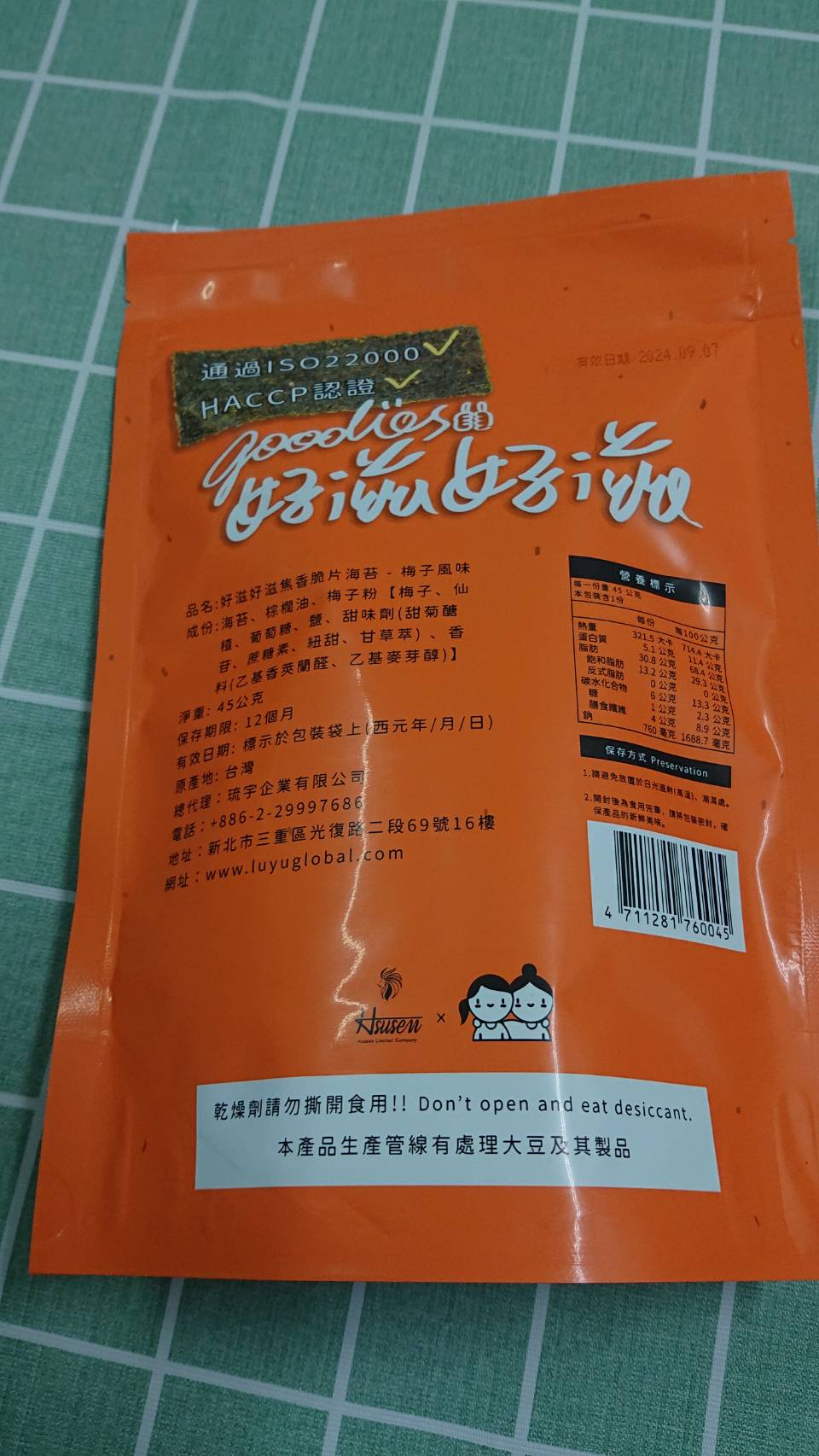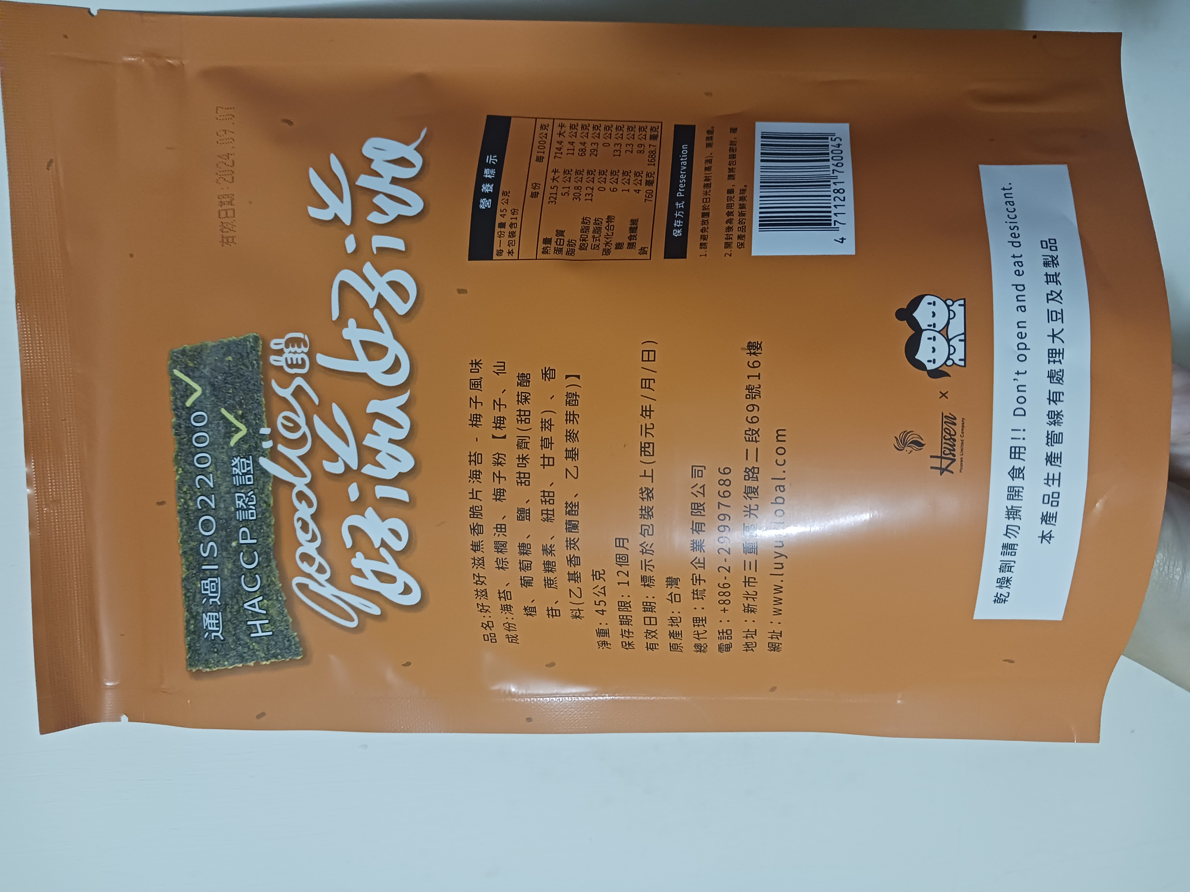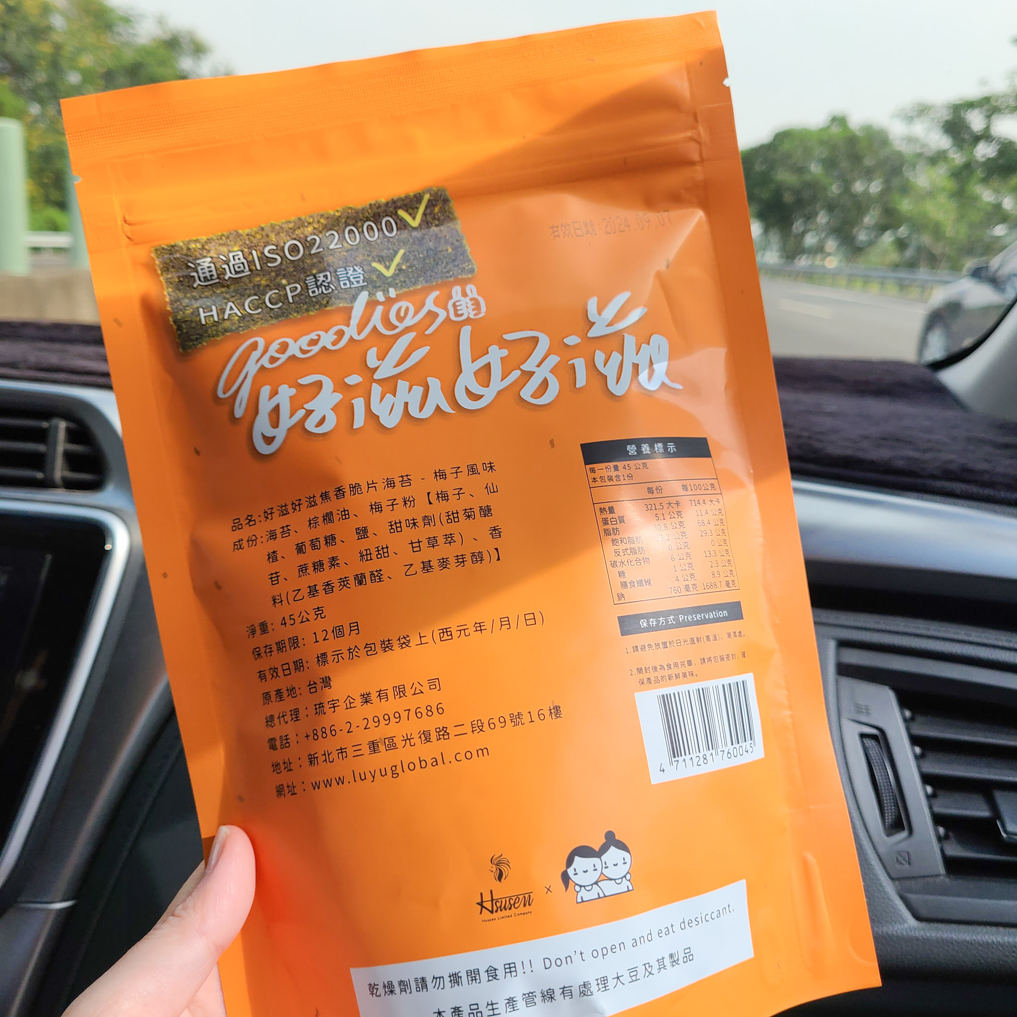 回列表 琉宇醬選 好滋好滋酥脆海苔(梅子口味)梅子甘甜香氣X酥脆口感 解饞小零嘴 市價250元(免費申請) 所需等級 一般會員以上 所需學分 70 體驗份數 15 關注人數 1651 申請人數 295 申請截止 品牌業者:琉宇醬選 負責廠商 琉宇企業有限公司 廠商地址 新北市新莊區思源路453巷2號 產地 台灣 試用產品規格 45g/包 食品業者登錄字號 F-183379492-00000-8 投保產品責任險字號 和泰產險 60-111-10792457-00001-PDL 心得分享 商品介紹 商品成分 使用方法 注意事項 體驗名單 9.0 琉宇醬選 好滋好滋酥脆海苔(梅子口味) 梅子香氣 9.0 酥脆程度 9.0 順口唰嘴 9.0 包裝美學 8.8 建議推薦 8.8 心得分享 13則 吳文嫻 金食達人 35歲 臺北市 2023/10/22 對琉宇醬選 好滋好滋酥脆海苔(梅子口味)留下評價 10 琉宇醬選 好滋好滋酥脆海苔醒目的橘色外包裝採夾鏈袋設計,方便取食與確保海苔不易受潮 ; 好滋好滋酥脆海苔(梅子口味)有別於一般傳統海苔,結合台灣在地食材,採用低溫烘烤,呈現海苔最真實的天然味,咬起來咔滋咔滋,酥脆海苔與酸甜梅子結合的鹹甜口感令人難以想像的完美搭配,吃在口中融合的恰恰好,酥脆爽口讓人一口接一口停不下來,最棒的是它是純素,素食者也可以吃喔~ Shih 金食達人 30歲 新北市 2023/10/22 對琉宇醬選 好滋好滋酥脆海苔(梅子口味)留下評價 10 本身沒有很喜歡吃海苔,但這次的產品非常驚豔!包裝是夾鏈袋的方式,私心覺得可以改成盒裝,因為有點容易壓碎就不方便吃了@@海苔酥脆度很夠,平面的海苔可以達到吃海苔空心捲的脆度,上面的調味粉酸甜酸甜非常涮嘴,且不會容易掉粉,海苔做成長片狀,很適合做海苔日式小飯團。 APPLE 金食達人 39歲 高雄市 2023/10/24 對琉宇醬選 好滋好滋酥脆海苔(梅子口味)留下評價 9 這次體驗琉宇醬選的(好滋好滋酥脆海苔-梅子口味)這種解饞小零嘴,超適合外出旅遊帶在車上吃!!包裝袋是有夾鏈袋設計的~不管是在家裡、辦公室,還是外出攜帶都很方便,吃多少拿多少!!我覺得海苔與梅子結合的口味,滿特別的~梅子的口味好像比較重一點,有點偏甜,容易搶過海苔味但整體上是好吃的,酥酥脆脆的~很唰嘴一趟旅行才剛出門就快要吃完了~這真的很適合當出遊的小零嘴呢! Joe Ho 金食達人 46歲 苗栗縣 2023/10/24 對琉宇醬選 好滋好滋酥脆海苔(梅子口味)留下評價 10 感謝食力給予機會試吃琉宇醬選好滋好滋酥脆海苔(梅子口味)。之前在其他團購平台有看到很多人再團購,但一直沒機會購買,這次能獲得試吃機會真的非常期待。他與市面上的海苔不同,有著酥脆口感但又不油膩,經過烘烤後的海苔不僅保留了海苔的香氣,更產生了撲鼻的焦香味。梅子口味非常好吃,鹹鹹甜甜的讓人一口接一口,而每一口海苔都可以感受到濃烈的梅子香,梅粉分佈的非常均勻。此產品也是全素的,可以提供素食者食用。不過他的熱量與含鈉量有點高,一日不可食用過量。 洪金蘭 金食達人 56歲 新北市 2023/10/24 對琉宇醬選 好滋好滋酥脆海苔(梅子口味)留下評價 10 真的很感謝食力平台,讓我試吃「好滋好滋焦香脆片海苔」!首先從包裝上來說,橘色底加上可愛人物圖像,凸顯封面兩片海苔,簡單搶眼又有趣味。尤其一次性包裝讓我很喜歡,覺得不重複很環保。然後含一口海苔在口中,梅香味融合海苔味撲鼻而來,一咬下去卡滋卡滋的聲音,讓我好驚豔ー海苔竟然可以做得如此酥脆,剛剛好的厚度又覺得很紮實;吃著梅子風味的海苔,一片接一片,原來光吃海苔也是一件很幸福的事~午餐時運用昨晚的剩飯加熱再放涼,然後將白飯鋪在海苔上,再放上海苔,如此一層海苔一層白飯,堆疊三層像是海苔白飯夾心,吃進嘴裡,白飯包裹著海苔又迸發出淡甜的飯香,實在好吃極了~ 游茵茵 金食達人 41歲 桃園市 2023/10/25 對琉宇醬選 好滋好滋酥脆海苔(梅子口味)留下評價 9 習慣在飯後看電視之餘飯來片海苔,解解饞,不會像洋芋片那麼上火,也不會像糕點類那麼油膩有負擔,而且酸酸的海苔是很清爽的,琉宇醬選好滋好滋酥脆海苔(梅子口味)的梅子甘甜香氣非常香甜可口,搭配上酥脆的口感,每片吃進去都齒頰留香,欲罷不能,一片接著一片,而且吃到後面還有會股仙楂的甜味回甘,同事們都覺得非常好吃,真是適合解饞的小零嘴,會想再回購。 吃貨仔均 金食達人 29歲 桃園市 2023/10/20 對琉宇醬選 好滋好滋酥脆海苔(梅子口味)留下評價 8 非常酥脆,梅子的香氣跟口味不算太明顯,可是甘味(甜味)劑的味蕾感蠻明顯的。夾鏈袋包裝很方便,裡面的填充程度也很有誠意,沒有用塑膠片之類的增加空間,梅子的酸其實不太明顯,如果愛酸的人可能會小小失望,但整體還是挺酥脆涮嘴的,感覺很適合下酒零食XD Carly Yang 鑽石達人 43歲 臺南市 2023/10/21 對琉宇醬選 好滋好滋酥脆海苔(梅子口味)留下評價 8 很榮幸能被抽選為「琉宇醬選 好滋好滋酥脆海苔(梅子口味)」的體驗者。包裝很可愛,打開包裝後,覺得誠意滿滿,份量足夠;風味、口感和市面上(厚切、酥爆)海苔的口感有所不同,厚度比較像沒有麻油的朝鮮海苔偏軟、薄,但是,除了鹹香還有特別突出的的梅子香,就是這樣好吃又有記憶點。最後也要非常感謝琉宇企業有限公司和食力團隊,努力的挖堀健康好吃的美食。 蔡欣妤 鑽石達人 32歲 臺南市 2023/10/22 對琉宇醬選 好滋好滋酥脆海苔(梅子口味)留下評價 7 梅子口味的海苔,令人超期待!此款採夾鏈袋包裝,可以較好地保存海苔風味,方