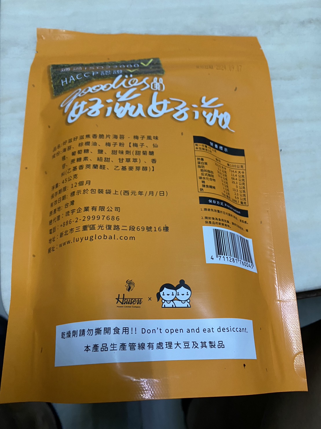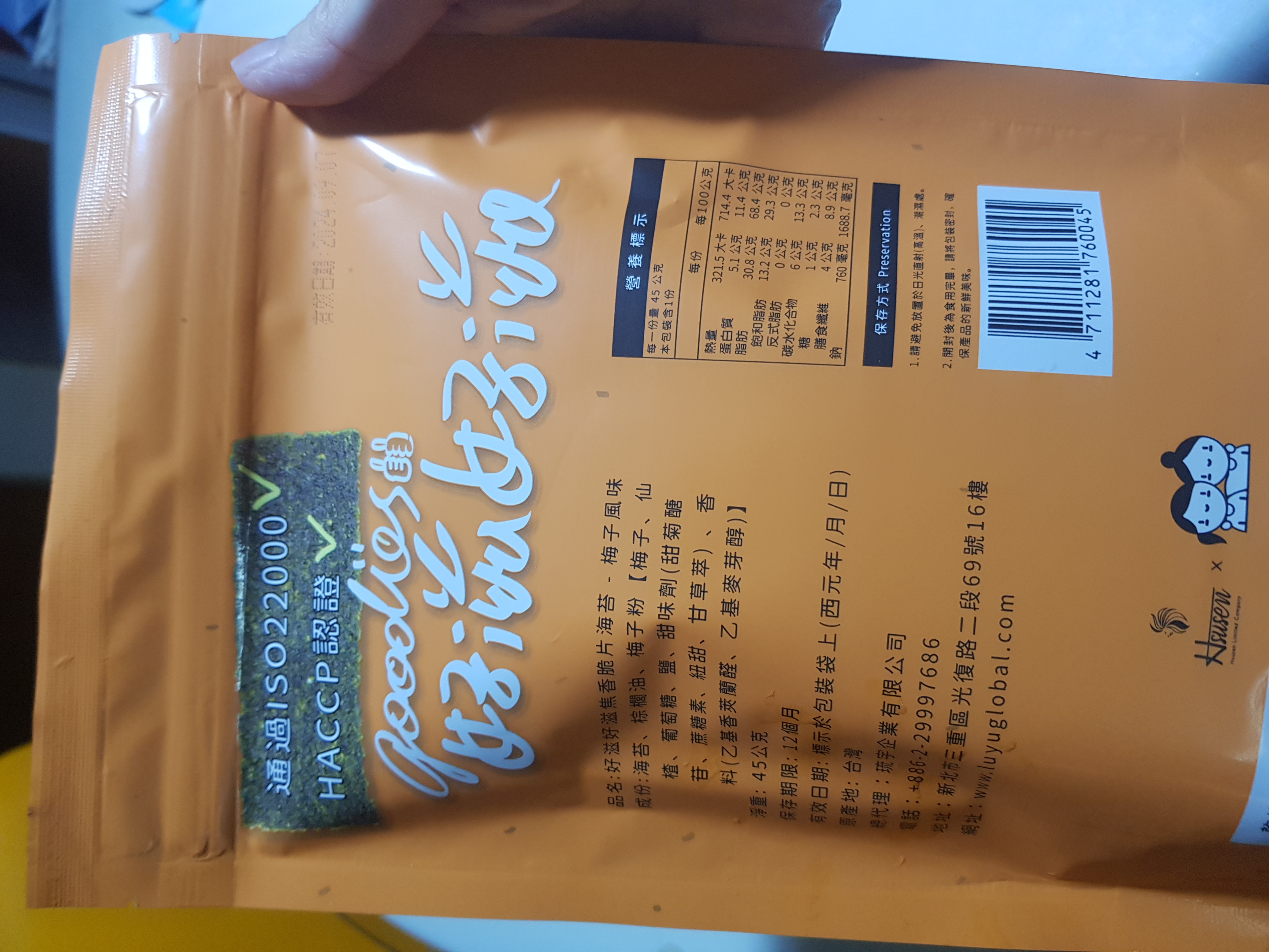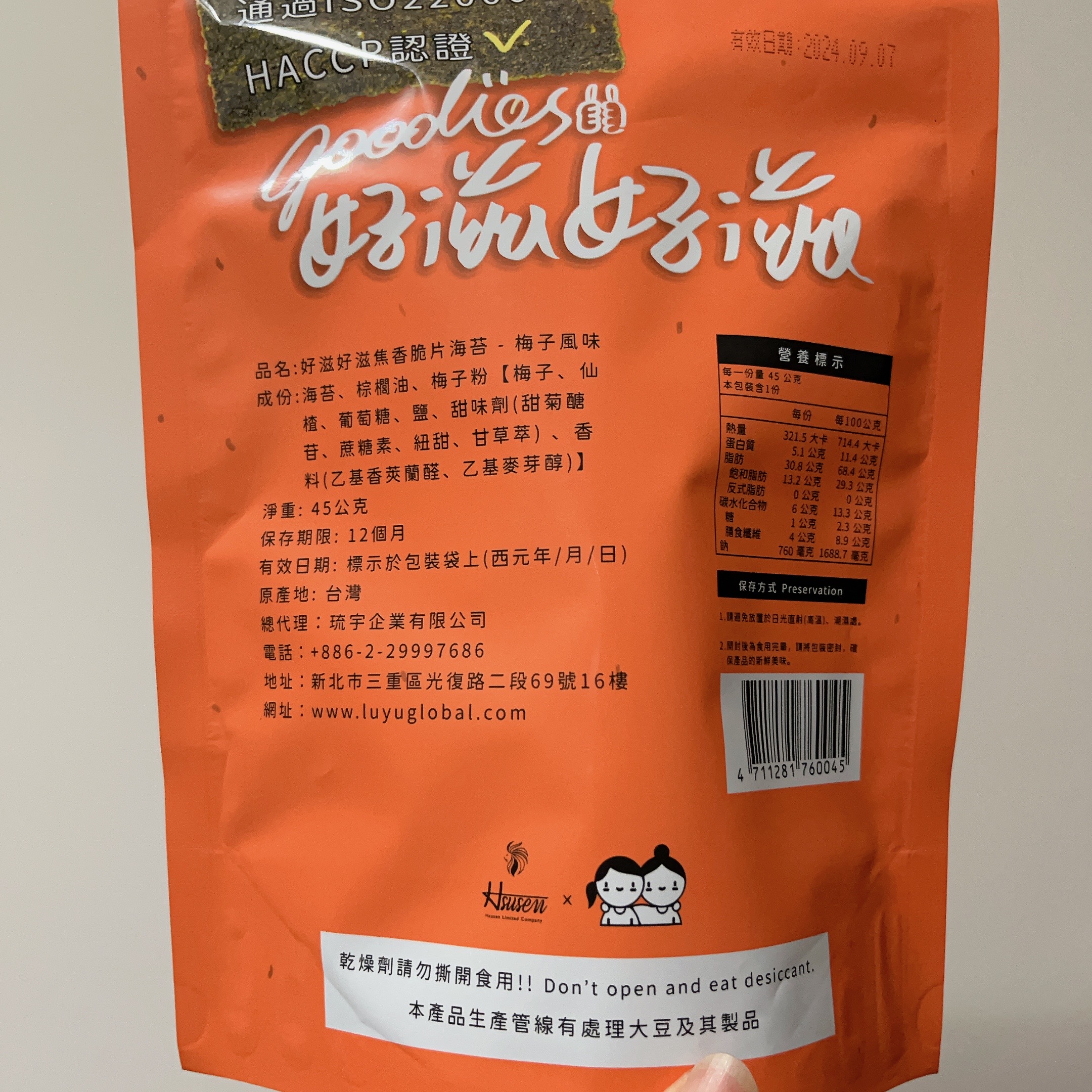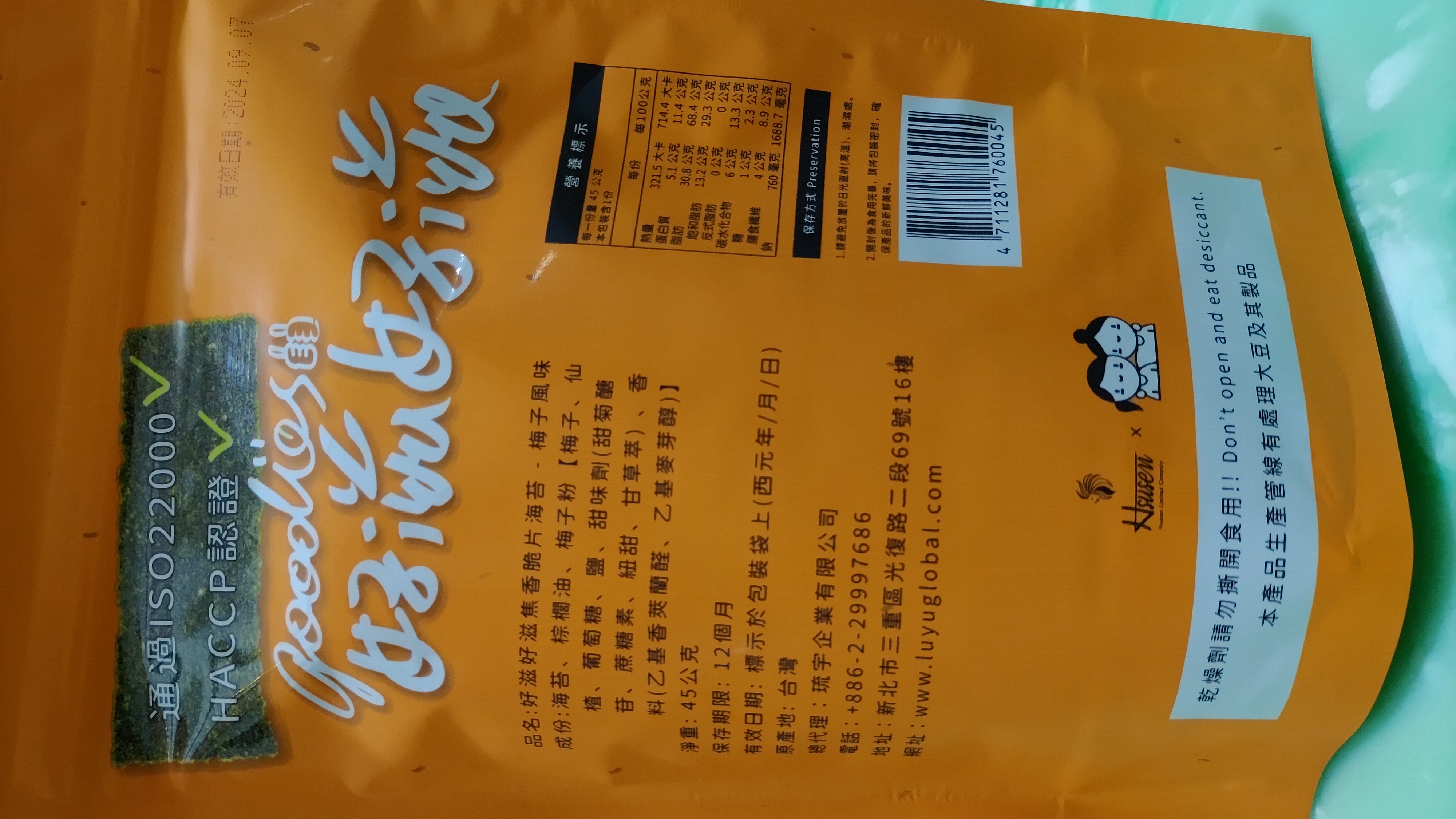 回列表 琉宇醬選 好滋好滋酥脆海苔(梅子口味)梅子甘甜香氣X酥脆口感 解饞小零嘴 市價250元(免費申請) 所需等級 一般會員以上 所需學分 70 體驗份數 15 關注人數 1651 申請人數 295 申請截止 品牌業者:琉宇醬選 負責廠商 琉宇企業有限公司 廠商地址 新北市新莊區思源路453巷2號 產地 台灣 試用產品規格 45g/包 食品業者登錄字號 F-183379492-00000-8 投保產品責任險字號 和泰產險 60-111-10792457-00001-PDL 心得分享 商品介紹 商品成分 使用方法 注意事項 體驗名單 9.0 琉宇醬選 好滋好滋酥脆海苔(梅子口味) 梅子香氣 9.0 酥脆程度 9.0 順口唰嘴 9.0 包裝美學 8.8 建議推薦 8.8 心得分享 13則 吳文嫻 金食達人 35歲 臺北市 2023/10/22 對琉宇醬選 好滋好滋酥脆海苔(梅子口味)留下評價 10 琉宇醬選 好滋好滋酥脆海苔醒目的橘色外包裝採夾鏈袋設計,方便取食與確保海苔不易受潮 ; 好滋好滋酥脆海苔(梅子口味)有別於一般傳統海苔,結合台灣在地食材,採用低溫烘烤,呈現海苔最真實的天然味,咬起來咔滋咔滋,酥脆海苔與酸甜梅子結合的鹹甜口感令人難以想像的完美搭配,吃在口中融合的恰恰好,酥脆爽口讓人一口接一口停不下來,最棒的是它是純素,素食者也可以吃喔~ Shih 金食達人 30歲 新北市 2023/10/22 對琉宇醬選 好滋好滋酥脆海苔(梅子口味)留下評價 10 本身沒有很喜歡吃海苔,但這次的產品非常驚豔!包裝是夾鏈袋的方式,私心覺得可以改成盒裝,因為有點容易壓碎就不方便吃了@@海苔酥脆度很夠,平面的海苔可以達到吃海苔空心捲的脆度,上面的調味粉酸甜酸甜非常涮嘴,且不會容易掉粉,海苔做成長片狀,很適合做海苔日式小飯團。 APPLE 金食達人 39歲 高雄市 2023/10/24 對琉宇醬選 好滋好滋酥脆海苔(梅子口味)留下評價 9 這次體驗琉宇醬選的(好滋好滋酥脆海苔-梅子口味)這種解饞小零嘴,超適合外出旅遊帶在車上吃!!包裝袋是有夾鏈袋設計的~不管是在家裡、辦公室,還是外出攜帶都很方便,吃多少拿多少!!我覺得海苔與梅子結合的口味,滿特別的~梅子的口味好像比較重一點,有點偏甜,容易搶過海苔味但整體上是好吃的,酥酥脆脆的~很唰嘴一趟旅行才剛出門就快要吃完了~這真的很適合當出遊的小零嘴呢! Joe Ho 金食達人 46歲 苗栗縣 2023/10/24 對琉宇醬選 好滋好滋酥脆海苔(梅子口味)留下評價 10 感謝食力給予機會試吃琉宇醬選好滋好滋酥脆海苔(梅子口味)。之前在其他團購平台有看到很多人再團購,但一直沒機會購買,這次能獲得試吃機會真的非常期待。他與市面上的海苔不同,有著酥脆口感但又不油膩,經過烘烤後的海苔不僅保留了海苔的香氣,更產生了撲鼻的焦香味。梅子口味非常好吃,鹹鹹甜甜的讓人一口接一口,而每一口海苔都可以感受到濃烈的梅子香,梅粉分佈的非常均勻。此產品也是全素的,可以提供素食者食用。不過他的熱量與含鈉量有點高,一日不可食用過量。 洪金蘭 金食達人 56歲 新北市 2023/10/24 對琉宇醬選 好滋好滋酥脆海苔(梅子口味)留下評價 10 真的很感謝食力平台,讓我試吃「好滋好滋焦香脆片海苔」!首先從包裝上來說,橘色底加上可愛人物圖像,凸顯封面兩片海苔,簡單搶眼又有趣味。尤其一次性包裝讓我很喜歡,覺得不重複很環保。然後含一口海苔在口中,梅香味融合海苔味撲鼻而來,一咬下去卡滋卡滋的聲音,讓我好驚豔ー海苔竟然可以做得如此酥脆,剛剛好的厚度又覺得很紮實;吃著梅子風味的海苔,一片接一片,原來光吃海苔也是一件很幸福的事~午餐時運用昨晚的剩飯加熱再放涼,然後將白飯鋪在海苔上,再放上海苔,如此一層海苔一層白飯,堆疊三層像是海苔白飯夾心,吃進嘴裡,白飯包裹著海苔又迸發出淡甜的飯香,實在好吃極了~ 游茵茵 金食達人 41歲 桃園市 2023/10/25 對琉宇醬選 好滋好滋酥脆海苔(梅子口味)留下評價 9 習慣在飯後看電視之餘飯來片海苔,解解饞,不會像洋芋片那麼上火,也不會像糕點類那麼油膩有負擔,而且酸酸的海苔是很清爽的,琉宇醬選好滋好滋酥脆海苔(梅子口味)的梅子甘甜香氣非常香甜可口,搭配上酥脆的口感,每片吃進去都齒頰留香,欲罷不能,一片接著一片,而且吃到後面還有會股仙楂的甜味回甘,同事們都覺得非常好吃,真是適合解饞的小零嘴,會想再回購。 吃貨仔均 金食達人 29歲 桃園市 2023/10/20 對琉宇醬選 好滋好滋酥脆海苔(梅子口味)留下評價 8 非常酥脆,梅子的香氣跟口味不算太明顯,可是甘味(甜味)劑的味蕾感蠻明顯的。夾鏈袋包裝很方便,裡面的填充程度也很有誠意,沒有用塑膠片之類的增加空間,梅子的酸其實不太明顯,如果愛酸的人可能會小小失望,但整體還是挺酥脆涮嘴的,感覺很適合下酒零食XD Carly Yang 鑽石達人 43歲 臺南市 2023/10/21 對琉宇醬選 好滋好滋酥脆海苔(梅子口味)留下評價 8 很榮幸能被抽選為「琉宇醬選 好滋好滋酥脆海苔(梅子口味)」的體驗者。包裝很可愛,打開包裝後,覺得誠意滿滿,份量足夠;風味、口感和市面上(厚切、酥爆)海苔的口感有所不同,厚度比較像沒有麻油的朝鮮海苔偏軟、薄,但是,除了鹹香還有特別突出的的梅子香,就是這樣好吃又有記憶點。最後也要非常感謝琉宇企業有限公司和食力團隊,努力的挖堀健康好吃的美食。 蔡欣妤 鑽石達人 32歲 臺南市 2023/10/22 對琉宇醬選 好滋好滋酥脆海苔(梅子口味)留下評價 7 梅子口味的海苔,令人超期待!此款採夾鏈袋包裝,可以較好地保存海苔風味,方