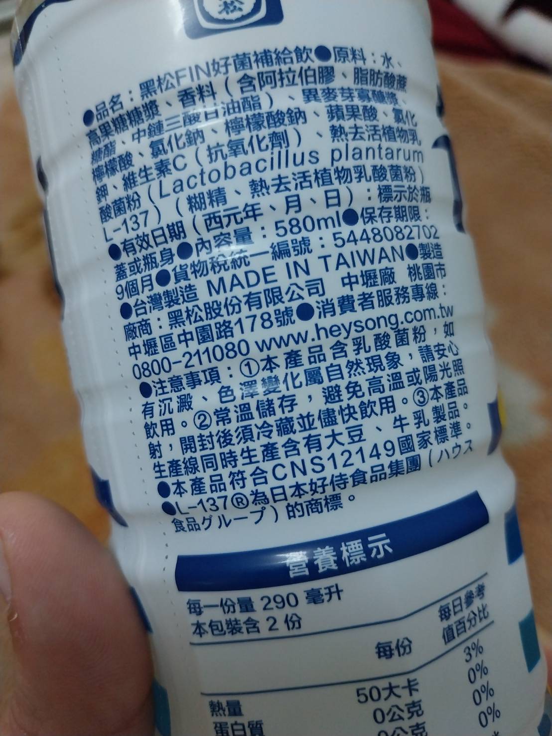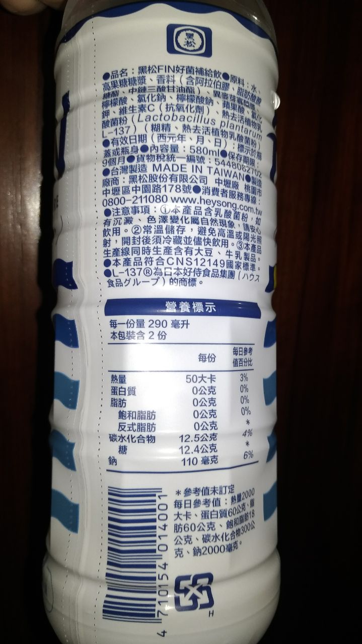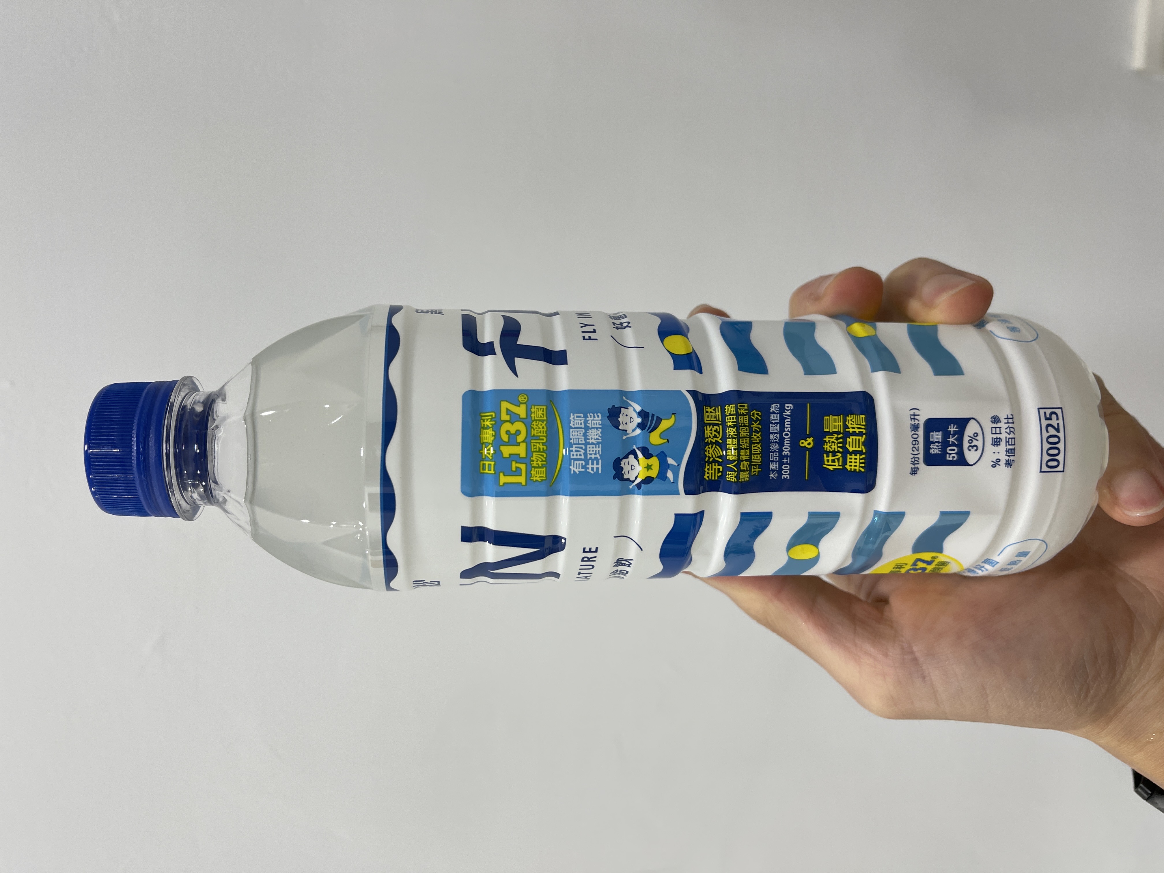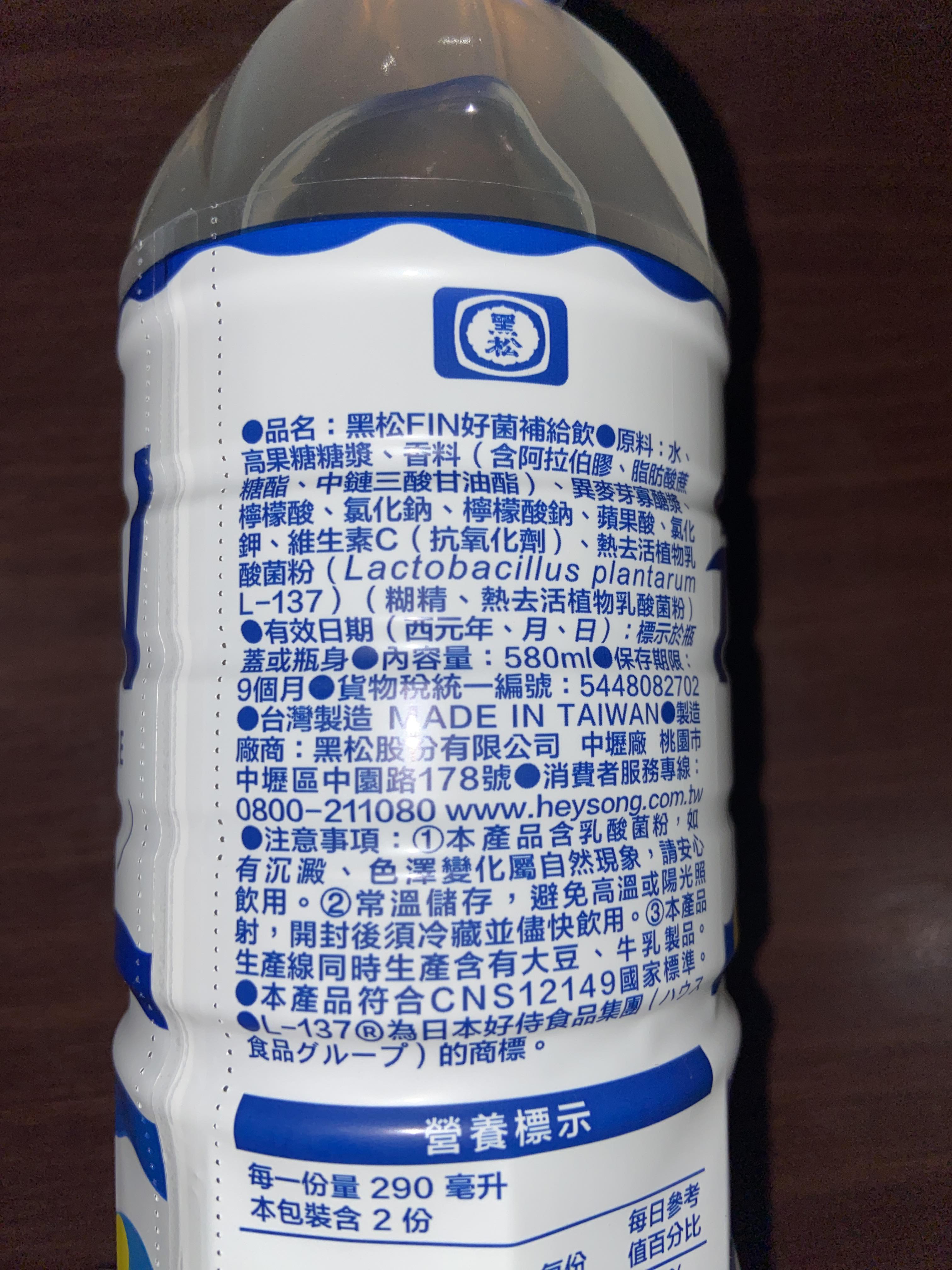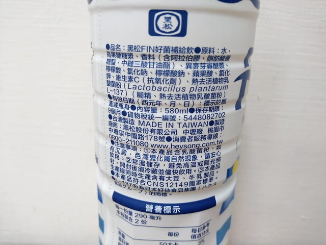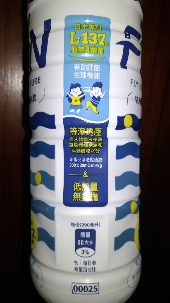 水、高果糖糖漿、香料(含阿拉伯膠、脂肪酸蔗糖酯、中鏈三酸甘油酯)、異麥芽寡醣漿、檸檬酸、氯化鈉、檸檬酸鈉、DL-蘋果酸、氯化鉀、維生素C (抗氧化劑)、熱去活植物乳酸菌粉(Lactobacillus plantarum L-137)(糊精、熱去活植物乳酸菌粉)