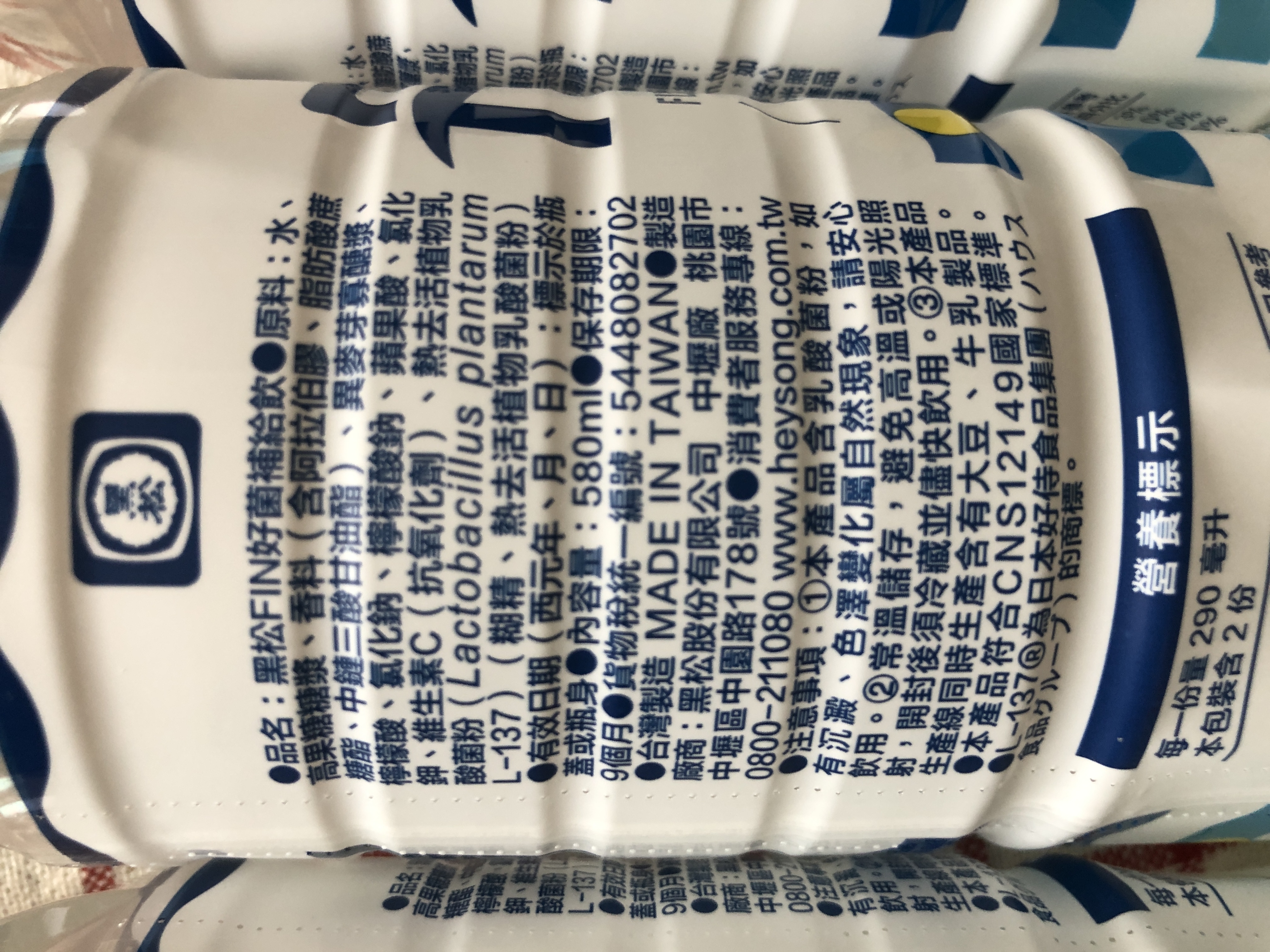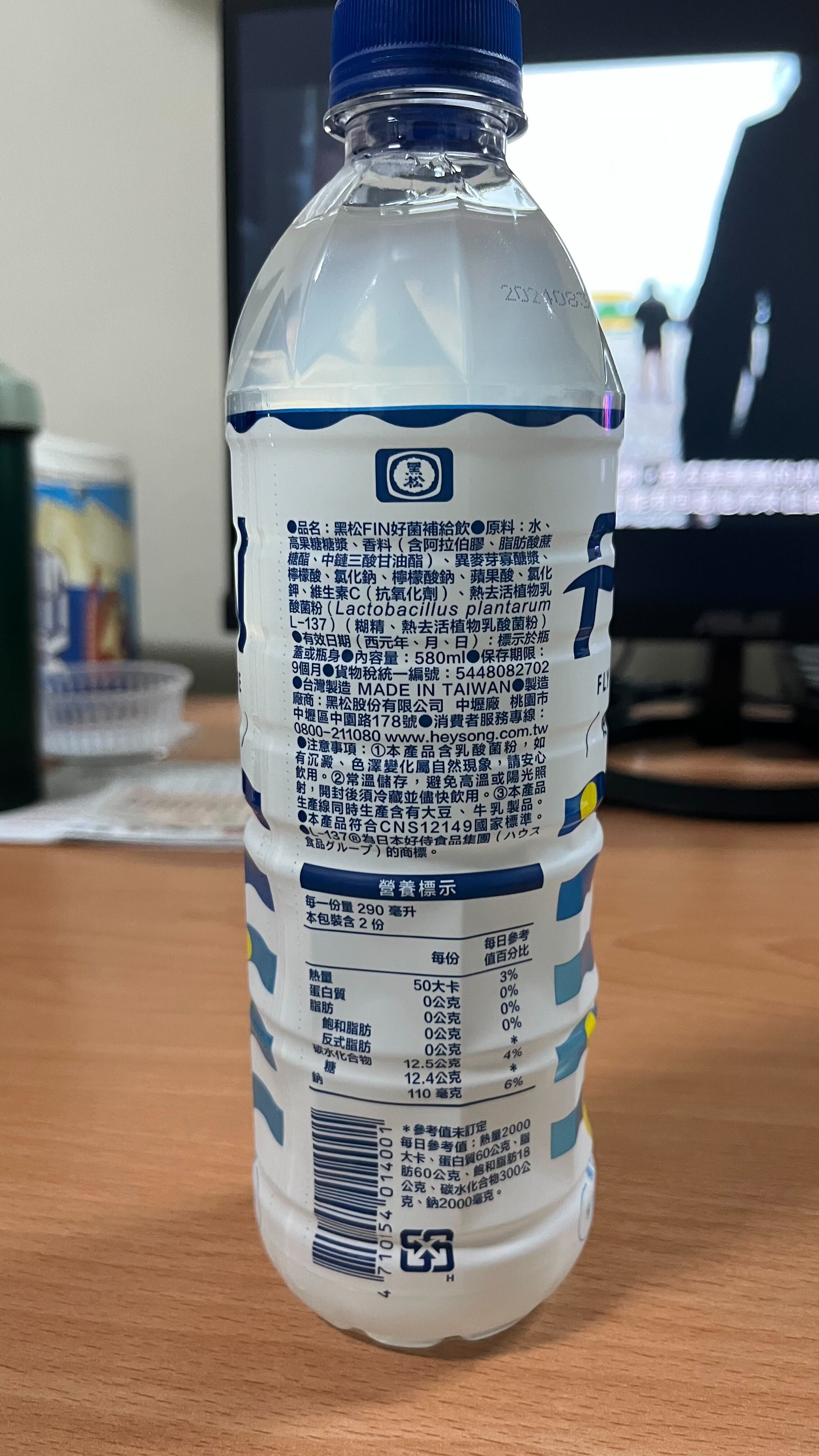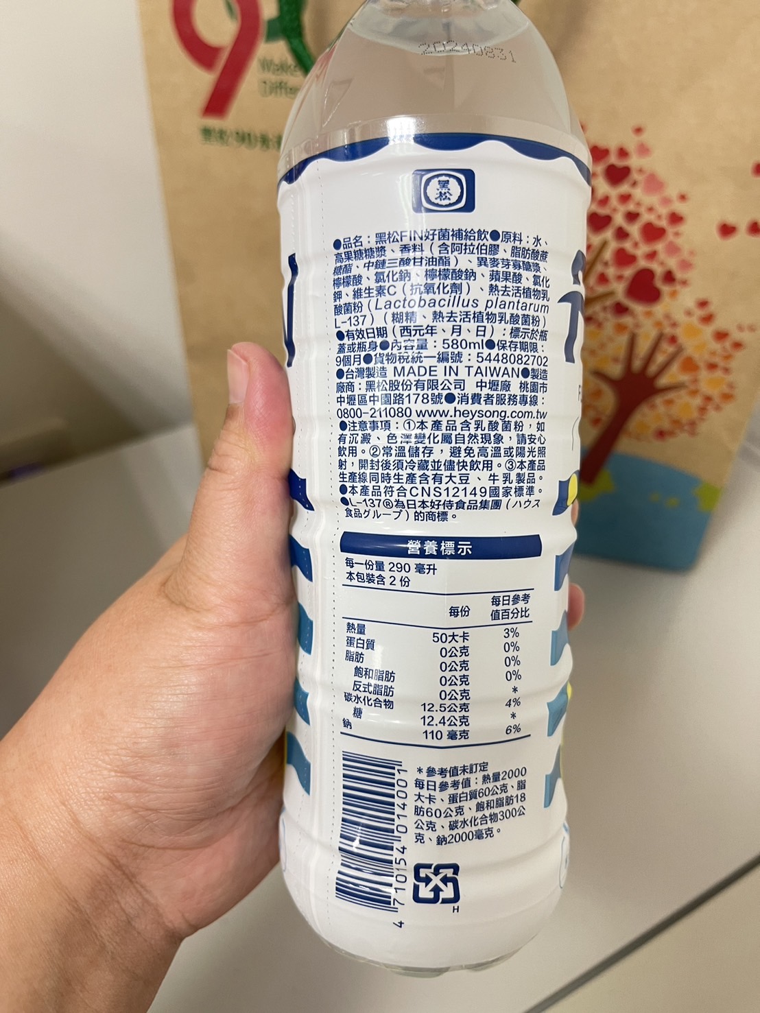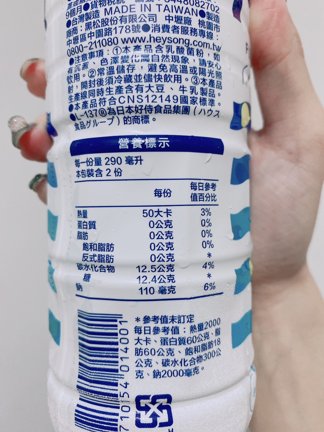 水、高果糖糖漿、香料(含阿拉伯膠、脂肪酸蔗糖酯、中鏈三酸甘油酯)、異麥芽寡醣漿、檸檬酸、氯化鈉、檸檬酸鈉、DL-蘋果酸、氯化鉀、維生素C (抗氧化劑)、熱去活植物乳酸菌粉(Lactobacillus plantarum L-137)(糊精、熱去活植物乳酸菌粉)