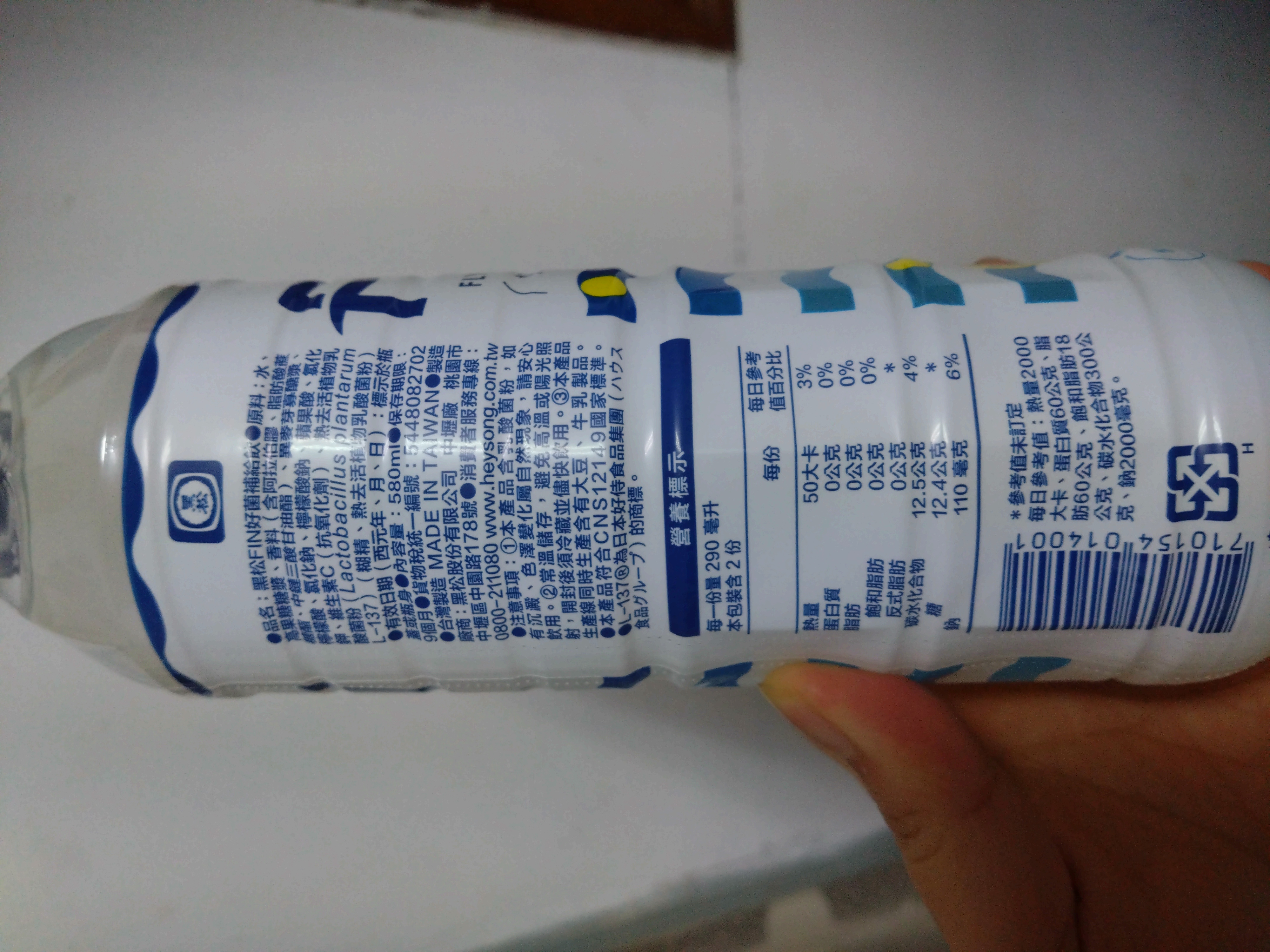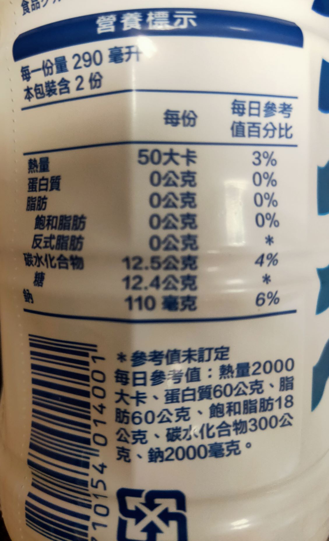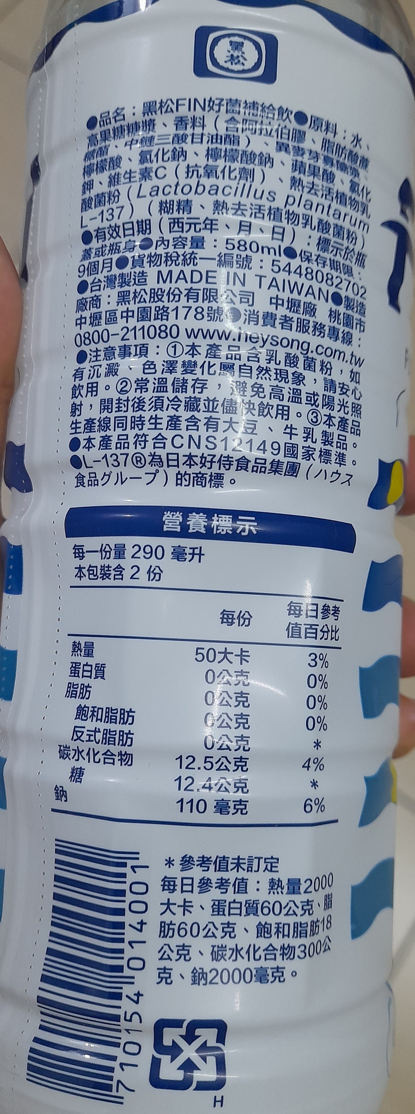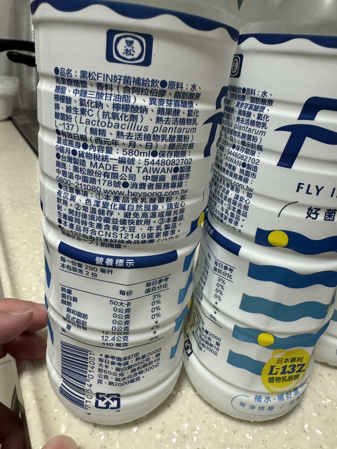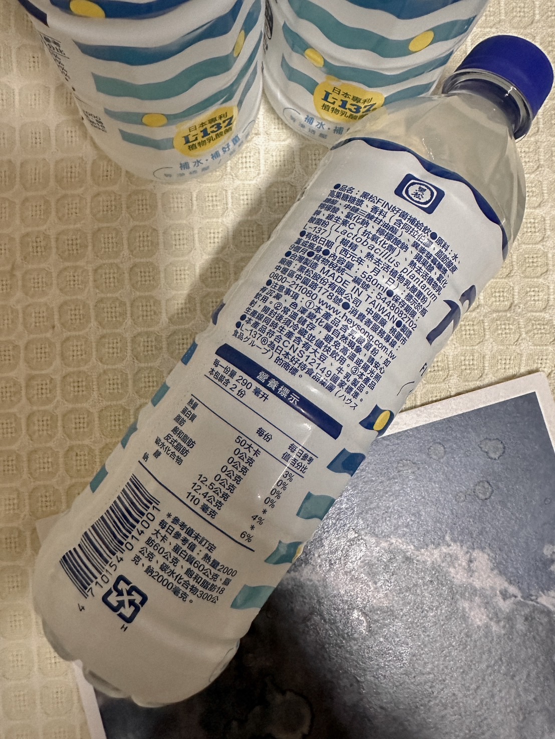 水、高果糖糖漿、香料(含阿拉伯膠、脂肪酸蔗糖酯、中鏈三酸甘油酯)、異麥芽寡醣漿、檸檬酸、氯化鈉、檸檬酸鈉、DL-蘋果酸、氯化鉀、維生素C (抗氧化劑)、熱去活植物乳酸菌粉(Lactobacillus plantarum L-137)(糊精、熱去活植物乳酸菌粉)