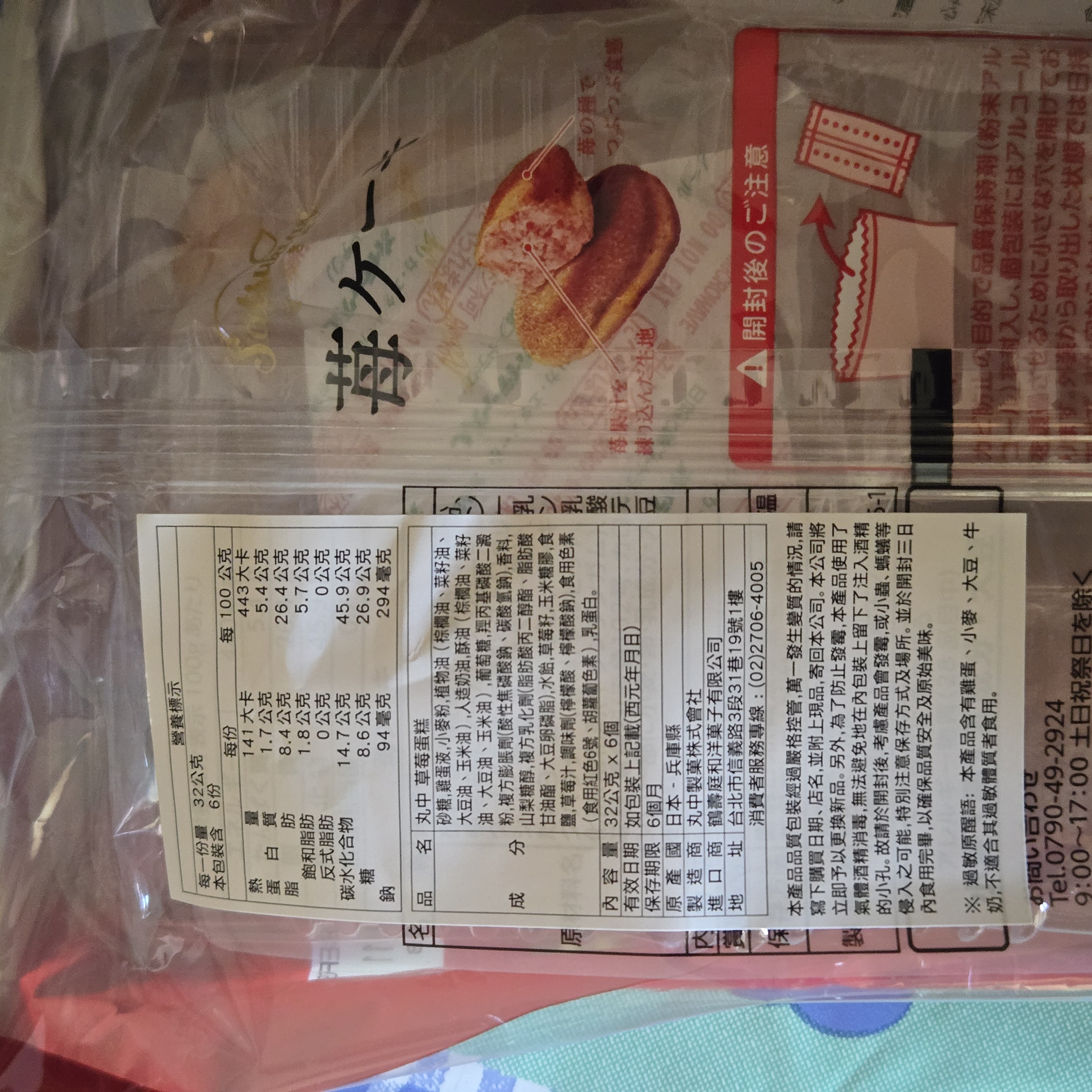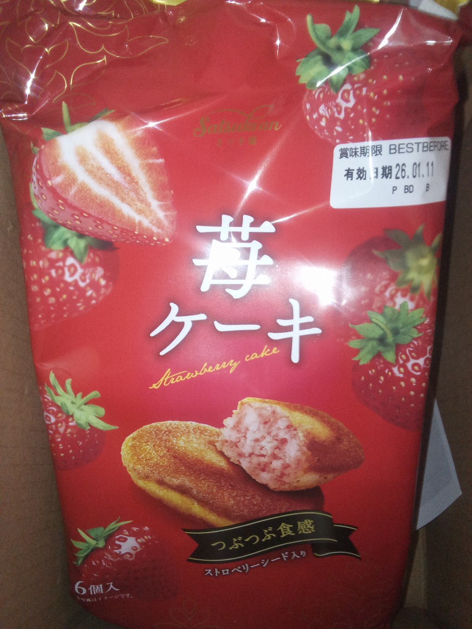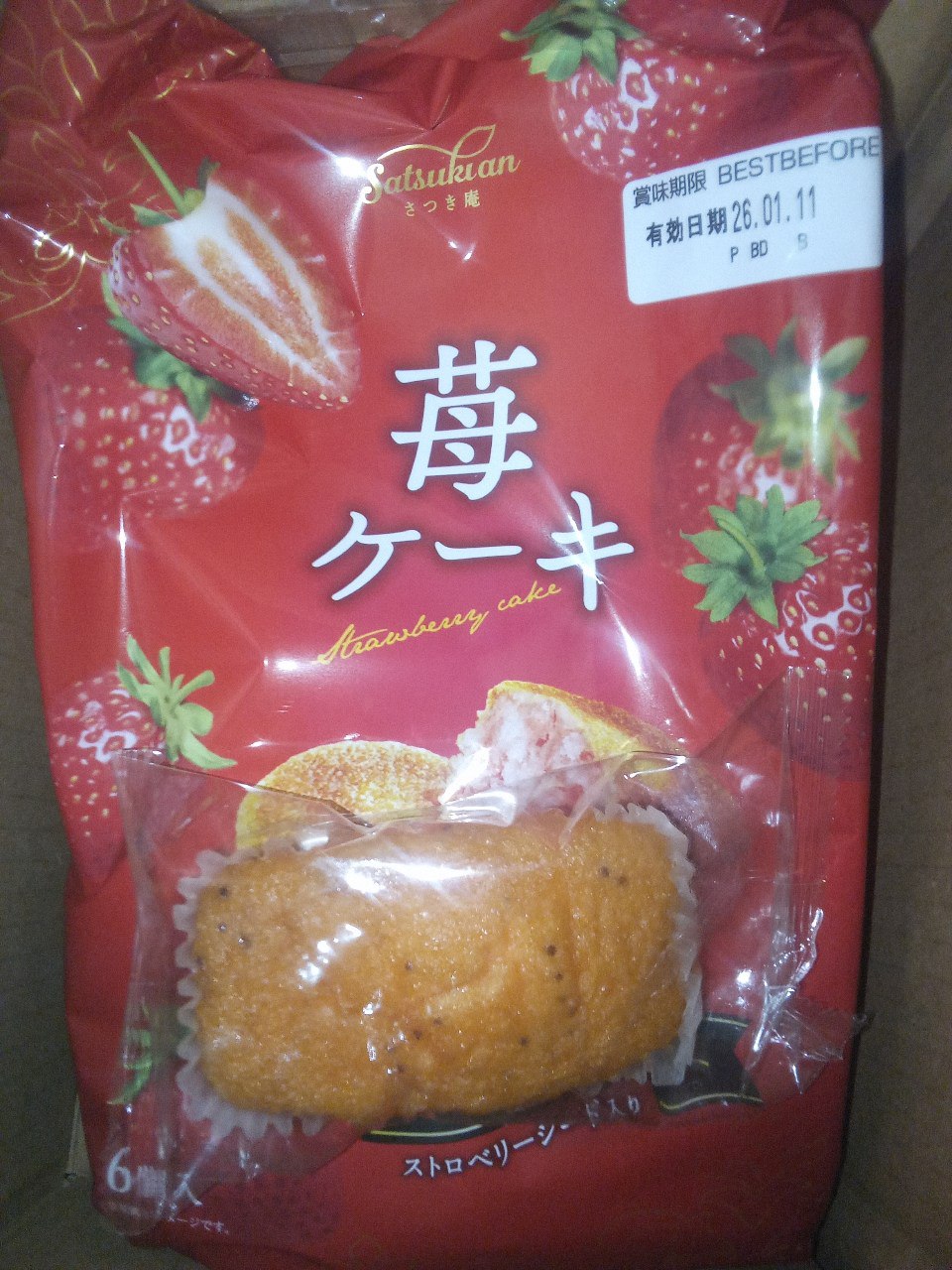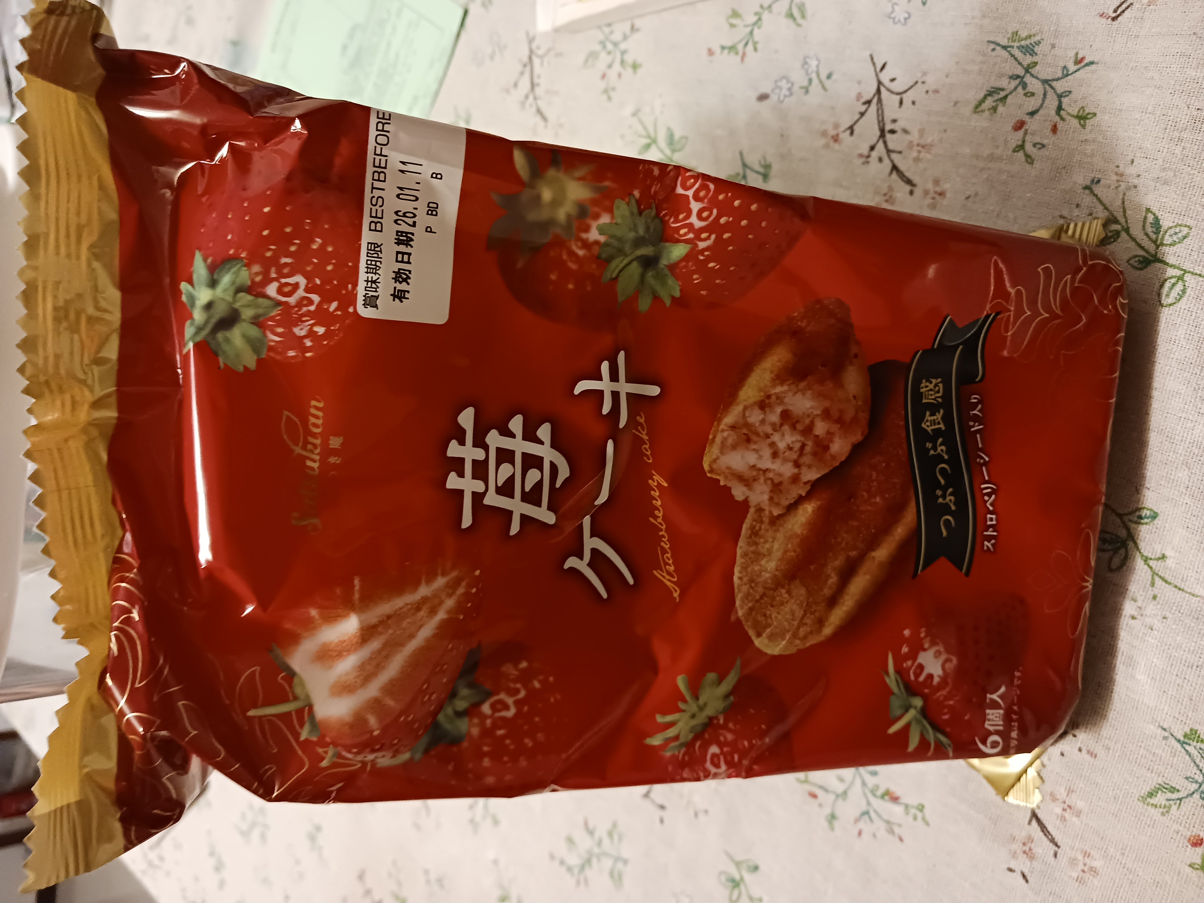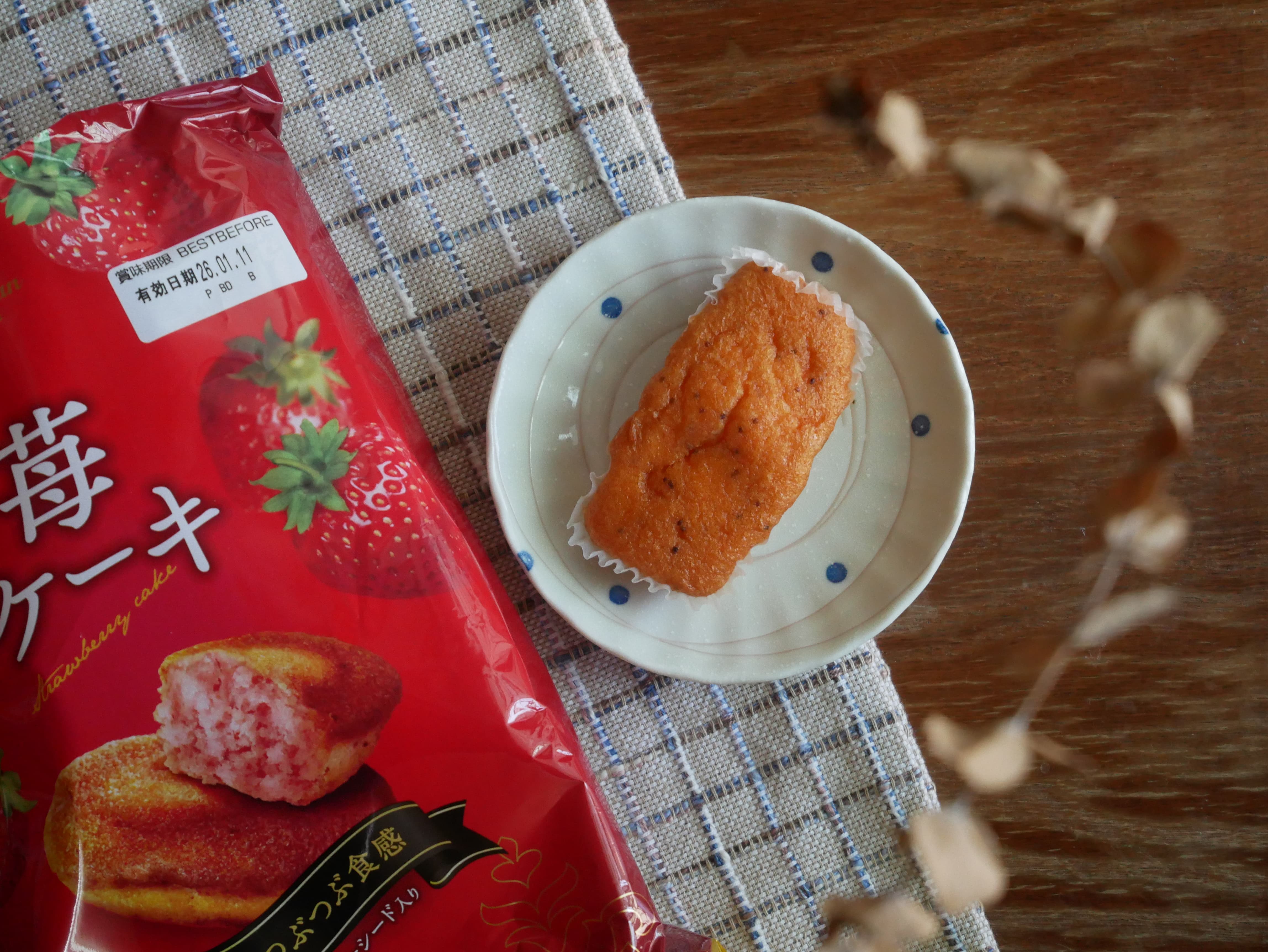 砂糖,雞蛋液,小麥粉,植物油(棕櫚油、菜籽油、大豆油、玉米油),人造奶油,酥油(棕櫚油、菜籽油、大豆油、玉米油),葡萄糖,羥丙基磷酸二澱粉,複方膨脹劑(酸性焦磷酸鈉、碳酸氫鈉),香料,山梨糖醇,複方乳化劑(脂肪酸丙二醇酯、脂肪酸甘油酯、大豆卵磷脂),水飴,草莓籽,玉米糖膠,食鹽,草莓汁,調味劑(檸檬酸、檸檬酸鈉),食用色素(食用紅色6號、胡蘿蔔色素),乳蛋白。