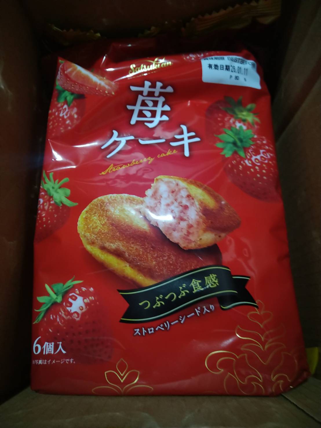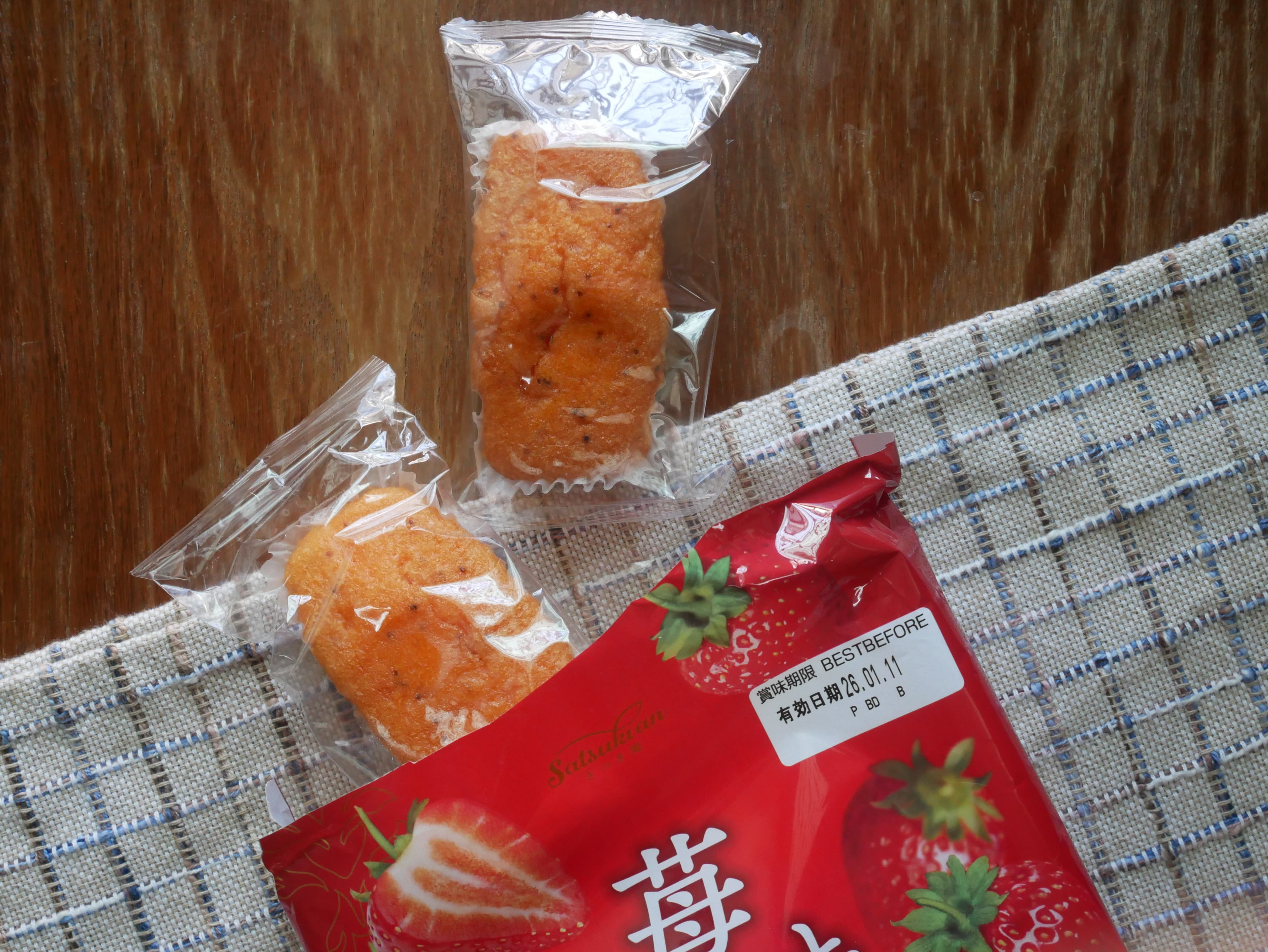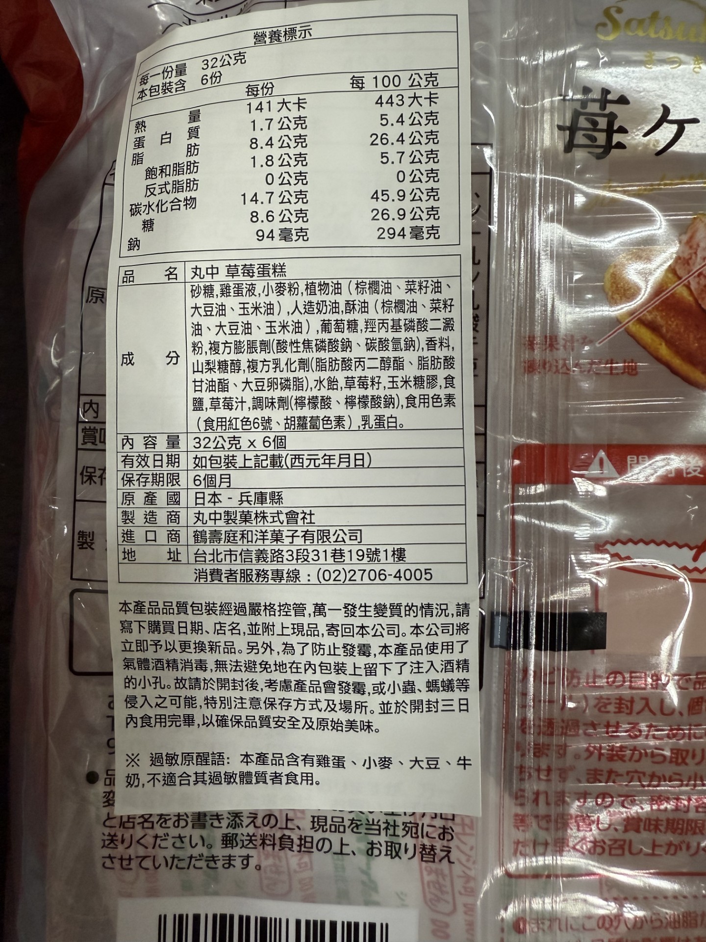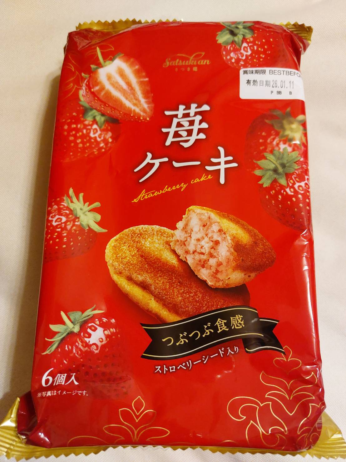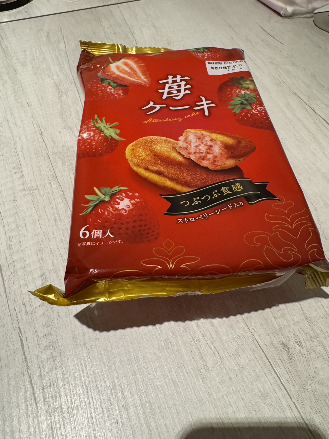砂糖,雞蛋液,小麥粉,植物油(棕櫚油、菜籽油、大豆油、玉米油),人造奶油,酥油(棕櫚油、菜籽油、大豆油、玉米油),葡萄糖,羥丙基磷酸二澱粉,複方膨脹劑(酸性焦磷酸鈉、碳酸氫鈉),香料,山梨糖醇,複方乳化劑(脂肪酸丙二醇酯、脂肪酸甘油酯、大豆卵磷脂),水飴,草莓籽,玉米糖膠,食鹽,草莓汁,調味劑(檸檬酸、檸檬酸鈉),食用色素(食用紅色6號、胡蘿蔔色素),乳蛋白。
