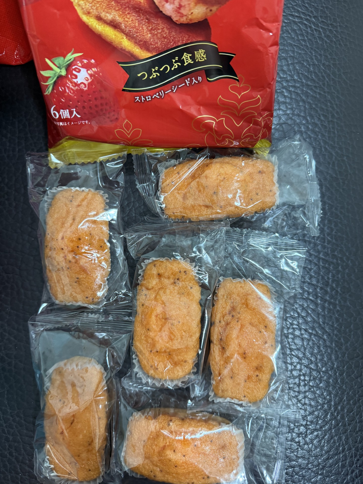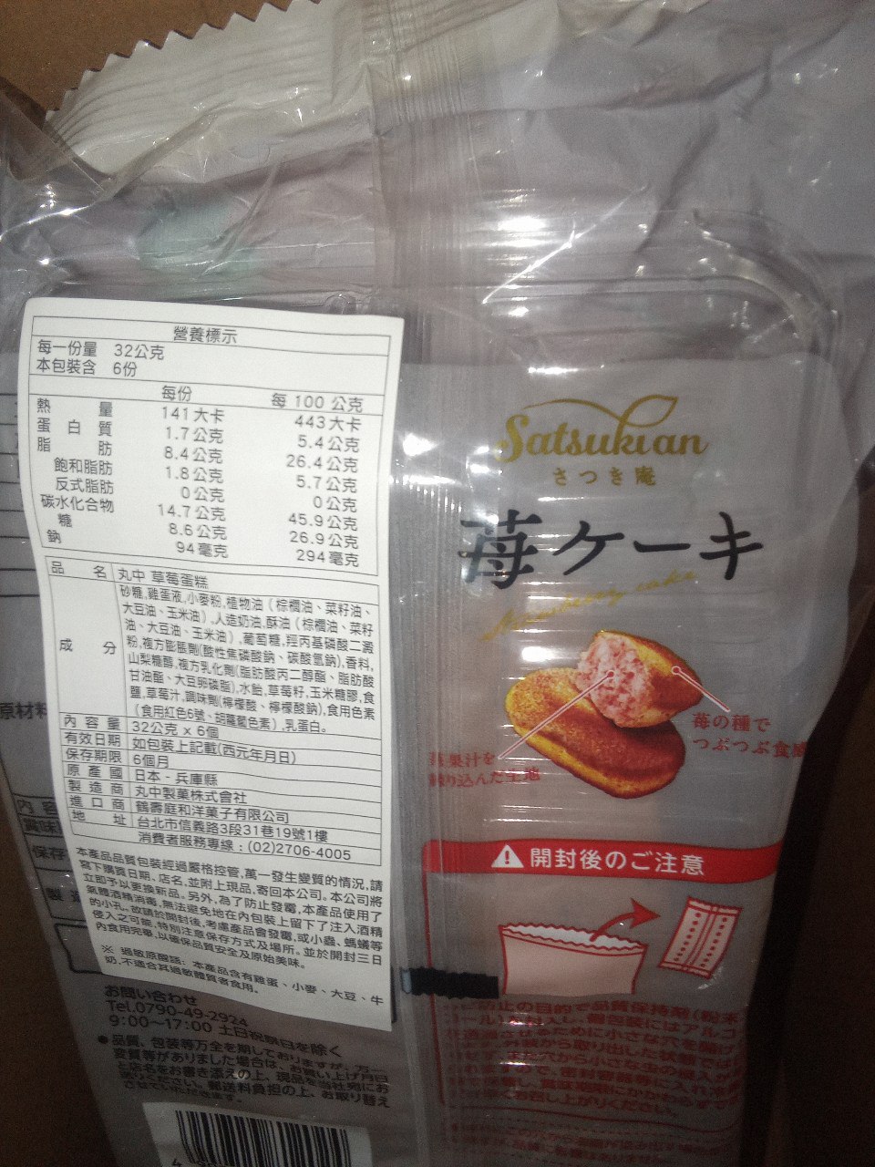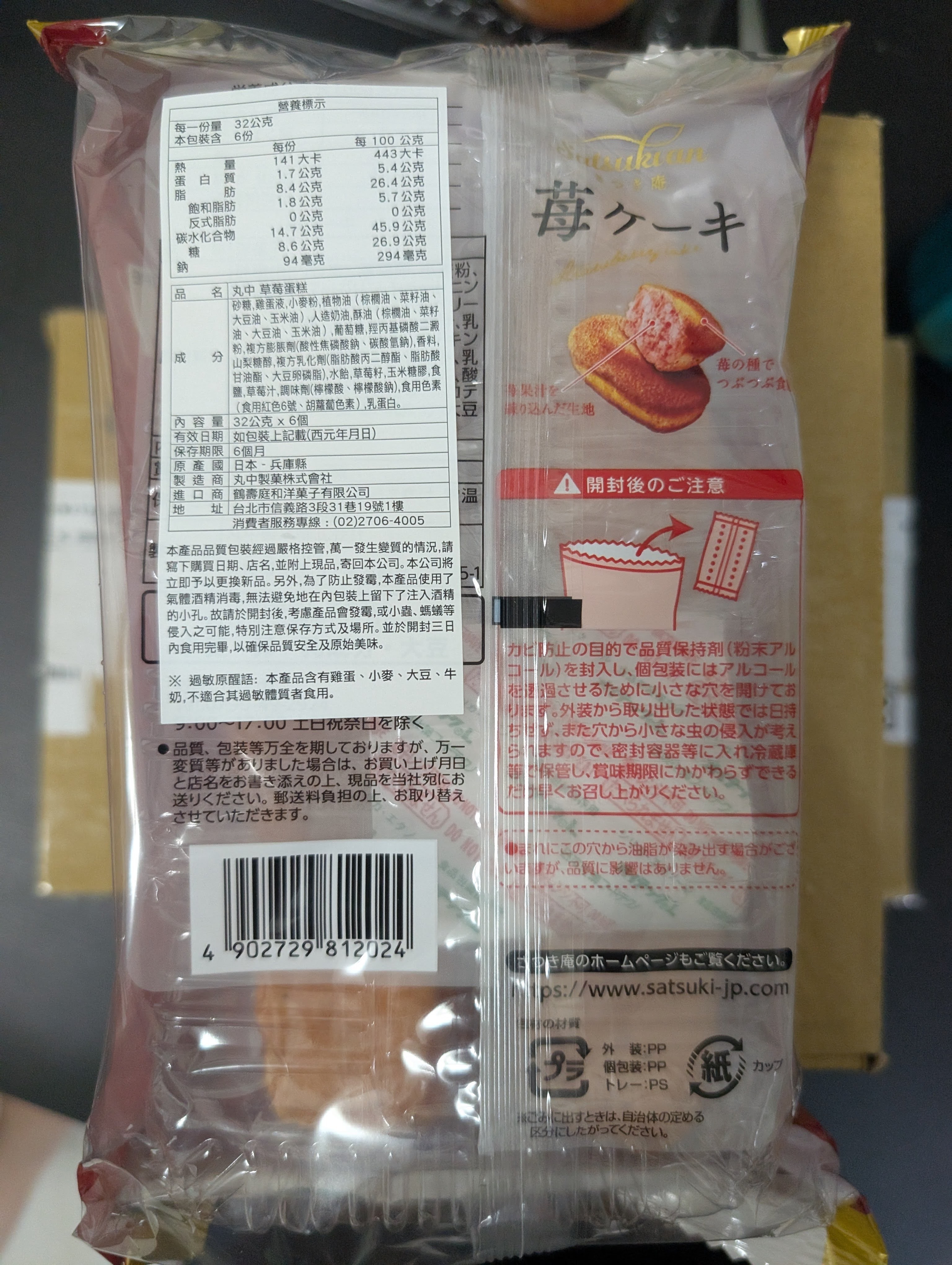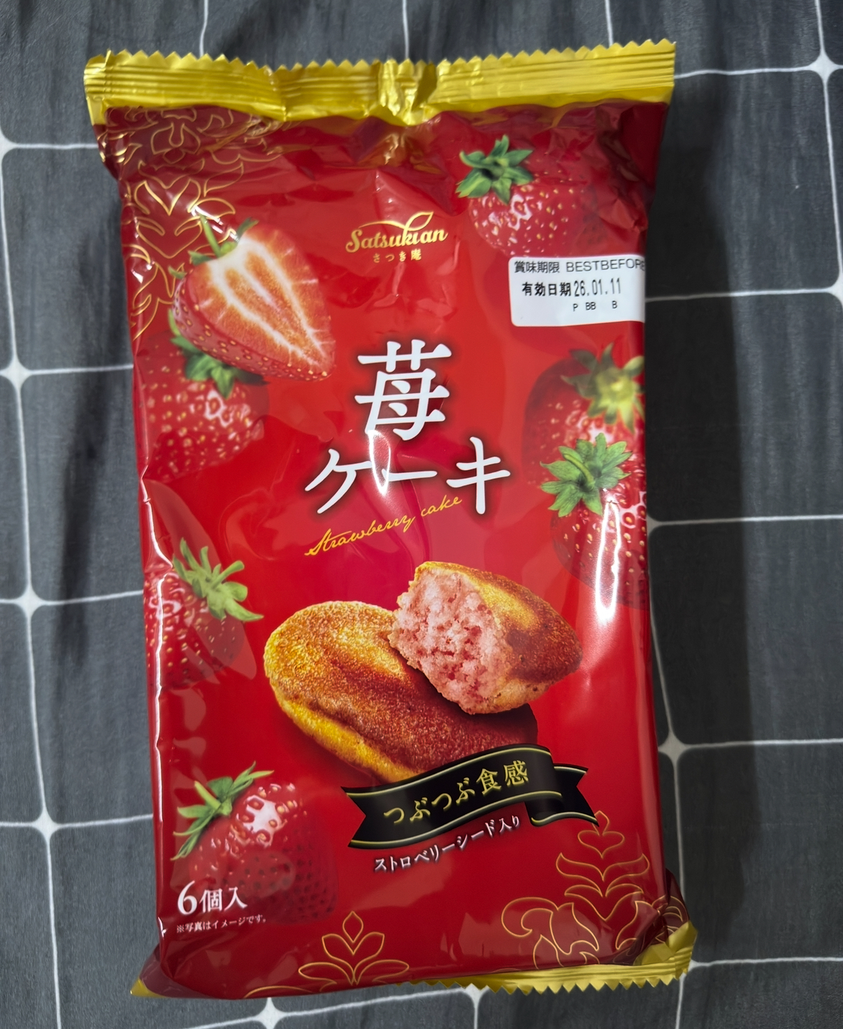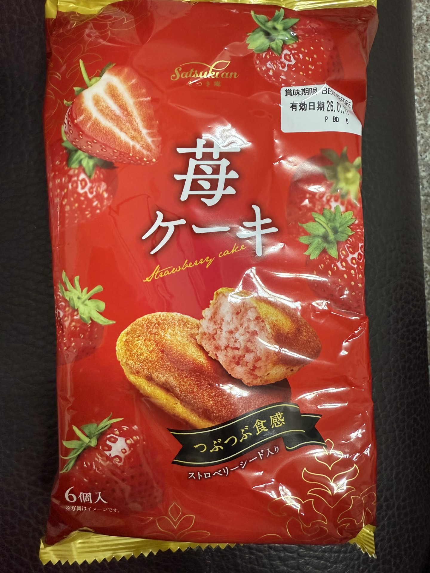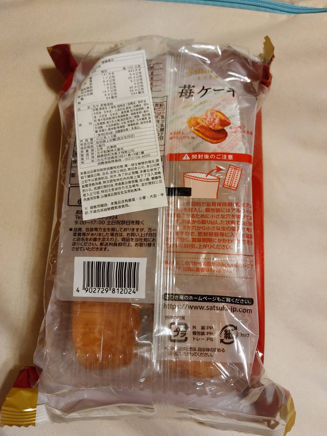 砂糖,雞蛋液,小麥粉,植物油(棕櫚油、菜籽油、大豆油、玉米油),人造奶油,酥油(棕櫚油、菜籽油、大豆油、玉米油),葡萄糖,羥丙基磷酸二澱粉,複方膨脹劑(酸性焦磷酸鈉、碳酸氫鈉),香料,山梨糖醇,複方乳化劑(脂肪酸丙二醇酯、脂肪酸甘油酯、大豆卵磷脂),水飴,草莓籽,玉米糖膠,食鹽,草莓汁,調味劑(檸檬酸、檸檬酸鈉),食用色素(食用紅色6號、胡蘿蔔色素),乳蛋白。
