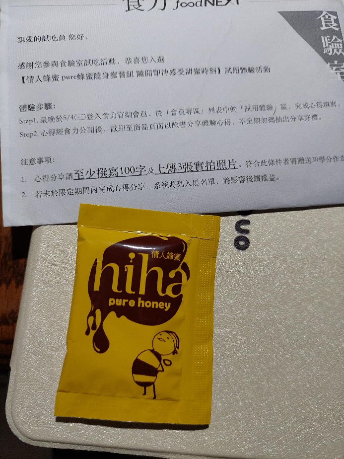 回列表 情人蜂蜜 pure蜂蜜隨身蜜嘗組 隨開即沖感受甜蜜時刻 市價175元 所需等級 一般會員以上 所需學分 60 體驗份數 15 關注人數 1693 申請人數 399 申請截止 品牌業者:情人蜂蜜股份有限公司 負責廠商 情人蜂蜜股份有限公司 廠商地址 雲林縣土庫鎮建國路86號 產地 泰國 試用產品規格 10g/包,共計10包/盒 食品業者登錄字號 P-116860814-00001-8 投保產品責任險字號 131602AKP0000123 投保新光產物保險公司產品責任險 心得分享 商品介紹 商品成分 使用方法 注意事項 體驗名單 8.7 情人蜂蜜 pure蜂蜜隨身蜜嘗組 包裝美學 9.0 風味香氣 8.6 甜度適中 8.7 使用便利 9.4 建議推薦 8.9 心得分享 14則 謝宛芸 金食達人 42歲 新北市 2022/05/01 對情人蜂蜜 pure蜂蜜隨身蜜嘗組留下評價 9 感謝食力提供這次試用的體驗機會!說到蜂蜜,對於家庭人口數較少且飲料店倍增的現代而言常常是容易放到過期的物品這次體驗的蜂蜜應該就可以解決這個問題每盒10包,每包10克每包剛好就是泡一杯茶所需要的份量也很適合攜帶外出盒子上有註明保存方法,是貼心的說明包裝袋也容易撕開蜂蜜質地正常,沒有過甜或過稀雖然產地是泰國,但是品質一樣好值得想要偶爾喝到蜂蜜,不想要囤一大罐在家的的顧客購買 姚佩汝 金食達人 35歲 臺北市 2022/05/03 對情人蜂蜜 pure蜂蜜隨身蜜嘗組留下評價 10 很喜歡情人蜂蜜Pure蜂蜜隨手包的包裝設計,尤其兩隻蜜蜂的圖案彷彿在說:「哎呀~採了好多蜂蜜呀~(伸懶腰~)」的感覺相當可愛!隨手包裝也很方便,因為每次蜂蜜都只用一點點,常常一罐蜂蜜用很久,結果瓶口瓶身都黏黏的很討厭,最後都會沒用完就扔了,小包裝完全解決了這個困擾。而且還能隨身攜帶!是來自泰國的蜂蜜,單吃很溫順不會死甜,有吃到很些微的糖粒感,但是入口即化,一包隨手包撕個小口慢慢吸也沒問題。嘗試加入自製優格,超好吃!覺得這是一款不是甜味重而是香氣濃的蜂蜜。 賴雅君 金食達人 41歲 臺中市 2022/05/03 對情人蜂蜜 pure蜂蜜隨身蜜嘗組留下評價 8 包裝簡單清楚,一看就知道是蜂蜜產品。此次食用的是泰國的蜂蜜,包裝輕巧,方便攜帶。一撕開包裝就有蜂蜜的濃烈香氣撲鼻而來,倒入水中搖一搖,有綿密的氣泡浮在上面,蜂蜜水呈現混濁的情形,這是真蜂蜜會有的情形!一入口有淡淡的蜜香,個人覺得不會很甜。隨身包方便攜帶,很適合小資族上班時加入喝的飲品中提味,不錯。 劉貴鈴 金食達人 45歲 新北市 2022/05/04 對情人蜂蜜 pure蜂蜜隨身蜜嘗組留下評價 9 很高興可以體驗「情人蜂蜜 pure蜂蜜隨身蜜嘗組 」包裝簡單簡約,一盒有十小包,真的方便隨身攜帶。是不是很純的蜂蜜,我們打開加入水中攪拌就知道,水比較混濁,放了一會兒,泡沫較細緻綿密、泡泡也久久不散,可見是真的蜜,喝了也安心。另外加在生菜、水果上面也好吃,小包裝真的是很方便使用。 李承駿 金食達人 38歲 新北市 2022/05/03 對情人蜂蜜 pure蜂蜜隨身蜜嘗組留下評價 8 很開心收到蜂蜜隨身包的食用體驗,非常適合隨身攜帶,享受即沖即飲的便利。商品包裝輕巧,木質色調配上蜜蜂插畫,蜂蜜產品顯而易懂。打開外盒,裡頭有10包蜂蜜隨手包,每包10克份量剛好,可以沖泡一杯飲品,或是充當早餐的抹醬。撕開隨手包,將蜂蜜擠進開水,攪拌均勻,即是營養與風味豐富的蜂蜜水,蜂蜜味道清甜不膩,四季皆宜。隨手包不沾手,沒有以往倒蜂蜜罐的不便,也更好保存。除了調配蜂蜜水以外,我將蜂蜜加進冰牛奶,用果汁機做成蜂蜜奶泡,讓口感更有層次,蜂蜜與牛奶的味道也很契合,可以更襯托蜂蜜特有的風味,好喝! 張格格 金食達人 31歲 桃園市 2022/04/28 對情人蜂蜜 pure蜂蜜隨身蜜嘗組留下評價 9 整個包裝很可愛,也很好收納,一開始以為像這種小包裝的蜂蜜,應該會水水的吧?有這種想法,但是先打開一包直接吃,發現沒有耶!吃到的一顆一顆的結晶,很有口感,不像那種超市的蜂蜜,吃起來像糖漿。因為之前麥當勞出了一款蜂蜜紅茶,就想說也可以自己來試試,加進去後發現真的很對味耶~紅茶香加上淡淡的蜂蜜香,一包的量甜度很剛好,瞬間在辦公室也有享受到高級下午茶的感覺~ Yi Yi Chen 金食達人 29歲 臺中市 2022/04/29 對情人蜂蜜 pure蜂蜜隨身蜜嘗組留下評價 10 這種小包裝攜帶超方便,但缺點就是比較不環保,外盒設計青春洋溢做得很吸引人,蜂蜜天然的甜度,一吃就知道,吃完後在嘴巴裡的韻味很好且順口,假蜜吃起來味道會怪怪的,吃完後在嘴巴裡的韻味也會不同,自製優格搭配這款蜂蜜,真是美味極了,吃完很滿足,很推薦這款蜂蜜! 鄧若琳 金食達人 61歲 新北市 2022/04/29 對情人蜂蜜 pure蜂蜜隨身蜜嘗組留下評價 9 這款隨手包蜂蜜的盒子包裝設計簡單大方並標示“pure honey”再搭配幾隻可愛的蜜蜂,就包裝美學來說算是佳作。再就隨手包的顏色搭配也算是得宜的設計。另就風味香氣部份由於產地是泰國,我覺得香氣不如臺灣蜂蜜濃郁,不過甜味算是適中,搭配茶,優格等等都很方便。 Jerry 金食達人 56歲 嘉義市 2022/04/30 對情人蜂蜜 pure蜂蜜隨身蜜嘗組留下評價 9 這款【情人蜂蜜 Pure頂級蜂蜜隨身密嘗組】,真的很甜蜜。之前買的蜂蜜大多是罐裝的,這種隨身包是第一次嘗試,很方便,撕開倒入就可以吃喝了。我把它加入無糖的優格中,增加了甜度也增加更多的層次感,個人是覺得這組蜂蜜算蠻甜的;打果汁時加入兩包蜂蜜隨身包,嘗起來感覺很不錯,喝到後面嘴巴還會留