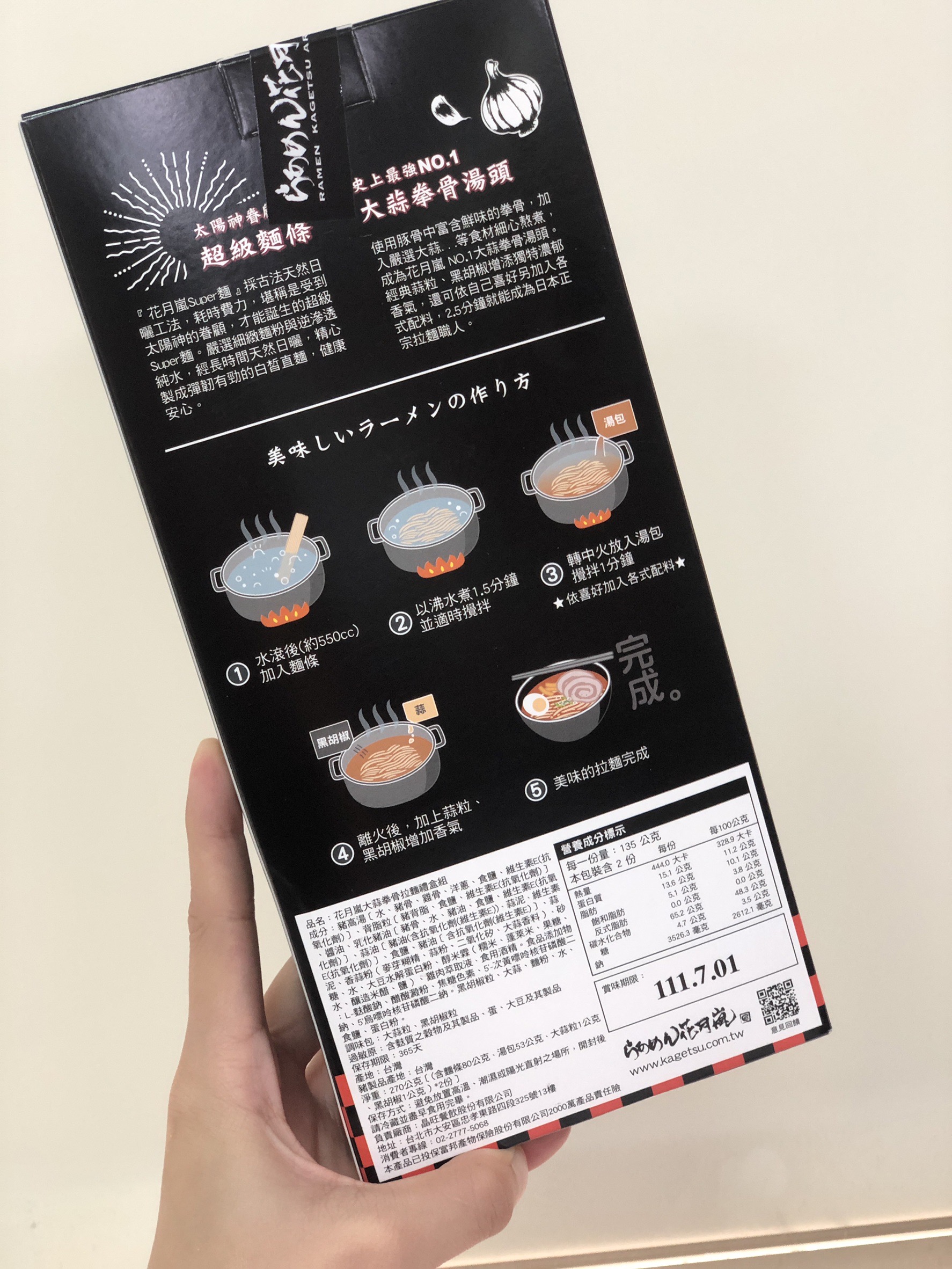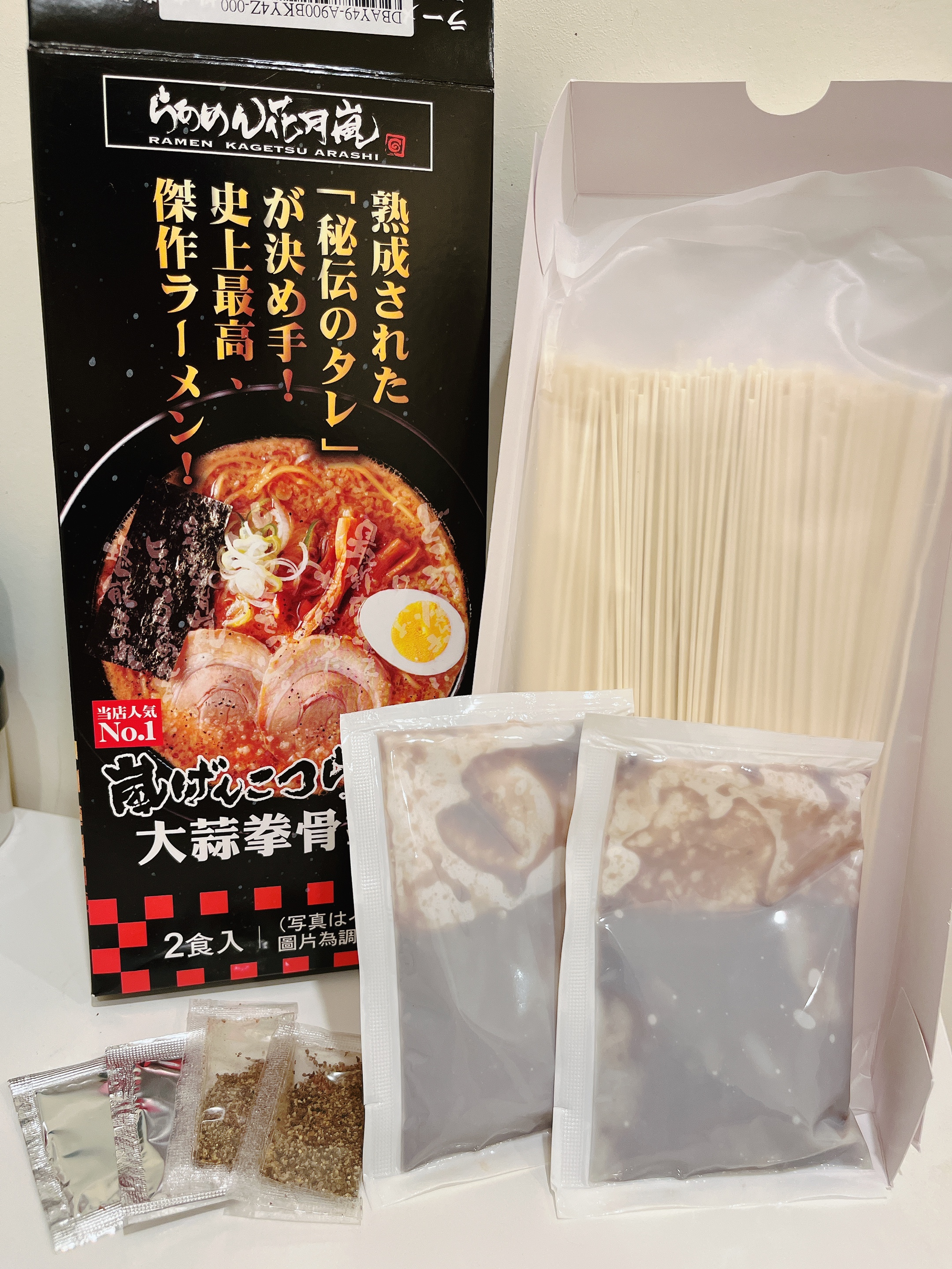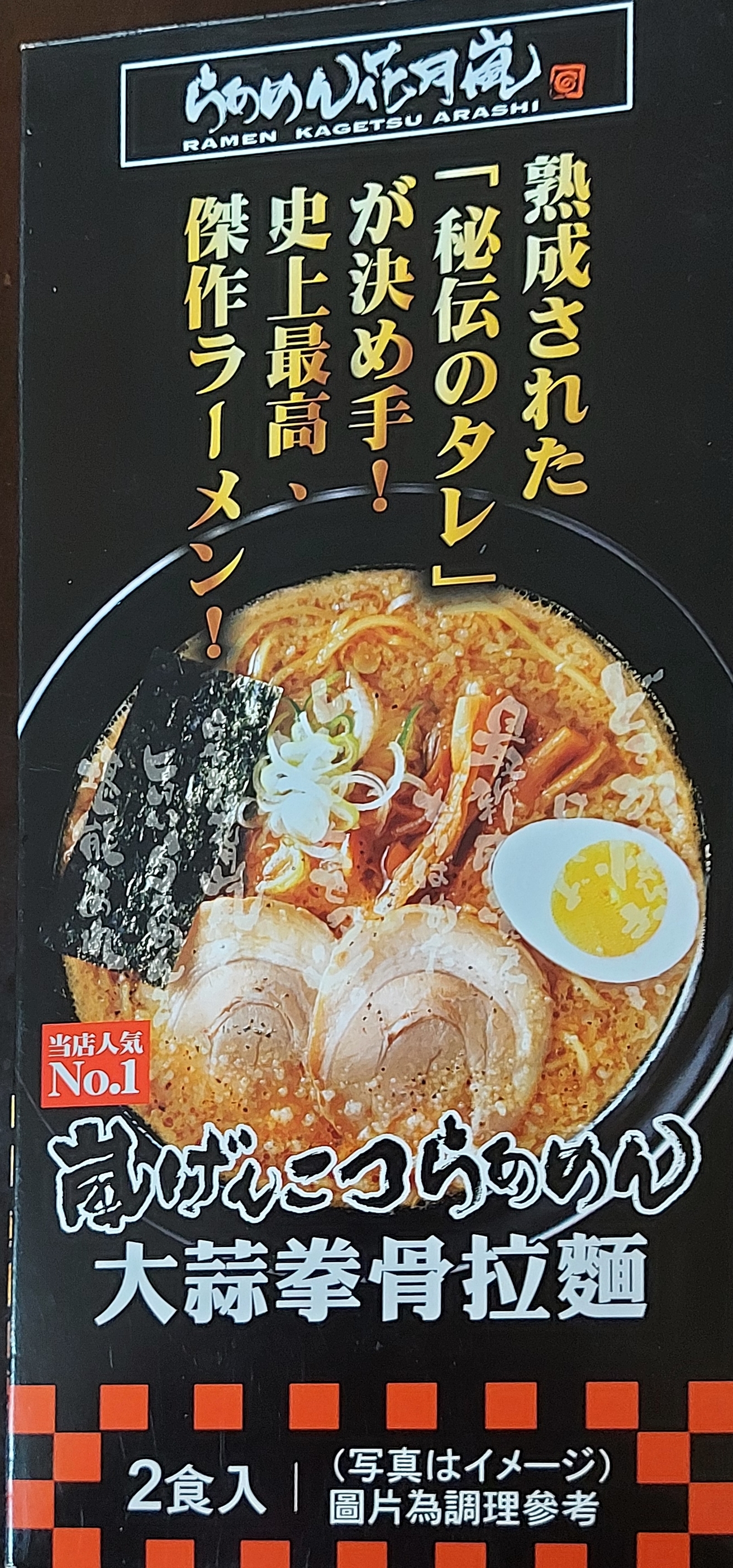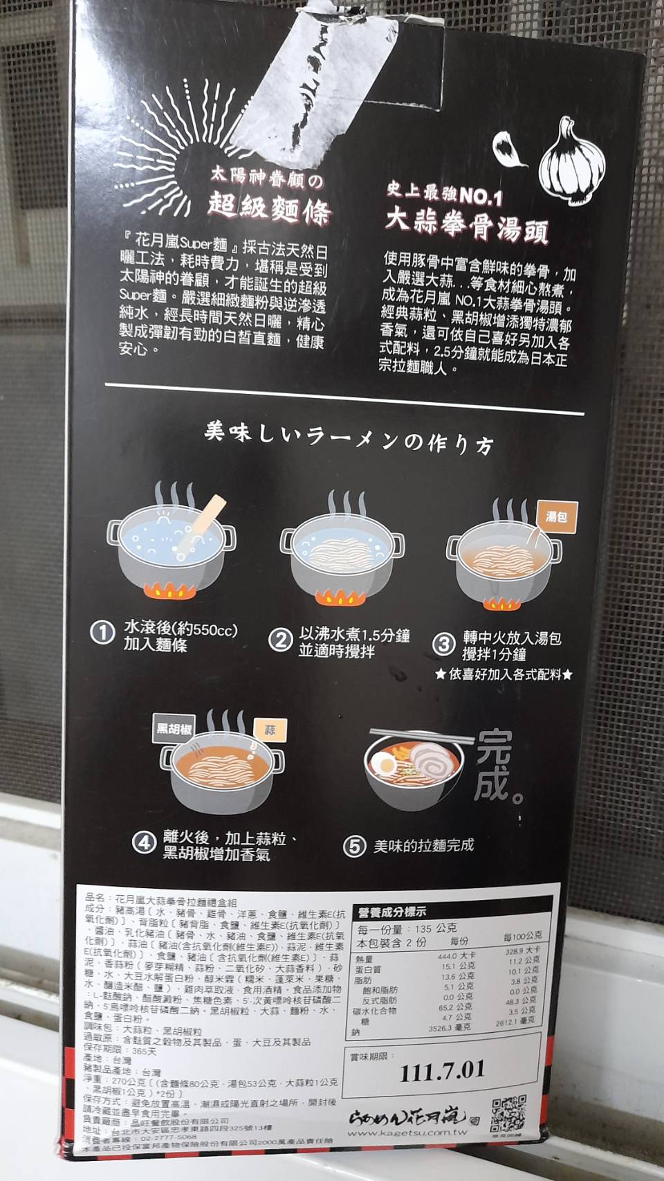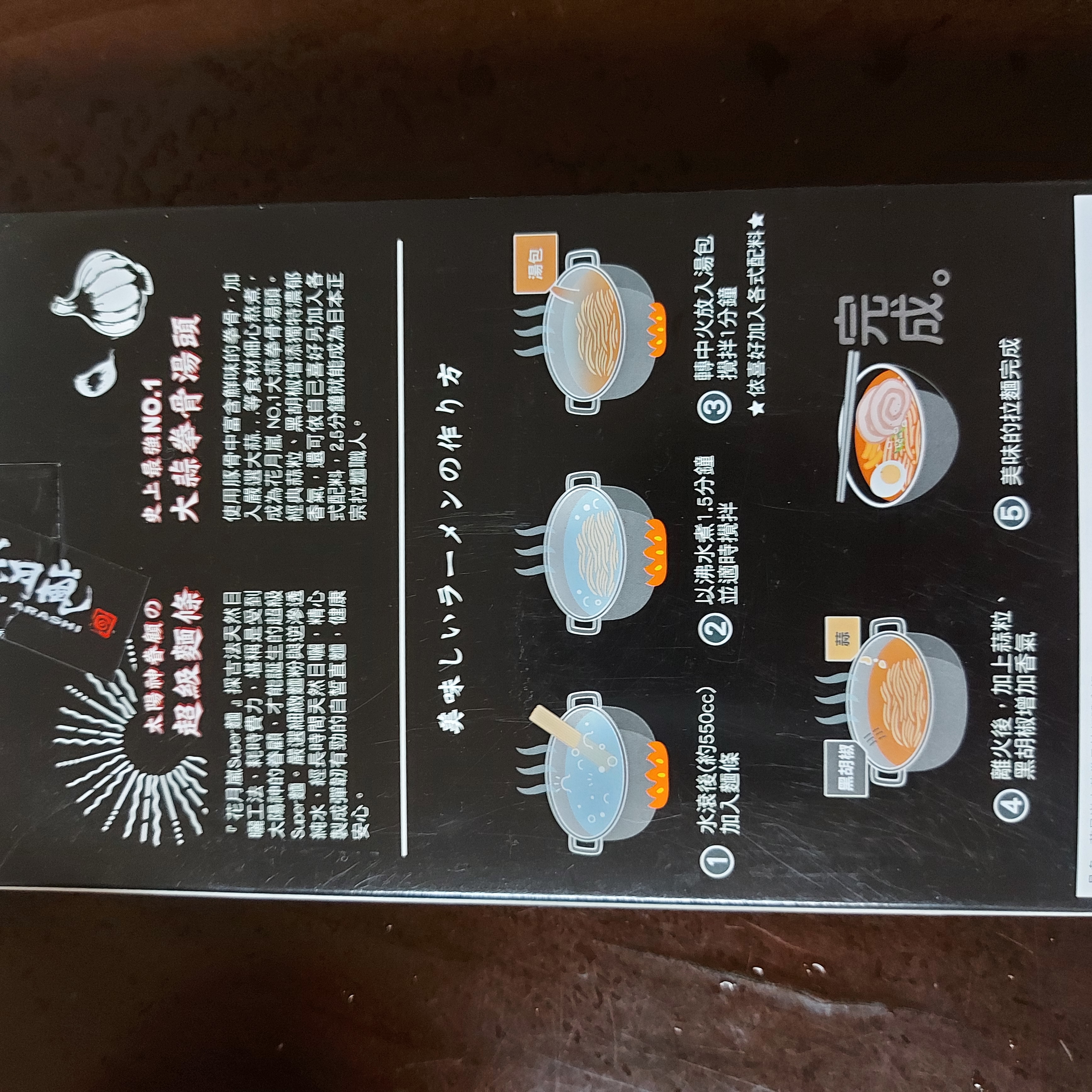 豬高湯、背脂粒、醬油、乳化豬油、蒜油、食鹽、豬油、蒜泥、香蒜粉、砂糖、水、大豆水解蛋白粉、醇米霖、雞肉萃取液、食用酒精。食品添加物:L-麩酸鈉、醋酸澱粉、焦糖色素、5'-次黃嘌呤核苷磷酸二納、5'烏嘌呤核苷磷酸二納。黑胡椒粒、大蒜、麵粉、水、食鹽、蛋白粉