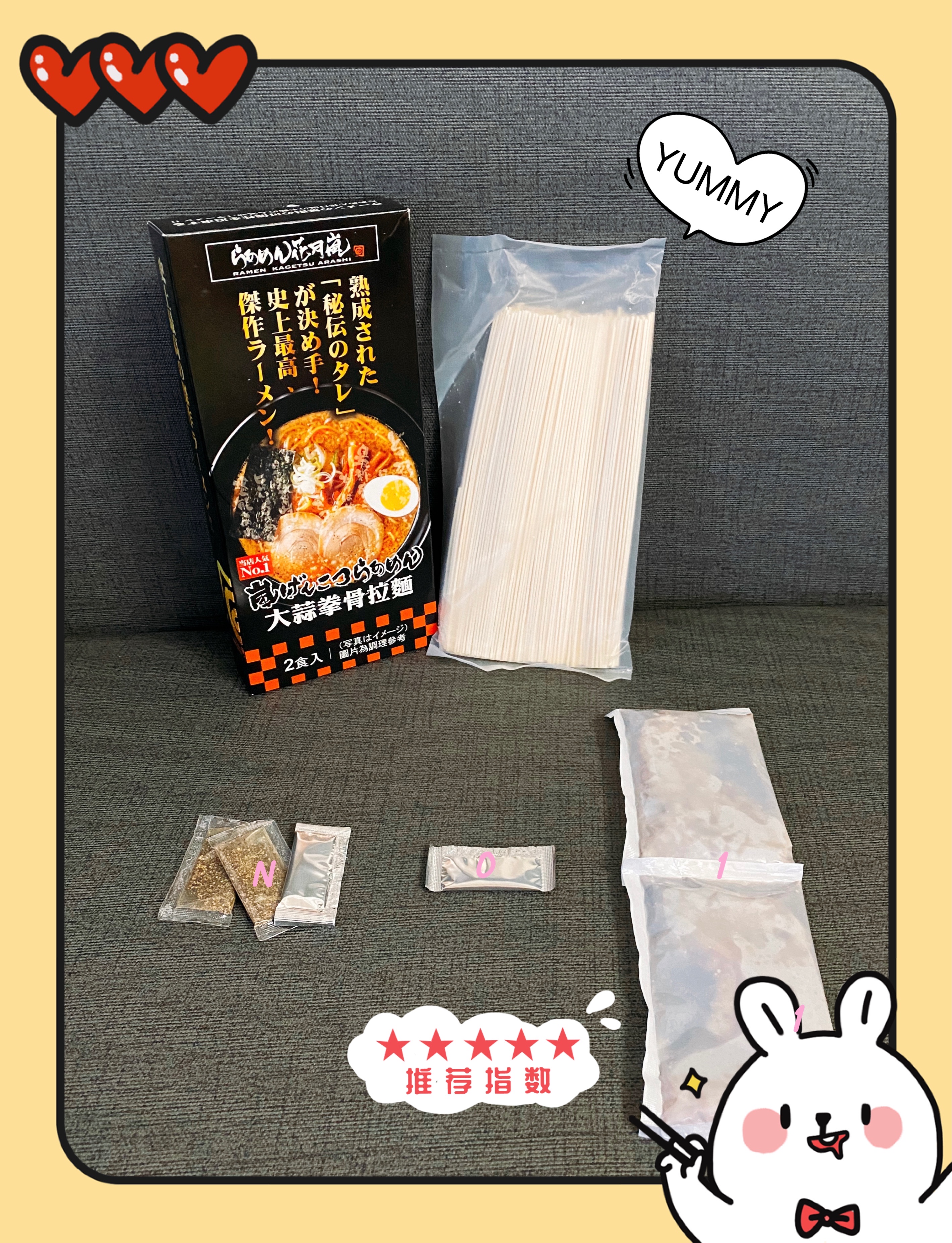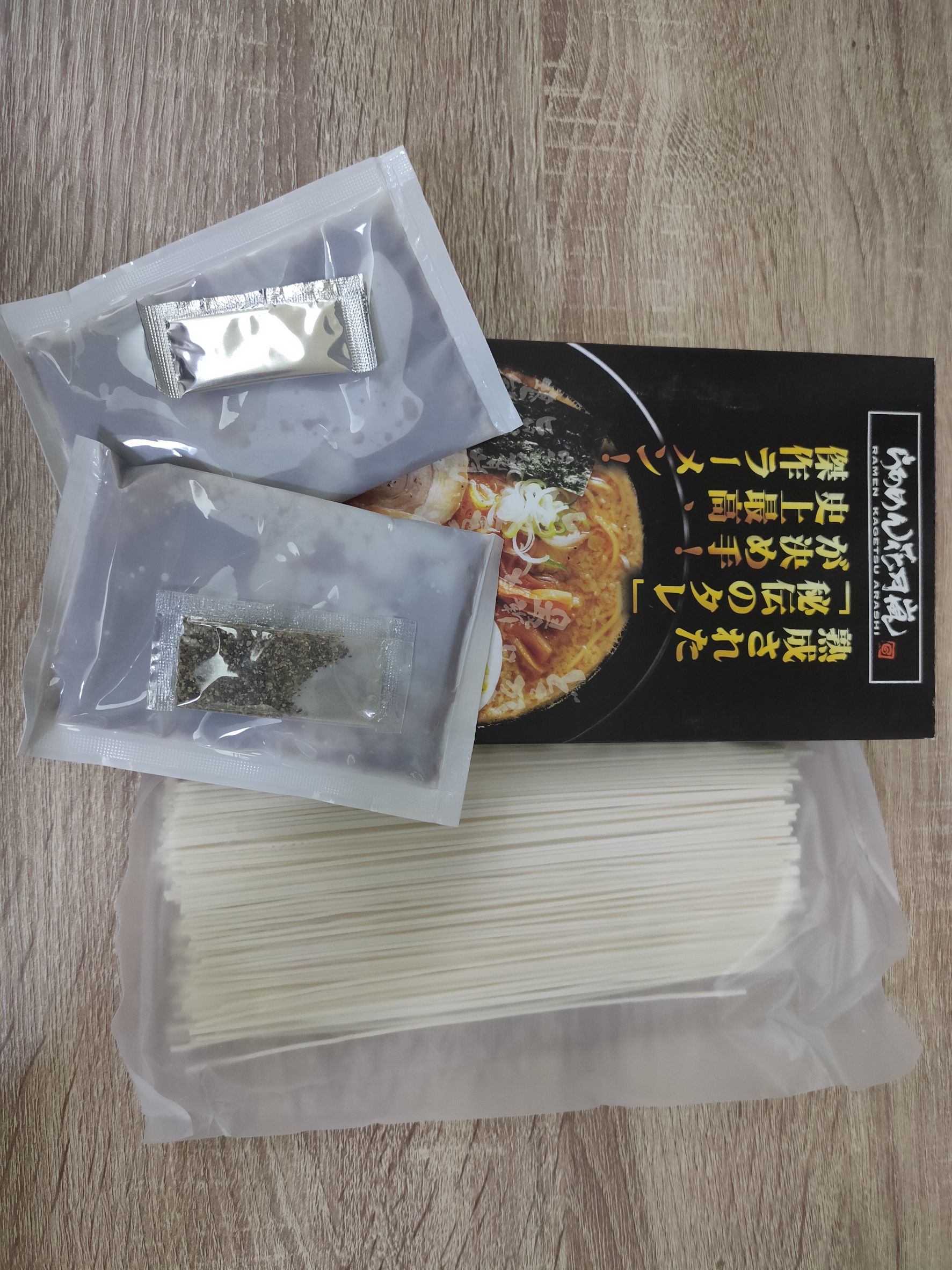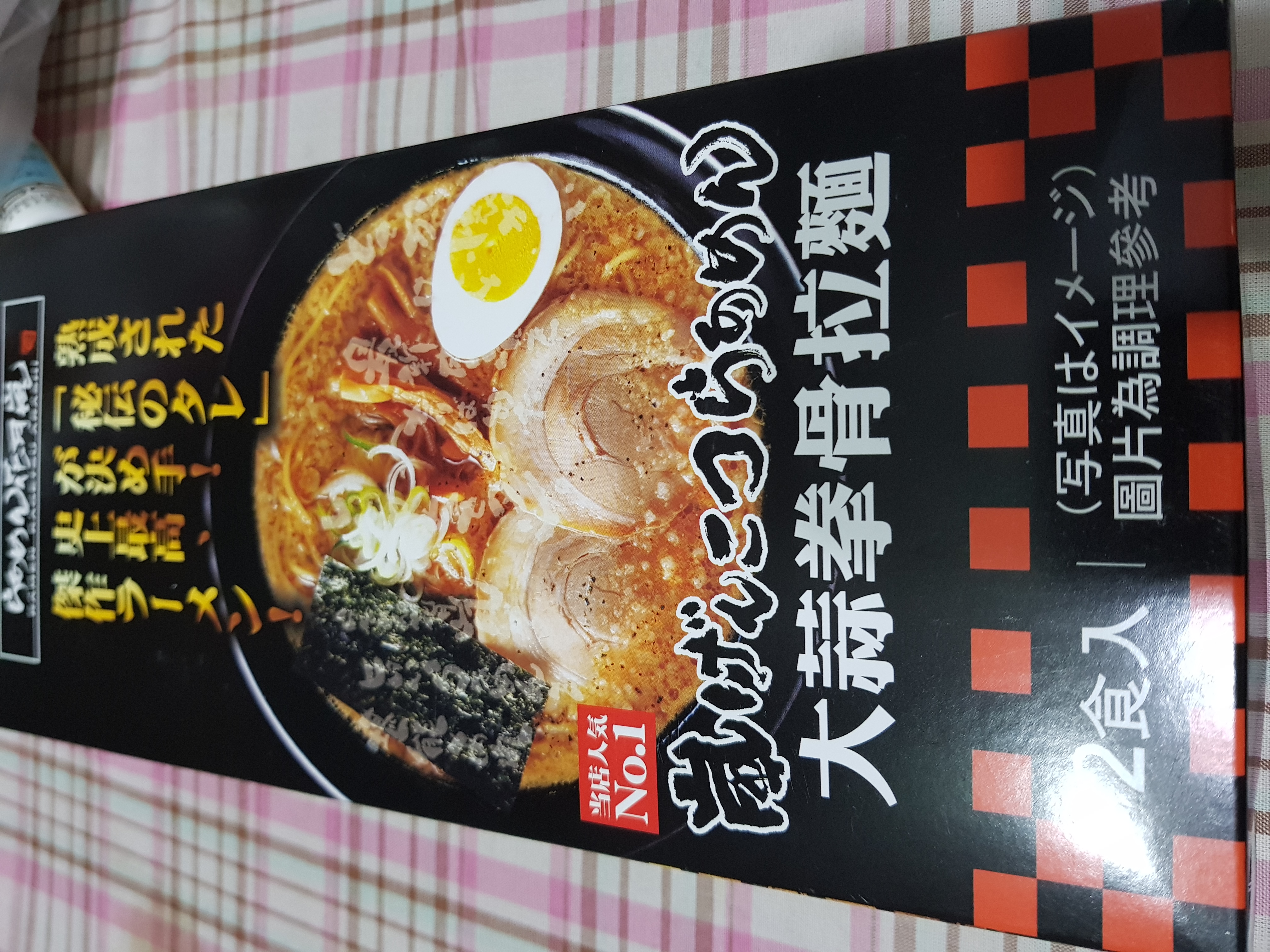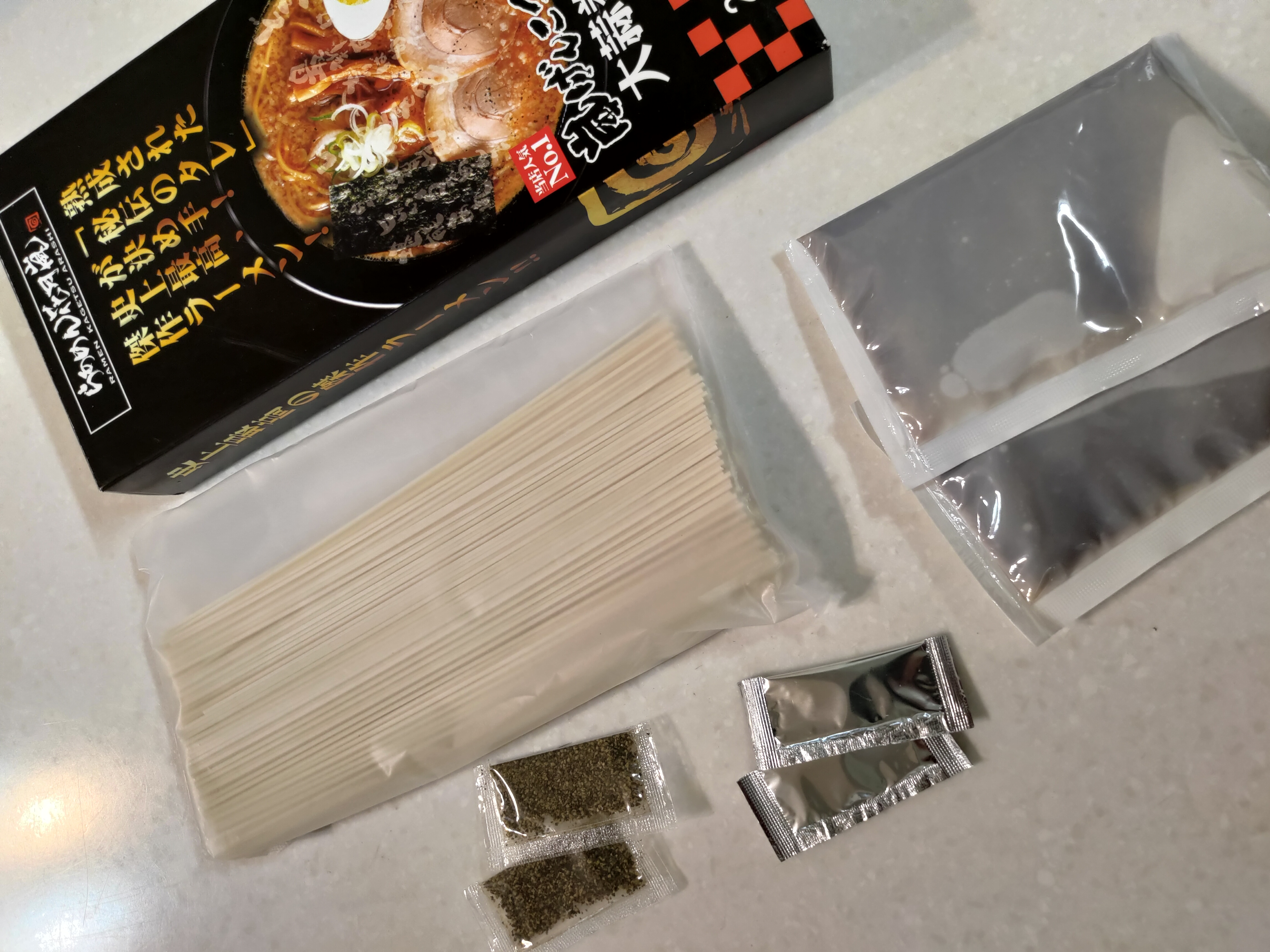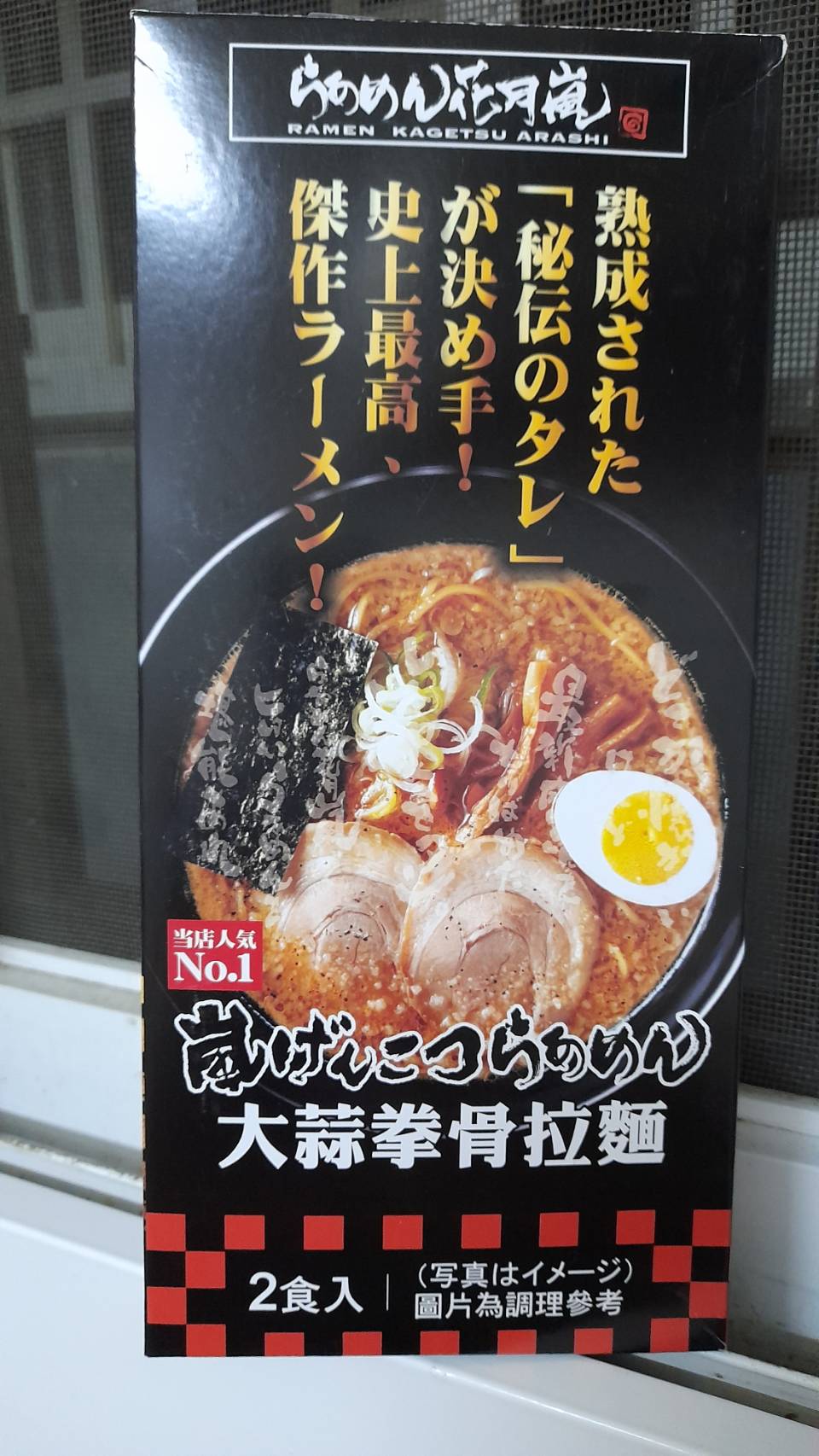 豬高湯、背脂粒、醬油、乳化豬油、蒜油、食鹽、豬油、蒜泥、香蒜粉、砂糖、水、大豆水解蛋白粉、醇米霖、雞肉萃取液、食用酒精。食品添加物:L-麩酸鈉、醋酸澱粉、焦糖色素、5'-次黃嘌呤核苷磷酸二納、5'烏嘌呤核苷磷酸二納。黑胡椒粒、大蒜、麵粉、水、食鹽、蛋白粉
