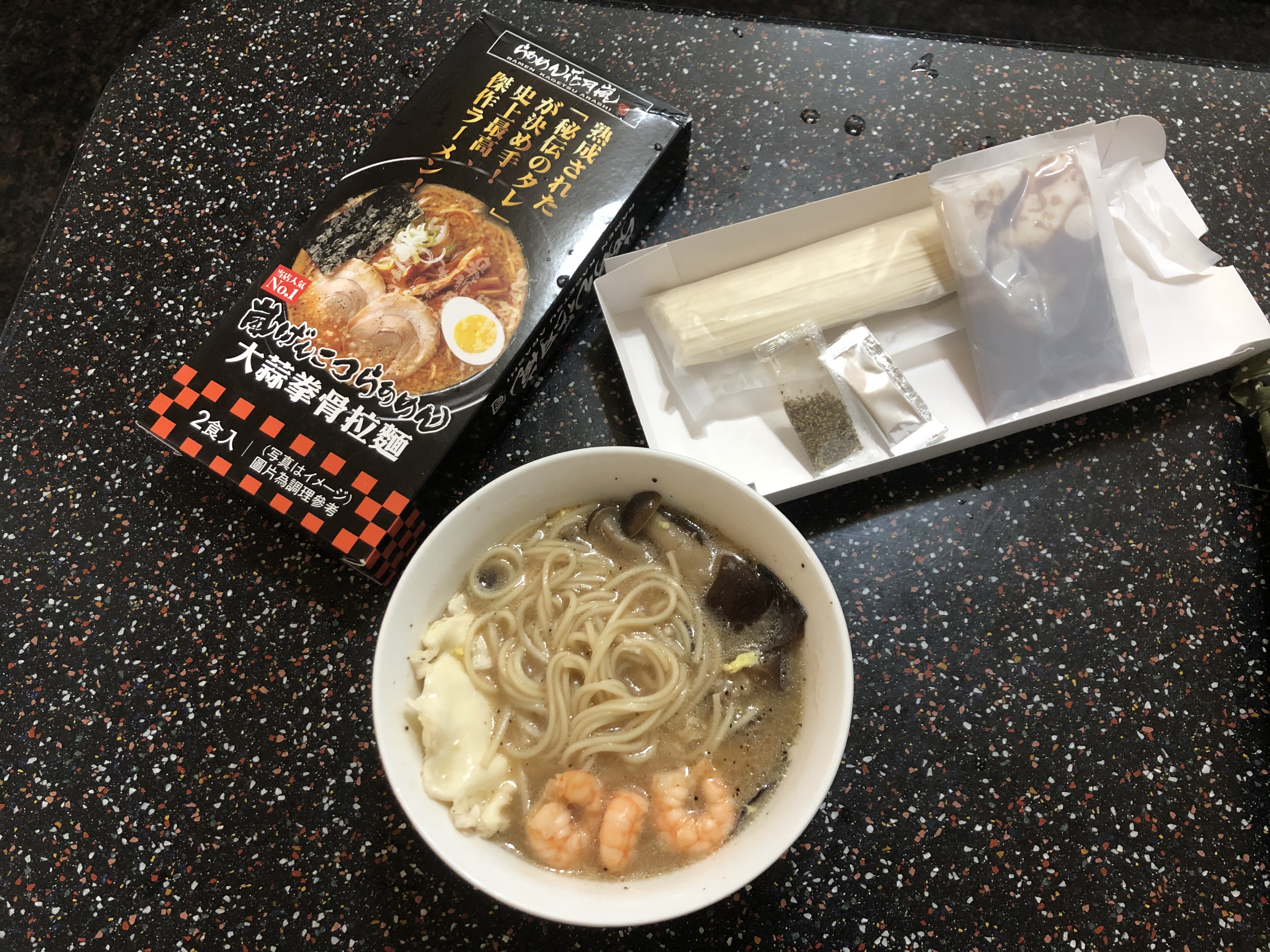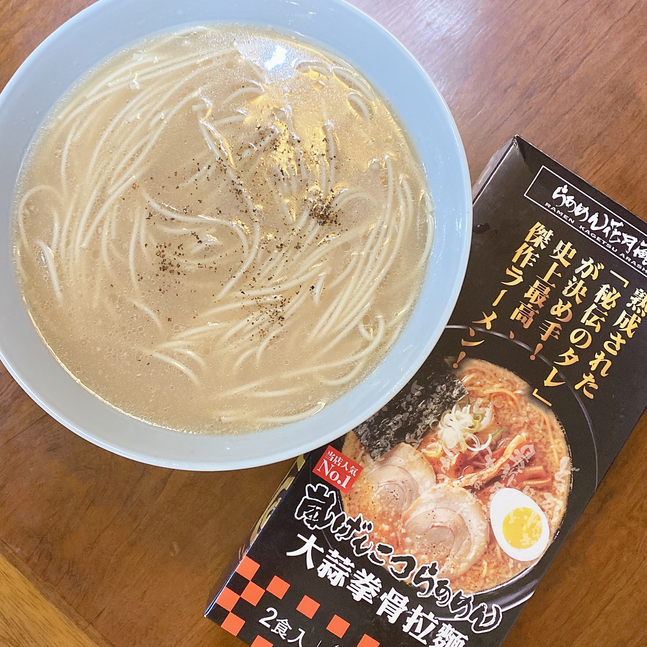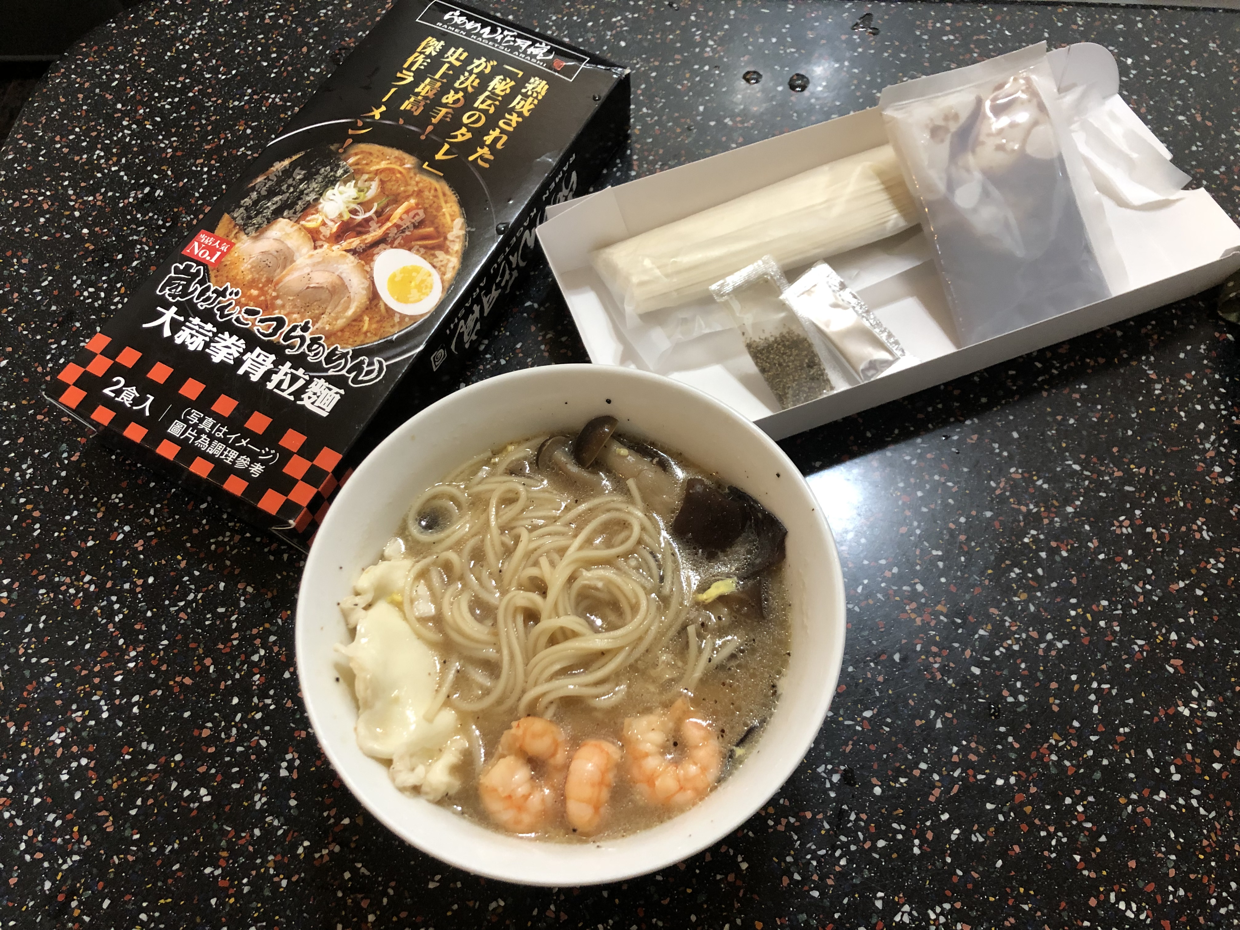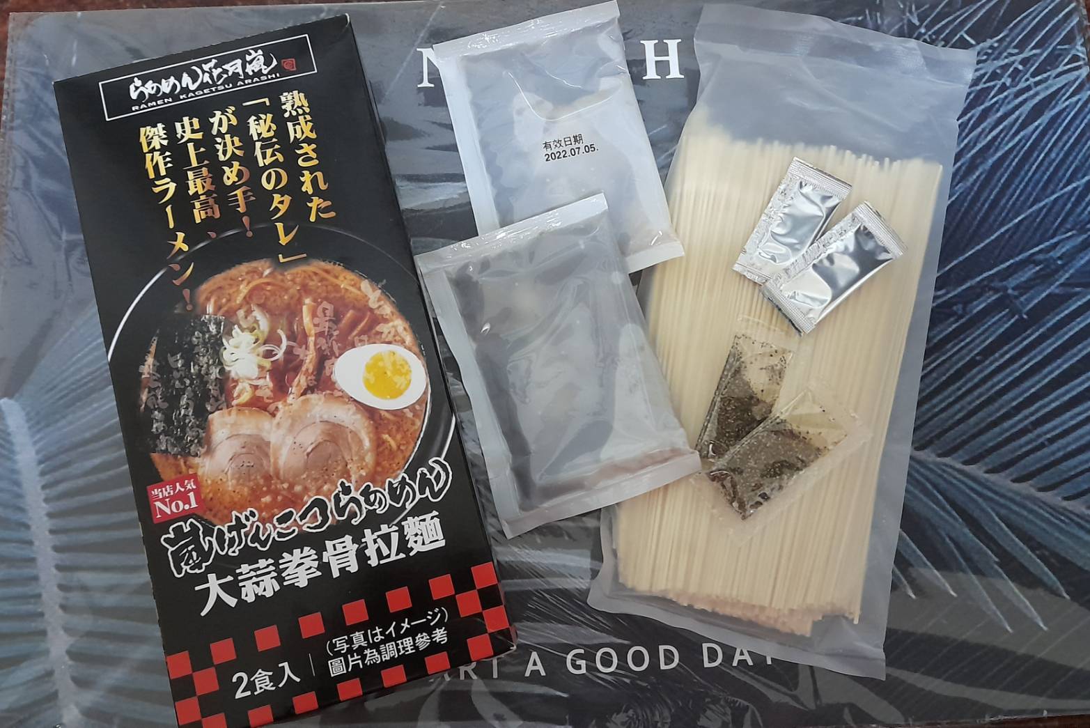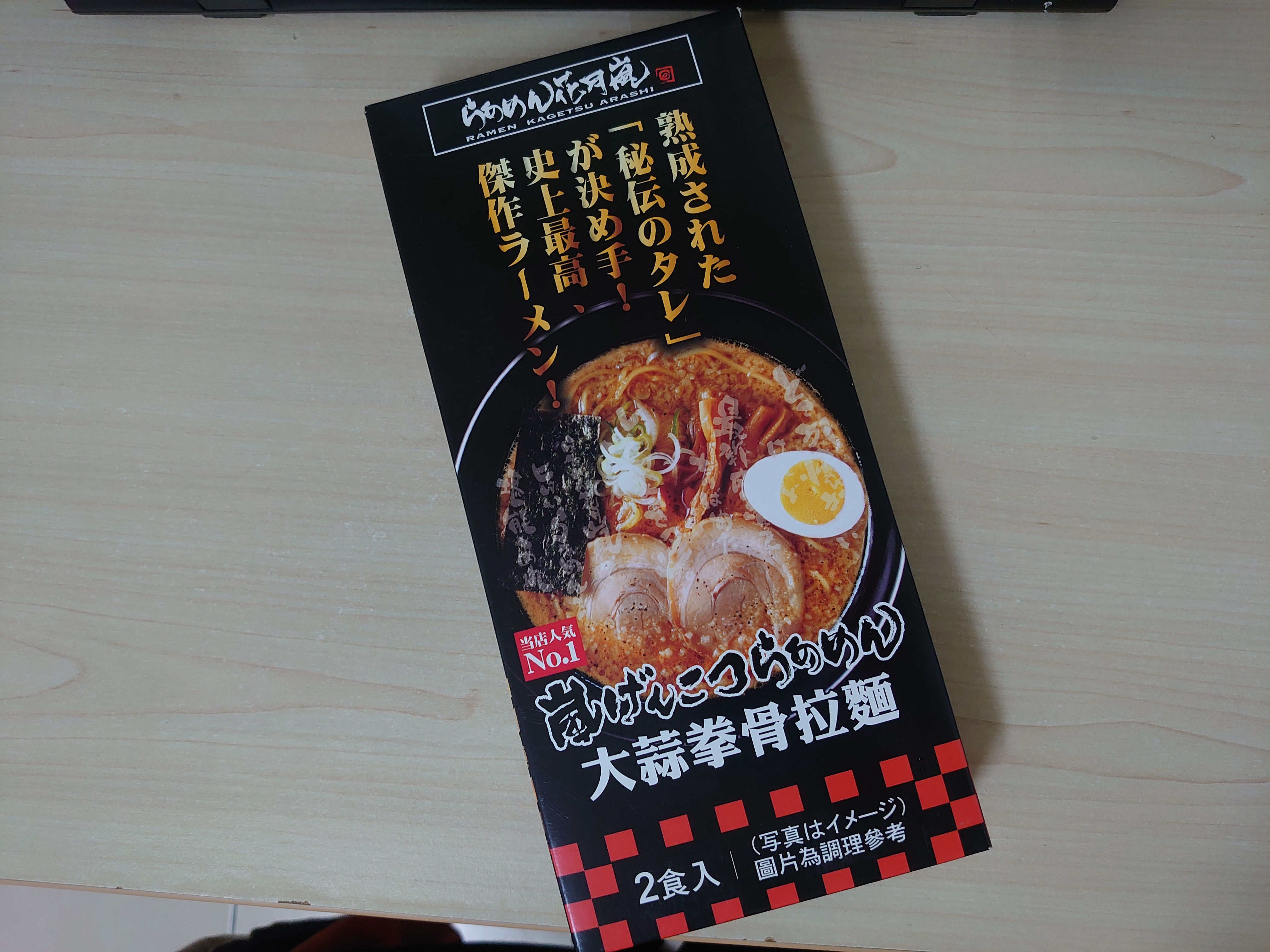 豬高湯、背脂粒、醬油、乳化豬油、蒜油、食鹽、豬油、蒜泥、香蒜粉、砂糖、水、大豆水解蛋白粉、醇米霖、雞肉萃取液、食用酒精。食品添加物:L-麩酸鈉、醋酸澱粉、焦糖色素、5'-次黃嘌呤核苷磷酸二納、5'烏嘌呤核苷磷酸二納。黑胡椒粒、大蒜、麵粉、水、食鹽、蛋白粉