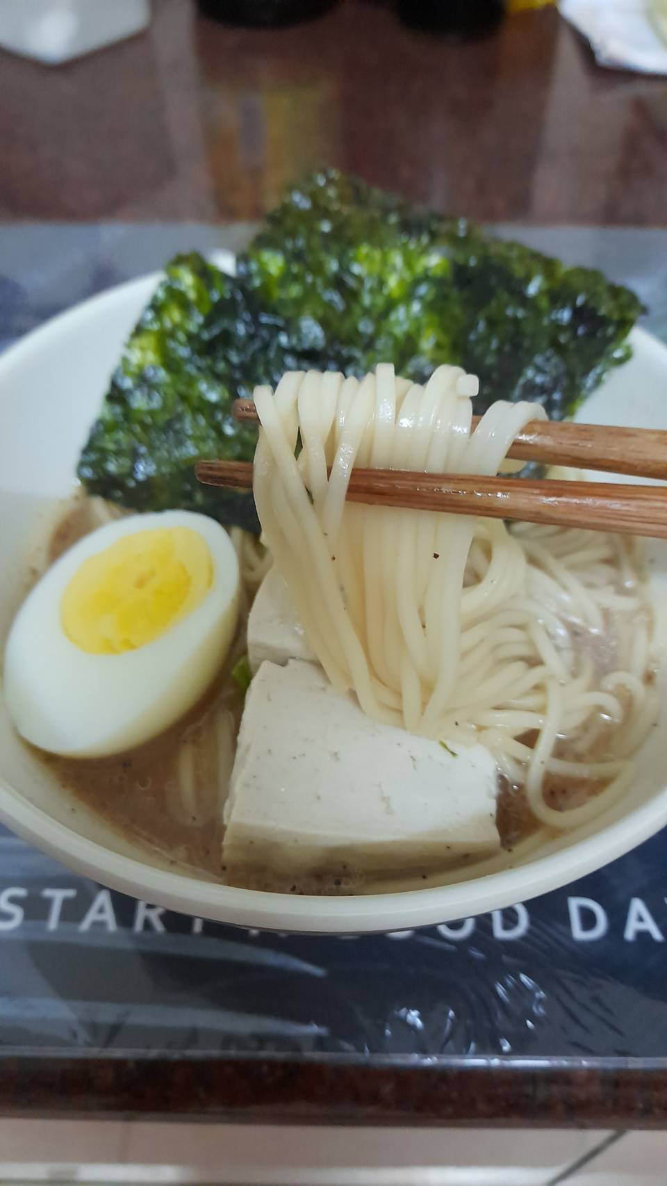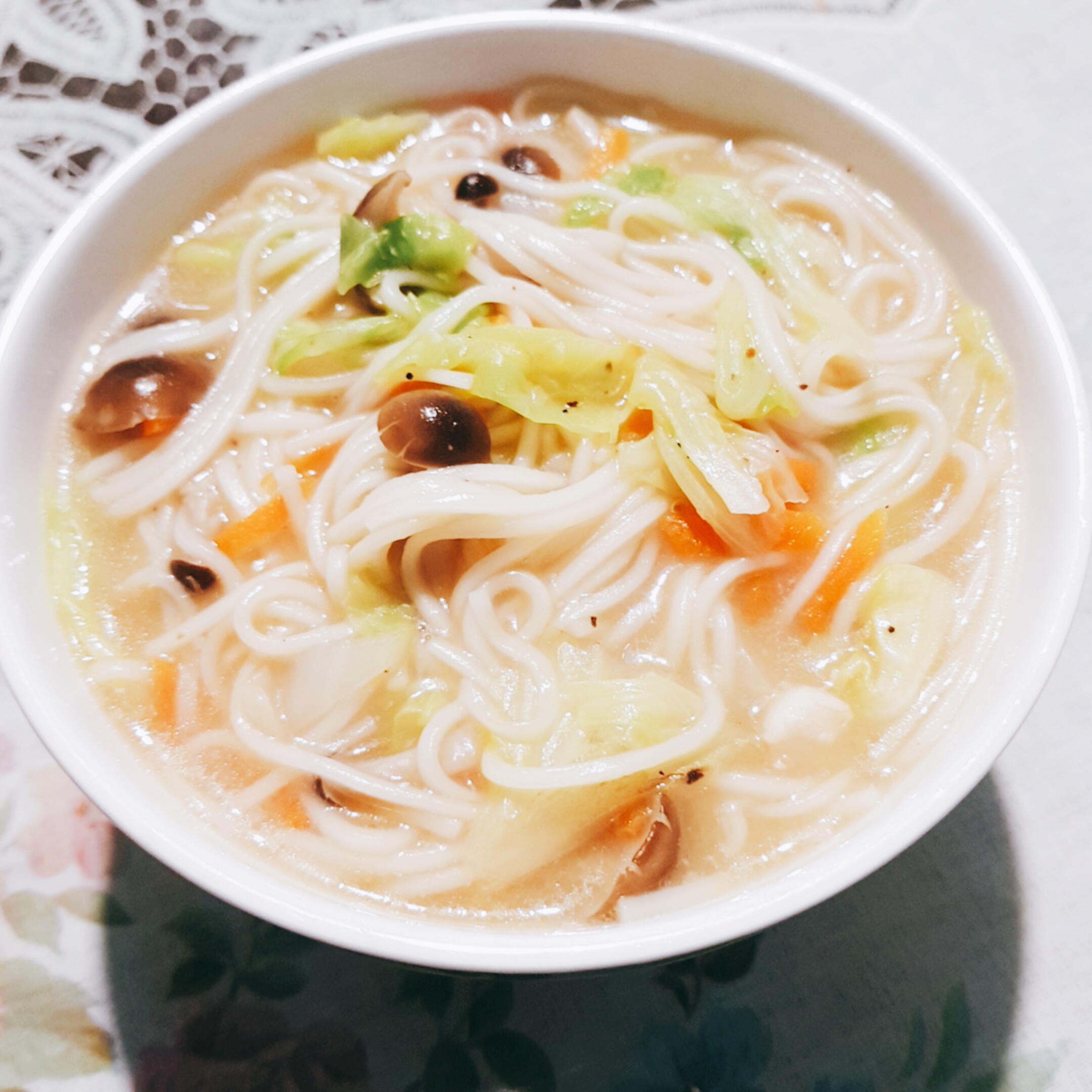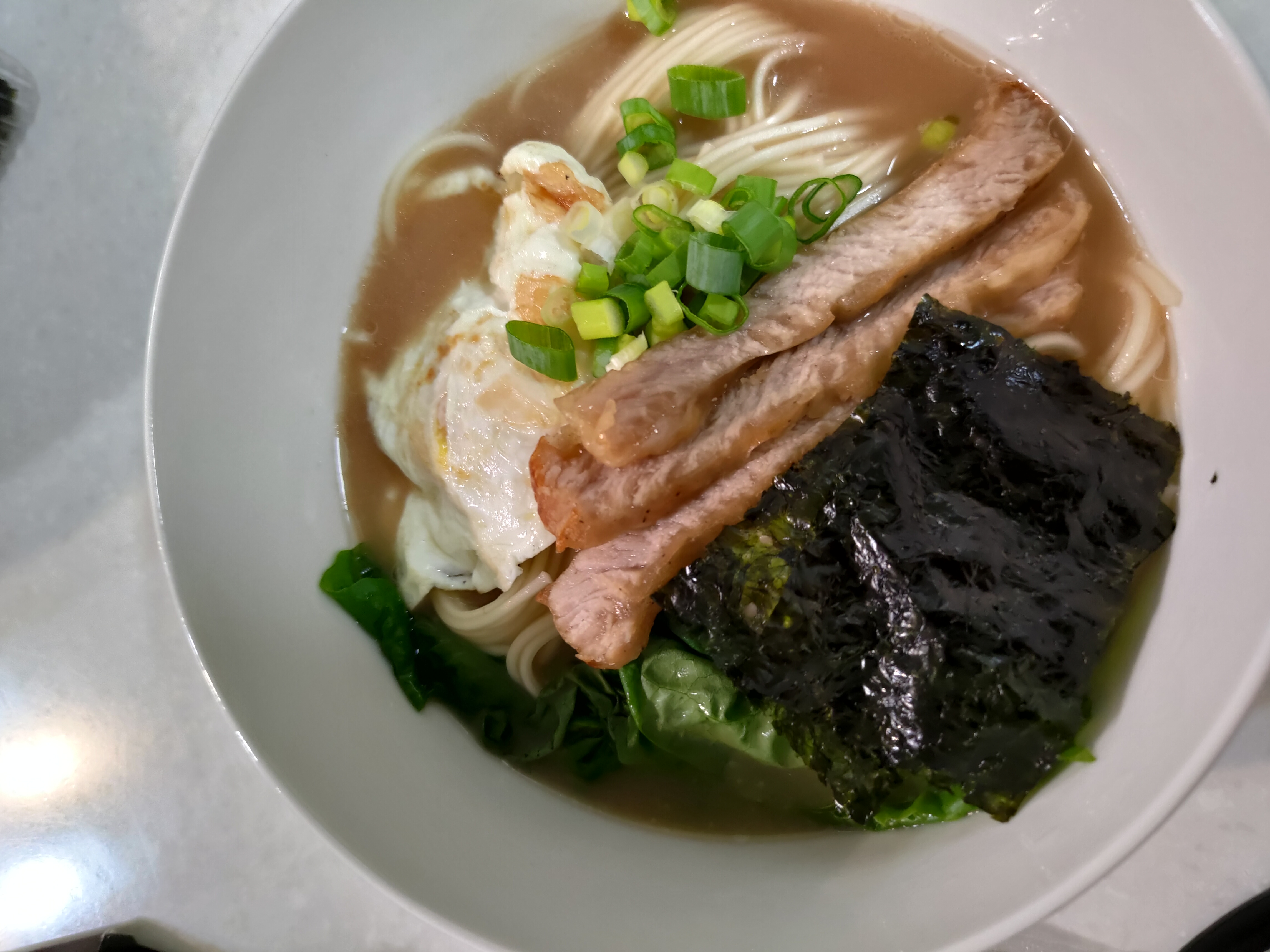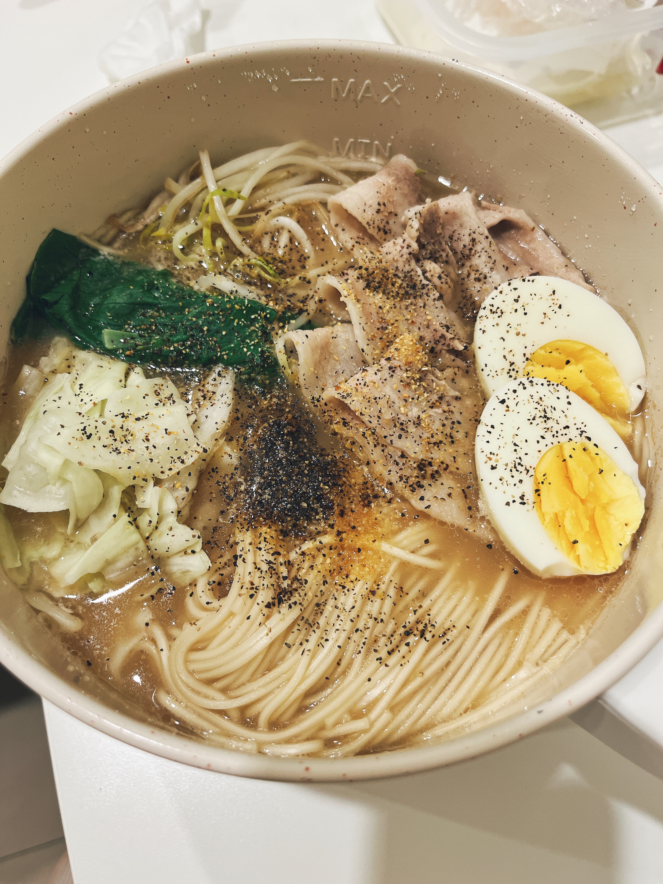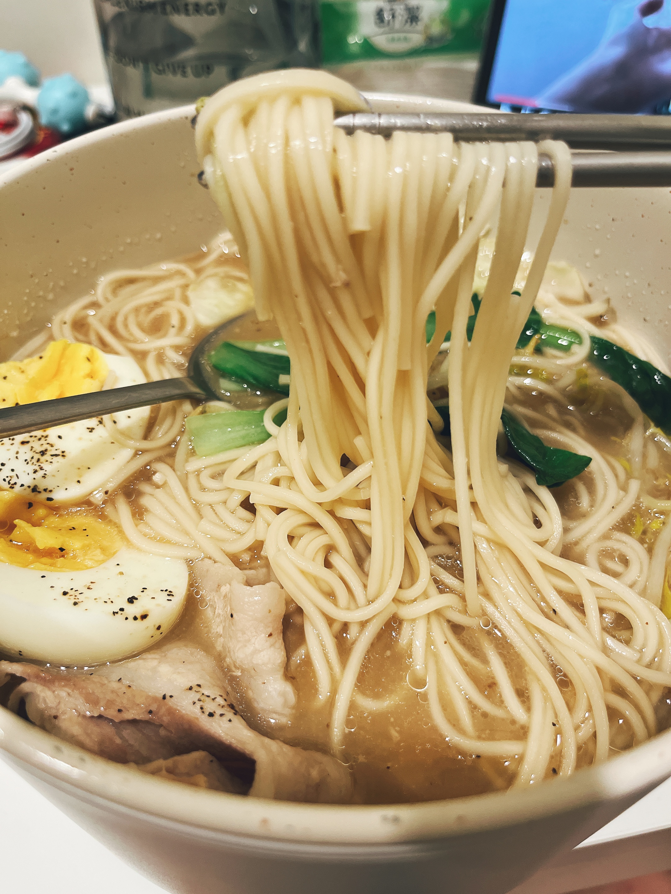 豬高湯、背脂粒、醬油、乳化豬油、蒜油、食鹽、豬油、蒜泥、香蒜粉、砂糖、水、大豆水解蛋白粉、醇米霖、雞肉萃取液、食用酒精。食品添加物:L-麩酸鈉、醋酸澱粉、焦糖色素、5'-次黃嘌呤核苷磷酸二納、5'烏嘌呤核苷磷酸二納。黑胡椒粒、大蒜、麵粉、水、食鹽、蛋白粉