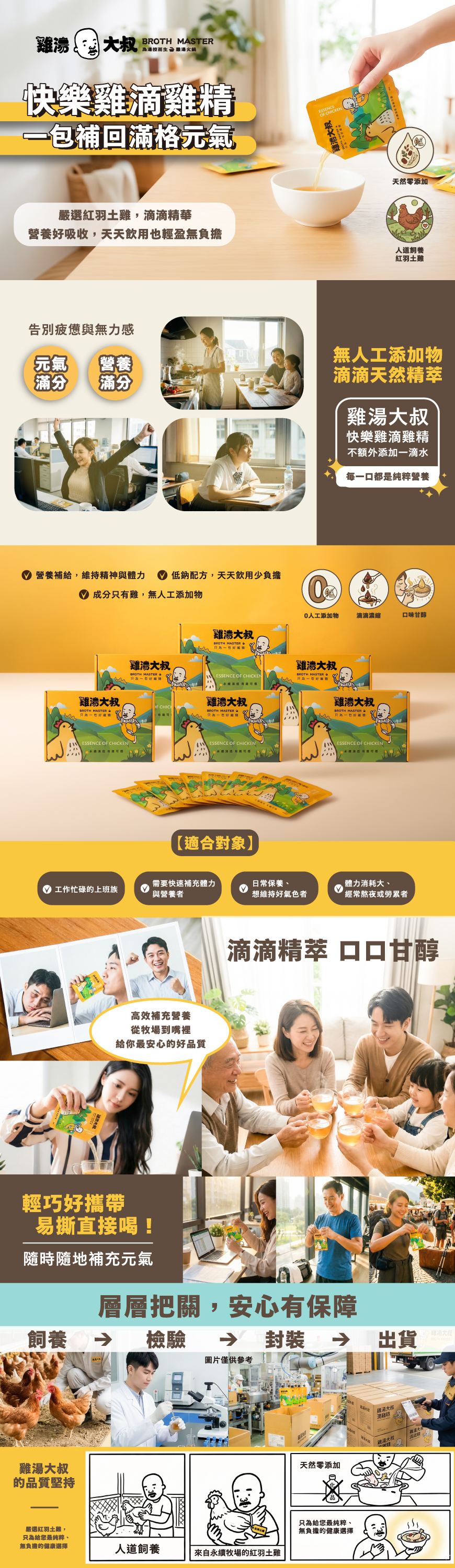 回列表 雞湯大叔 快樂雞滴雞精-真材實料慢熬萃取,喝得出自然的好營養! 市價129元 (免費申請) 索取進行中 所需等級 一般會員以上 所需學分 30 體驗份數 50 關注人數 183 申請人數 5 我要申請 品牌業者:雞湯大叔 負責廠商 希塔食品股份有限公司 廠商地址 桃園市中壢區普忠里普忠路153號 產地 台灣 試用產品規格 60ml±5%/1包 食品業者登錄字號 H-190754866-00000-0 投保產品責任險字號 0800第14PDT00112號 商品介紹 商品成分 使用方法 注意事項 1. 微波加熱: 拆開包裝倒入可微波容器,以600-700W微波加熱30-40秒 2. 隔水加熱: 包裝袋放入熱水浸泡3分鐘,拆開包裝放入碗中食用 老母雞精 此產線有生產花生、芝麻、牛奶、蛋、堅果、魚、甲殼類、含麩質之穀物、大豆等及其製品。 申請者入選試吃活動後,系統會扣30學分以取得產品試吃資格。體驗完成後,請返回會員專區完成試吃體驗心得分享(至少200字,並上傳3張自行拍攝的照片)。 若未於限定期間內完成心得分享(至少200字,並上傳3張自行拍攝的照片),系統將列入黑名單,將影響後續申請權益。 若心得回填內容豐富、詳實完整,就有機會列為往後食驗室優先入選名單。 免費試吃體驗由食力指定物流配送,恕不接受由超商代收或寄至郵政信箱, 若不符合規範而遭退貨,視同放棄錄取資格並將列為黑名單。 敬請詳閱各項免費體驗活動內容與規範,試吃申請截止後,恕無法修改、取消。 試吃體驗商品嚴禁轉售。 其他試用 關注人數1083 申請人數 252 霧峰區農會 薑麻酒粕細麵 醇厚薑麻遇上甘甜酒粕,顛覆味蕾的濃郁麵香 2026/04/16截止 15份 關注人數1049 申請人數 221 ALPHA 安心米鹿尾菜飯 長效保存的Q彈日式美味,有備無患的居家安心主食 2026/04/21截止 15份 關注人數1698 申請人數 277 賴山嶼 青花椒辣椒醬入菜,拌麵拌飯一匙提香,麻辣清爽一口上癮! 2026/04/21截止 50份 關注人數766 申請人數 194 可口奶滋鐵觀音口味隨手分享包 童年經典的大人味升級!極濃焙茶香甜而不膩 2026/04/28截止 15份 看更多