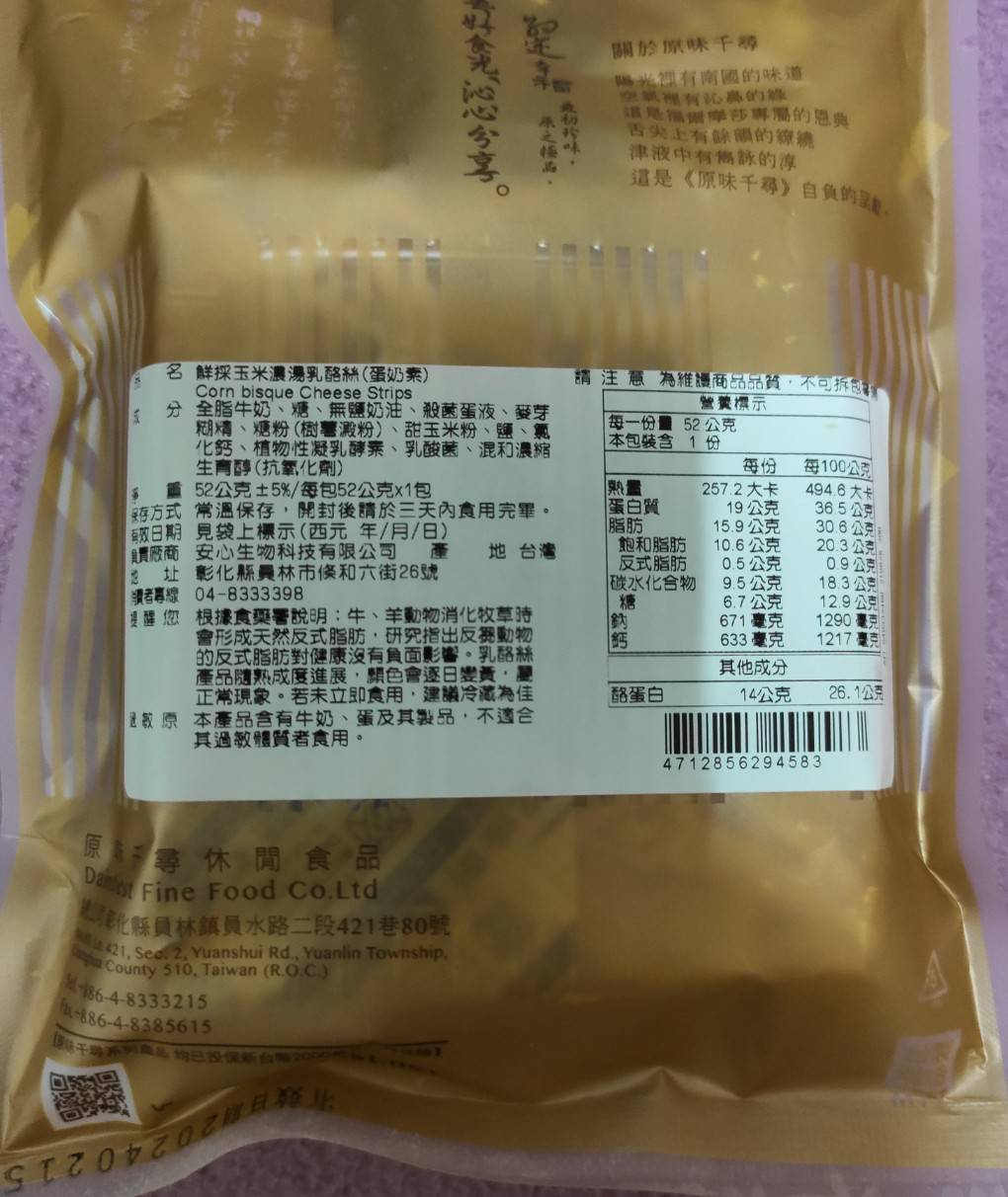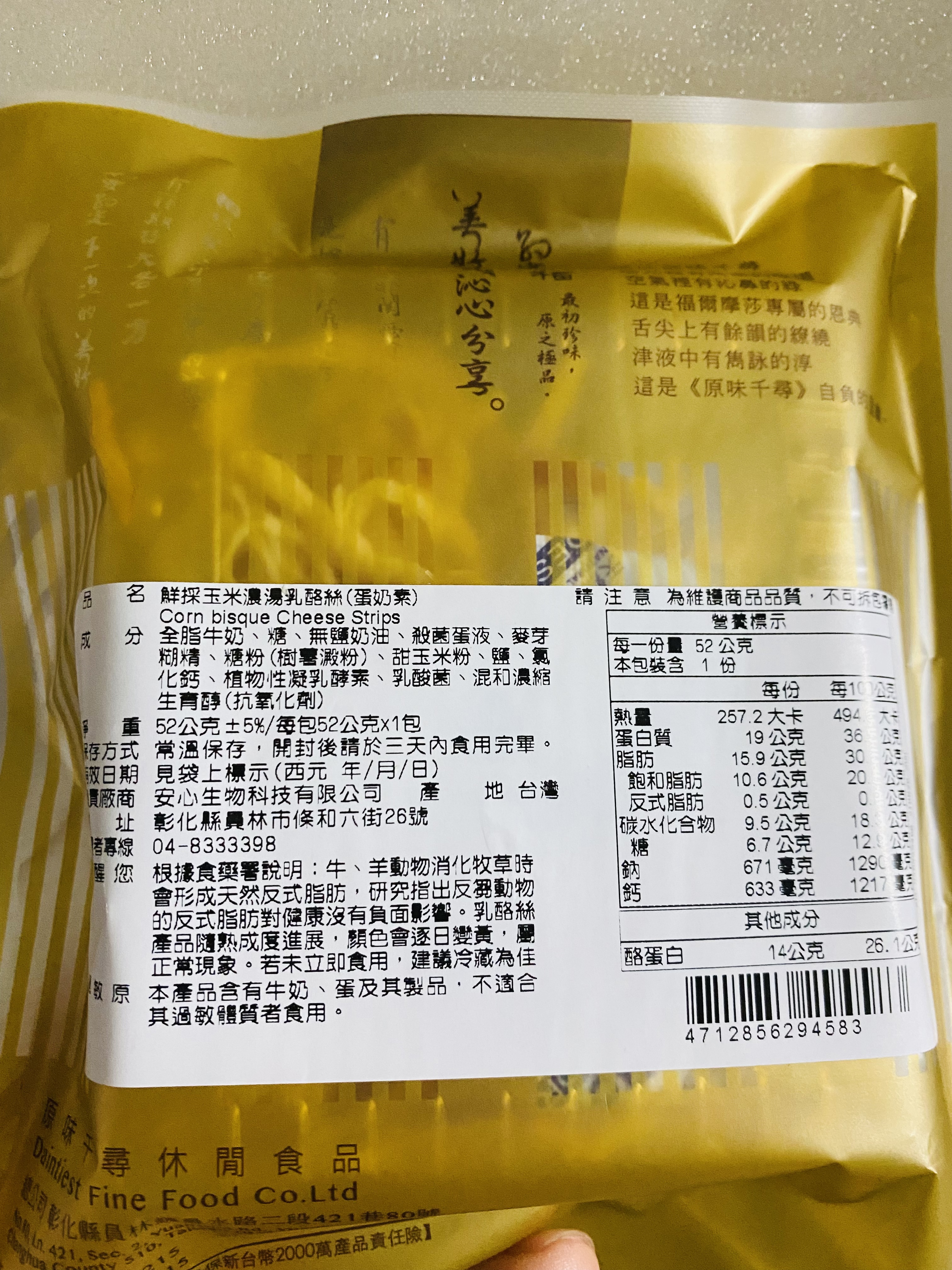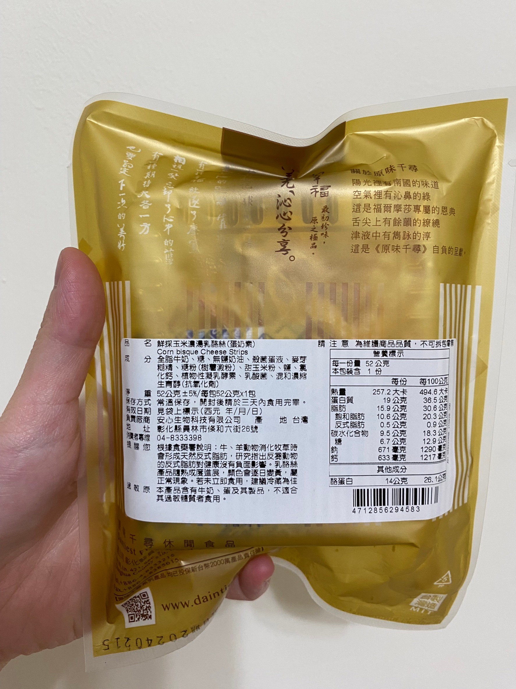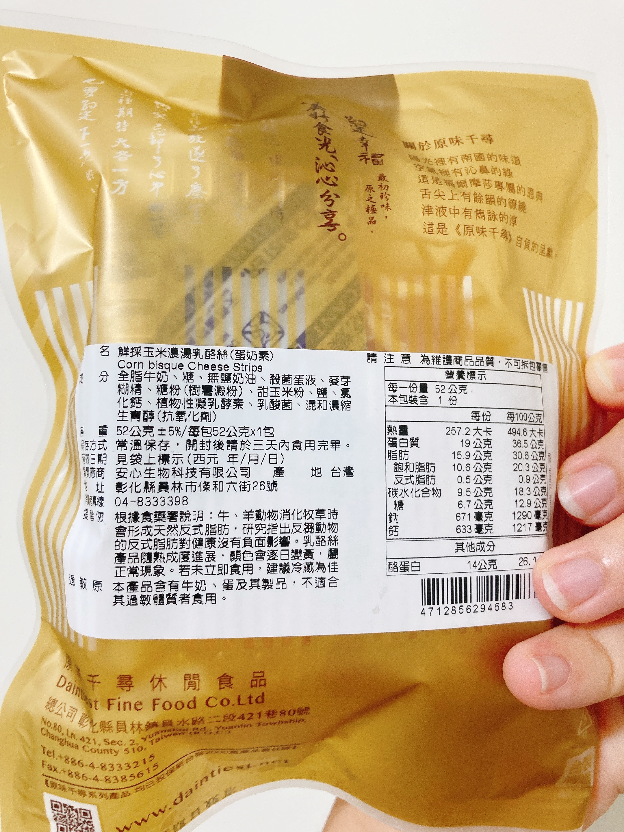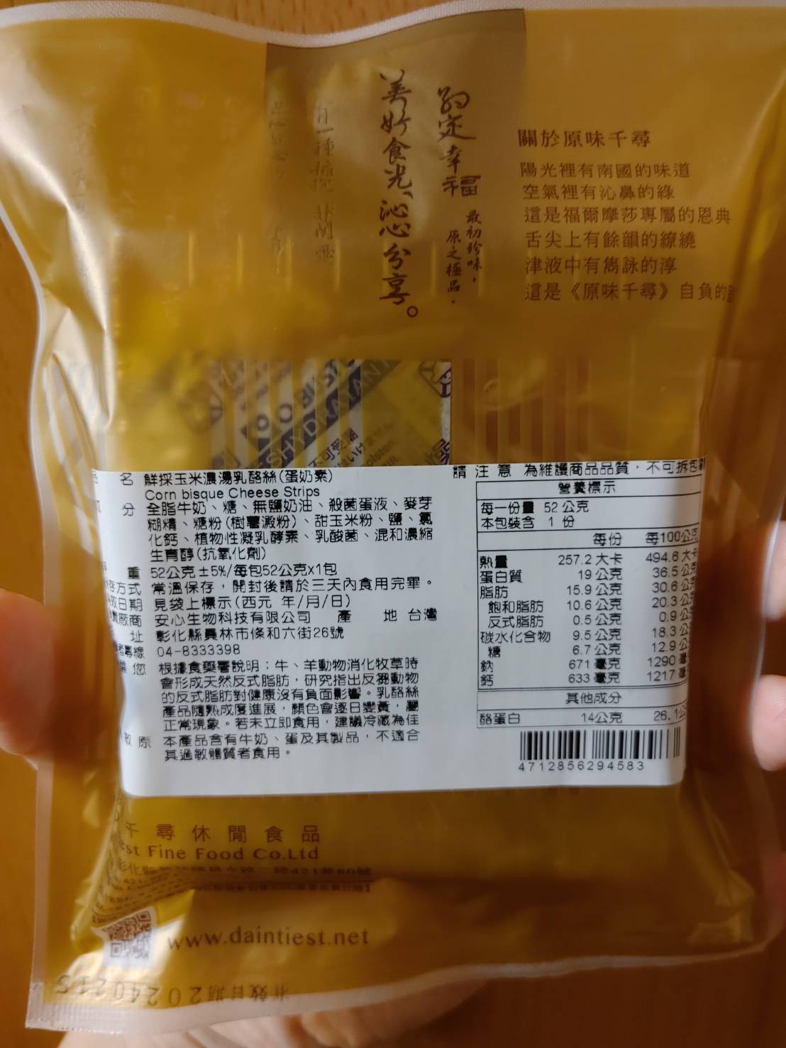 回列表 原味千尋 鮮採玉米濃湯乳酪絲 濃厚奶香與煙燻風味層次堆疊 市價149元(免費申請) 所需等級 一般會員以上 所需學分 50 體驗份數 15 關注人數 1247 申請人數 339 申請截止 品牌業者:原味千尋 負責廠商 安心生物科技有限公司 廠商地址 510彰化縣員林市條和六街26號 產地 台灣 試用產品規格 52g/包 食品業者登錄字號 N-153488260-00000-7 投保產品責任險字號 0508PDT00090 心得分享 商品介紹 商品成分 使用方法 注意事項 體驗名單 8.8 原味千尋 鮮採玉米濃湯乳酪絲 濃湯香氣 8.2 風味層次 8.5 涮嘴程度 9.1 包裝美學 7.8 建議推薦 8.6 心得分享 15則 禎禎 金食達人 31歲 嘉義市 2023/09/23 對原味千尋 鮮採玉米濃湯乳酪絲留下評價 8 本次試用的是原味千尋的鮮採玉米濃湯乳酪絲,這次試吃商品令我印象深刻。首先,它散發出的煙燻香味非常濃厚,一打開包裝就撲鼻而來。而在仔細聞後可以被濃純的奶香包圍,讓我忍不住先滿足鼻子的餓。光聞味道就讓我迫不及待地想要品嚐。當嘗試第一口時,奶香味真的非常明顯,彷彿置身於牧場新鮮現擠的牛奶之中,新鮮的奶味令人陶醉。乳酪絲的質地跟口感滿特別的,有些是酥脆有些則非常有嚼勁。含在口中煙燻的味道明顯,又會慢慢化出玉米濃湯的甘甜。這款鮮採玉米濃湯乳酪絲總的來說,是一款非常讓人回味無窮的美味零食。如果今天是喝酒或是嘴饞,我都毫不猶豫地推薦給所有人,馬上就會想打開來跟電視一起享用,這是非常適合喜歡奶香味與嚼勁口感的人享用。 李欣玫 金食達人 29歲 新北市 2023/09/23 對原味千尋 鮮採玉米濃湯乳酪絲留下評價 9 很開心能夠體驗原味千尋的鮮採玉米濃湯乳酪絲,此款乳酪絲選用天然乳源去製作而成,吃起來乳酪的味道很濃郁,玉米濃湯的香氣跟乳酪絲融合得很好,讓人想一口接著一口吃,成分也很單純,沒有添加過多的食品添加物,自然的味道最美味。謝謝食力讓我有這個機會體驗原味千尋的鮮採玉米濃湯乳酪絲,此款乳酪絲真的是一款老少咸宜的零食,有機會會再回購的! 莊子昀 金食達人 28歲 桃園市 2023/09/26 對原味千尋 鮮採玉米濃湯乳酪絲留下評價 8 包裝為小包裝,輕巧好攜帶,看似不多但裡面裝的很滿!也不用擔心一不注意吃太多,但因為是一次性的包裝,拆封後如果當天吃不完的話就要注意一下保存方法。以外觀來說,色澤跟常見的乳酪絲相似都呈金黃色,但這款乳酪絲每條的粗細都很平均,不會有部分太粗太硬很難咬或細到沒有口感的狀況發生,這部分覺得很讚!味道口感部分,一拆開包裝就能聞到很濃郁的起司味,嚐起來也是如此,但特別的是尾韻會出現玉米濃湯的味道,且奶香味會隨著越咀嚼越明顯,充滿層次的口感變化讓人印象深刻,真的會一口接一口吃下去!整體而言是會讓人想回購的零嘴! EN 銀食達人 44歲 高雄市 2023/09/20 對原味千尋 鮮採玉米濃湯乳酪絲留下評價 9 這包是玉米濃湯乳酪絲口味的,打開包裝後,聞到煙燻及奶酪混合一起的香味,吃起來是滿滿濃郁的乳酪味道,會忍不住一條吃完又接著一條,看起來小小一包,但份量是夠吃的,外包裝設計也好看,很適合攜帶外出去野餐或露營食用,更適合拿來當下酒菜一起享用哦! 踢那 金食達人 41歲 新北市 2023/09/21 對原味千尋 鮮採玉米濃湯乳酪絲留下評價 9 本來就喜歡吃乳酪絲、魷魚絲之類的零嘴,平常也會自己購買,剛好可以跟其他同類型商品做比較。首先原味千尋乳酪絲明顯比較小包,這樣也好,因為是很涮嘴的食物,小份一點比較不會吃太多,從背後的熱量標示看來也是如此,但份量雖然不多,一次還是吃不完,沒有夾鏈設計有點可惜。口味上就跟其他乳酪絲差不多好吃,吃不大出玉米濃湯口味,不過甜甜鹹鹹的味道還是很喜歡,只是就這個份量來說價錢略高,回購時考慮考慮。 Jeany 金食達人 43歲 高雄市 2023/09/24 對原味千尋 鮮採玉米濃湯乳酪絲留下評價 8 這次分享試吃 【原味千尋-鮮採玉米濃湯乳酪絲】,原味千尋是人氣團購美食,一收到試吃品就馬上拆開吃囉~~~~外觀看起來像魷魚絲,但在口中煙燻乳酪味與玉米濃湯相輔相成,味道很融合,奶味沒很重,吃起來不黏膩、不死鹹、帶點甜甜的滋味,不會太難咬,而是有韌性、有嚼勁,不會塞牙縫喔~~~~~~有別於以前吃到的乳酪絲~~~~偏鹹、難咬,這包很快就吃完,因為太涮嘴~~~~~~小小包裝的剛好一次份量,滿足口腹之慾唷! 彭新茹 金食達人 31歲 新竹市 2023/09/19 對原味千尋 鮮採玉米濃湯乳酪絲留下評價 9 首先先謝謝食力和原味千尋讓我能夠有試吃體驗試吃感想如下:ㄧ開袋,玉米濃湯的味道就竄進鼻腔內實際品嚐時,硬度與一般乳酪絲無二,咀嚼時多了一股蜜般的甜味以鹹度來說,感覺比市面上的乳酪絲再稍鹹一些吃完之後口腔會留有淡淡奶香,蠻不錯的感覺也很適合當下酒小零食 Ailee 金食達人 30歲 臺北市 2023/09/20 對原味千尋 鮮採玉米濃湯乳酪絲留下評價 9 奶香味十分濃郁,打開包裝聞到的全是奶味,還有股煙燻的香氣,但咬很久還是吃不出來濃湯的味道。口感像魷魚絲,單吃的話偏鹹,當下酒小菜剛剛好,也是追劇時的零食夥伴,一包的量適中,一個人可以一次吃完也沒有負擔。 Carly Yang 鑽石達人 43歲 臺南市 2023/09/20 對原味千尋 鮮採玉米濃湯乳酪絲留下評價 9 很榮幸能被抽選為「原味千尋-鮮採玉米濃湯乳酪絲」的體驗者。打開包裝後有一股很香淳濃厚的乳酪和玉米濃湯香撲鼻而來,外觀有一些焦香的