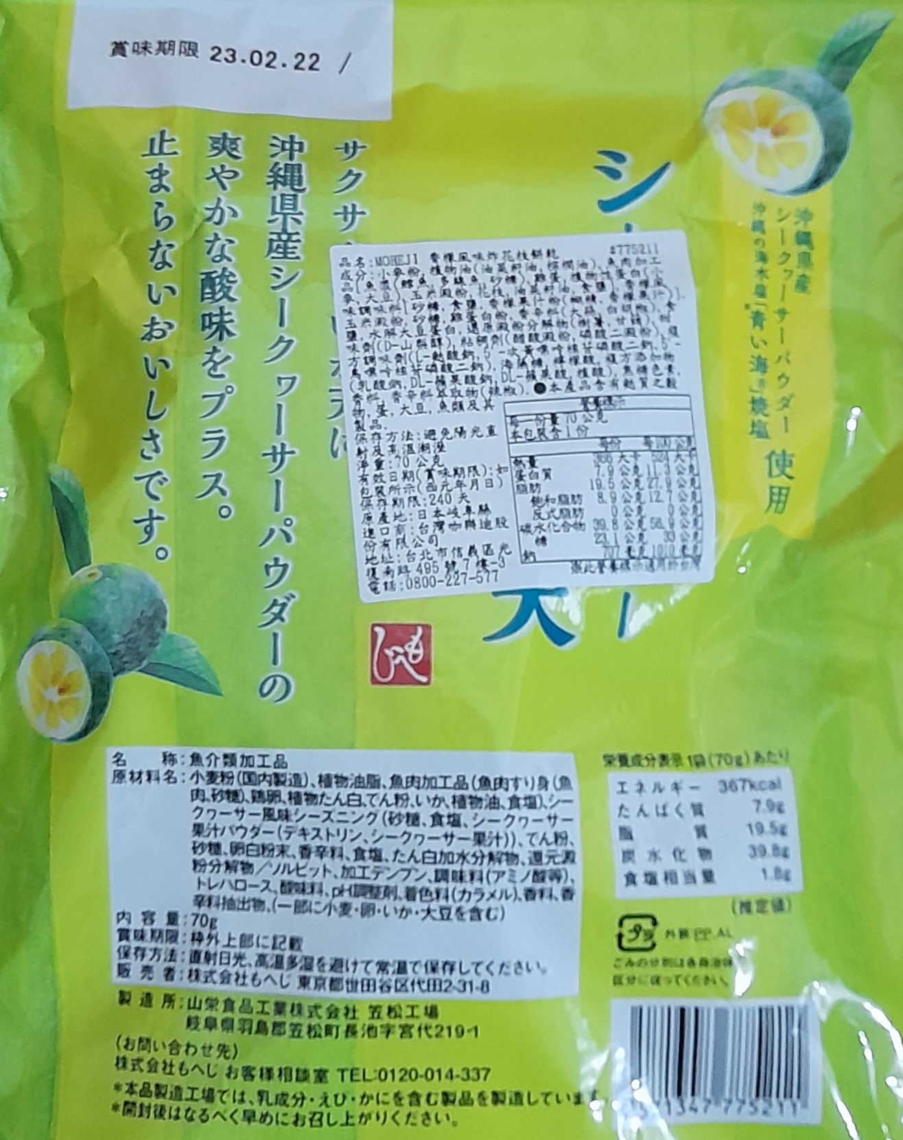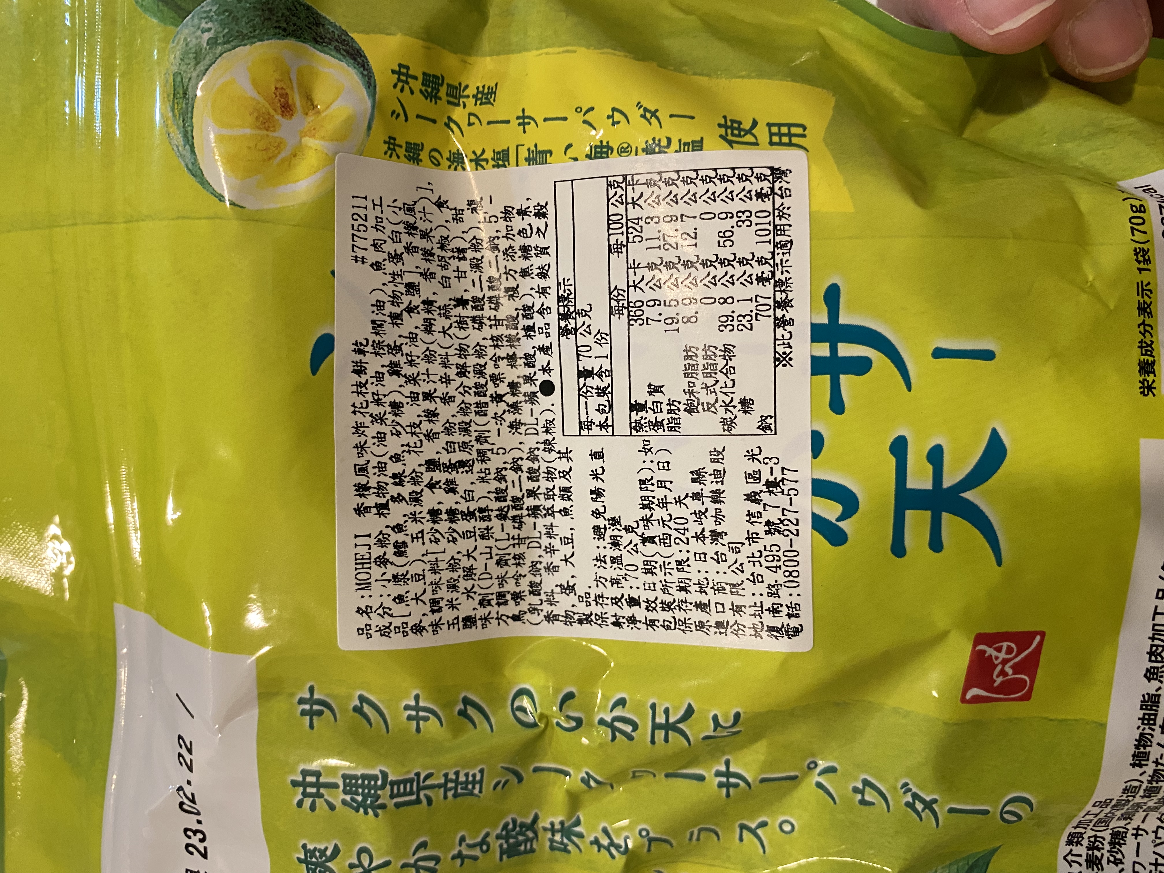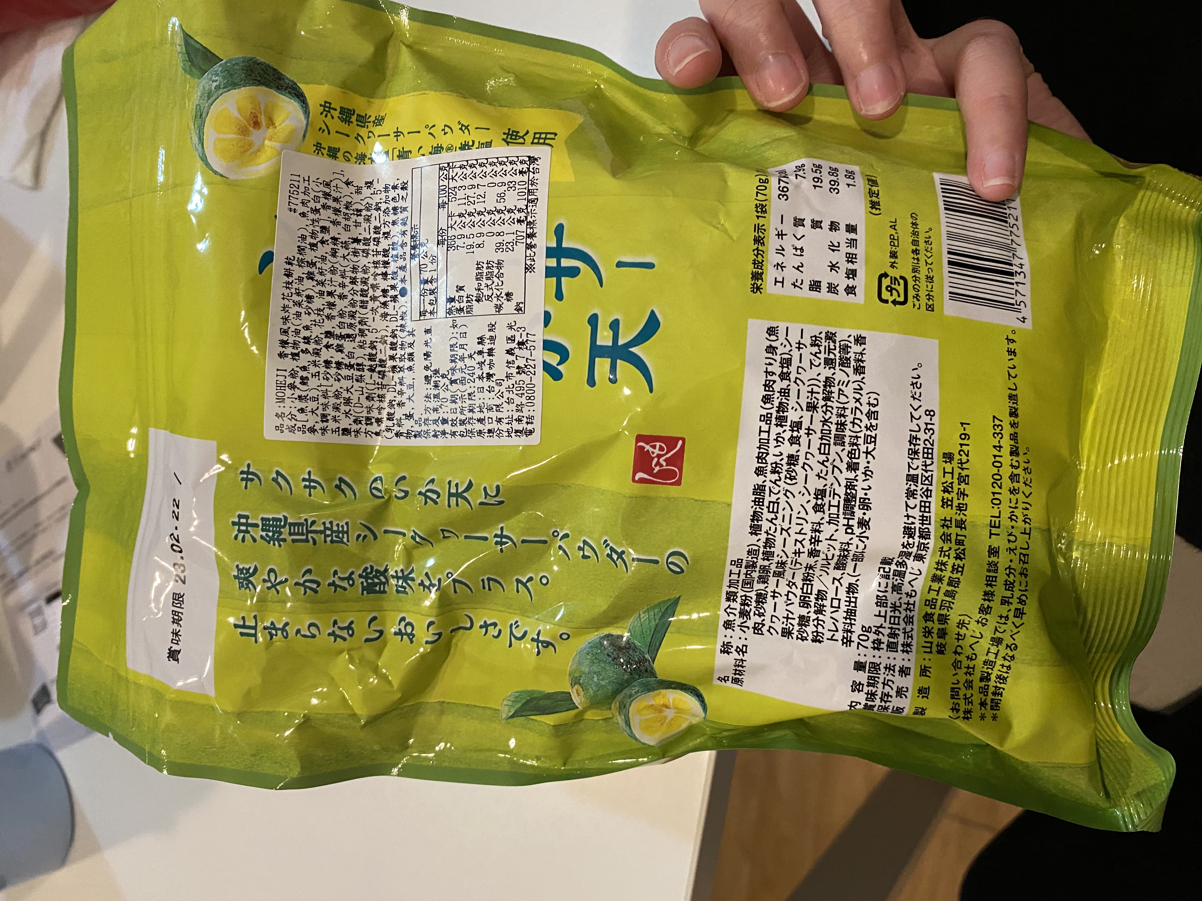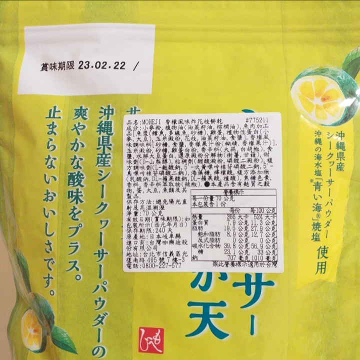 小麥粉,油菜籽油,棕櫚油,魚肉加工品[魚漿(鱈魚,多線魚,砂糖),雞蛋,植物性蛋白(小麥,大豆),玉米澱粉,花枝,油菜籽油,食鹽],香檬風味調味料[砂糖,食鹽,香檬果汁粉(糊精,香檬果汁)],玉米澱粉,砂糖,雞蛋白粉,大蒜,白胡椒,食鹽,水解大豆蛋白,還原澱粉分解物(樹薯,甘藷),甜味劑(D-山梨醇),醋酸澱粉,磷酸二澱粉,L-麩酸鈉,5’-次黃嘌呤核苷磷酸二鈉,5’-鳥嘌呤核苷磷酸二鈉,海藻糖,檸檬酸,pH調整劑(乳酸鈉,DL-蘋果酸鈉,DL-蘋果酸,植酸),焦糖色素,香料,香辛料萃取物(辣椒)
