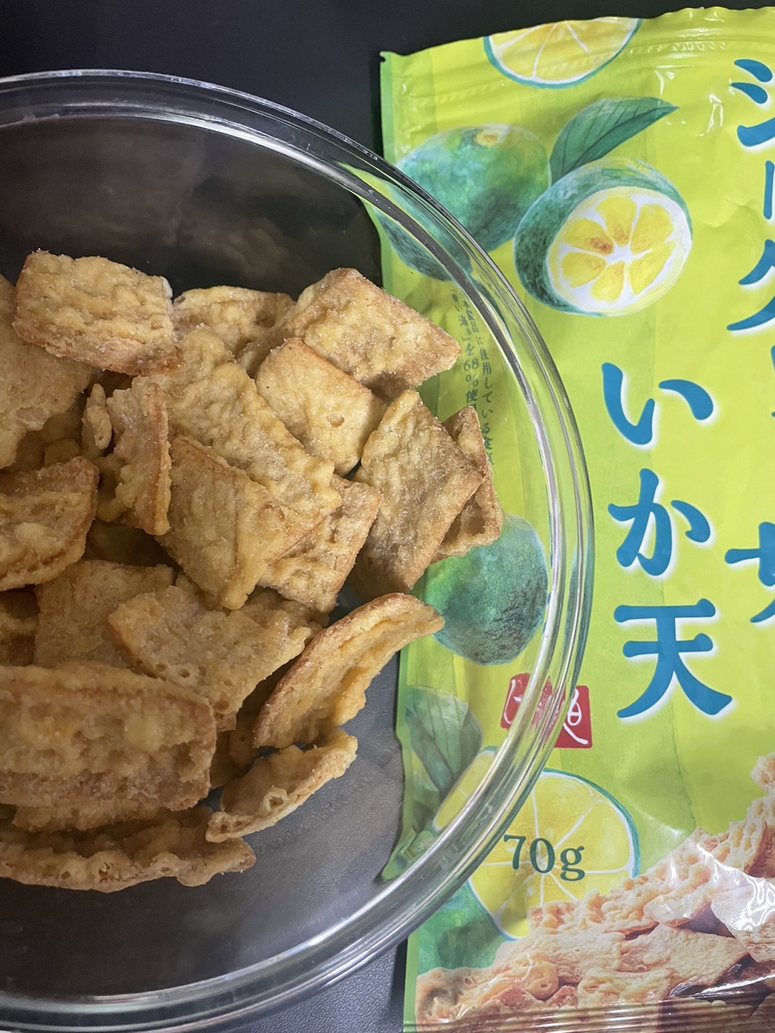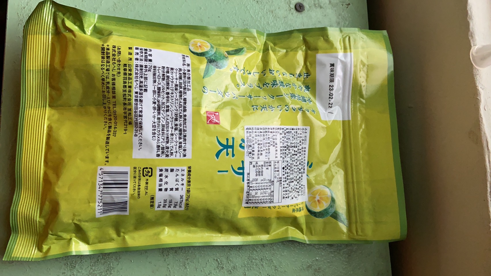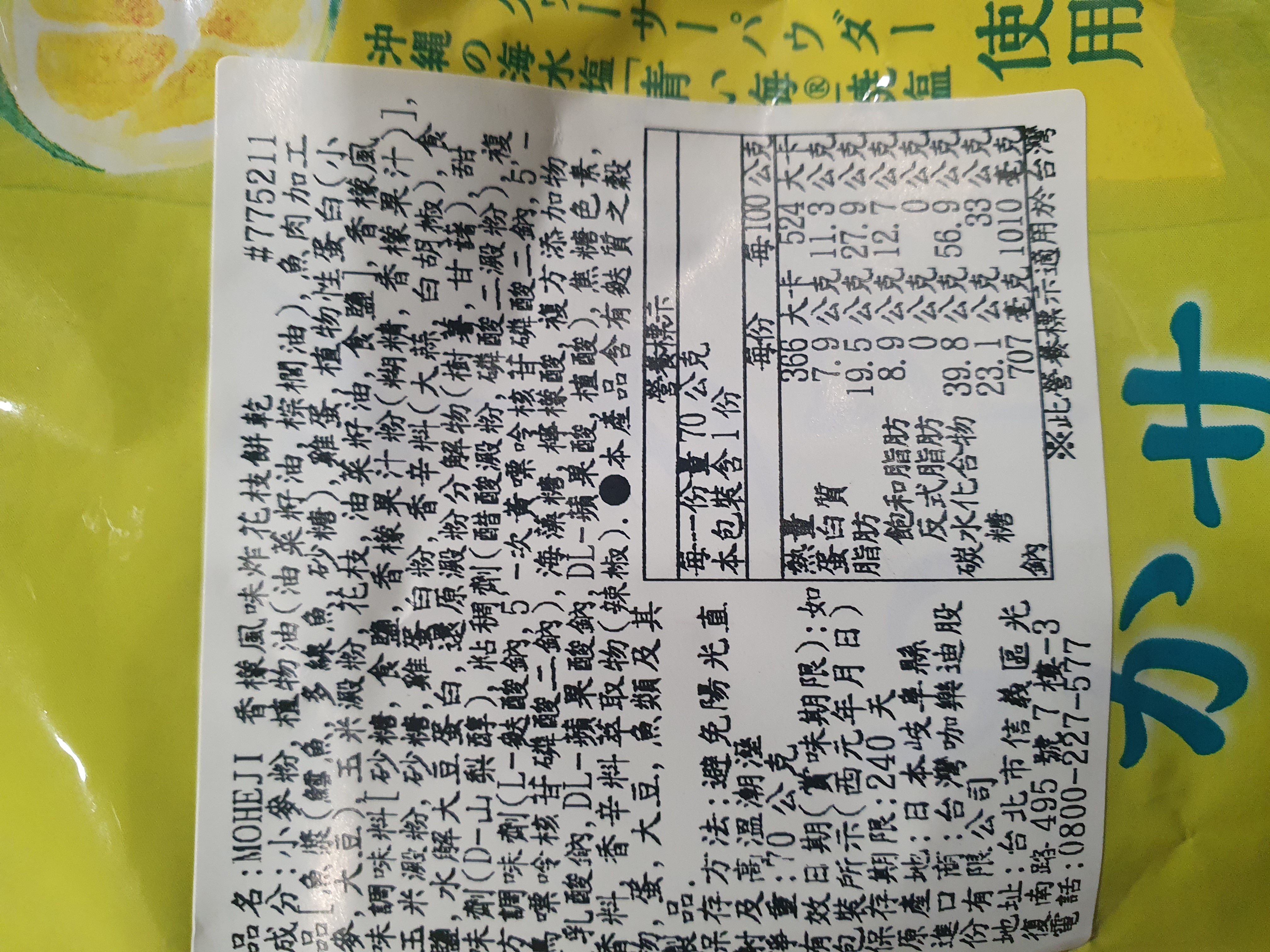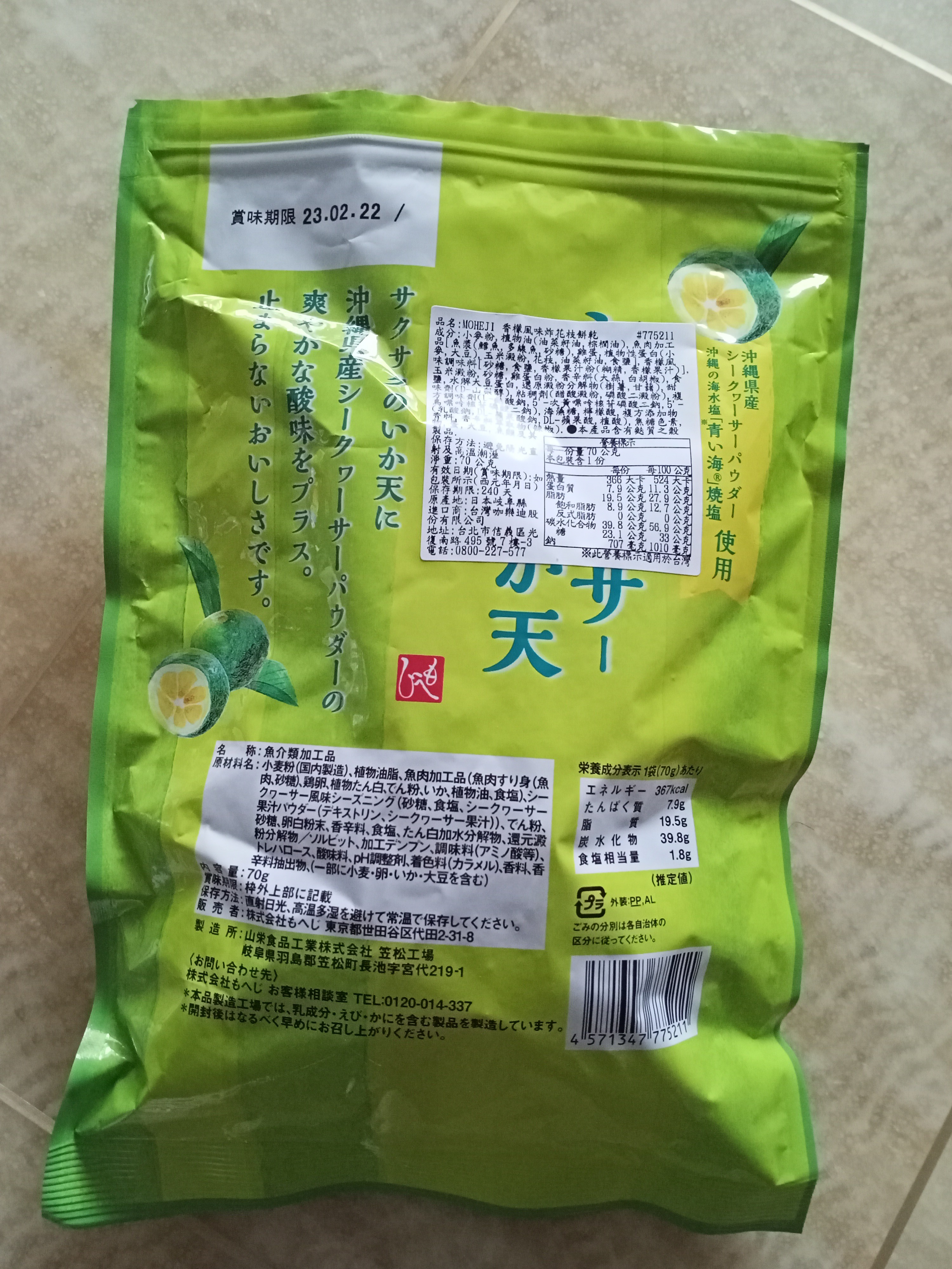 小麥粉,油菜籽油,棕櫚油,魚肉加工品[魚漿(鱈魚,多線魚,砂糖),雞蛋,植物性蛋白(小麥,大豆),玉米澱粉,花枝,油菜籽油,食鹽],香檬風味調味料[砂糖,食鹽,香檬果汁粉(糊精,香檬果汁)],玉米澱粉,砂糖,雞蛋白粉,大蒜,白胡椒,食鹽,水解大豆蛋白,還原澱粉分解物(樹薯,甘藷),甜味劑(D-山梨醇),醋酸澱粉,磷酸二澱粉,L-麩酸鈉,5’-次黃嘌呤核苷磷酸二鈉,5’-鳥嘌呤核苷磷酸二鈉,海藻糖,檸檬酸,pH調整劑(乳酸鈉,DL-蘋果酸鈉,DL-蘋果酸,植酸),焦糖色素,香料,香辛料萃取物(辣椒)