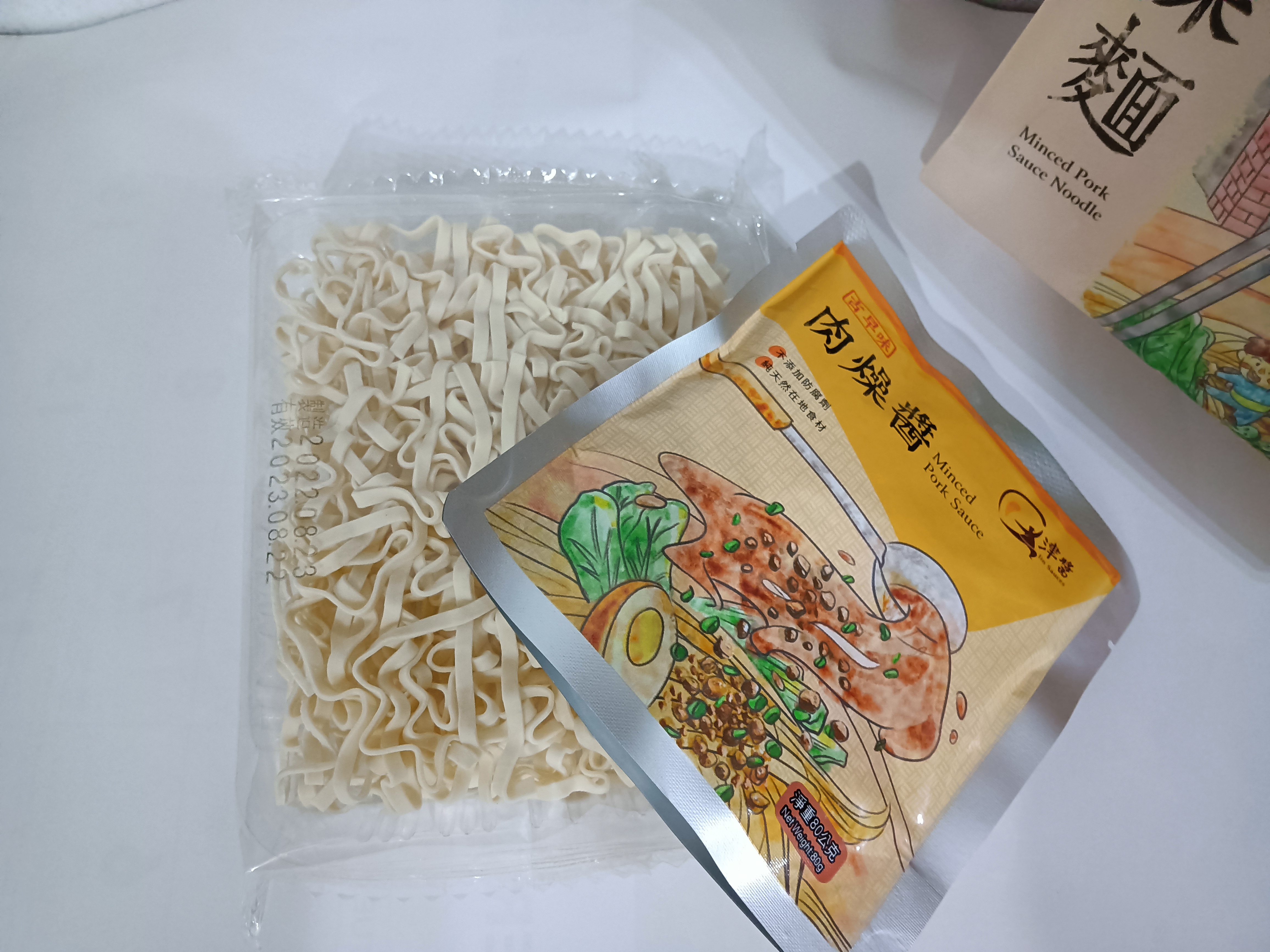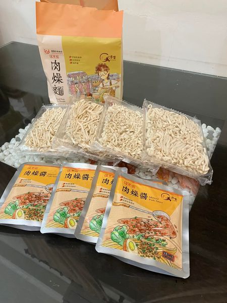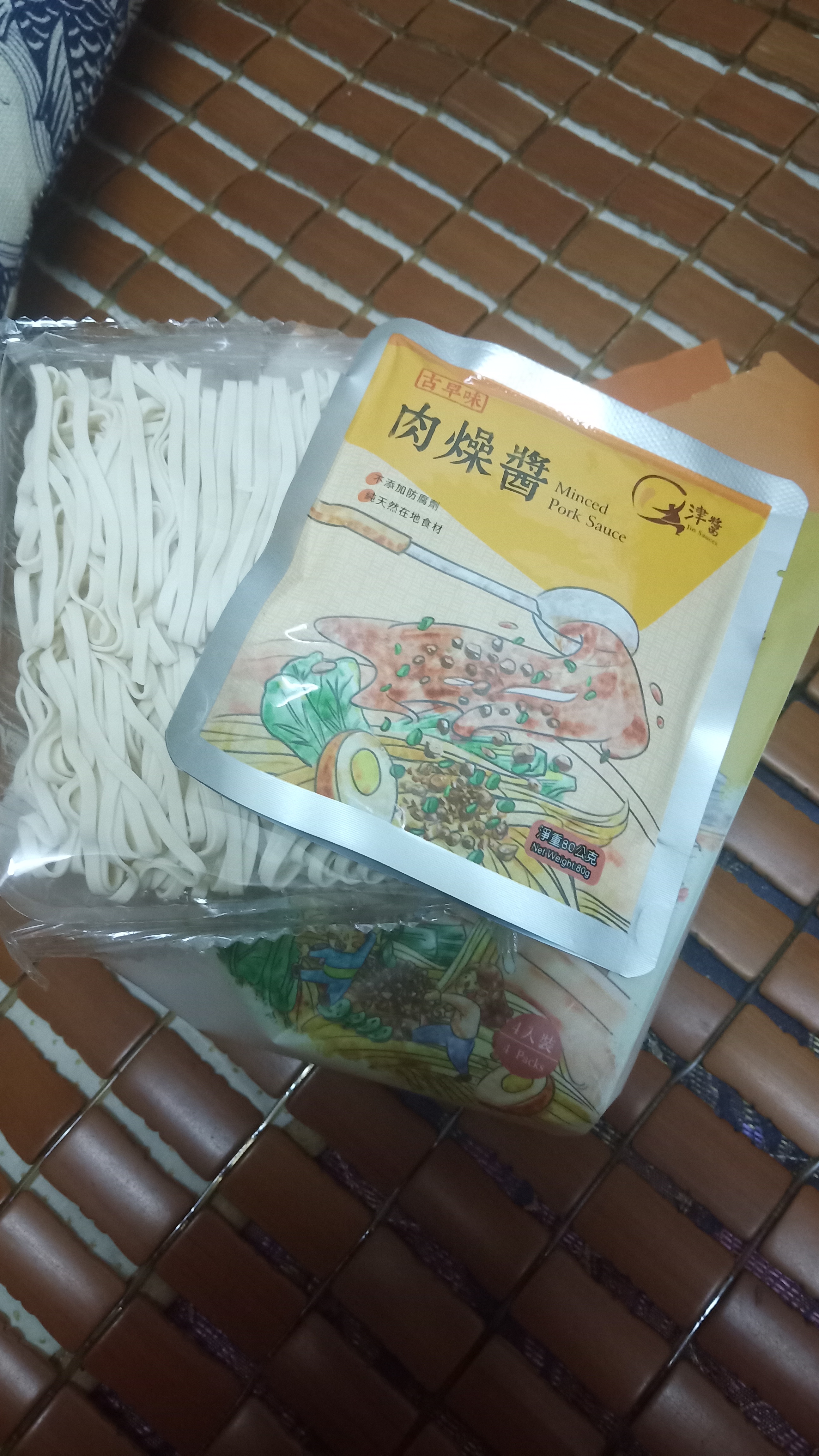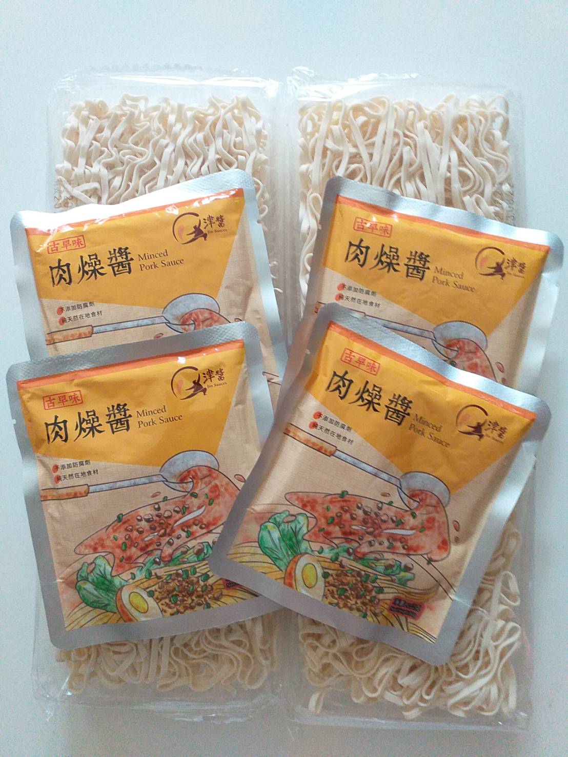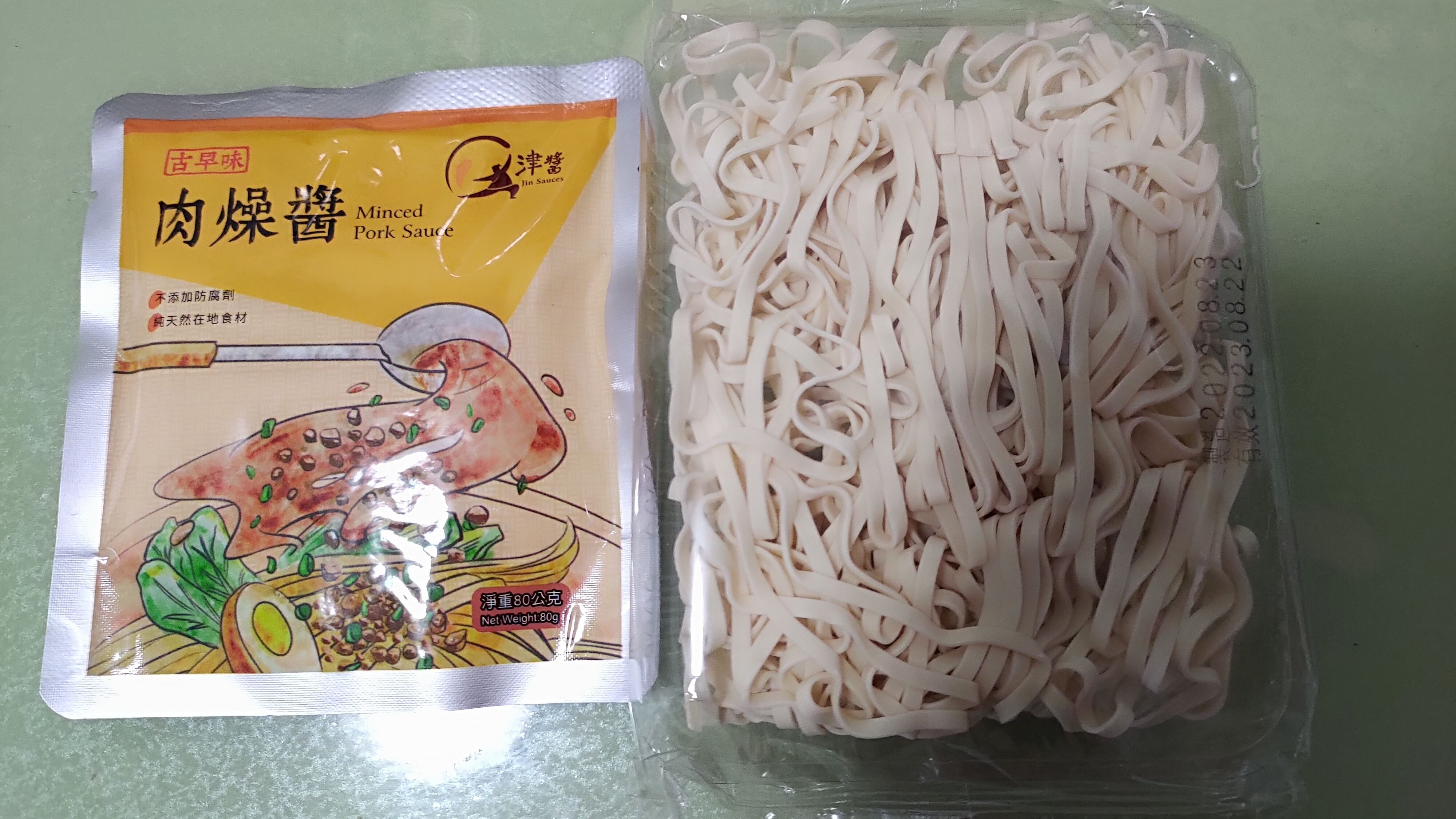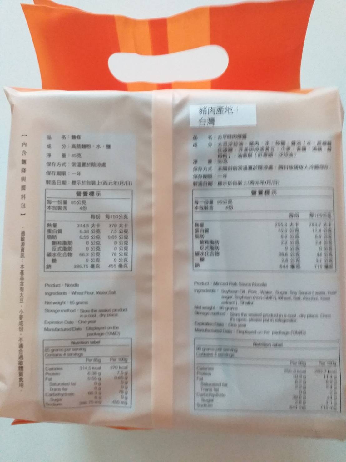 古早味肉燥料理包成份: 豬肉。水。醬油(水、蔗糖轉化液糖、非基因改造黃豆、小麥、食鹽、酒精、酵母粉)。油蔥酥(紅蔥頭、沙拉油)。大豆沙拉油。砂糖。 日曬麵條成份: 高筋麵粉。水。鹽。