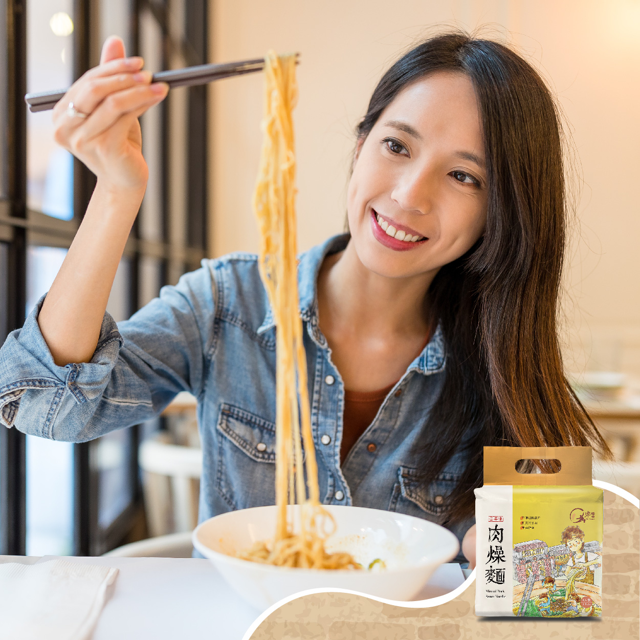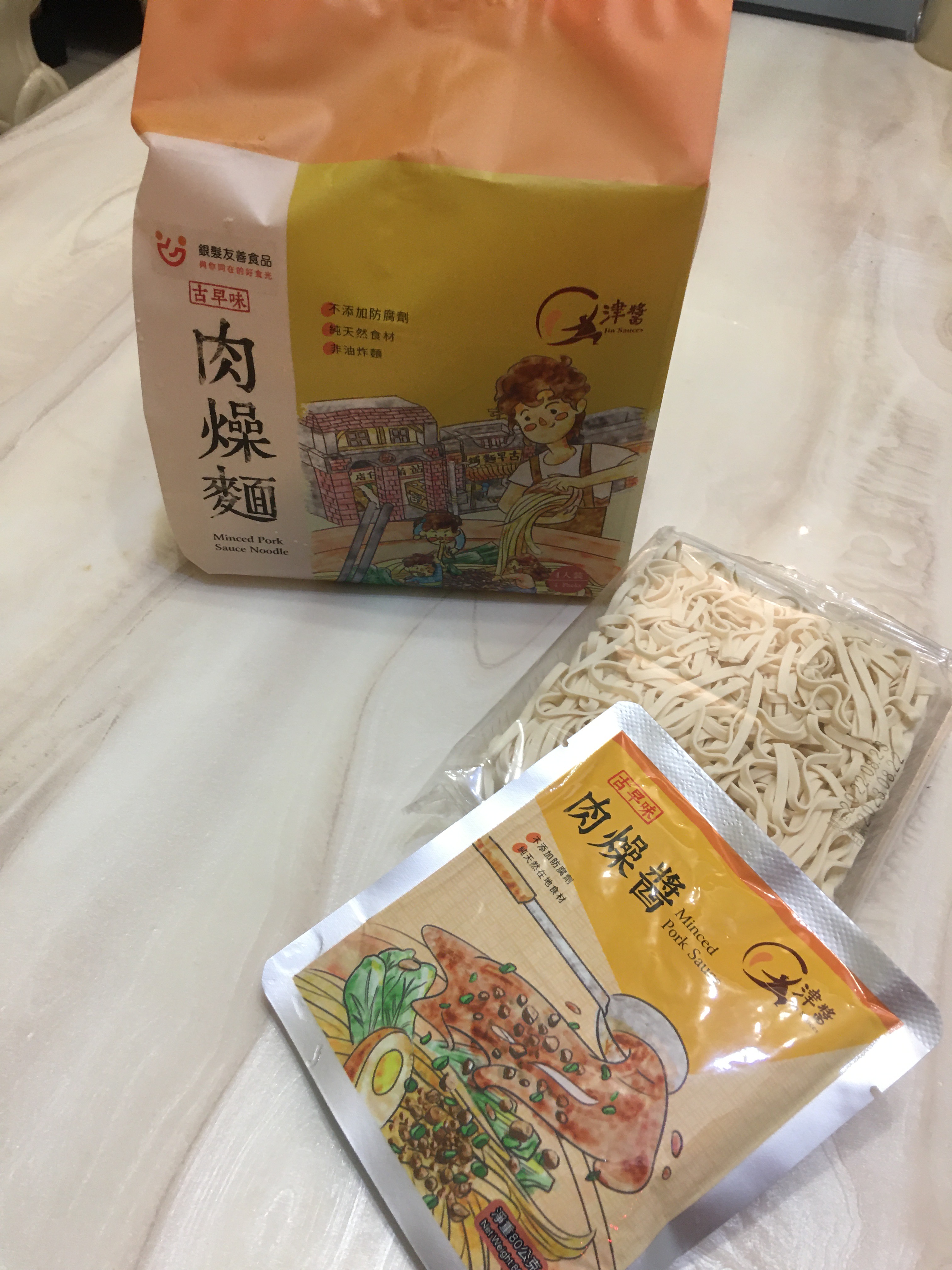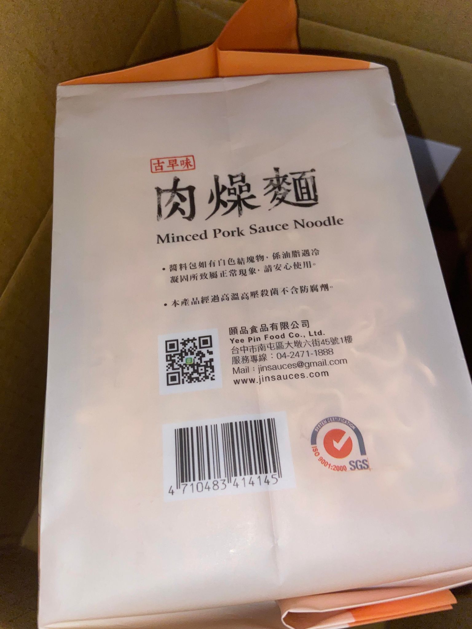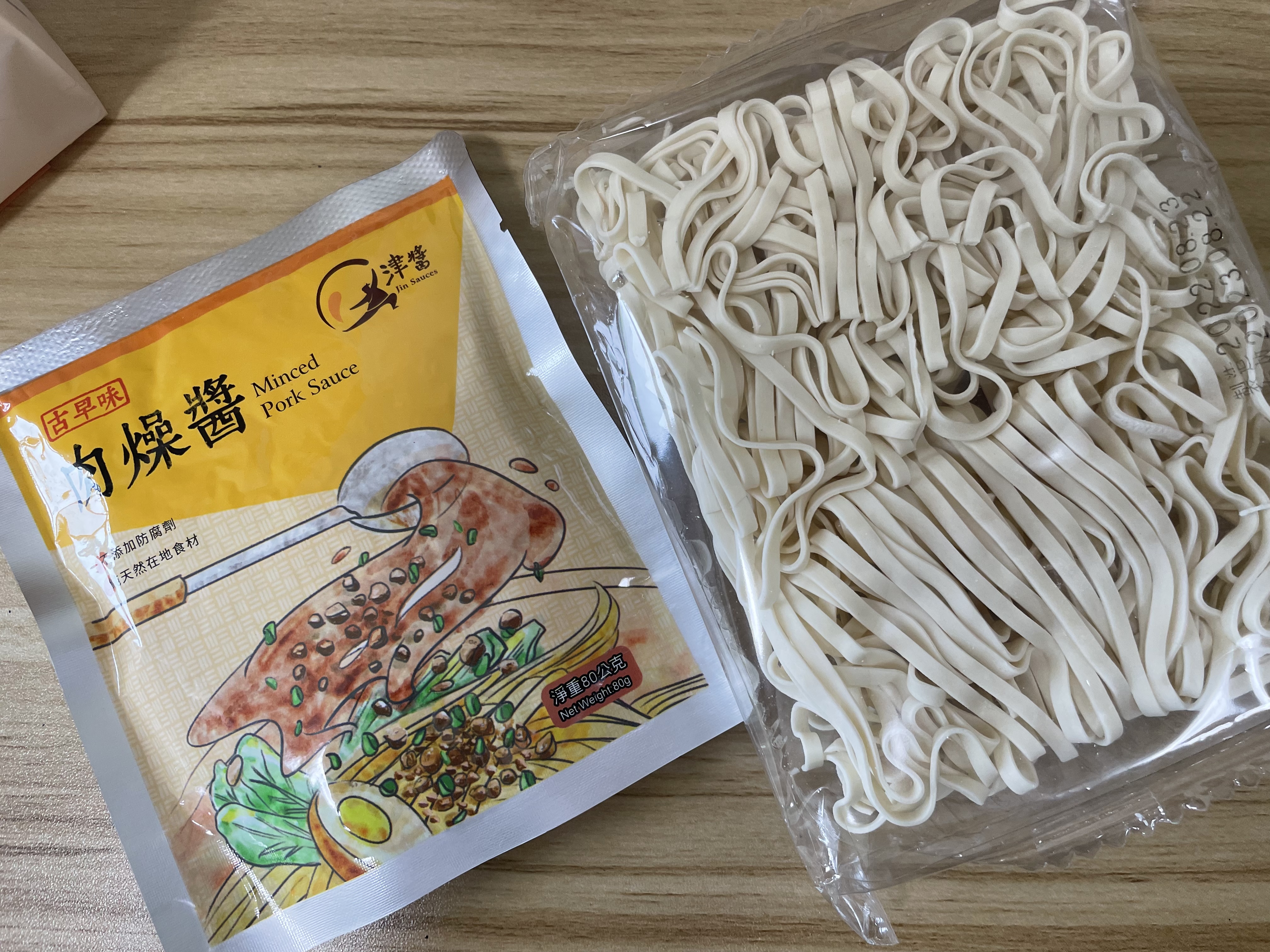 古早味肉燥料理包成份: 豬肉。水。醬油(水、蔗糖轉化液糖、非基因改造黃豆、小麥、食鹽、酒精、酵母粉)。油蔥酥(紅蔥頭、沙拉油)。大豆沙拉油。砂糖。 日曬麵條成份: 高筋麵粉。水。鹽。