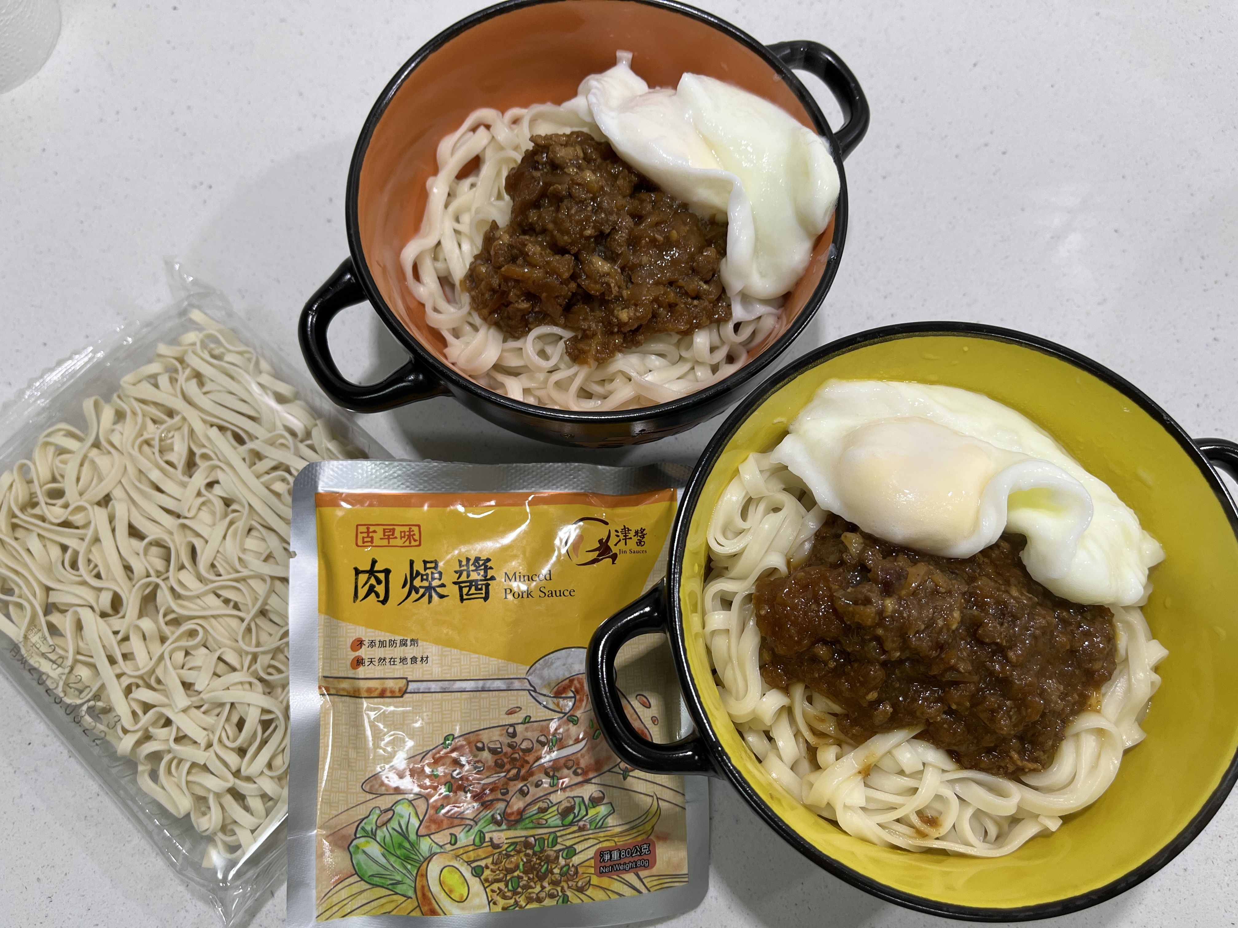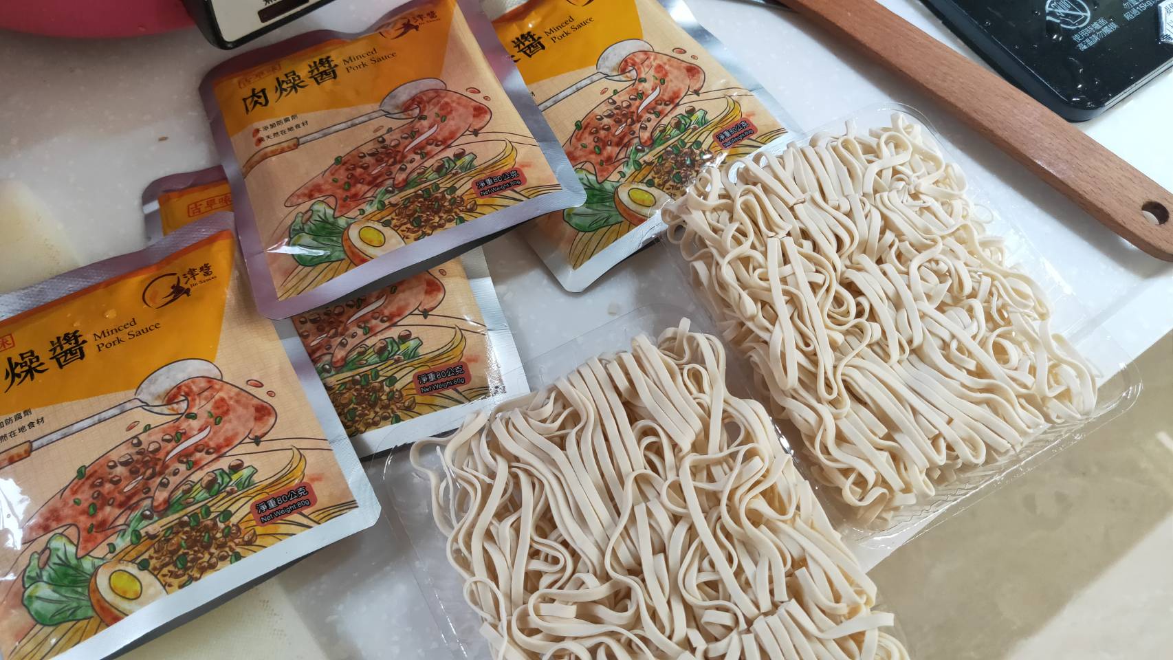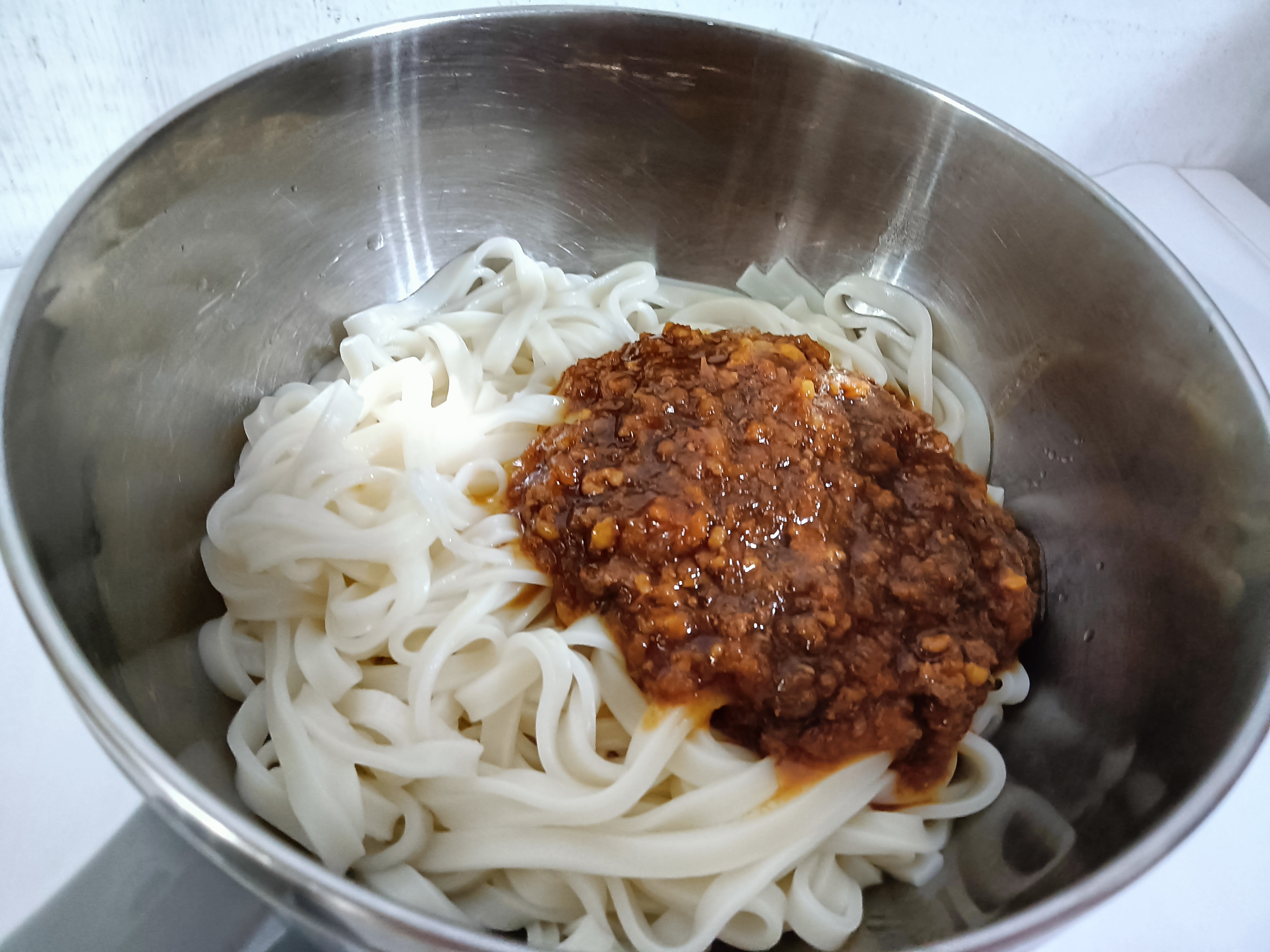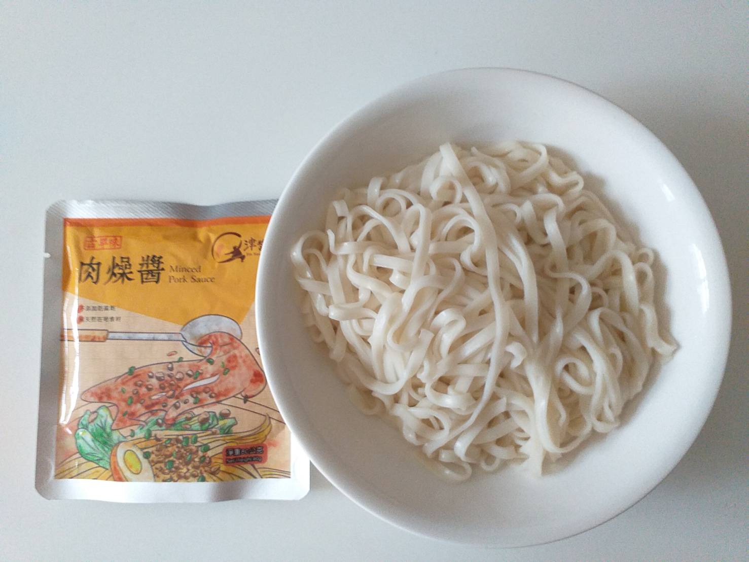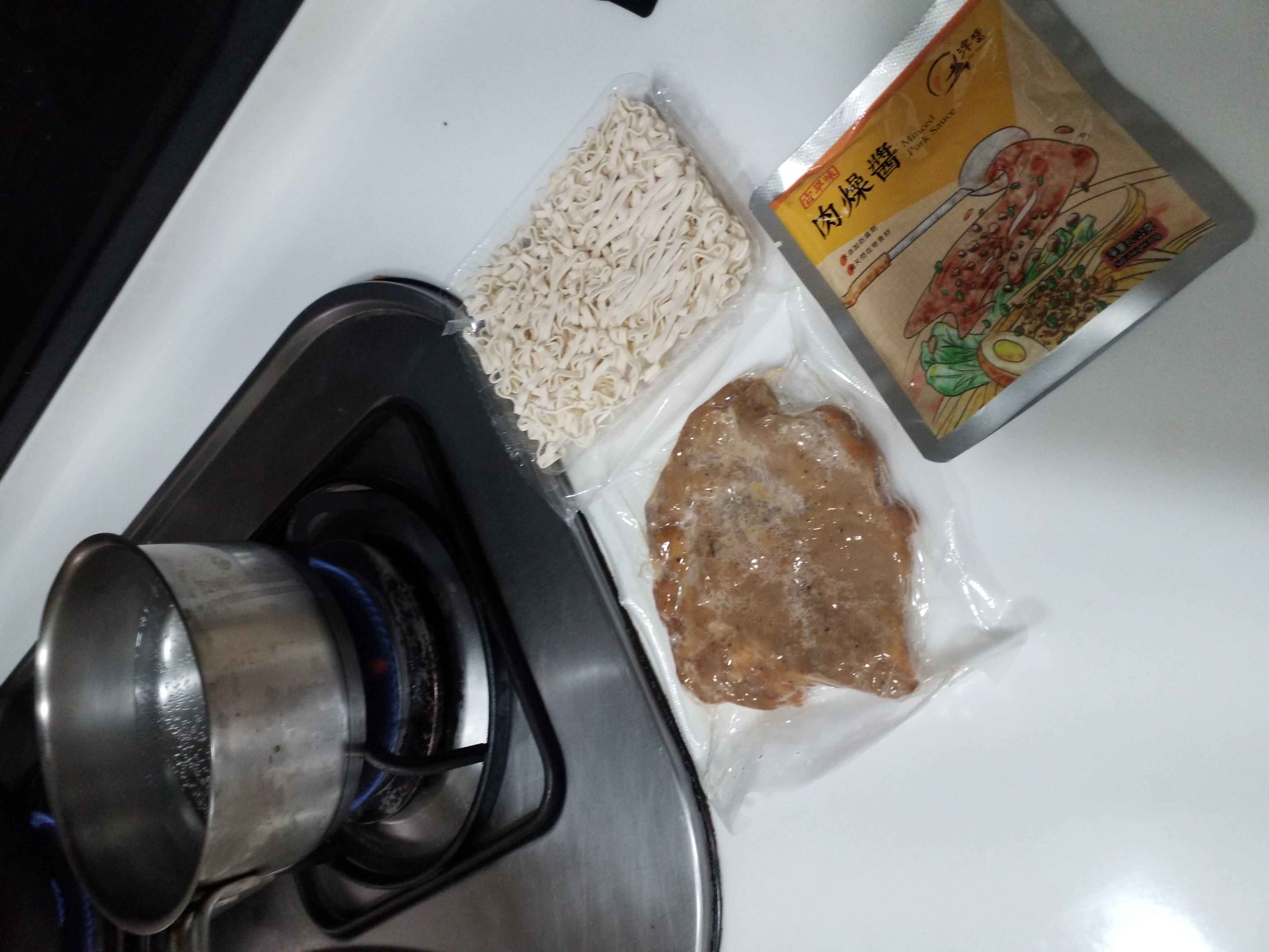 3.將肉燥包短暫浸泡在熱水中,完成後即可到入麵條中拌勻食用