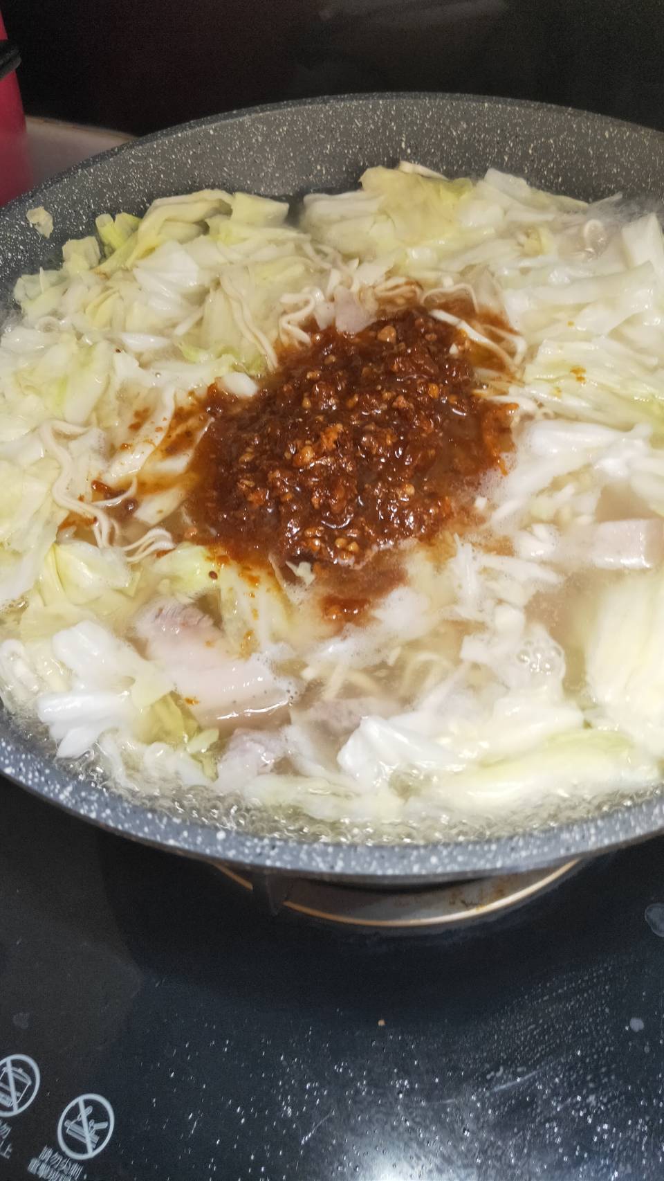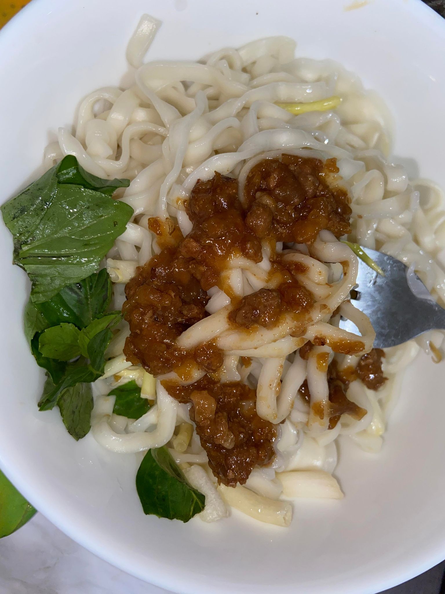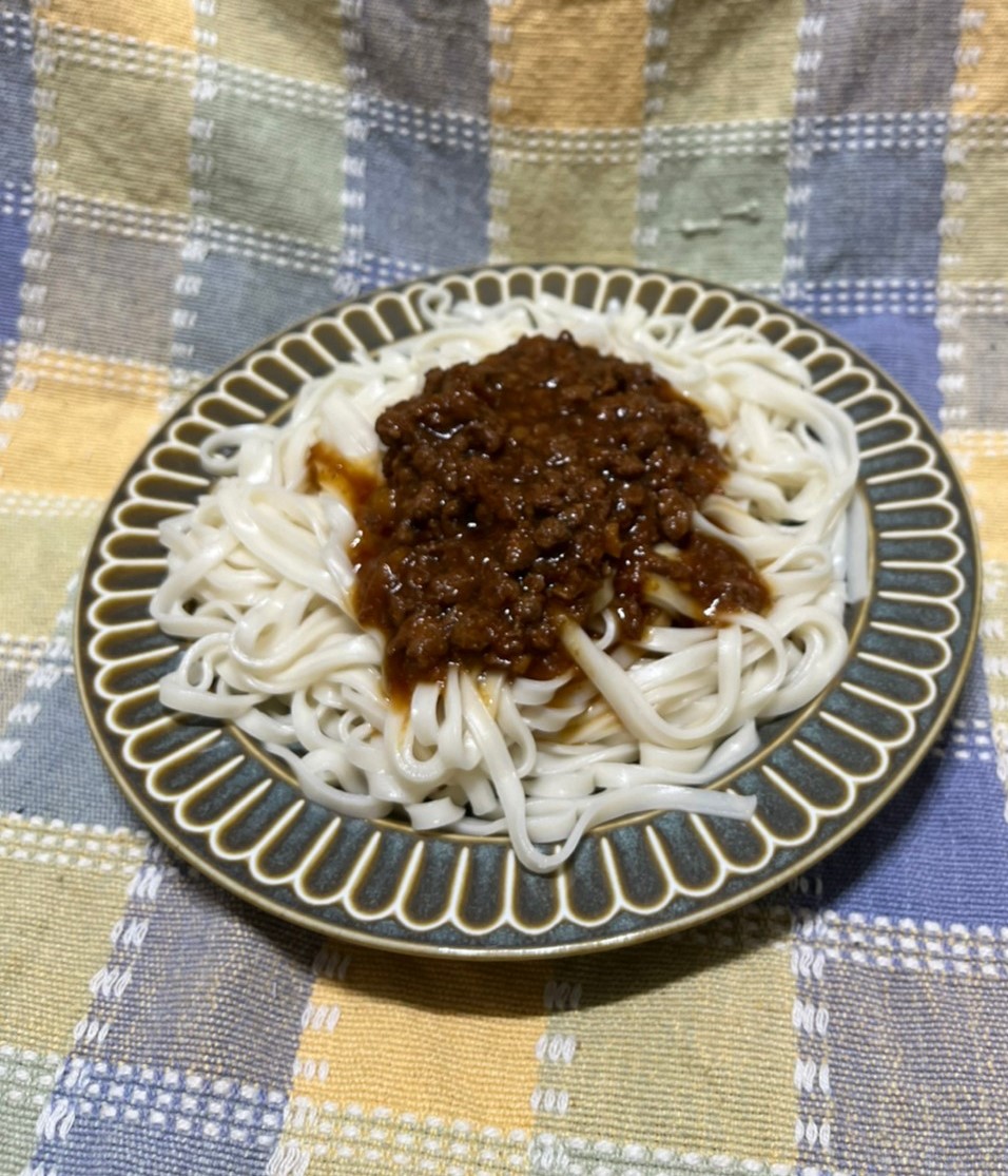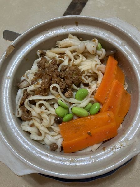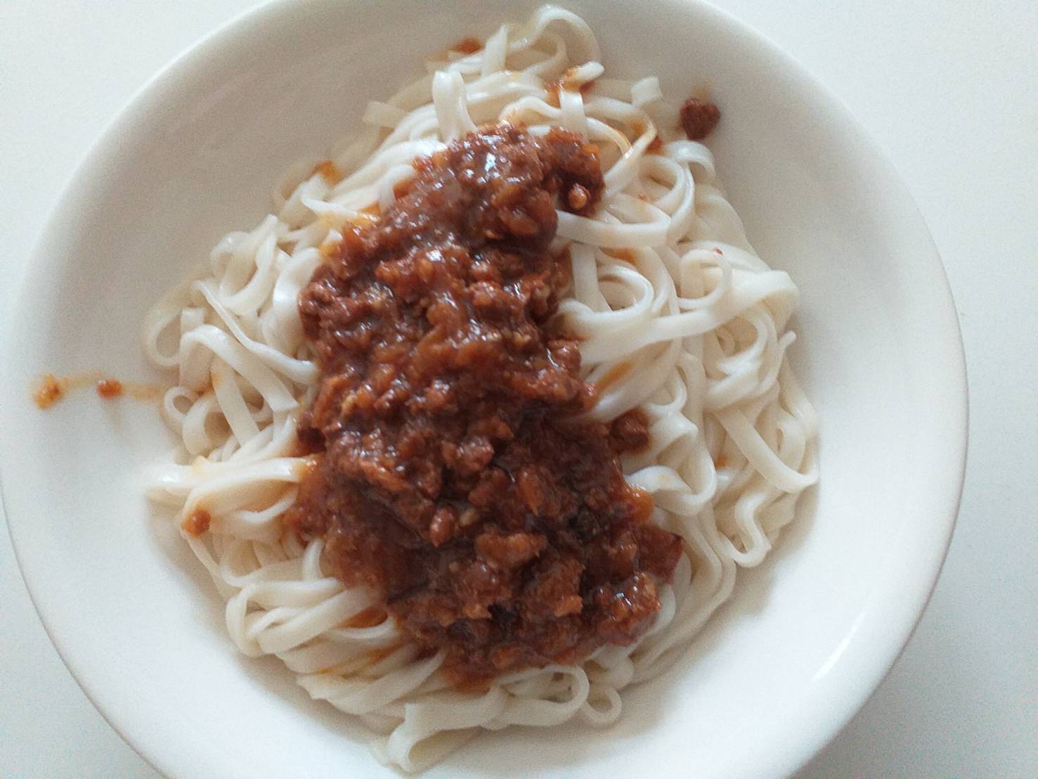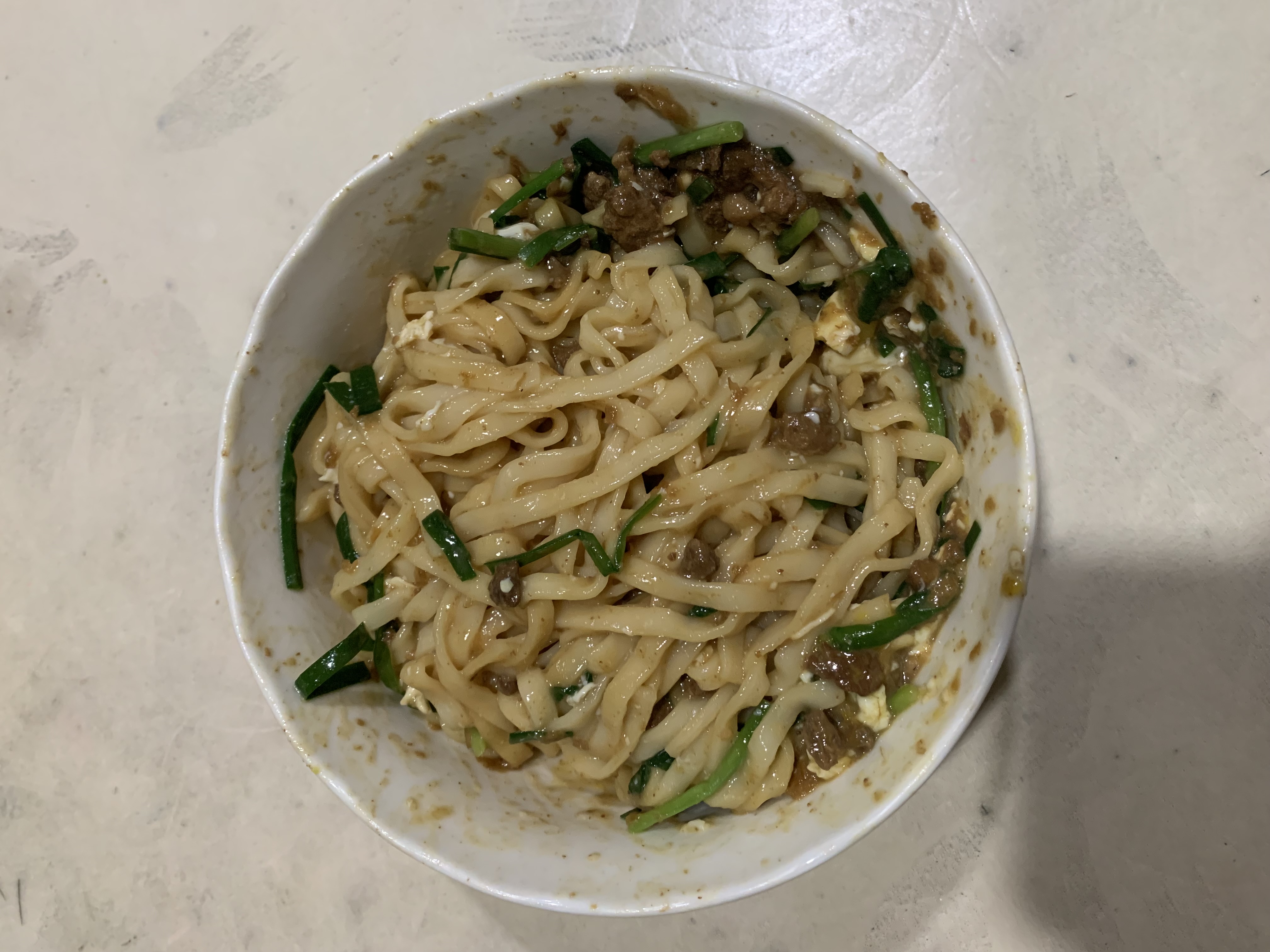 3.將肉燥包短暫浸泡在熱水中,完成後即可到入麵條中拌勻食用