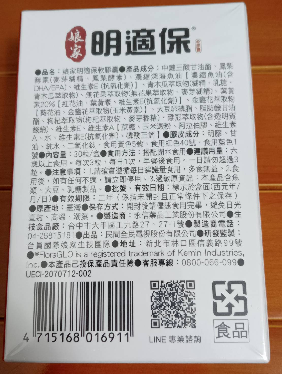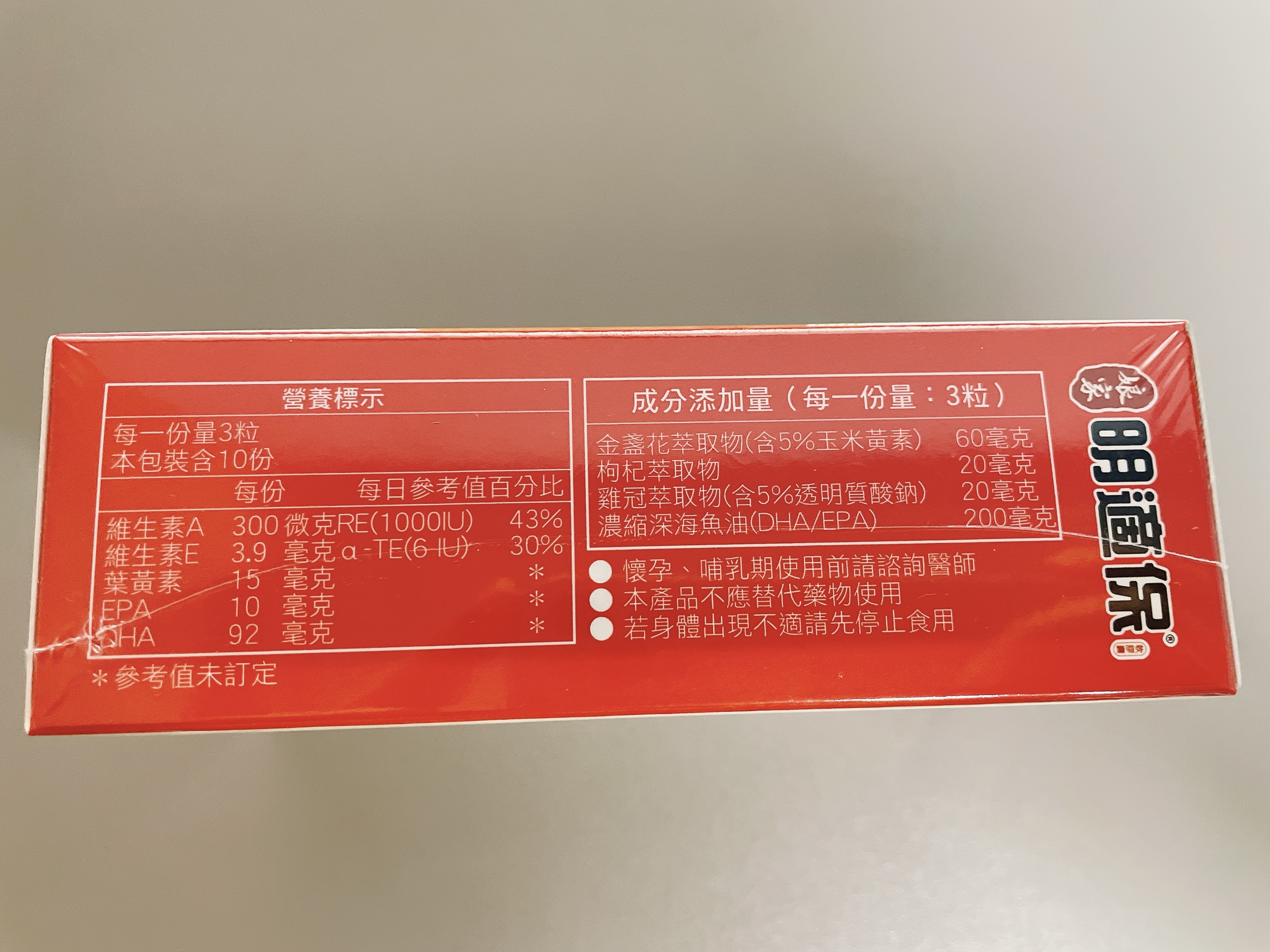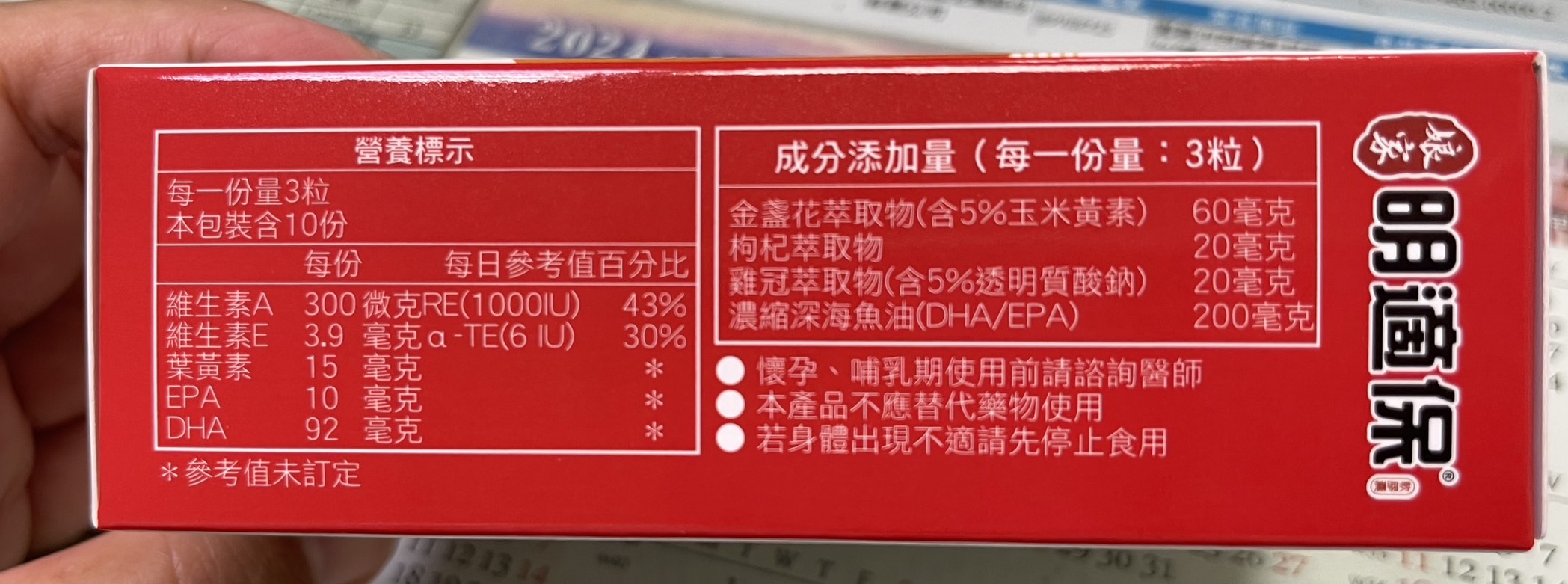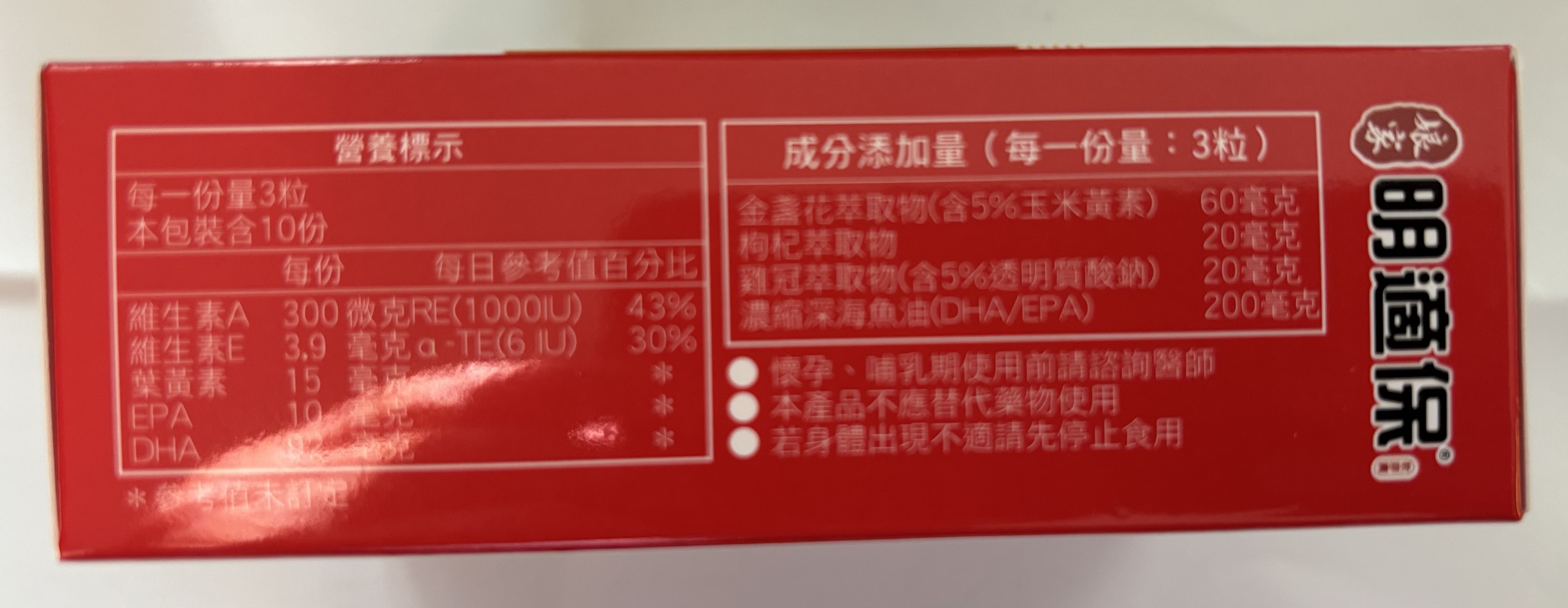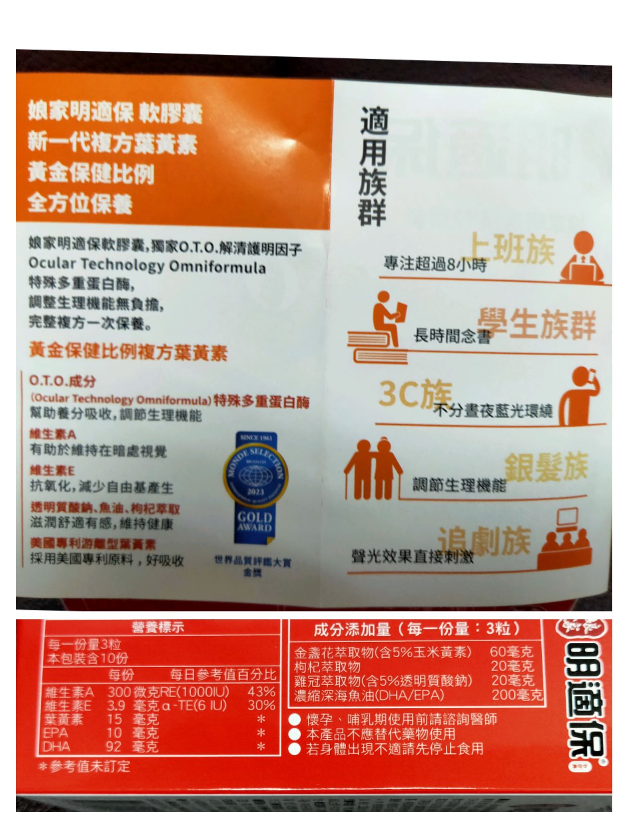 產品成分:中鏈三酸甘油酯、鳳梨酵素(麥芽糊精、鳳梨酵素)、濃縮深海魚油【濃縮魚油(含DHA/EPA)、維生素 E (抗氧化劑)】、青木瓜萃取物(糊精、乳糖、青木瓜萃取物)、無花果萃取物(無花果萃取物、麥芽糊精)、葉黃素20%【紅花油、葉黃素、維生素E(抗氧化劑)】、金盞花萃取物【葵花油、金盞花萃取物(玉米黃素)】、大豆卵磷脂、脂肪酸甘油酯 、枸杞萃取物(枸杞萃取物、麥芽糊精)、雞冠萃取物(含玻尿酸)、維生素E、維生素A【蔗糖、玉米澱粉、阿拉伯膠、維生素A、水、維生素E(抗氧化劑)、磷酸三鈣】